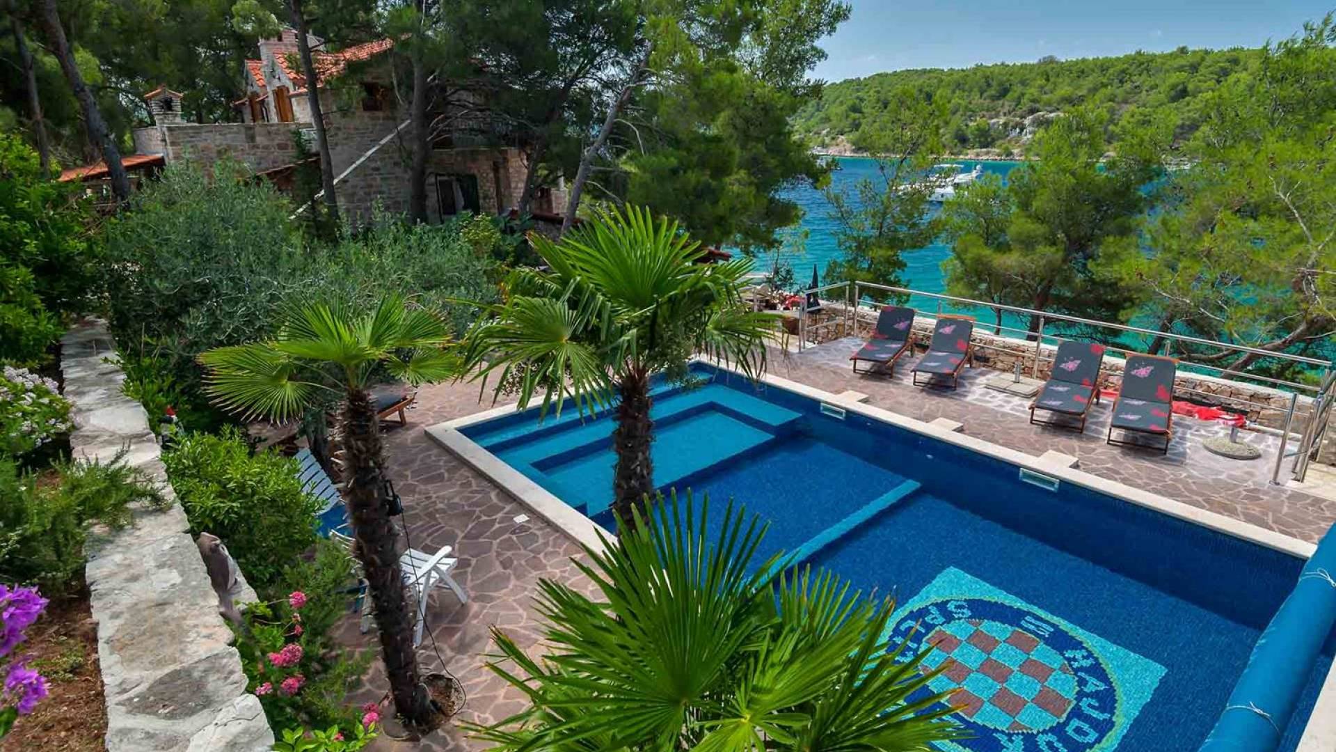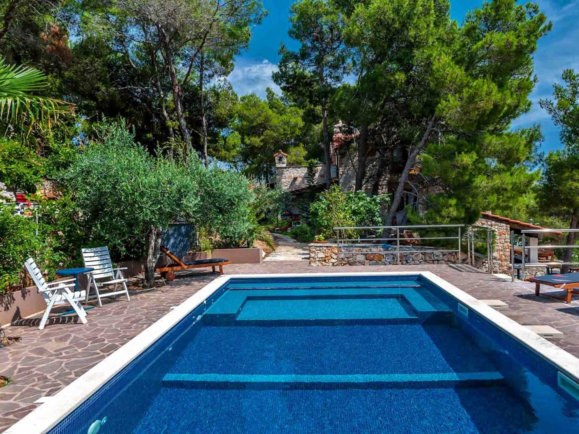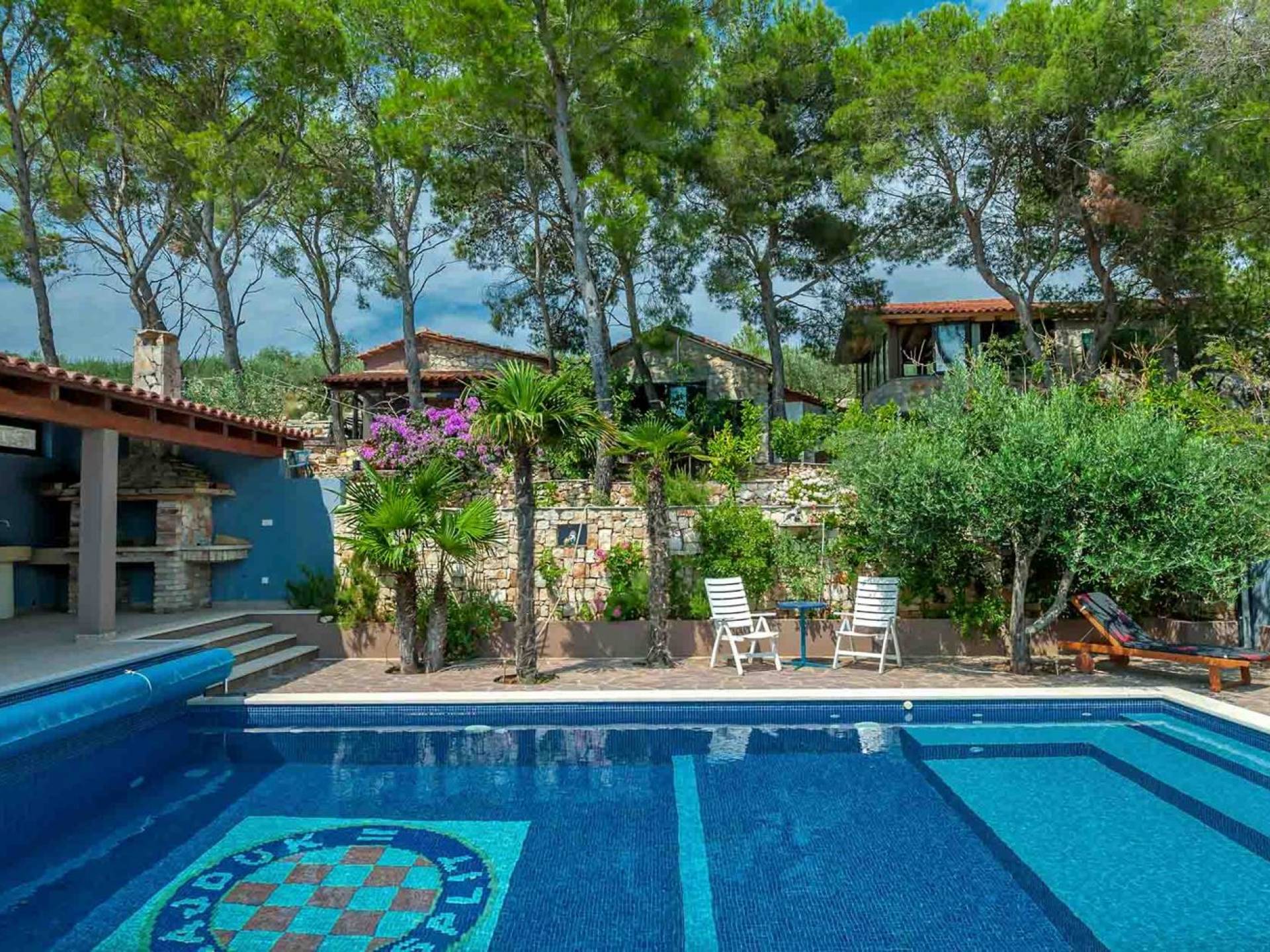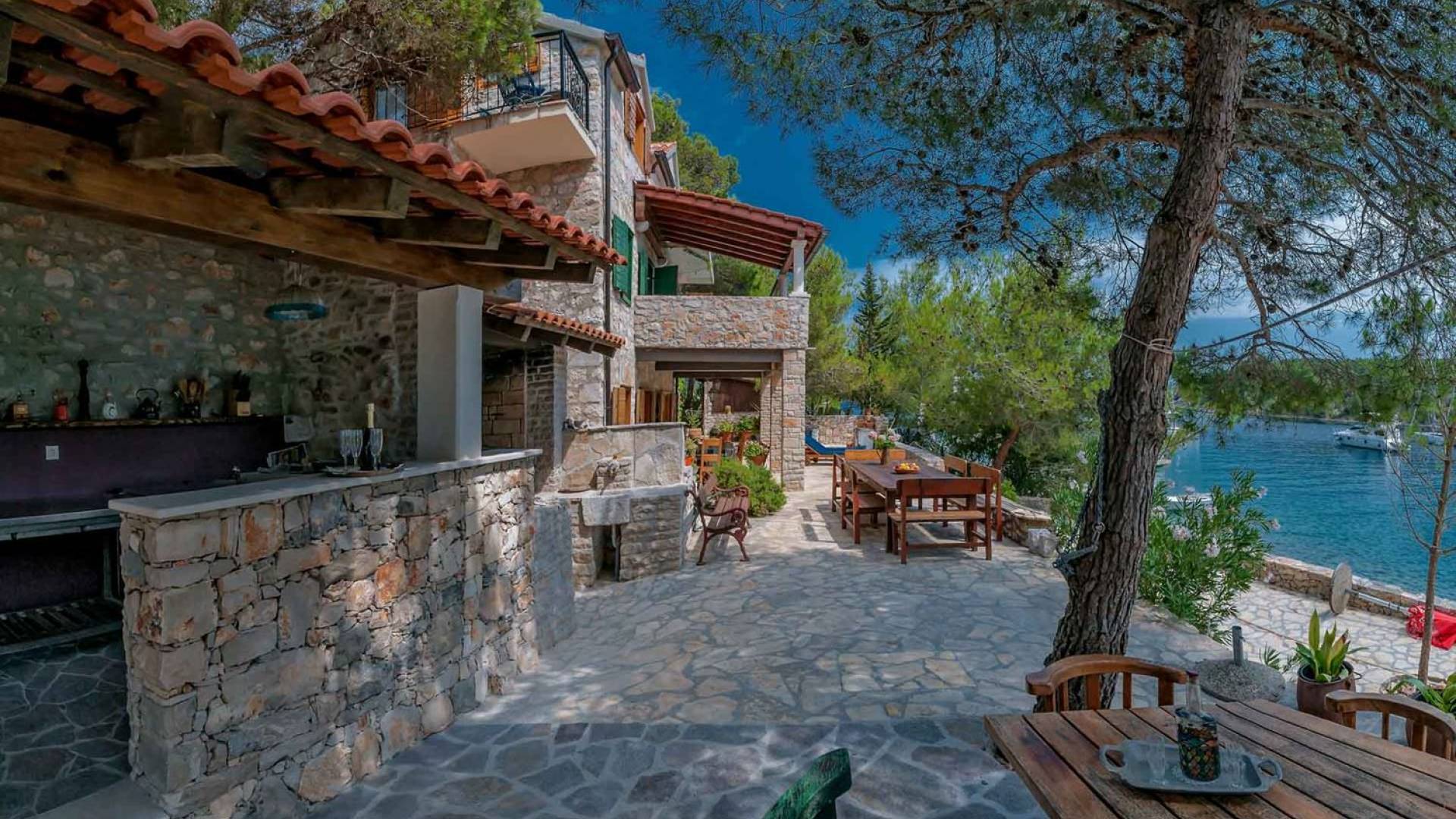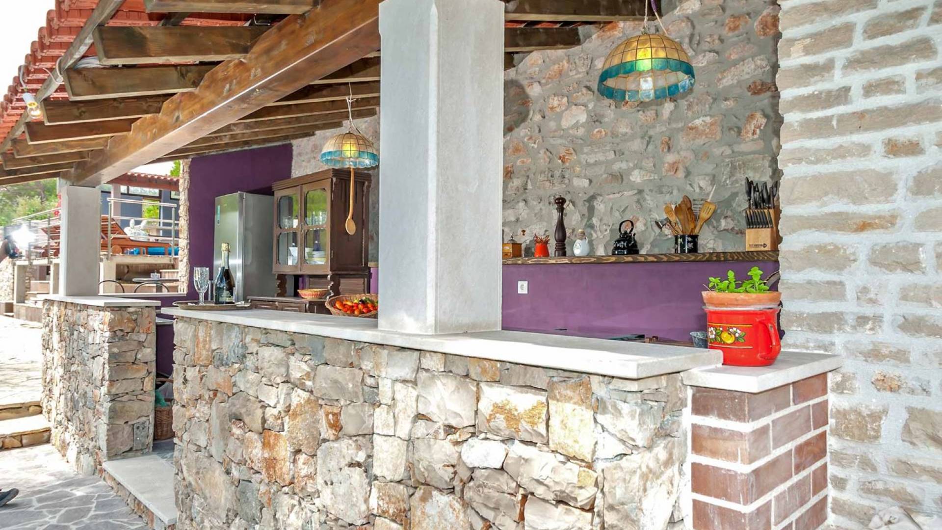 L'extérieur dispose d'une grande piscine privée (40 m²) entourée de transats et de parasols confortables, ainsi que d'une salle à manger ombragée idéale pour les repas en plein air et les moments de socialisation, rehaussée par le parfum distinctif des types de végétation dans cette région de la Méditerranée. Il y a aussi une cuisine d'été typiquement dalmate où vous pouvez préparer des plats savoureux mais si vous aimez un restaurant servant des aliments cultivés localement se trouve également sur place.