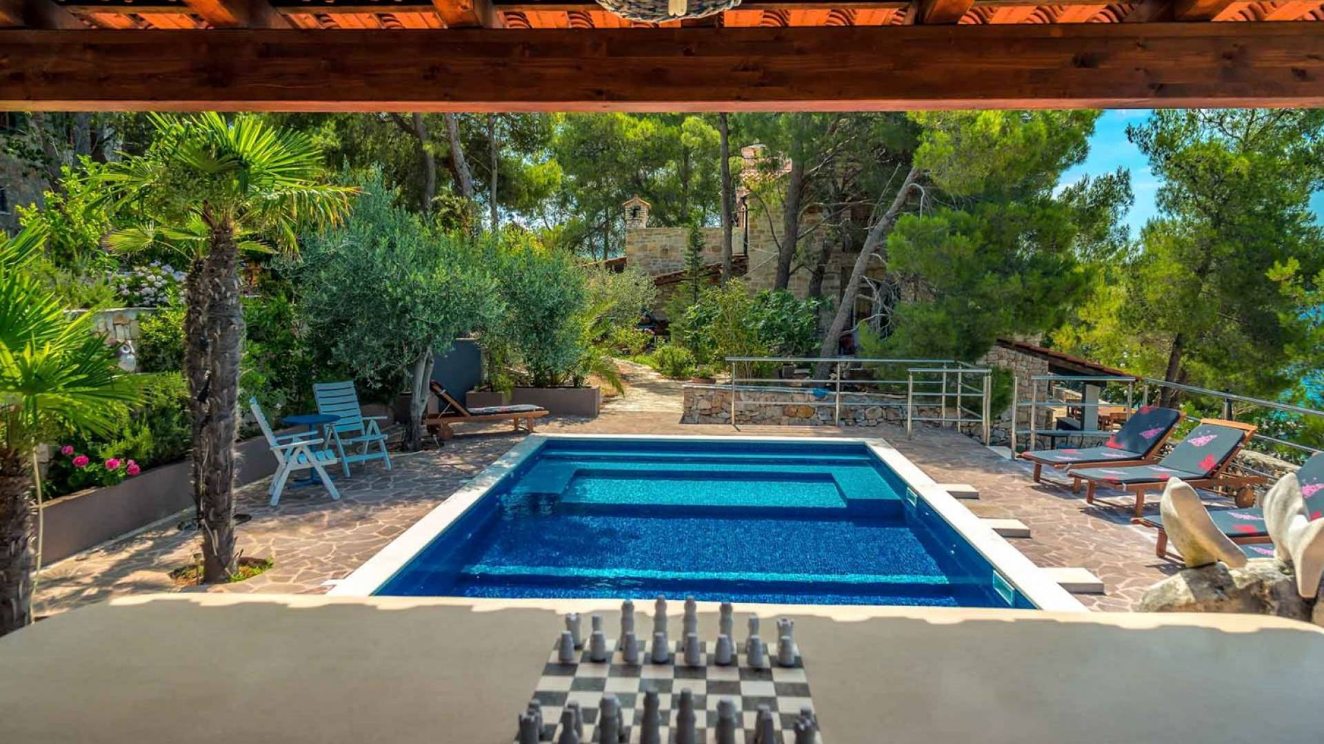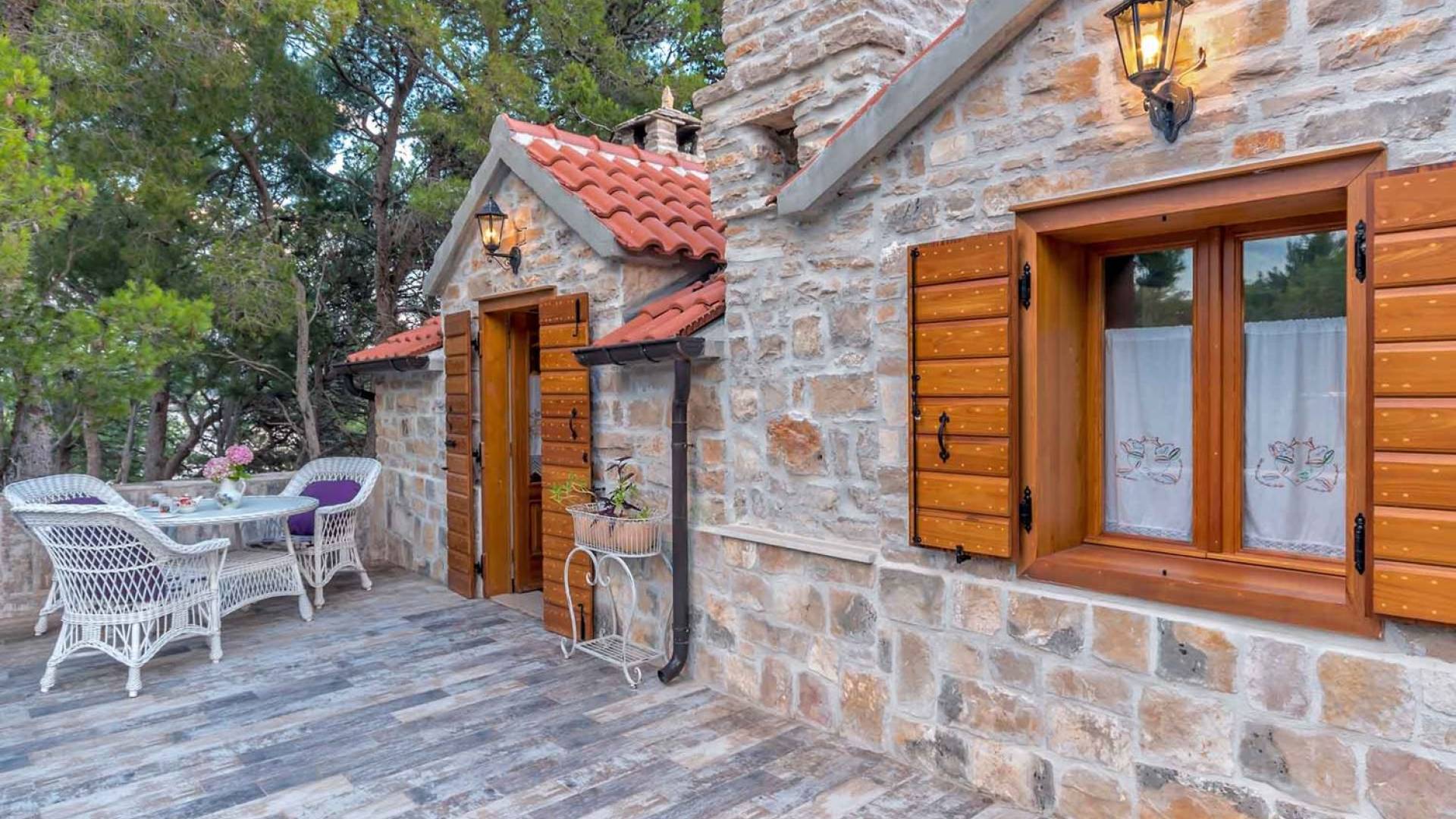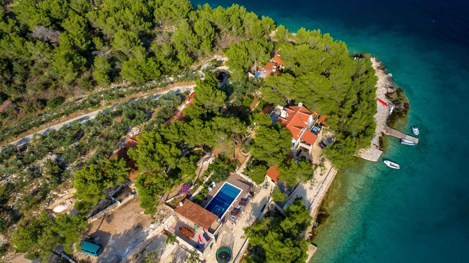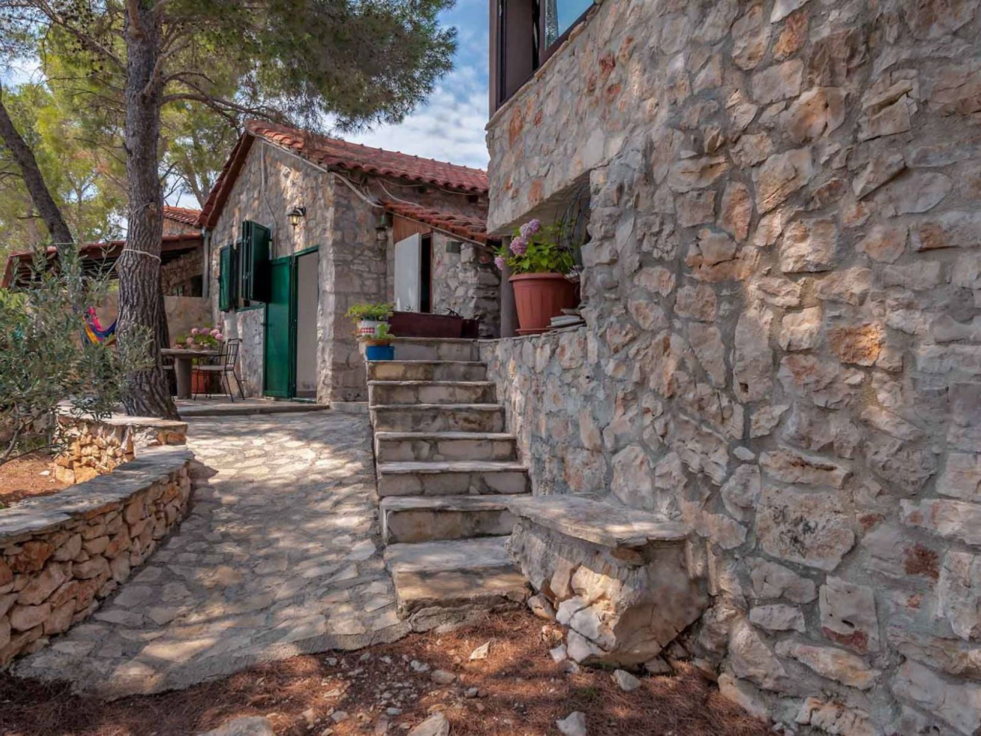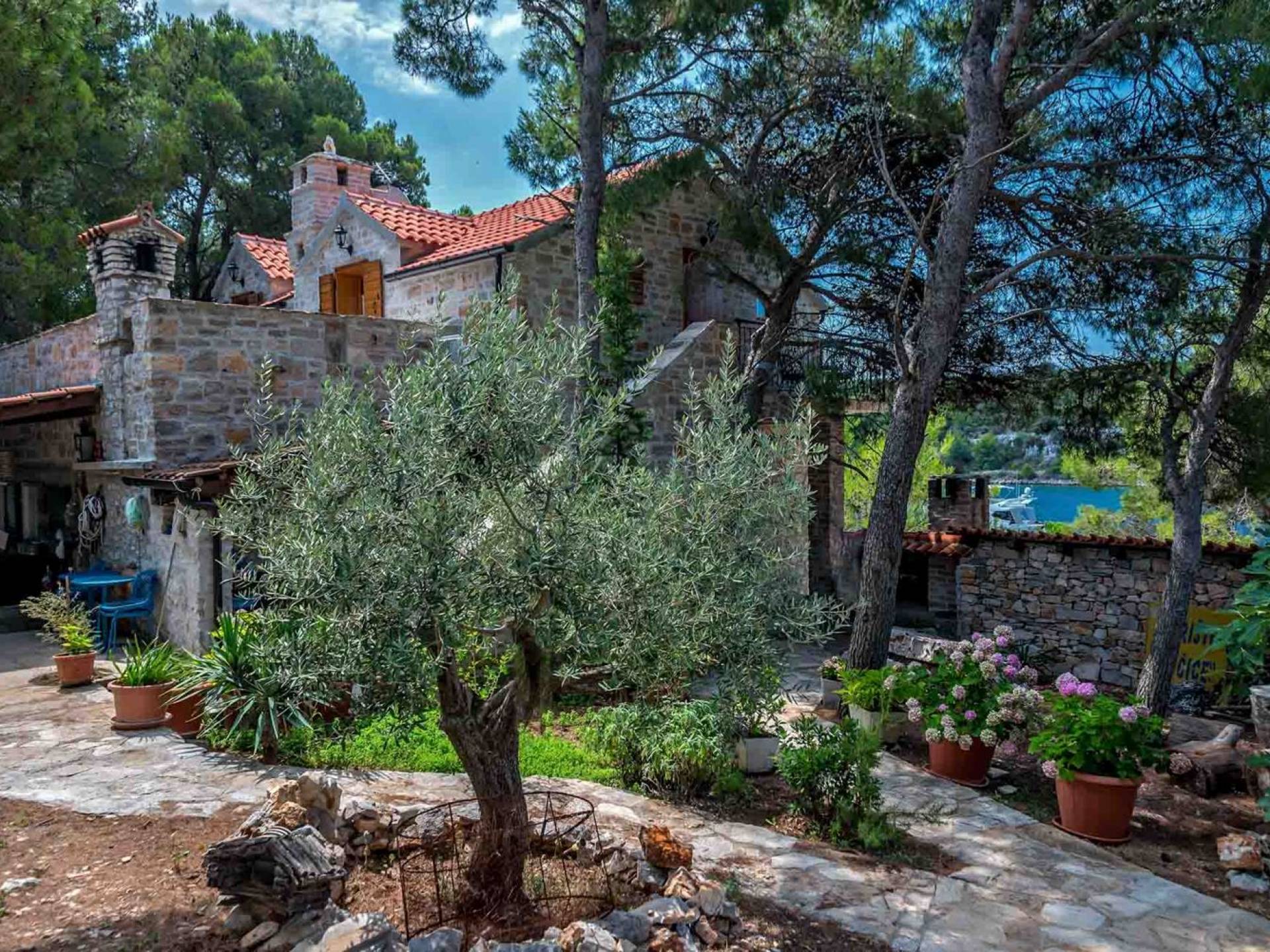 L'extérieur dispose d'une grande piscine privée (40 m²) entourée de transats et de parasols confortables, ainsi que d'une salle à manger ombragée idéale pour les repas en plein air et les moments de socialisation, rehaussée par le parfum distinctif des types de végétation dans cette région de la Méditerranée. Il y a aussi une cuisine d'été typiquement dalmate où vous pouvez préparer des plats savoureux mais si vous aimez un restaurant servant des aliments cultivés localement se trouve également sur place.