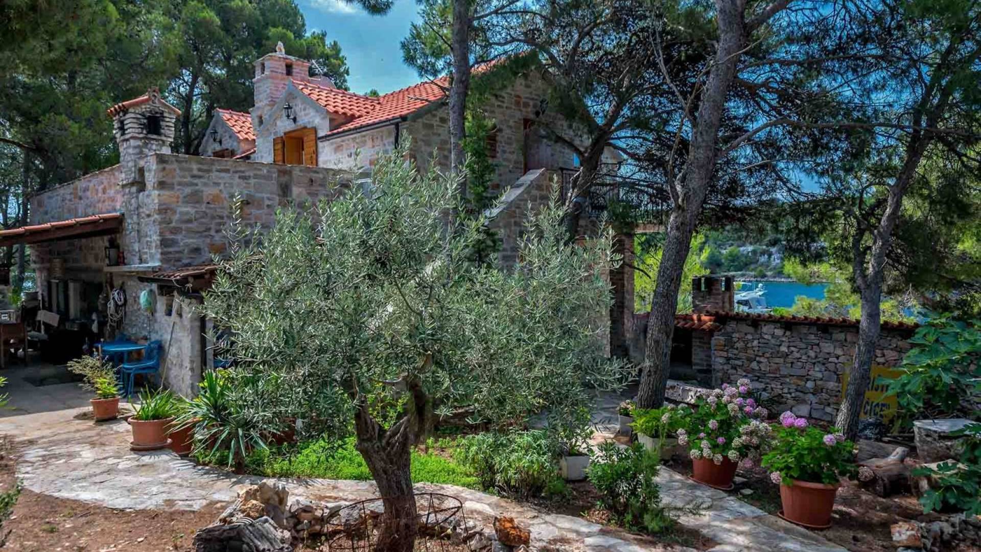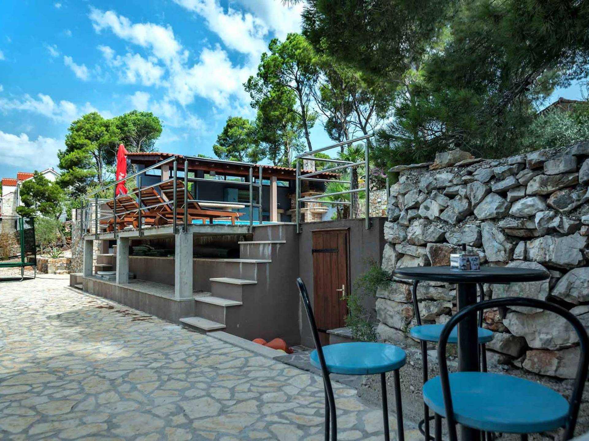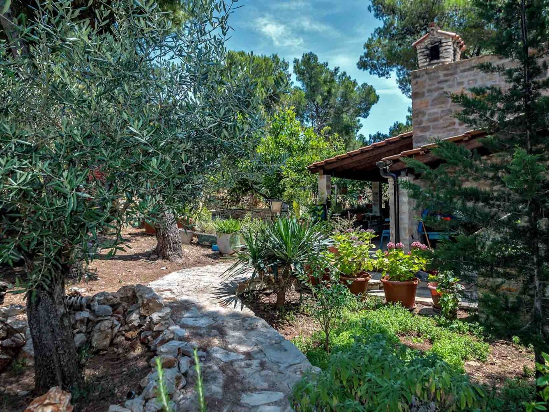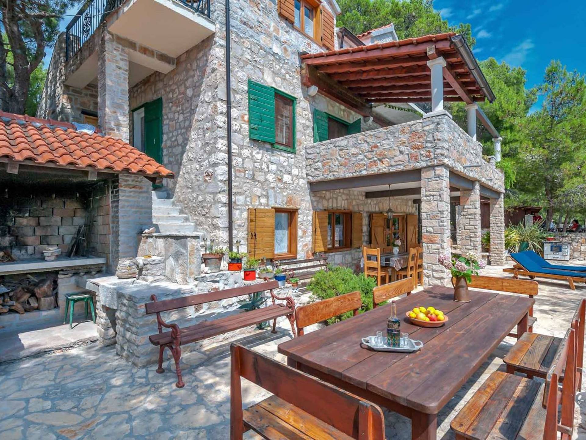 L'extérieur dispose d'une grande piscine privée (40 m²) entourée de transats et de parasols confortables, ainsi que d'une salle à manger ombragée idéale pour les repas en plein air et les moments de socialisation, rehaussée par le parfum distinctif des types de végétation dans cette région de la Méditerranée. Il y a aussi une cuisine d'été typiquement dalmate où vous pouvez préparer des plats savoureux mais si vous aimez un restaurant servant des aliments cultivés localement se trouve également sur place.