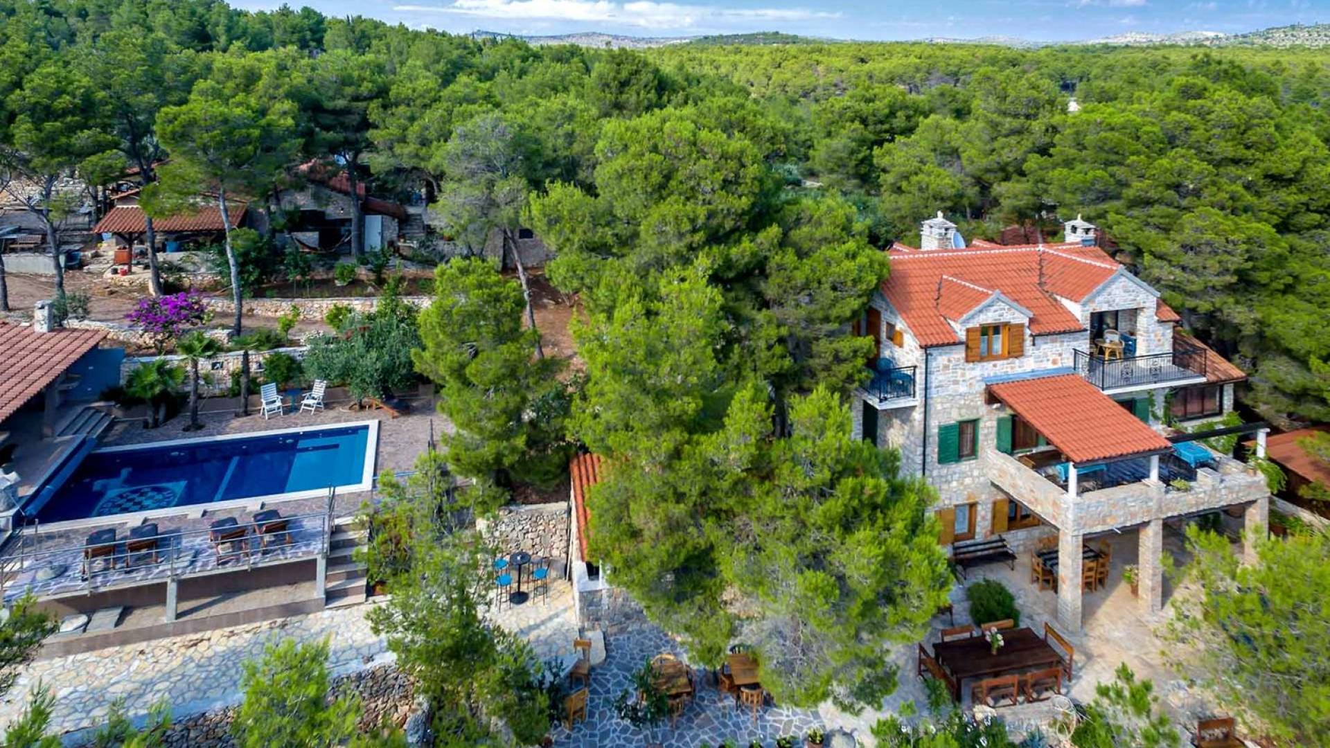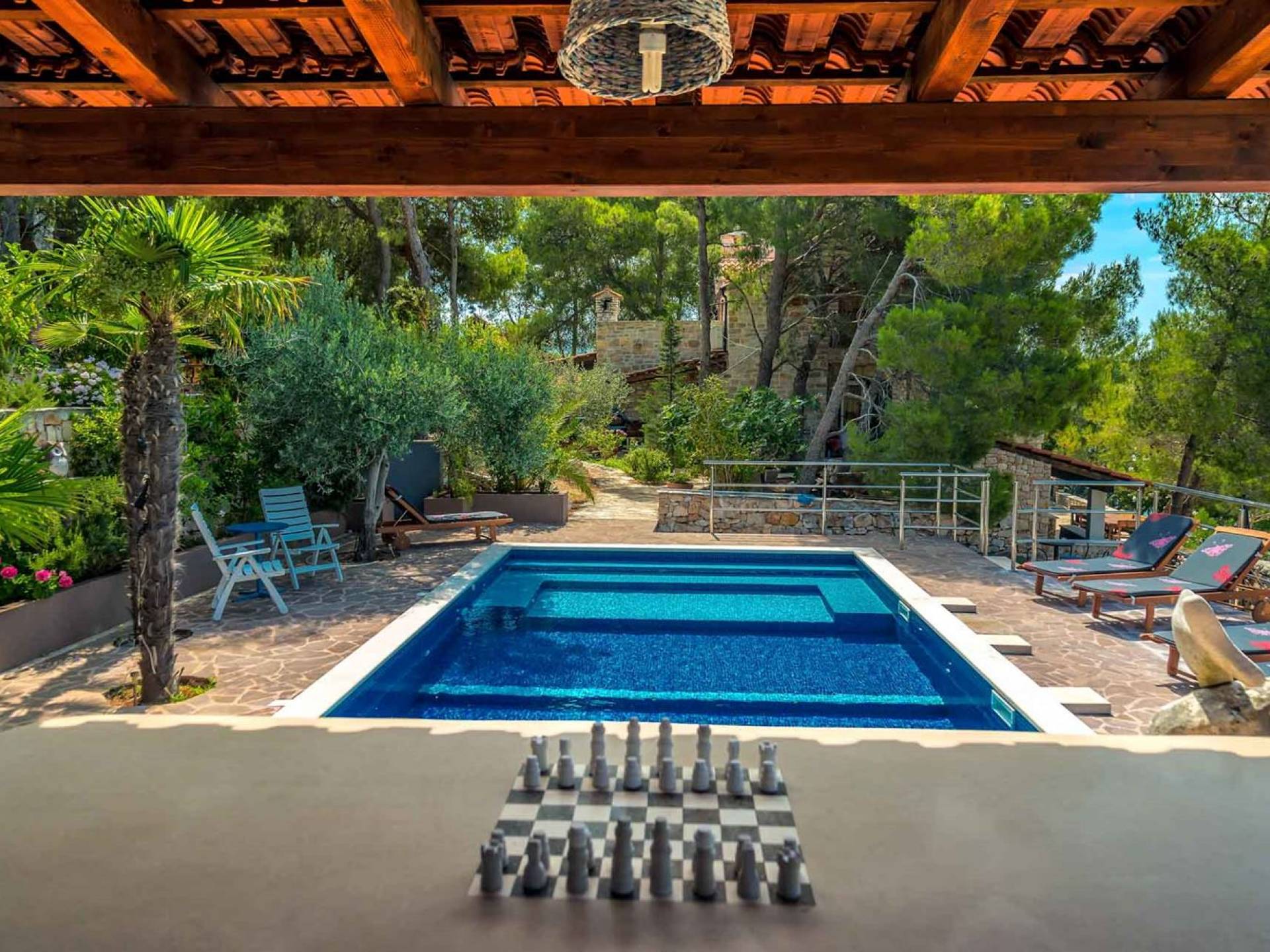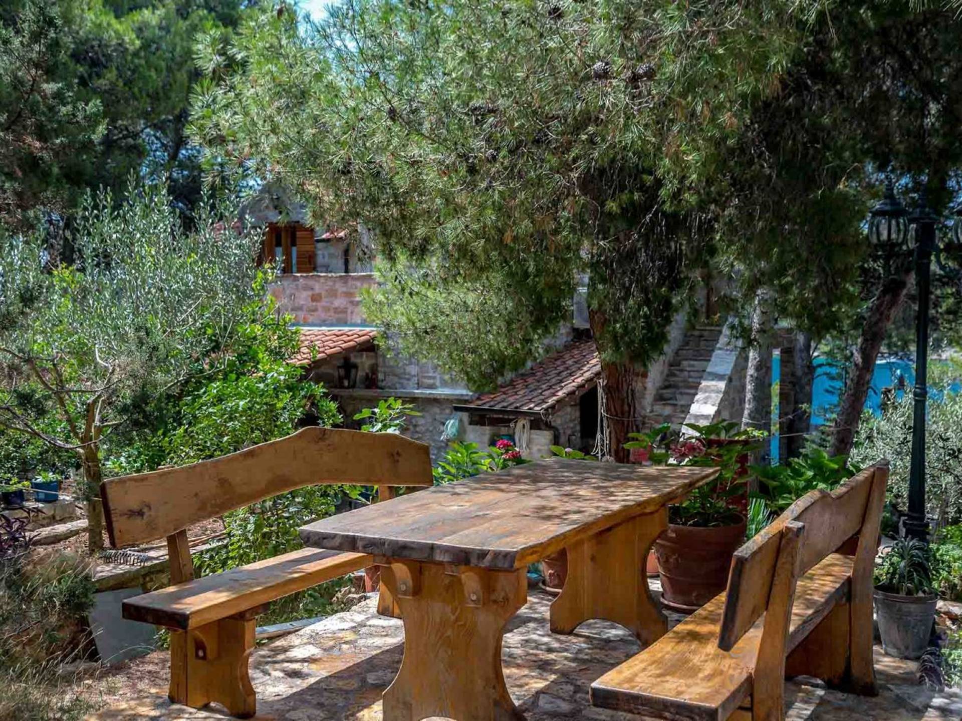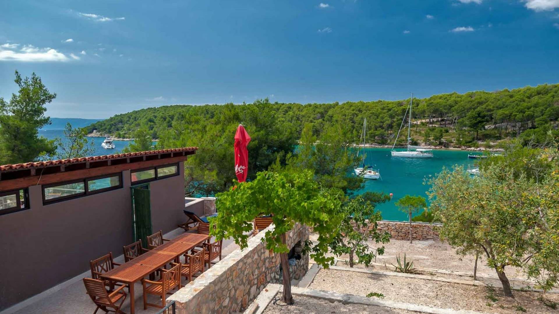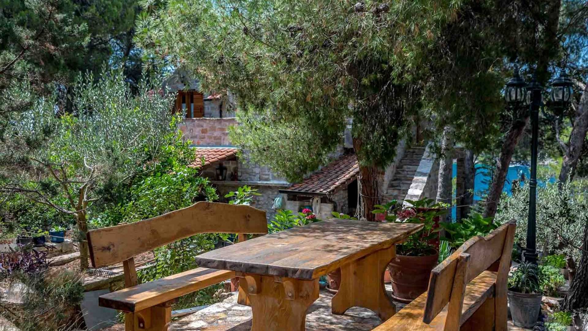 L'extérieur dispose d'une grande piscine privée (40 m²) entourée de transats et de parasols confortables, ainsi que d'une salle à manger ombragée idéale pour les repas en plein air et les moments de socialisation, rehaussée par le parfum distinctif des types de végétation dans cette région de la Méditerranée. Il y a aussi une cuisine d'été typiquement dalmate où vous pouvez préparer des plats savoureux mais si vous aimez un restaurant servant des aliments cultivés localement se trouve également sur place.