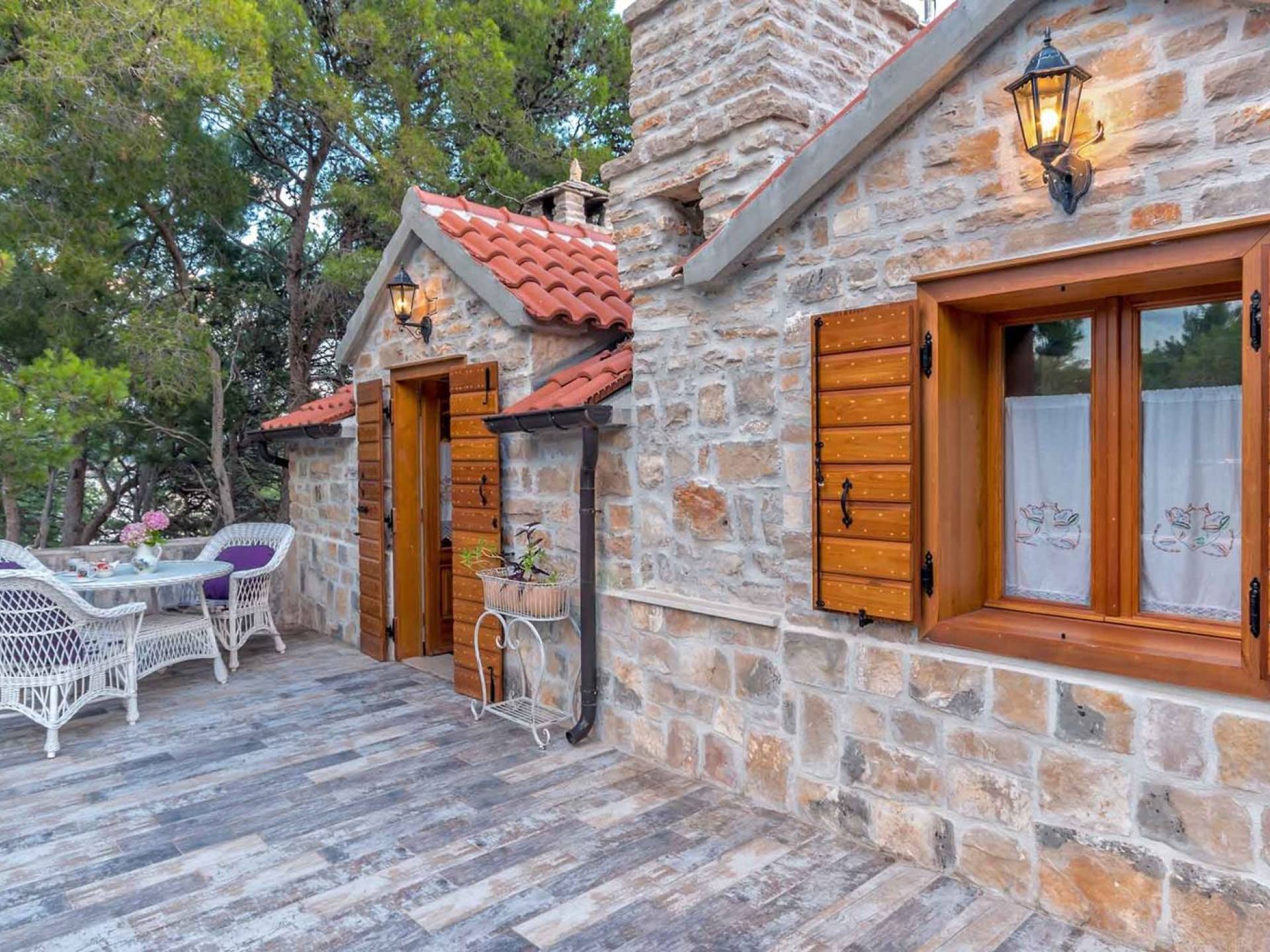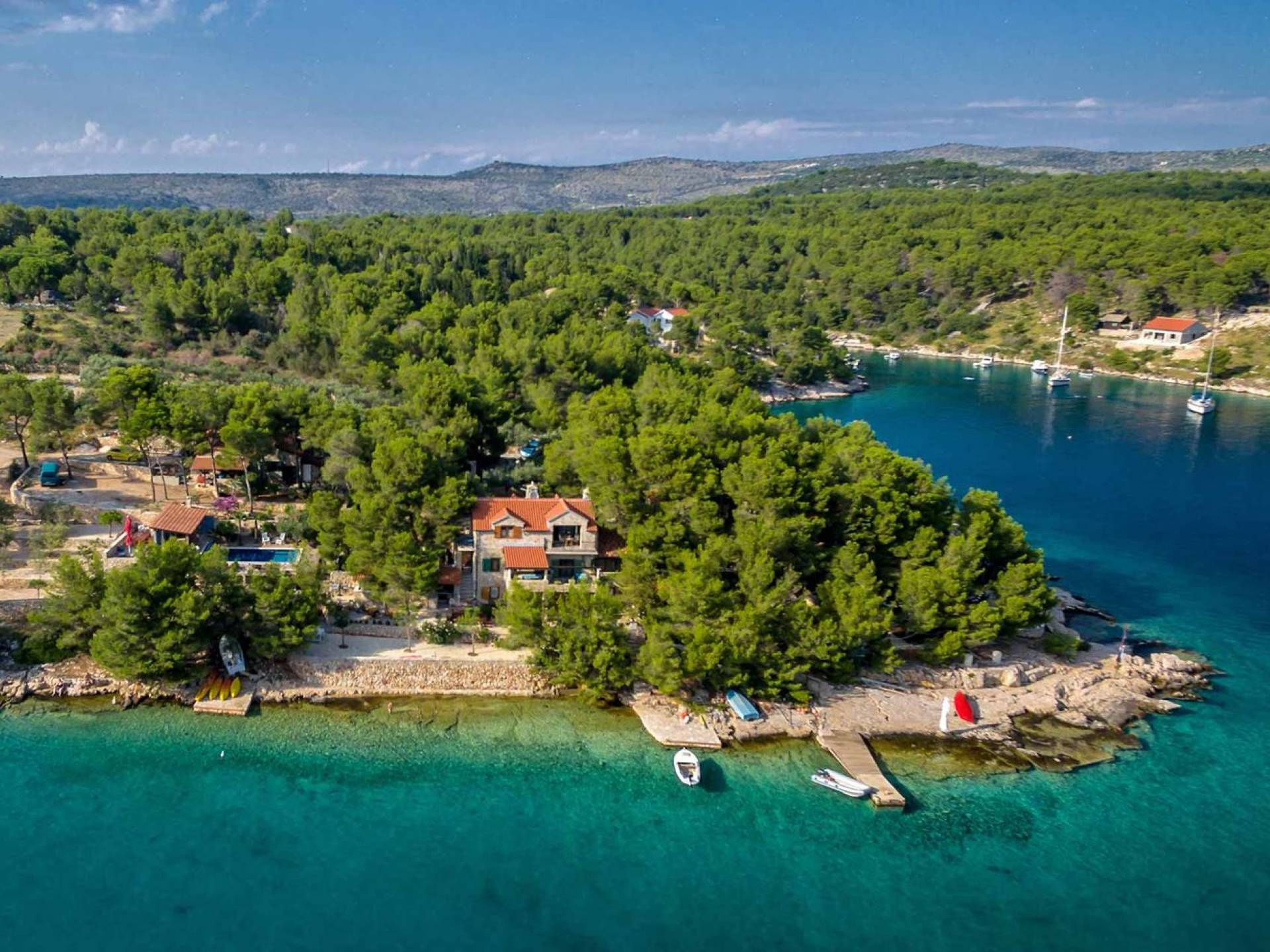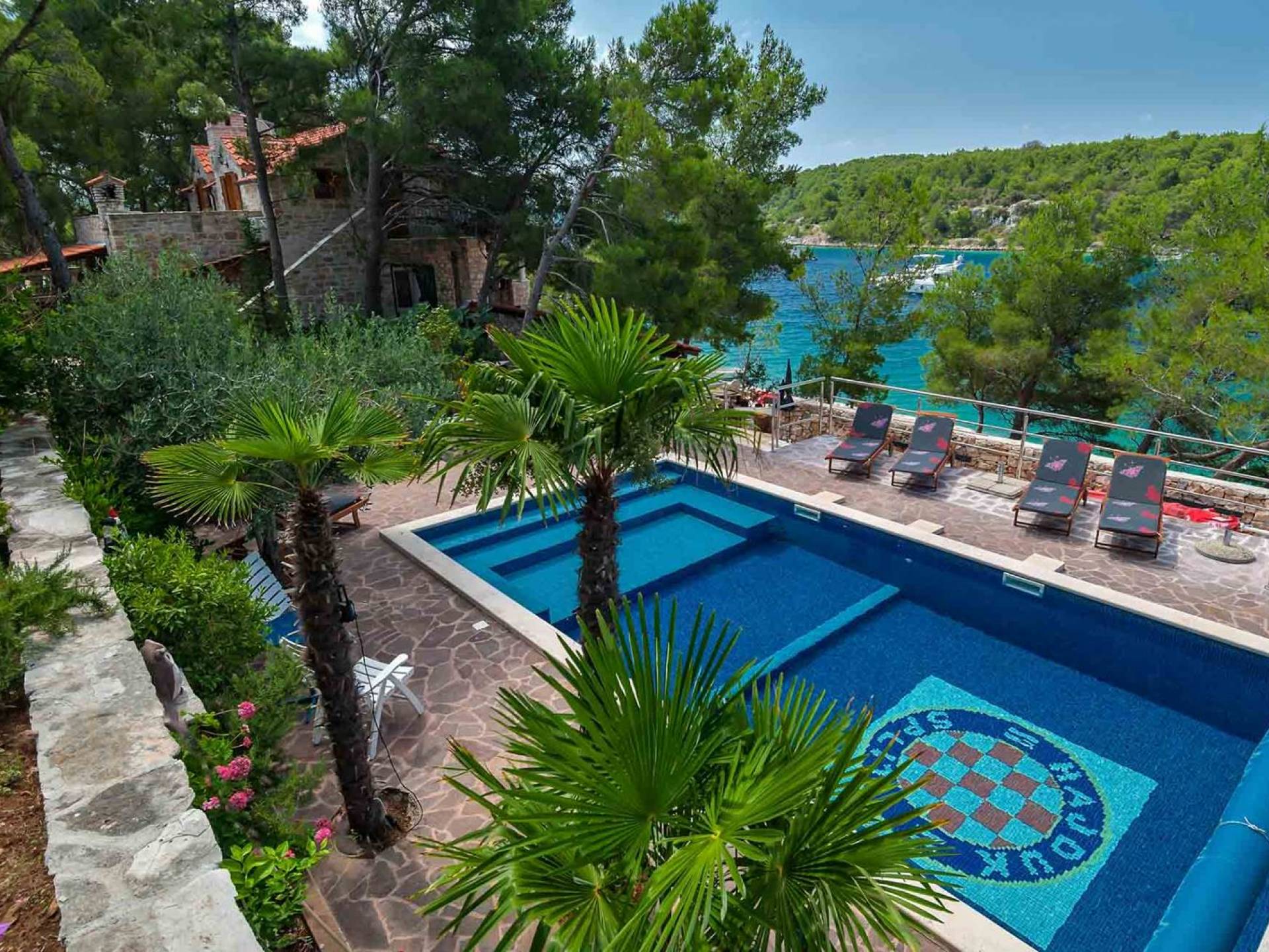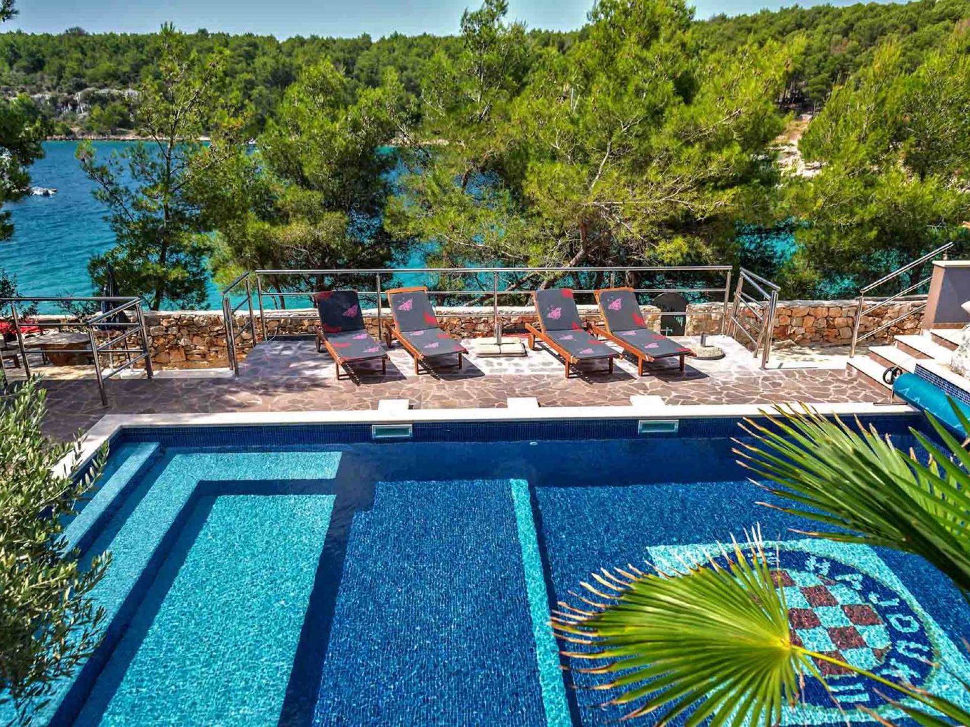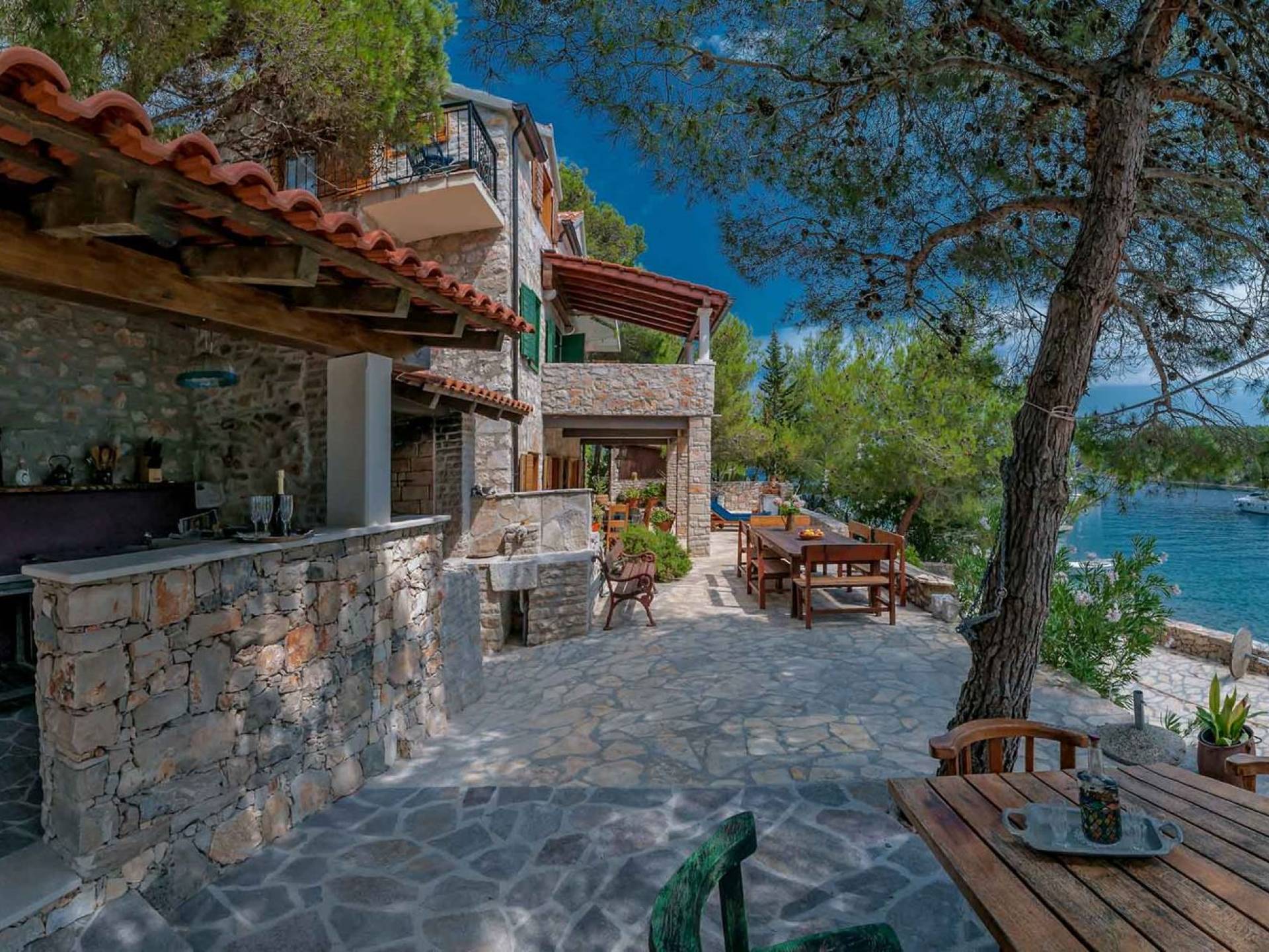 L'extérieur dispose d'une grande piscine privée (40 m²) entourée de transats et de parasols confortables, ainsi que d'une salle à manger ombragée idéale pour les repas en plein air et les moments de socialisation, rehaussée par le parfum distinctif des types de végétation dans cette région de la Méditerranée. Il y a aussi une cuisine d'été typiquement dalmate où vous pouvez préparer des plats savoureux mais si vous aimez un restaurant servant des aliments cultivés localement se trouve également sur place.
