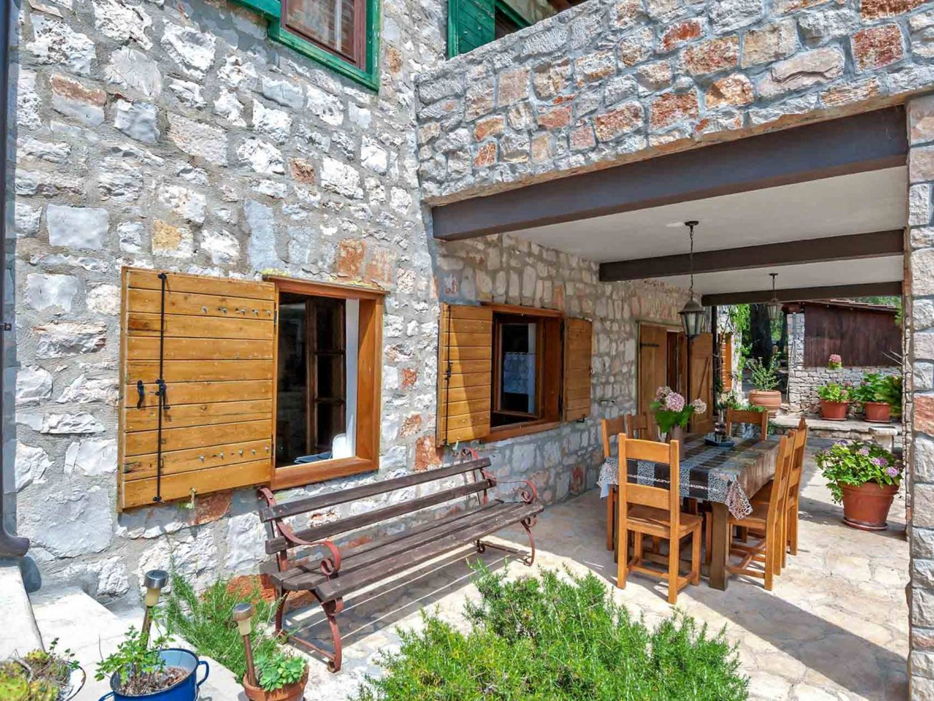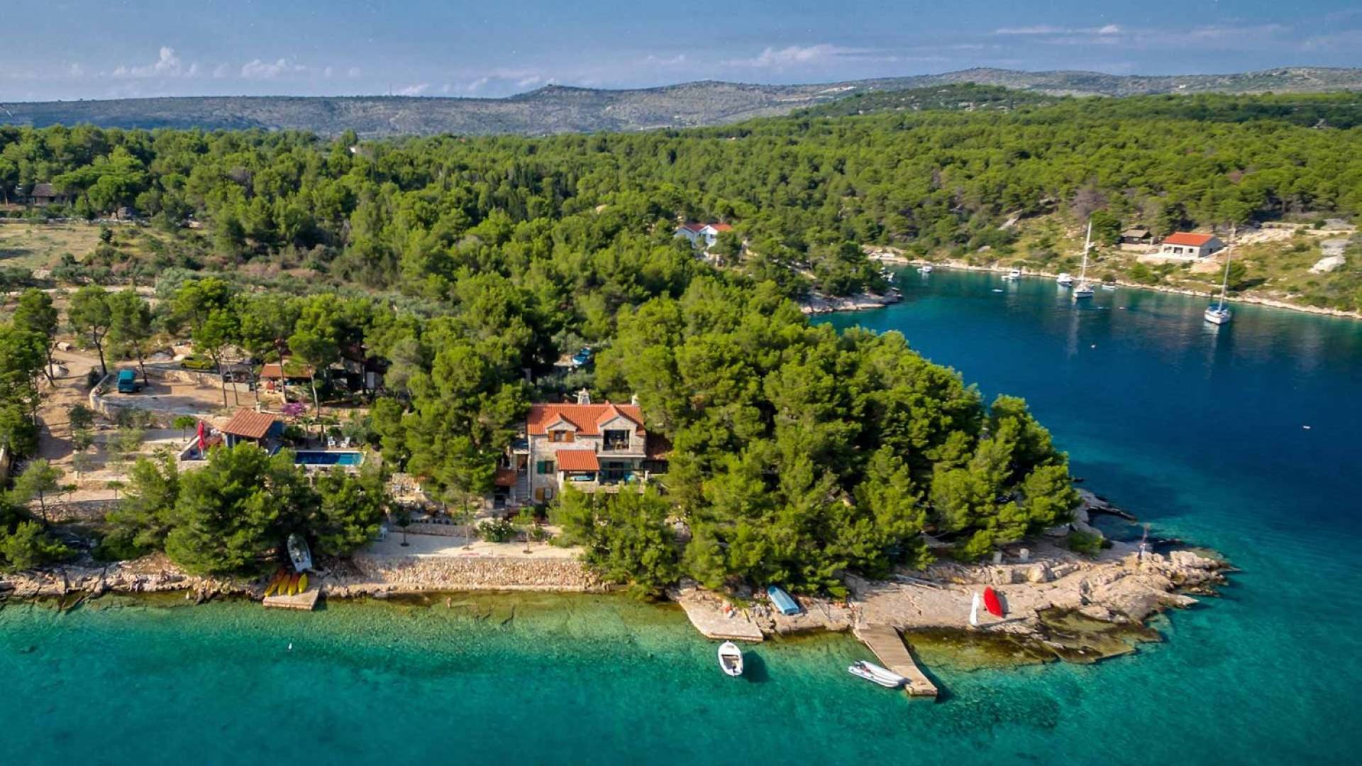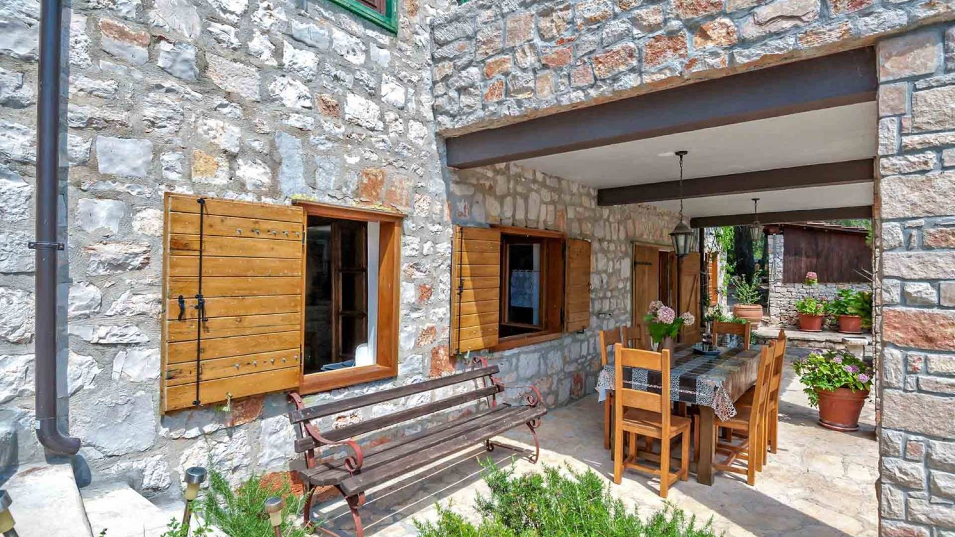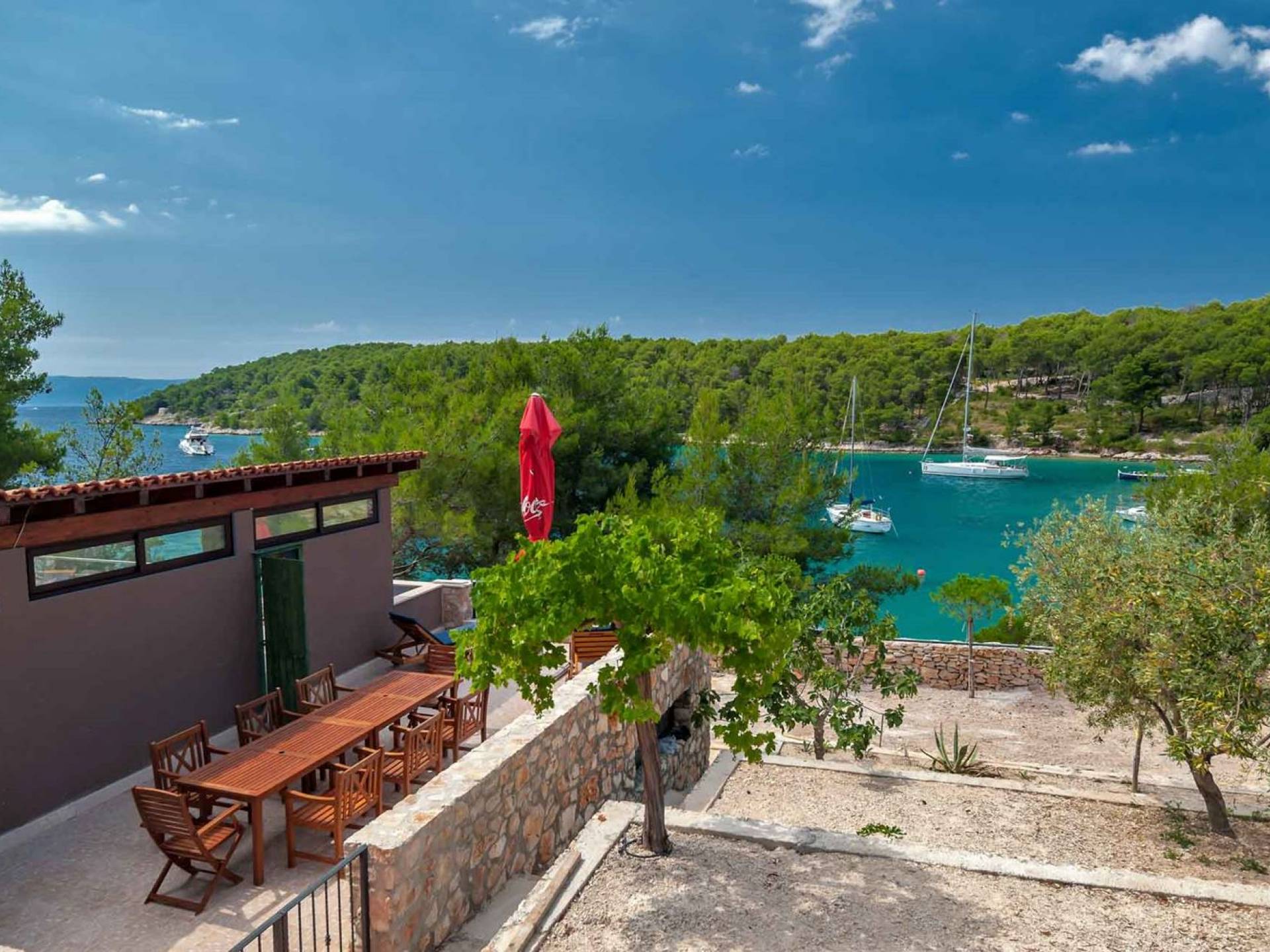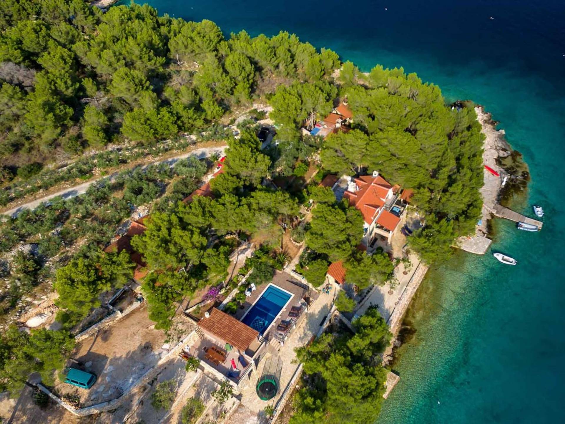 L'extérieur dispose d'une grande piscine privée (40 m²) entourée de transats et de parasols confortables, ainsi que d'une salle à manger ombragée idéale pour les repas en plein air et les moments de socialisation, rehaussée par le parfum distinctif des types de végétation dans cette région de la Méditerranée. Il y a aussi une cuisine d'été typiquement dalmate où vous pouvez préparer des plats savoureux mais si vous aimez un restaurant servant des aliments cultivés localement se trouve également sur place.