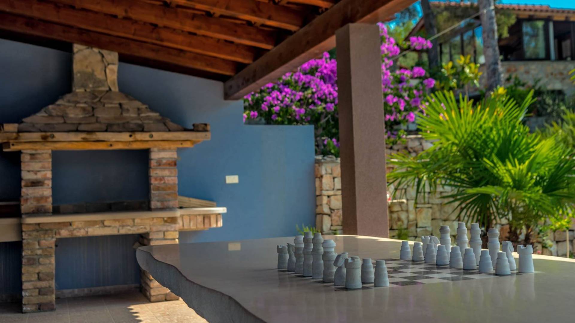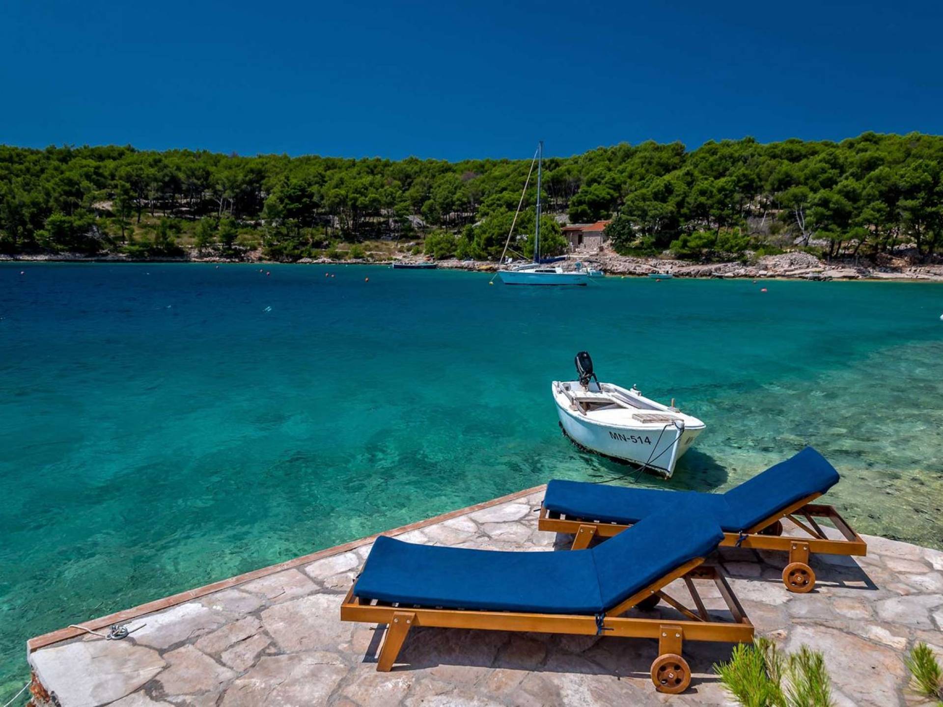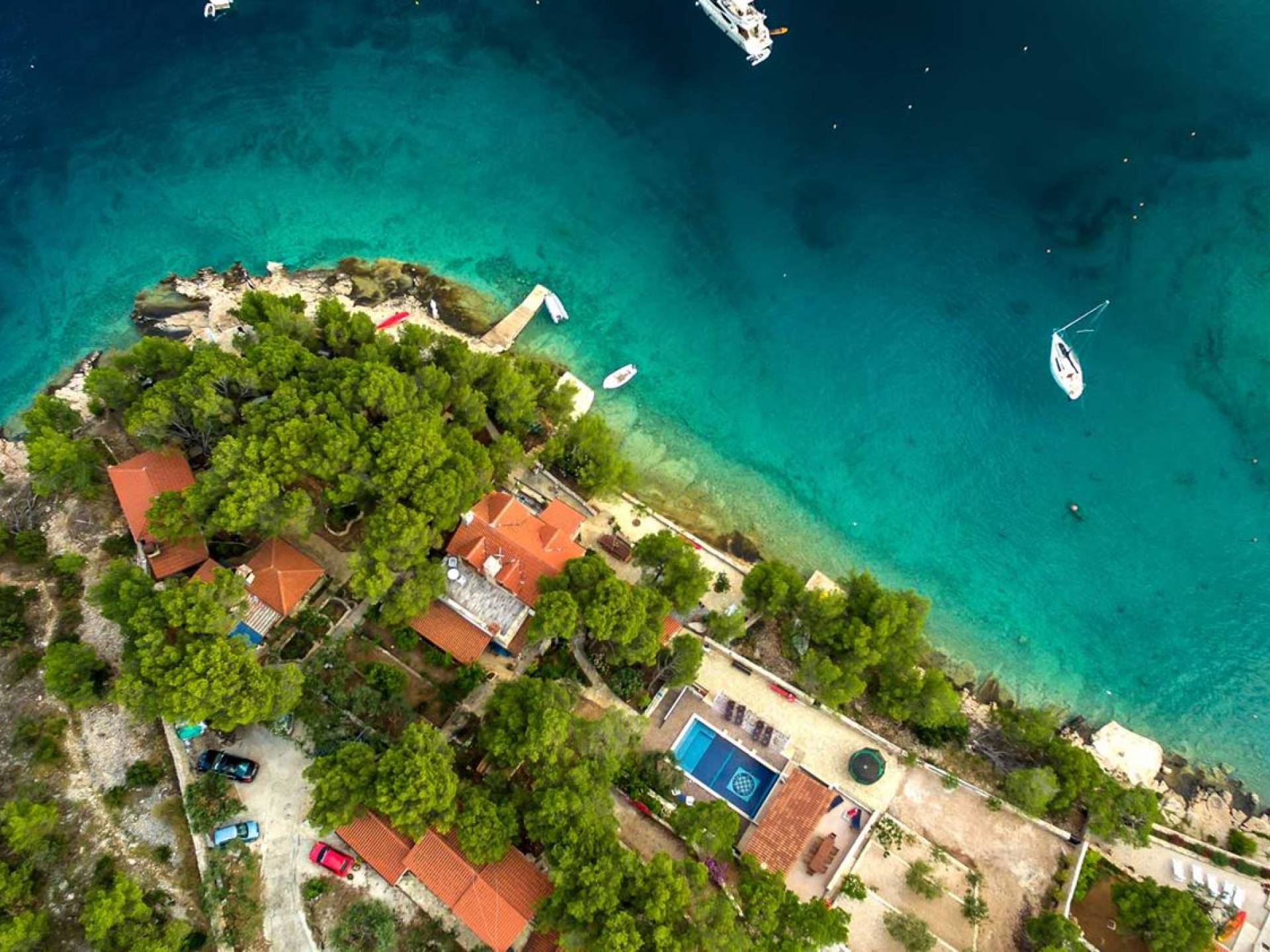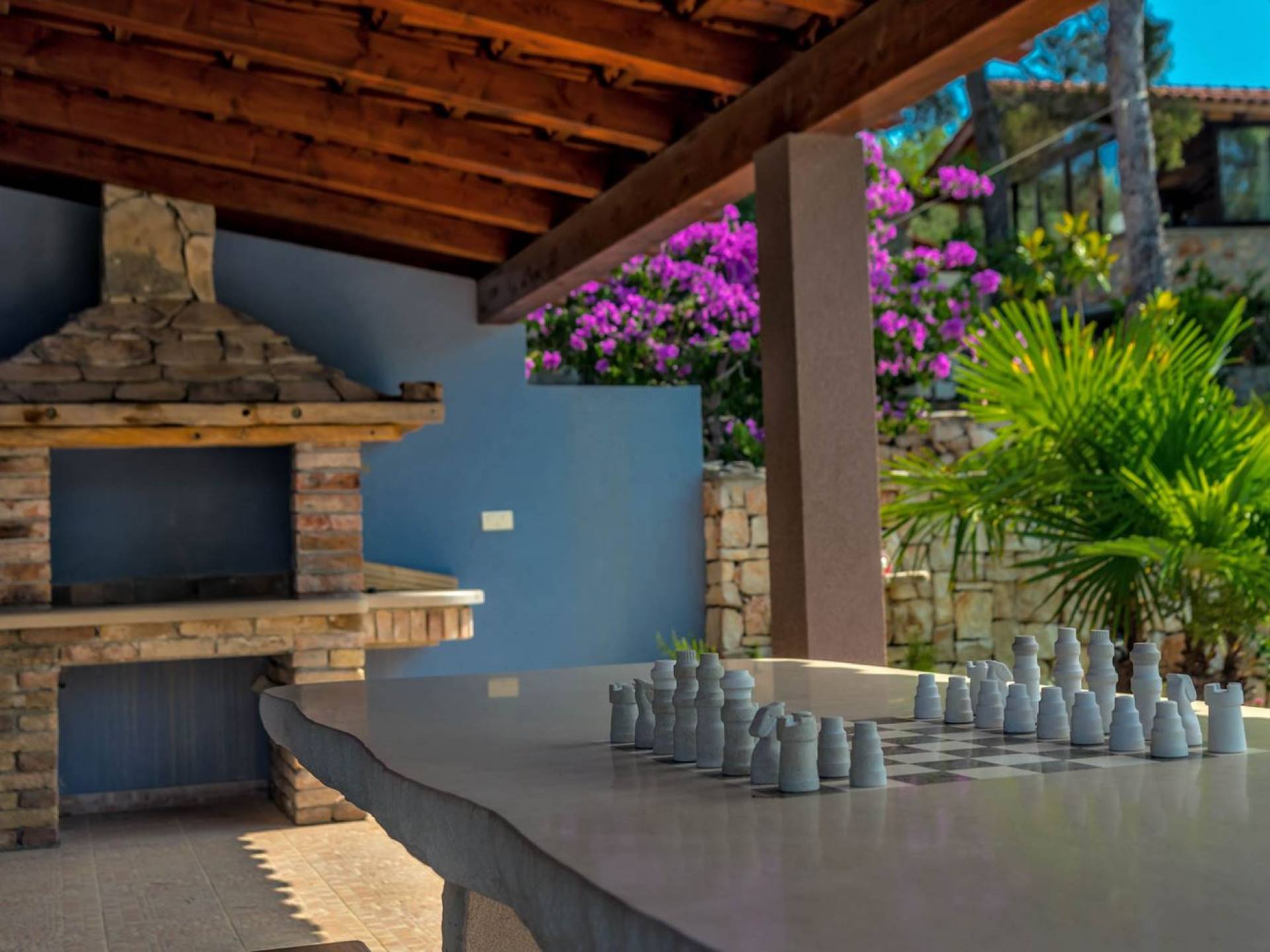 L'extérieur dispose d'une grande piscine privée (40 m²) entourée de transats et de parasols confortables, ainsi que d'une salle à manger ombragée idéale pour les repas en plein air et les moments de socialisation, rehaussée par le parfum distinctif des types de végétation dans cette région de la Méditerranée. Il y a aussi une cuisine d'été typiquement dalmate où vous pouvez préparer des plats savoureux mais si vous aimez un restaurant servant des aliments cultivés localement se trouve également sur place.