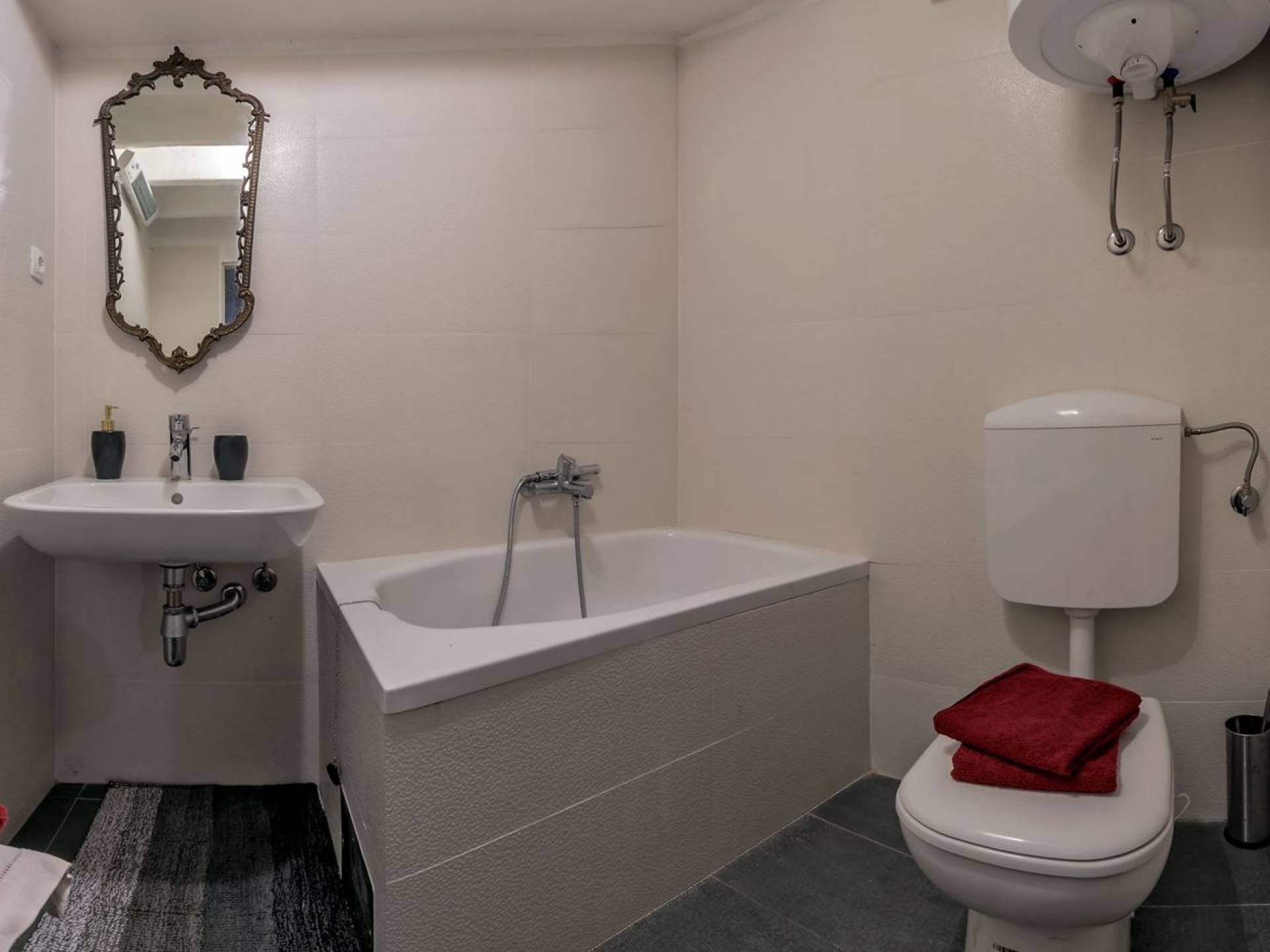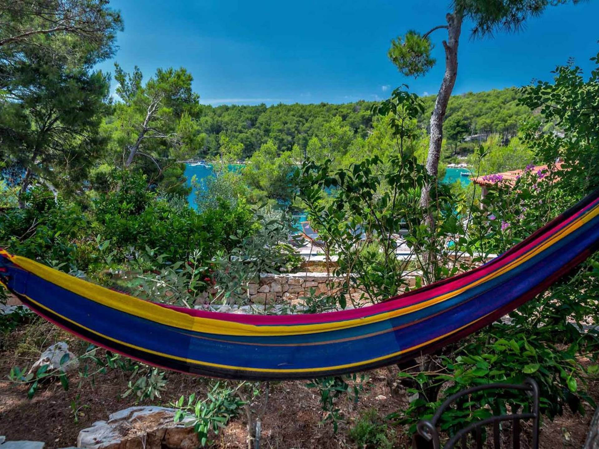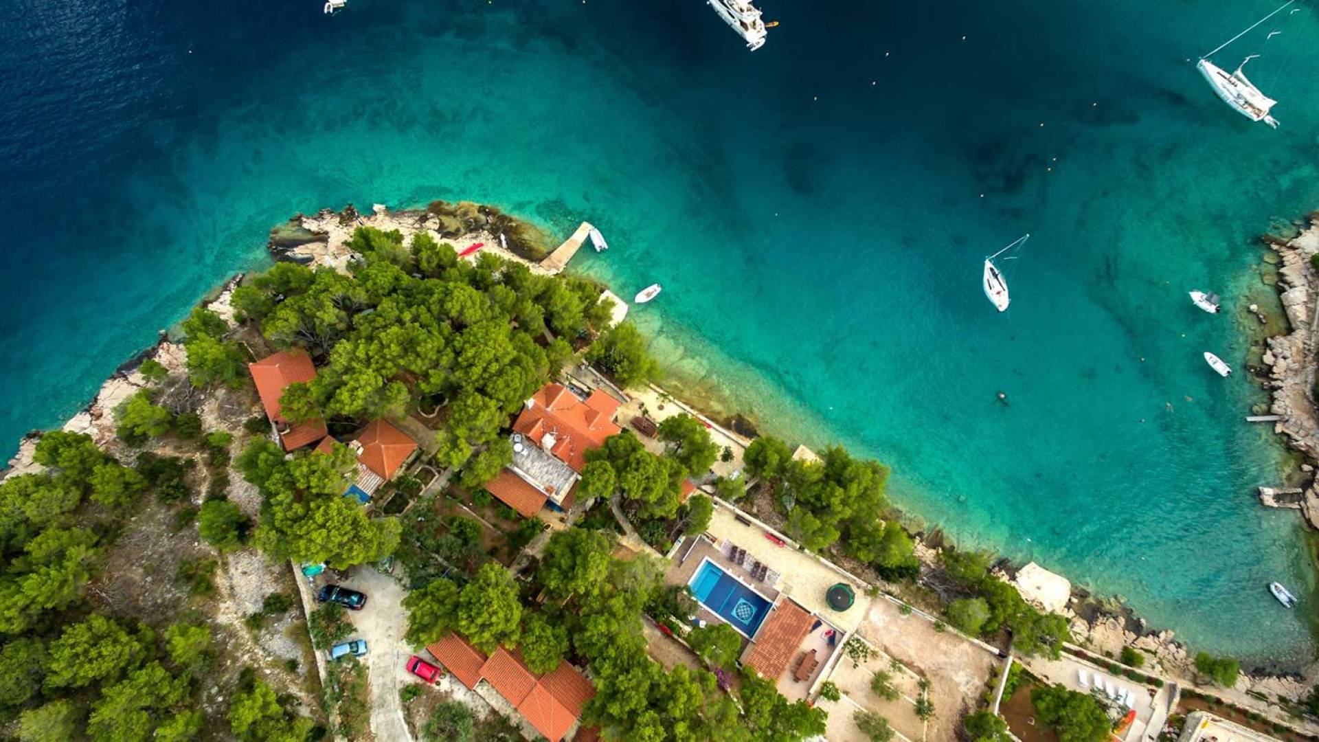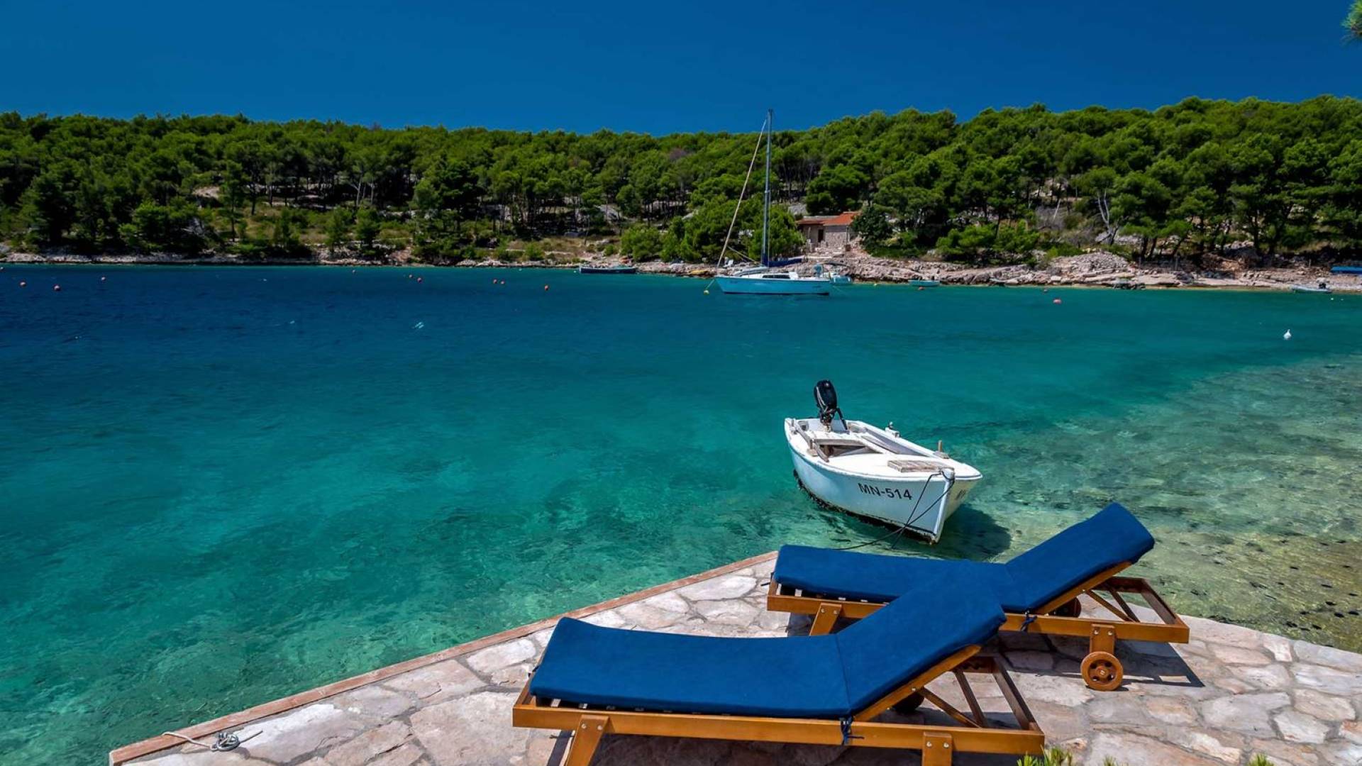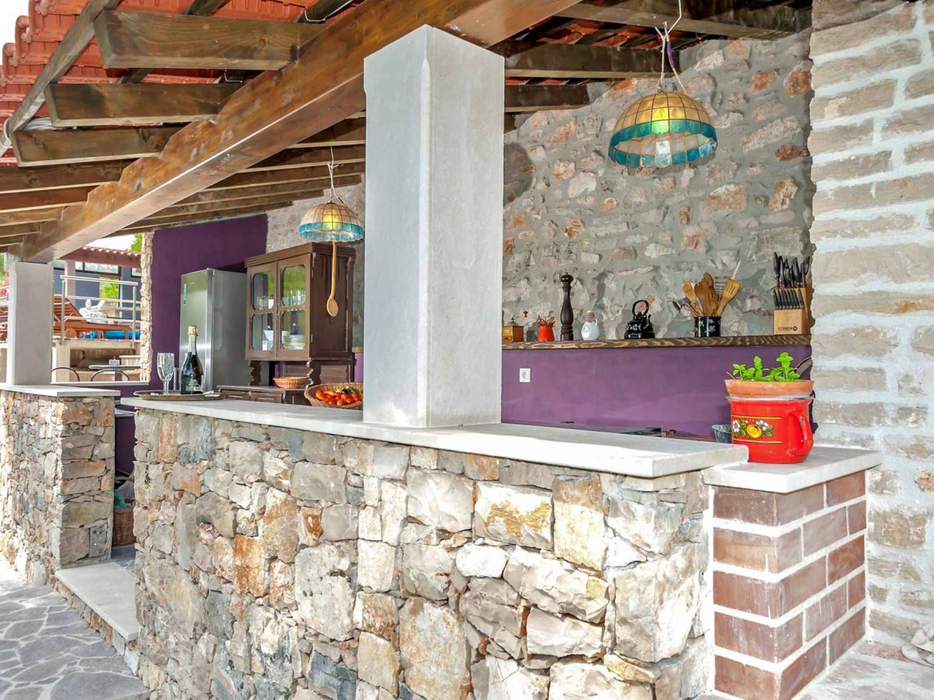 L'extérieur dispose d'une grande piscine privée (40 m²) entourée de transats et de parasols confortables, ainsi que d'une salle à manger ombragée idéale pour les repas en plein air et les moments de socialisation, rehaussée par le parfum distinctif des types de végétation dans cette région de la Méditerranée. Il y a aussi une cuisine d'été typiquement dalmate où vous pouvez préparer des plats savoureux mais si vous aimez un restaurant servant des aliments cultivés localement se trouve également sur place.