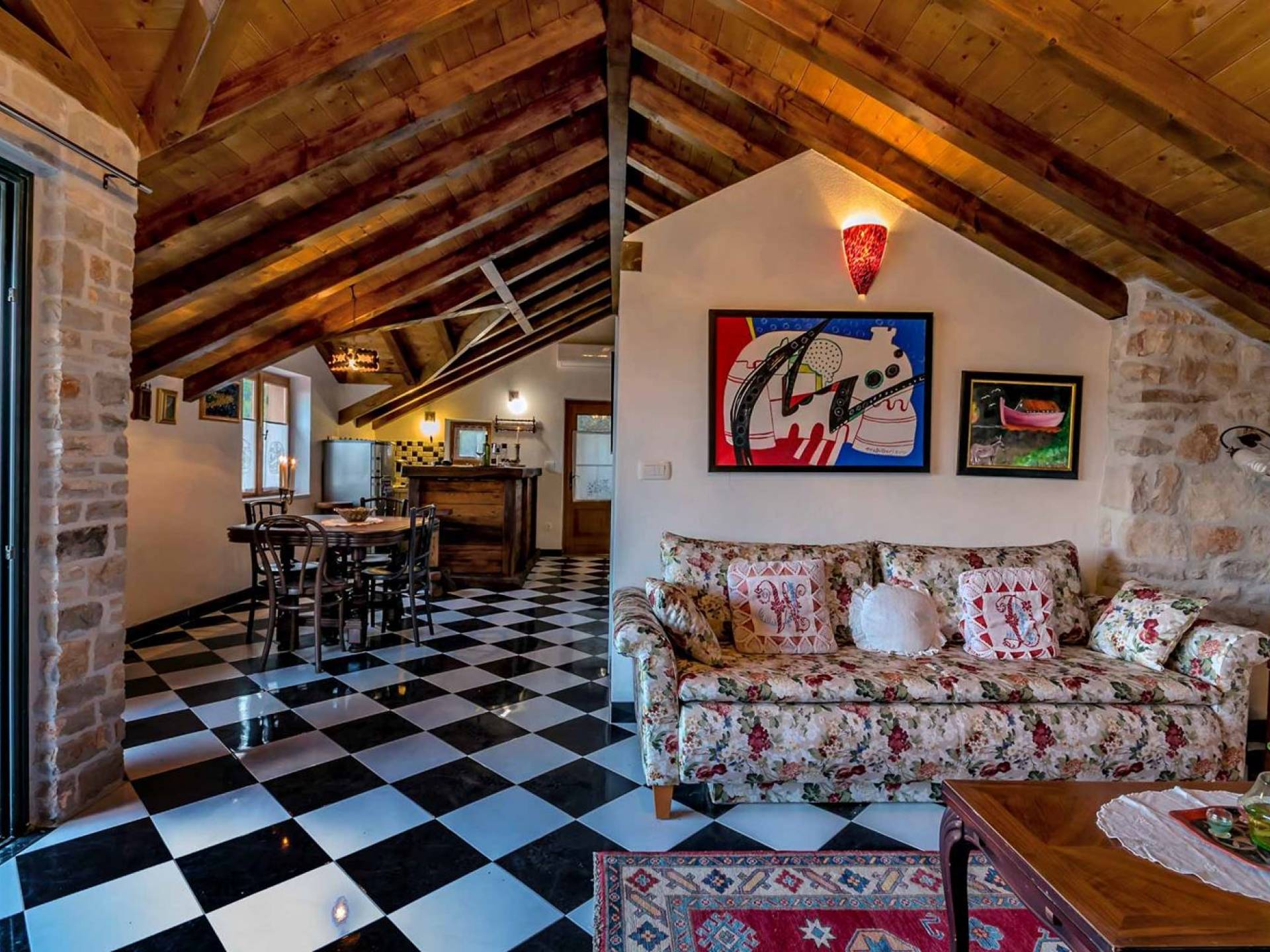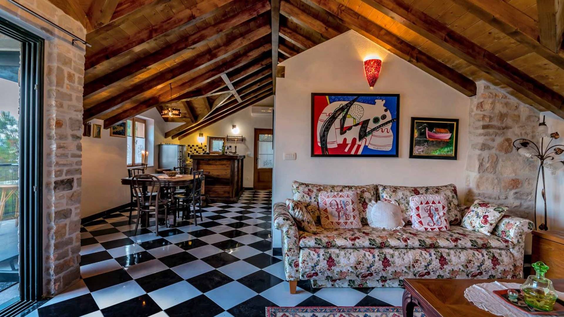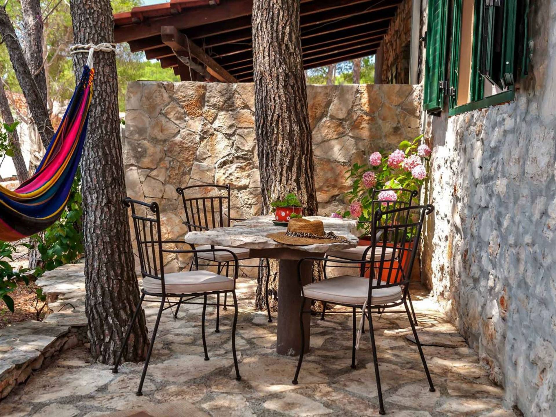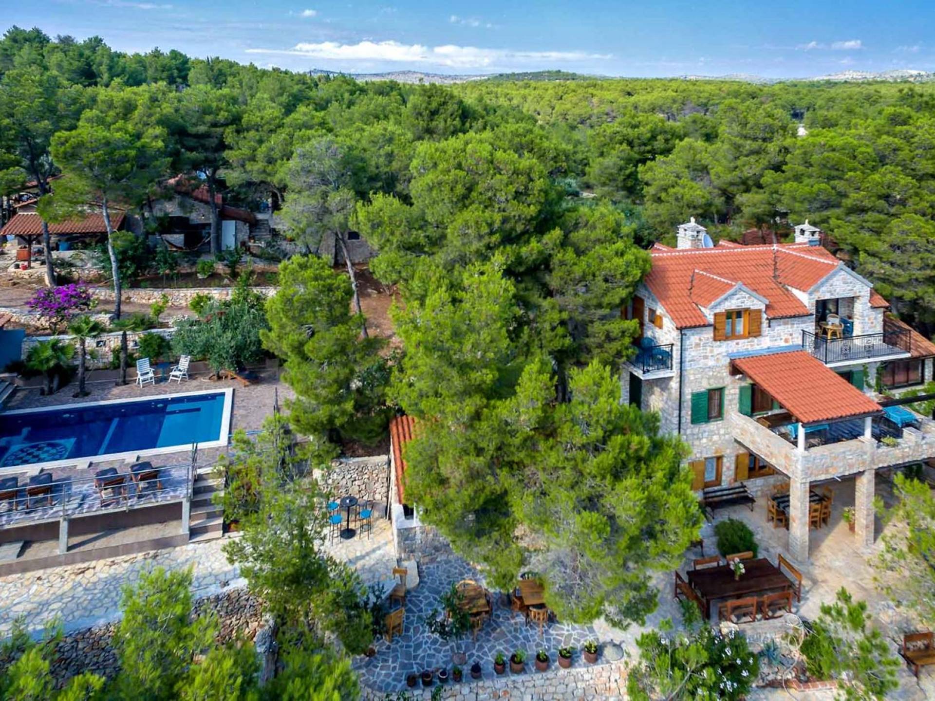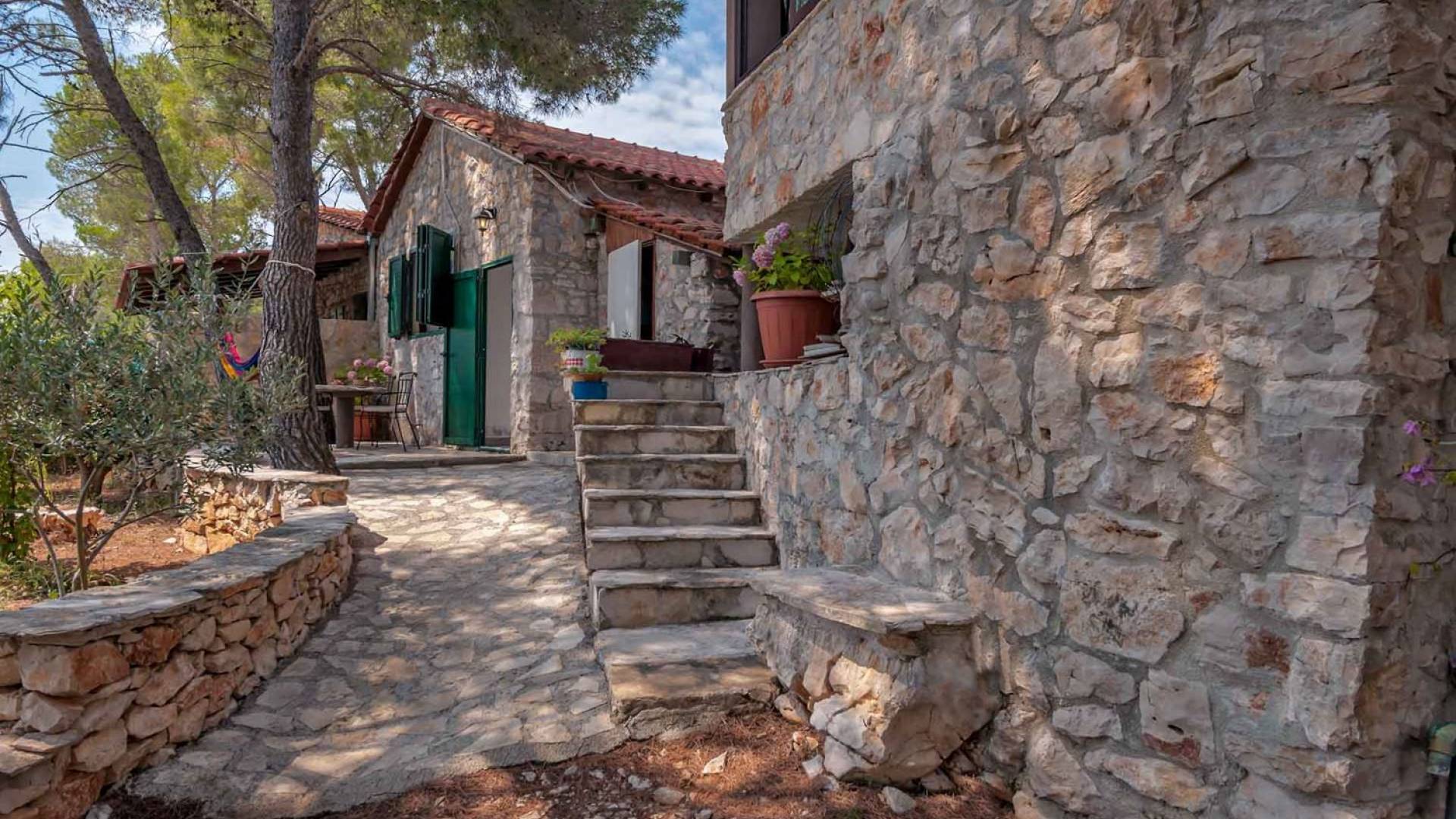 Entrer dans la propriété, c'est un peu comme franchir les portes d'un conte de fées. La Villa Floretta est composée de quatre propriétés distinctes sur un même terrain. Tous les quatre ont été construits avec de la pierre dalmate et se fondent harmonieusement dans l'environnement. Alors que les extérieurs sont traditionnels, l'intérieur est une collection de bon goût de moments intrigants et artistiques, avec une touche de charme éclectique.