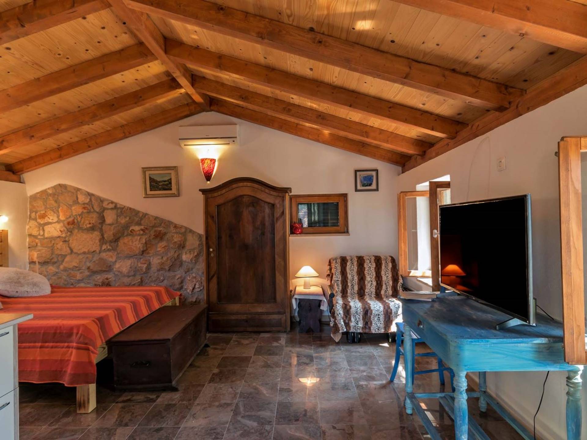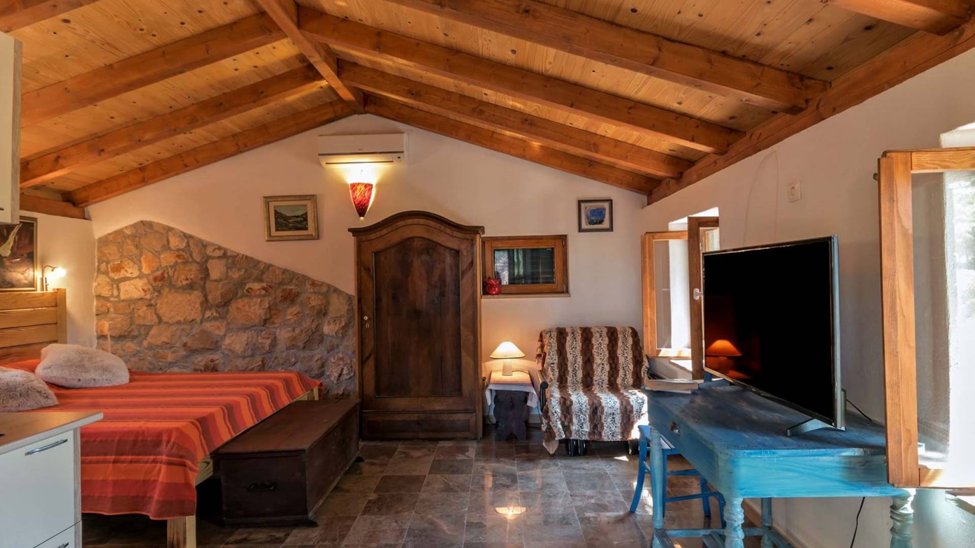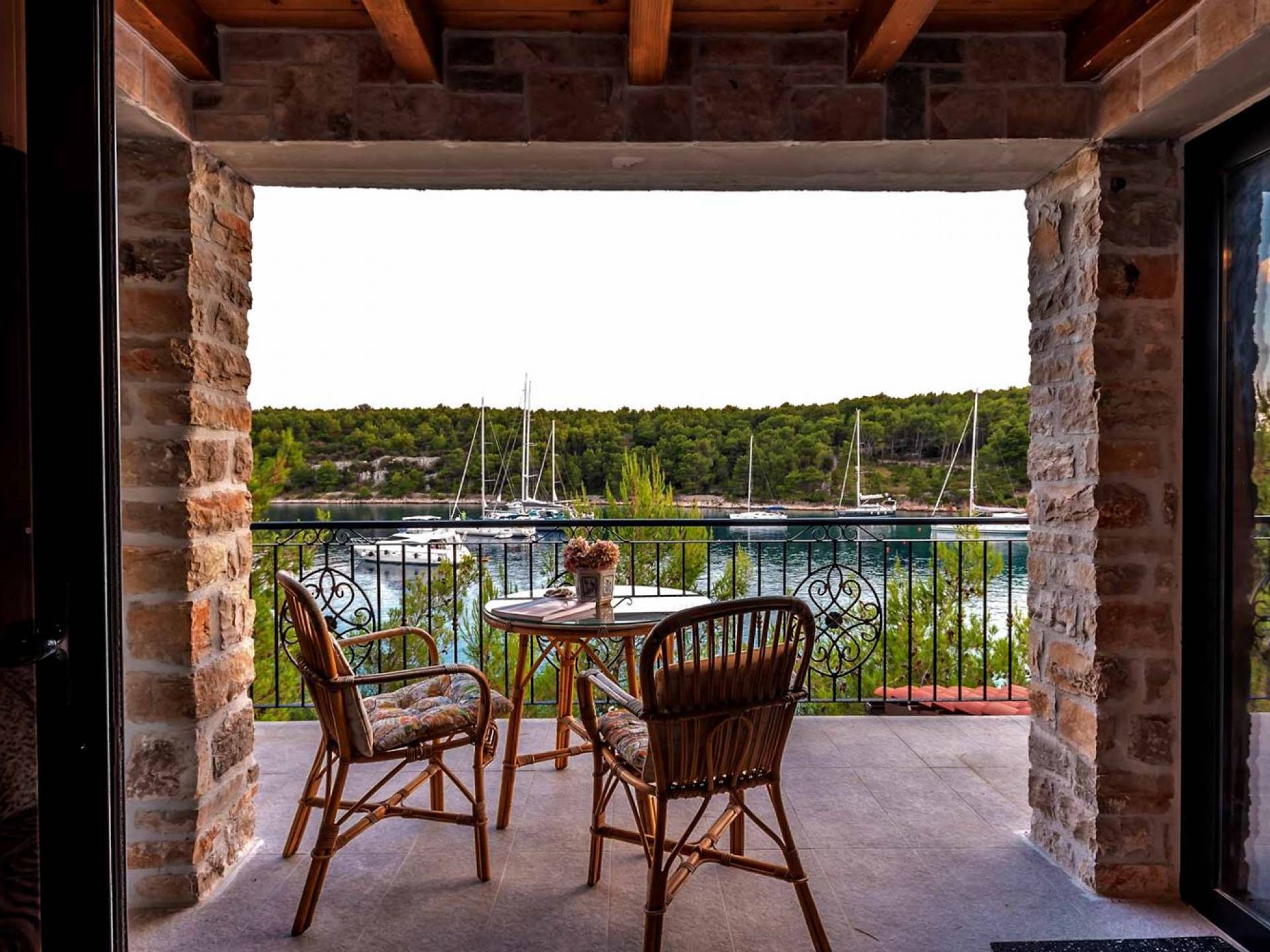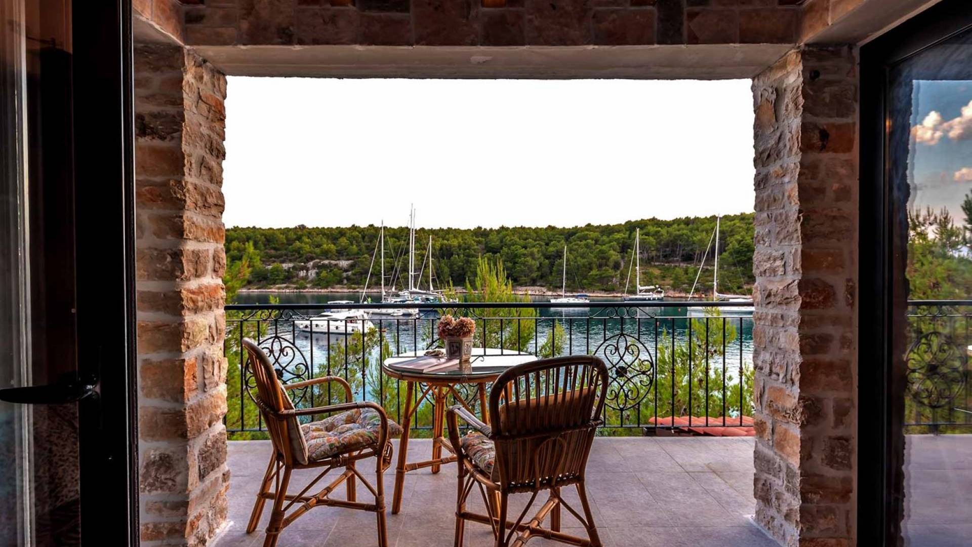 La maison principale est sur trois étages. Au rez-de-chaussée se trouvent une cuisine entièrement équipée, un coin repas, un salon particulièrement agréable, une salle de bains, une chambre double et un lit double supplémentaire. Le premier étage est réservé au directeur de la villa qui est sur place et s'occupe des besoins des clients (ce niveau a une entrée privée et la suite du directeur de la villa est totalement privée). Le deuxième étage est accessible par un escalier extérieur menant à une autre suite équipée d'un lit double, SAT-TV et salle de bain, kitchenette. La loggia attenante surplombant la baie est un bel endroit pour s'asseoir et se détendre. Dans tous les studios, il y a des lits doubles, des salles de bains, une kitchenette, des espaces de vie, une chambre avec un lit double et une salle de bains.