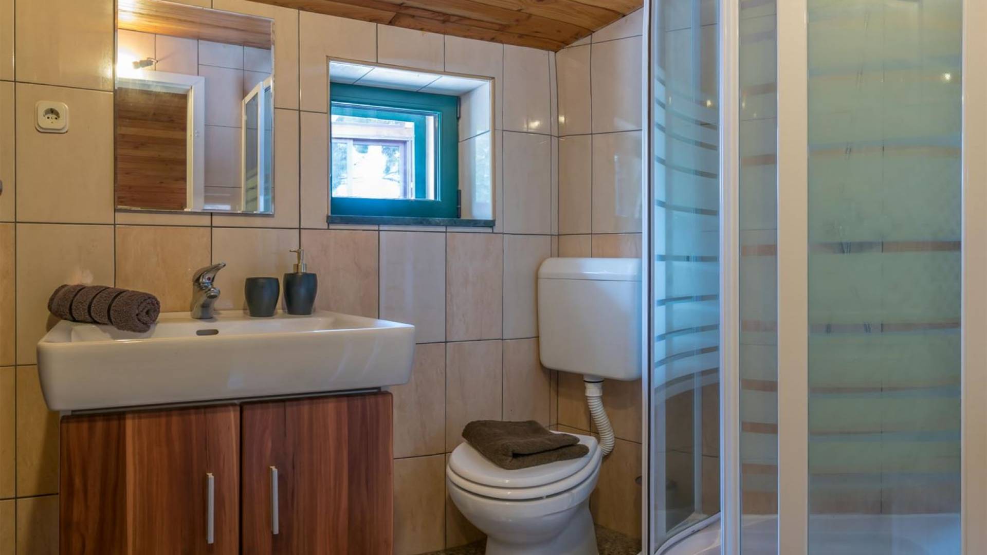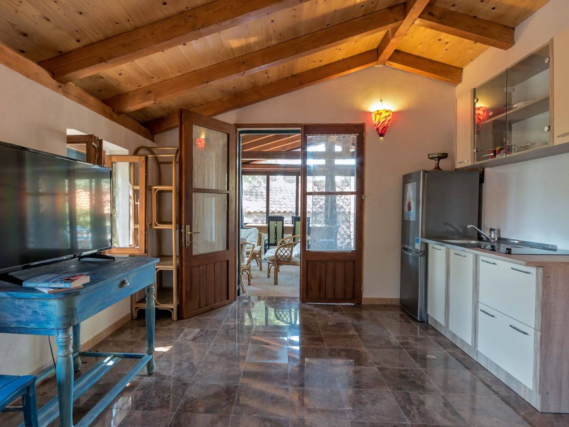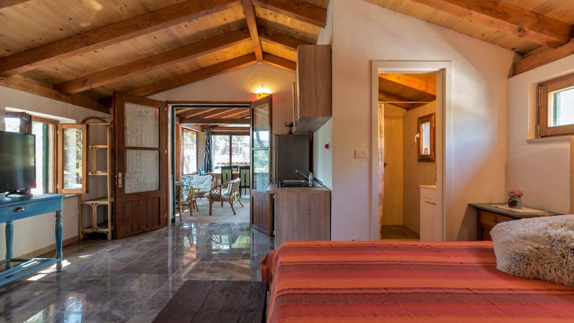 La maison principale est sur trois étages. Au rez-de-chaussée se trouvent une cuisine entièrement équipée, un coin repas, un salon particulièrement agréable, une salle de bains, une chambre double et un lit double supplémentaire. Le premier étage est réservé au directeur de la villa qui est sur place et s'occupe des besoins des clients (ce niveau a une entrée privée et la suite du directeur de la villa est totalement privée). Le deuxième étage est accessible par un escalier extérieur menant à une autre suite équipée d'un lit double, SAT-TV et salle de bain, kitchenette. La loggia attenante surplombant la baie est un bel endroit pour s'asseoir et se détendre. Dans tous les studios, il y a des lits doubles, des salles de bains, une kitchenette, des espaces de vie, une chambre avec un lit double et une salle de bains.