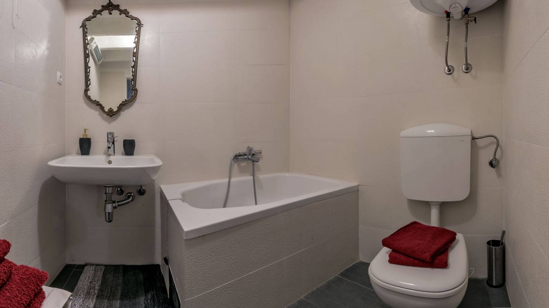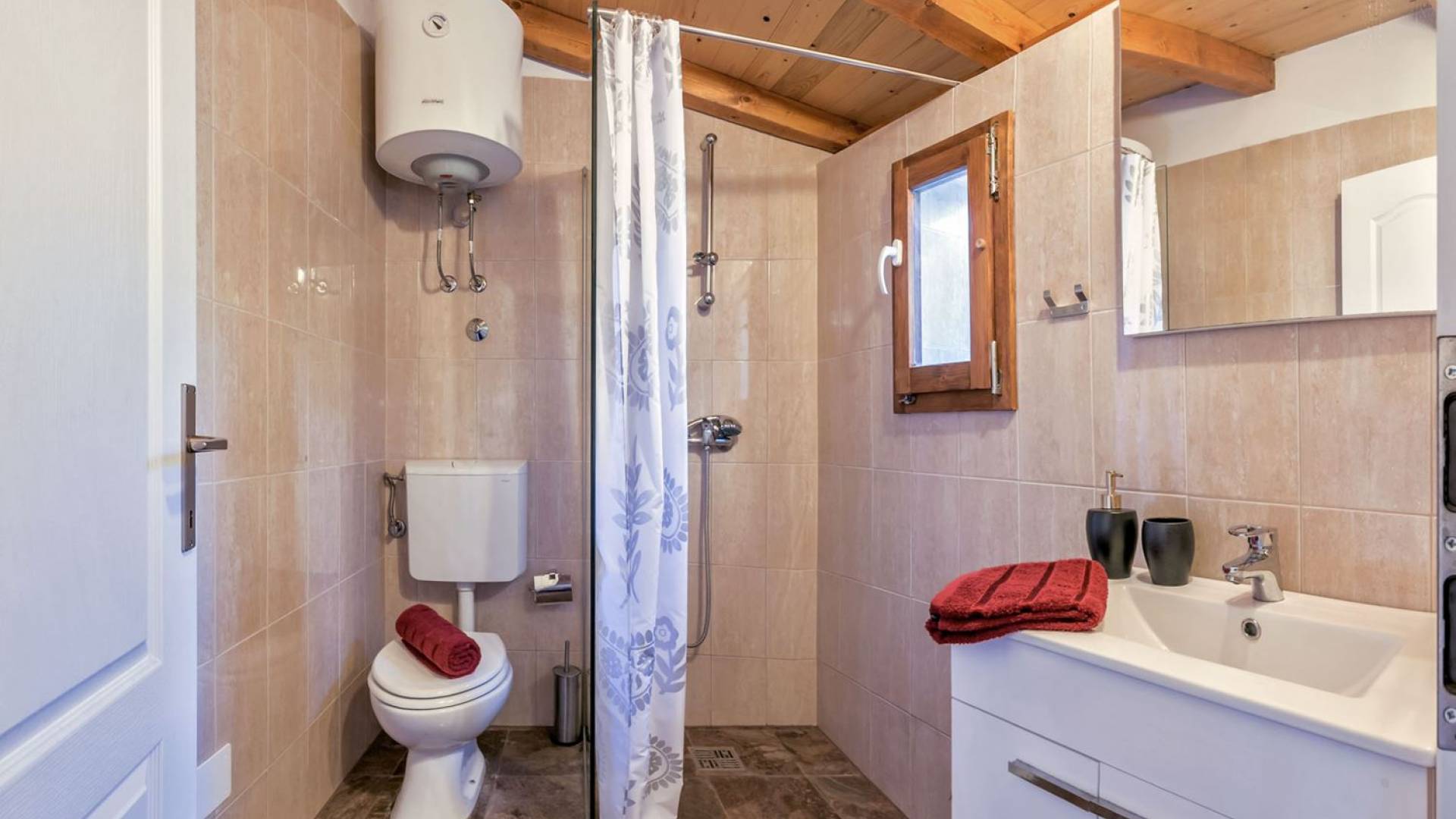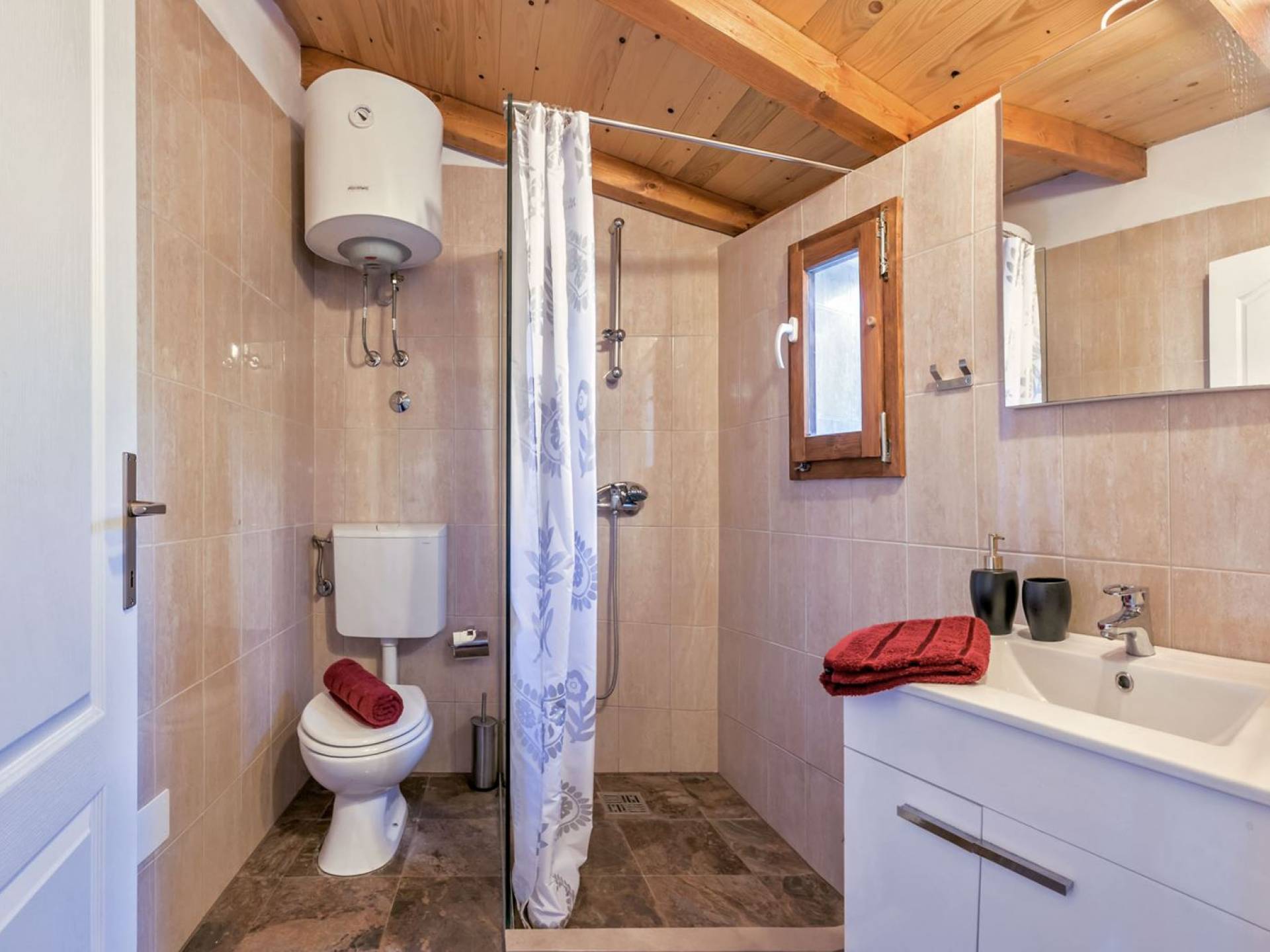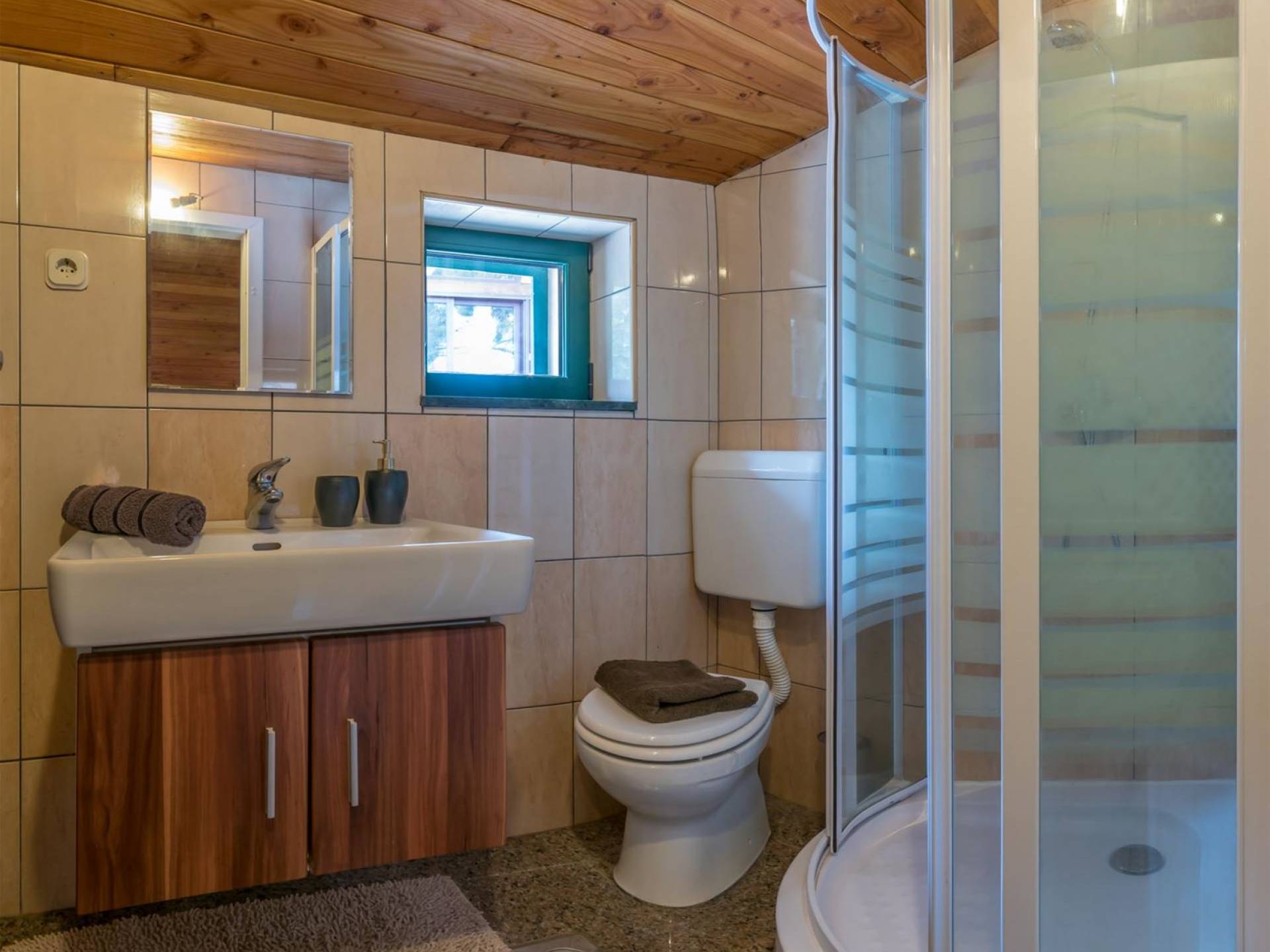 La maison principale est sur trois étages. Au rez-de-chaussée se trouvent une cuisine entièrement équipée, un coin repas, un salon particulièrement agréable, une salle de bains, une chambre double et un lit double supplémentaire. Le premier étage est réservé au directeur de la villa qui est sur place et s'occupe des besoins des clients (ce niveau a une entrée privée et la suite du directeur de la villa est totalement privée). Le deuxième étage est accessible par un escalier extérieur menant à une autre suite équipée d'un lit double, SAT-TV et salle de bain, kitchenette. La loggia attenante surplombant la baie est un bel endroit pour s'asseoir et se détendre. Dans tous les studios, il y a des lits doubles, des salles de bains, une kitchenette, des espaces de vie, une chambre avec un lit double et une salle de bains.