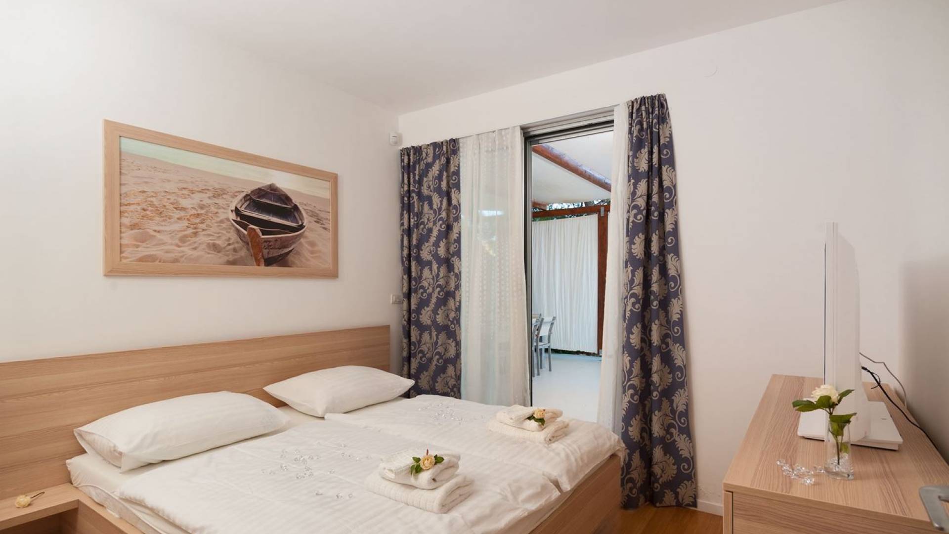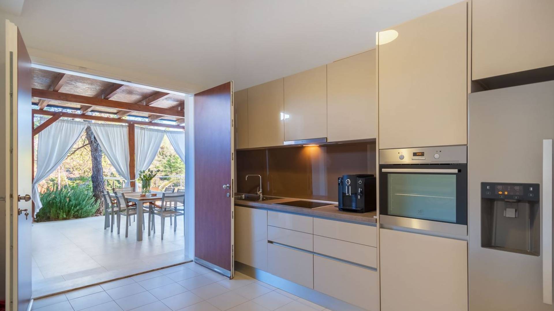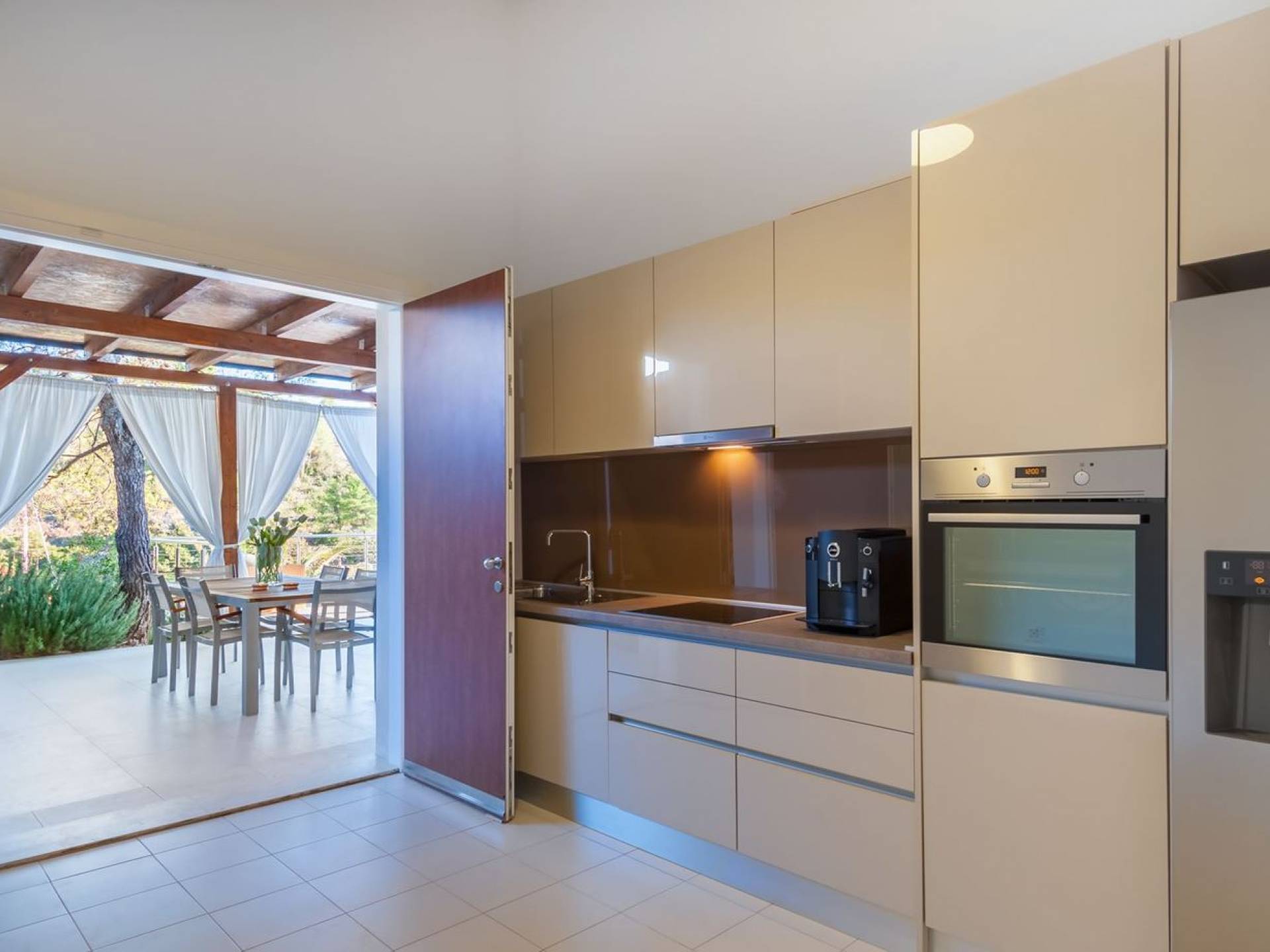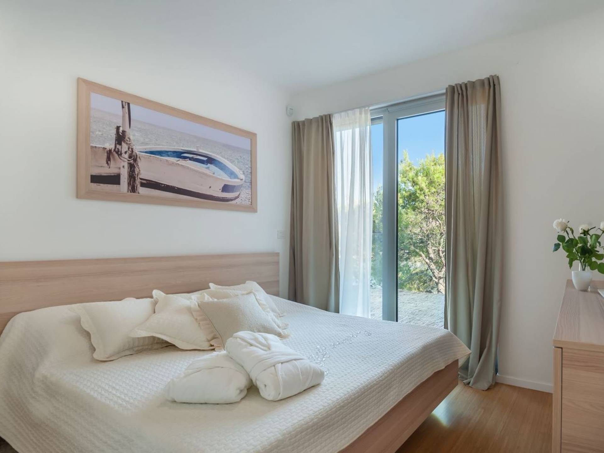 Le rez-de-chaussée comprend deux chambres doubles avec salles de bains privatives, chacune ouvrant sur la cour de la villa. A proximité se trouve une cuisine d'été, idéale pour les repas en plein air. La villa dispose d'un jardin en terrasses, en partie pavé de pierre blanche locale, et le fond du jardin est recouvert d'une pelouse avec un portail qui s'ouvre directement sur une plage privée de rochers plats. Sur la terrasse, il y a un espace couvert avec une table et des chaises d'extérieur. La villa dispose d'un garage privé pour deux voitures. En tout, c'est une villa unique.