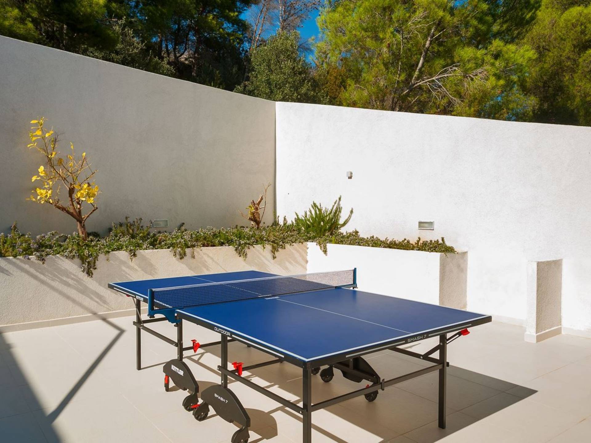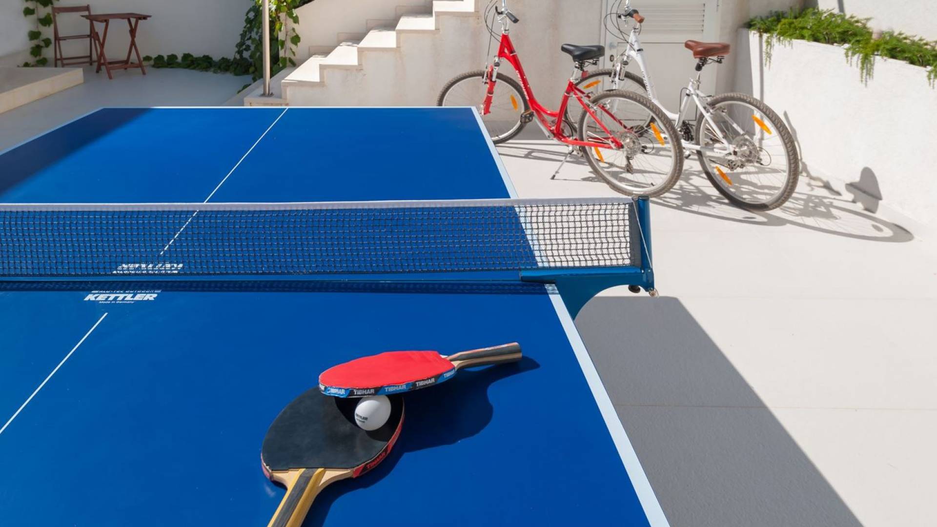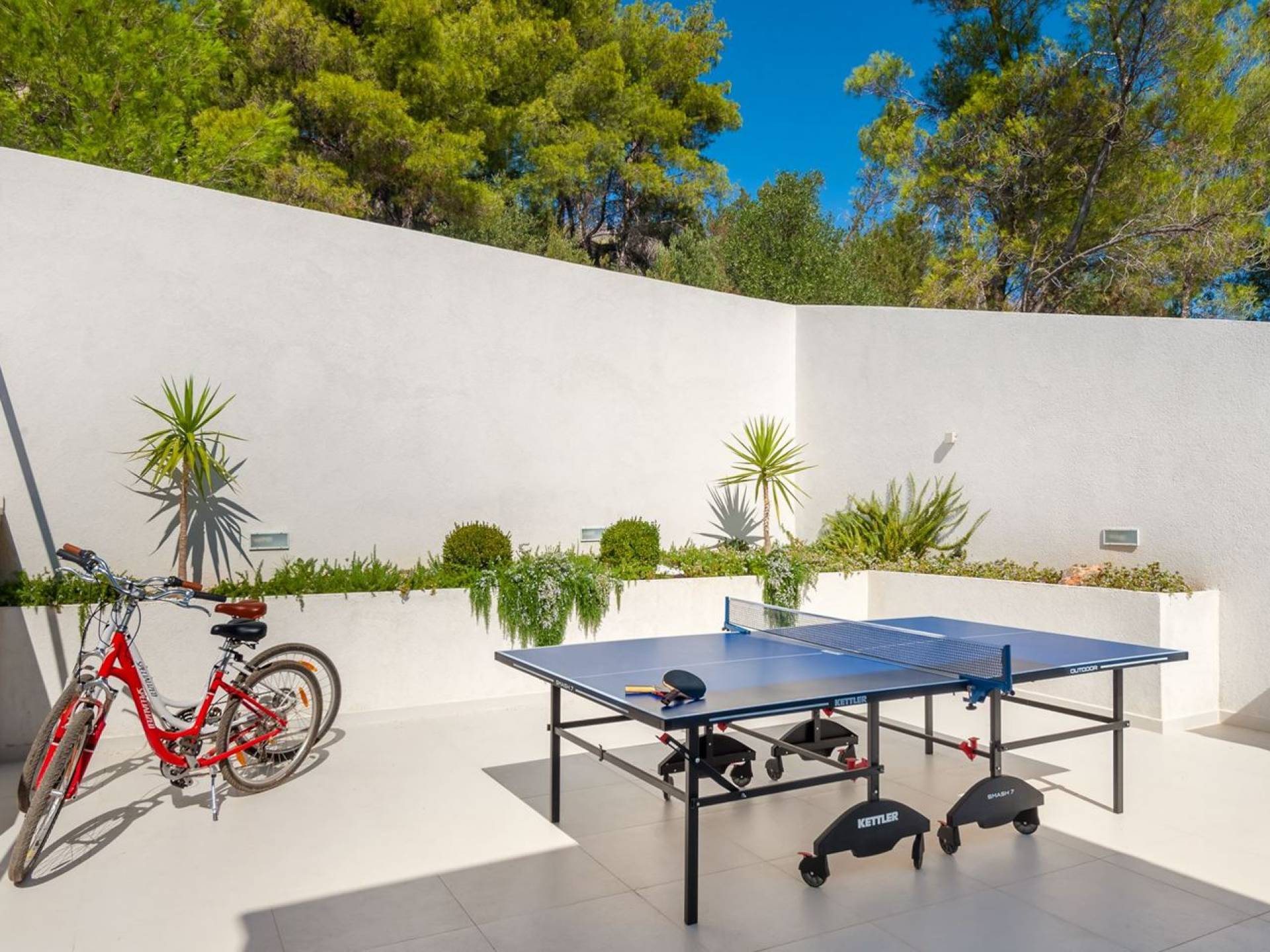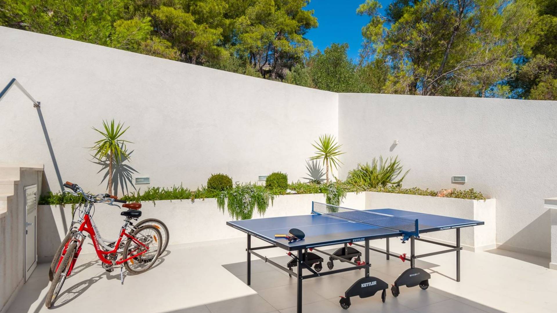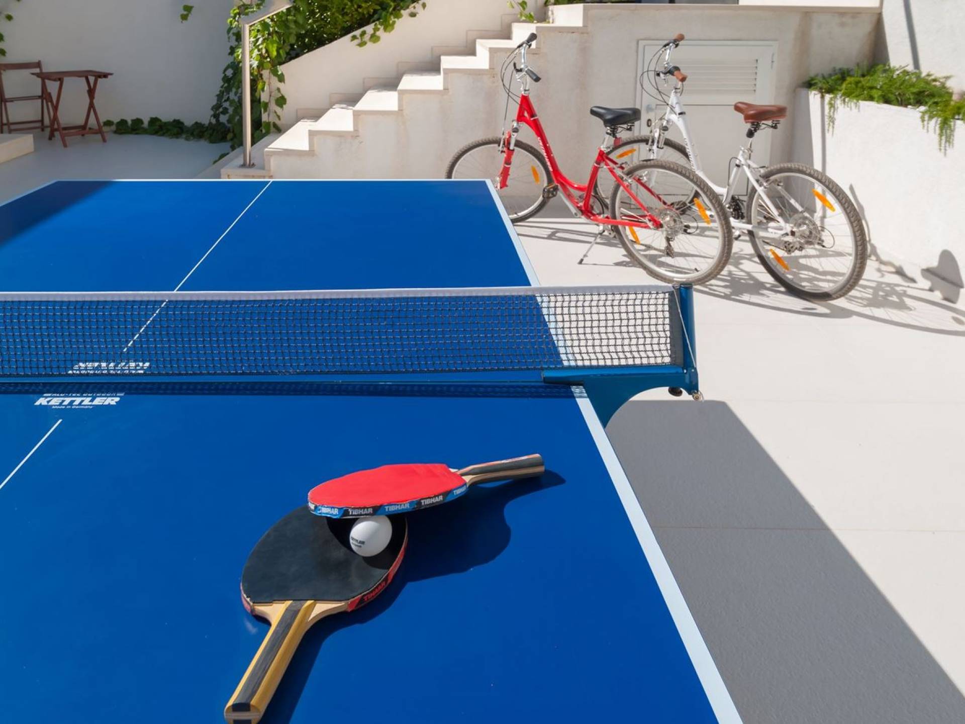 De l'arrière de la villa, l'entrée principale est au rez-de-chaussée mais de l'avant, elle se trouve au deuxième étage. Devant l'entrée principale, au cas où vous voudriez rester plus actif, vous trouverez des tables de ping-pong et des fléchettes, ainsi que des vélos qui peuvent être très utiles et pratiques si vous souhaitez explorer un peu plus l'île. En entrant dans la villa, vous entrez dans le salon principal qui offre une vue imprenable sur la baie scintillante. Là, vous vous retrouverez à l'intérieur d'un espace spacieux divisé en plusieurs parties ; cuisine entièrement équipée, salle à manger et salon avec canapés modernes et confortables, œuvres d'art élégantes, télévision par satellite et DVD, tandis que de grandes portes coulissantes en verre le relient à la piscine extérieure chauffée avec plusieurs chaises longues, ce qui maximise le plaisir de la vue imprenable sur toute la baie et le village de pêcheurs.