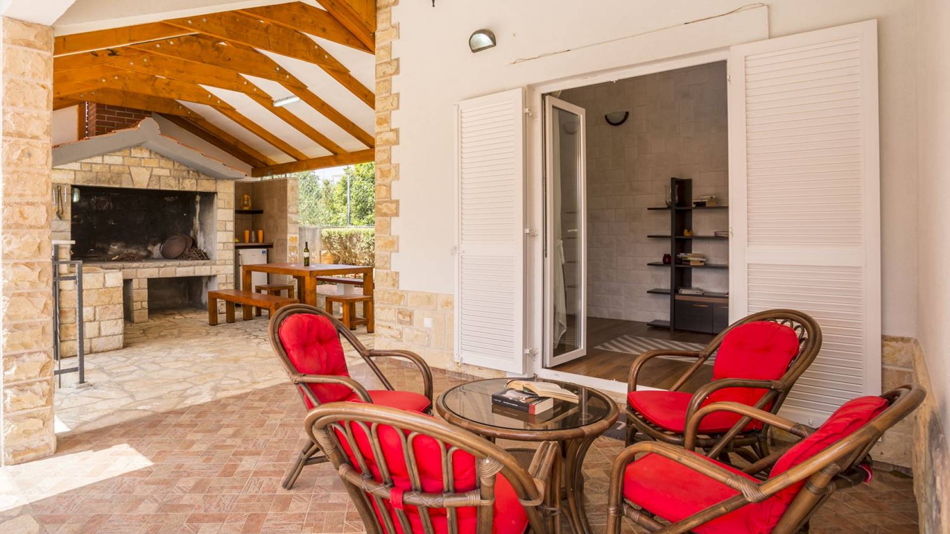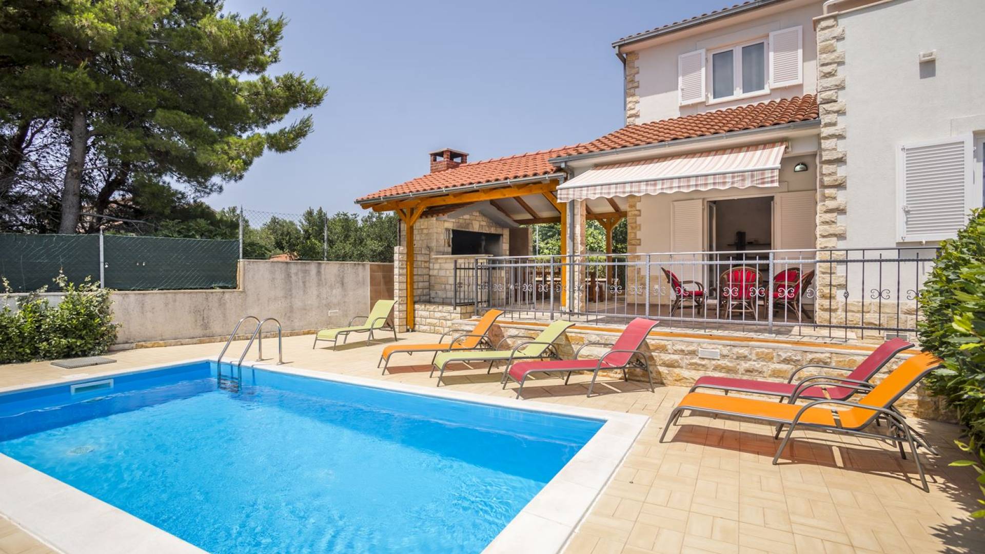 Toutes les chambres sont doubles et situées au premier étage climatisé. Des salles de bains communes avec cabines de douche sont situées au rez-de-chaussée et au premier étage. Le salon avec télévision par câble et Wi-Fi est situé au rez-de-chaussée. Petits et grands seront comblés par l'espace près de la piscine, où ils pourront jouer au ping-pong et aux fléchettes électriques, tout en écoutant la musique de la chaîne Hi-Fi. Les hôtes peuvent également profiter du jardin, de la grande terrasse et de la piscine ouverte (eau courante, non chauffée). Pour manger à l'ombre de la terrasse, vous pouvez utiliser le barbecue clôturé et la mini cuisine extérieure avec réfrigérateur.