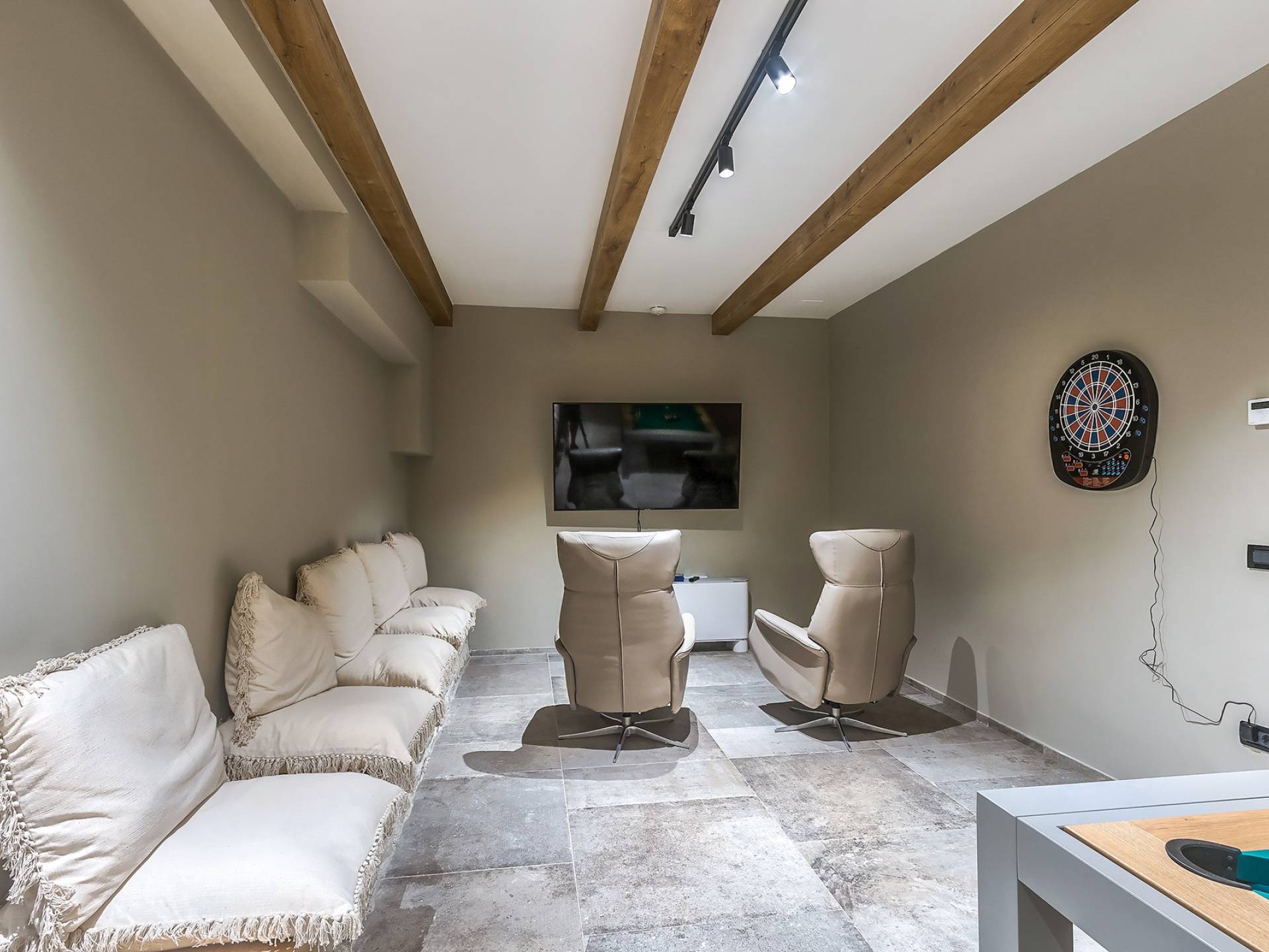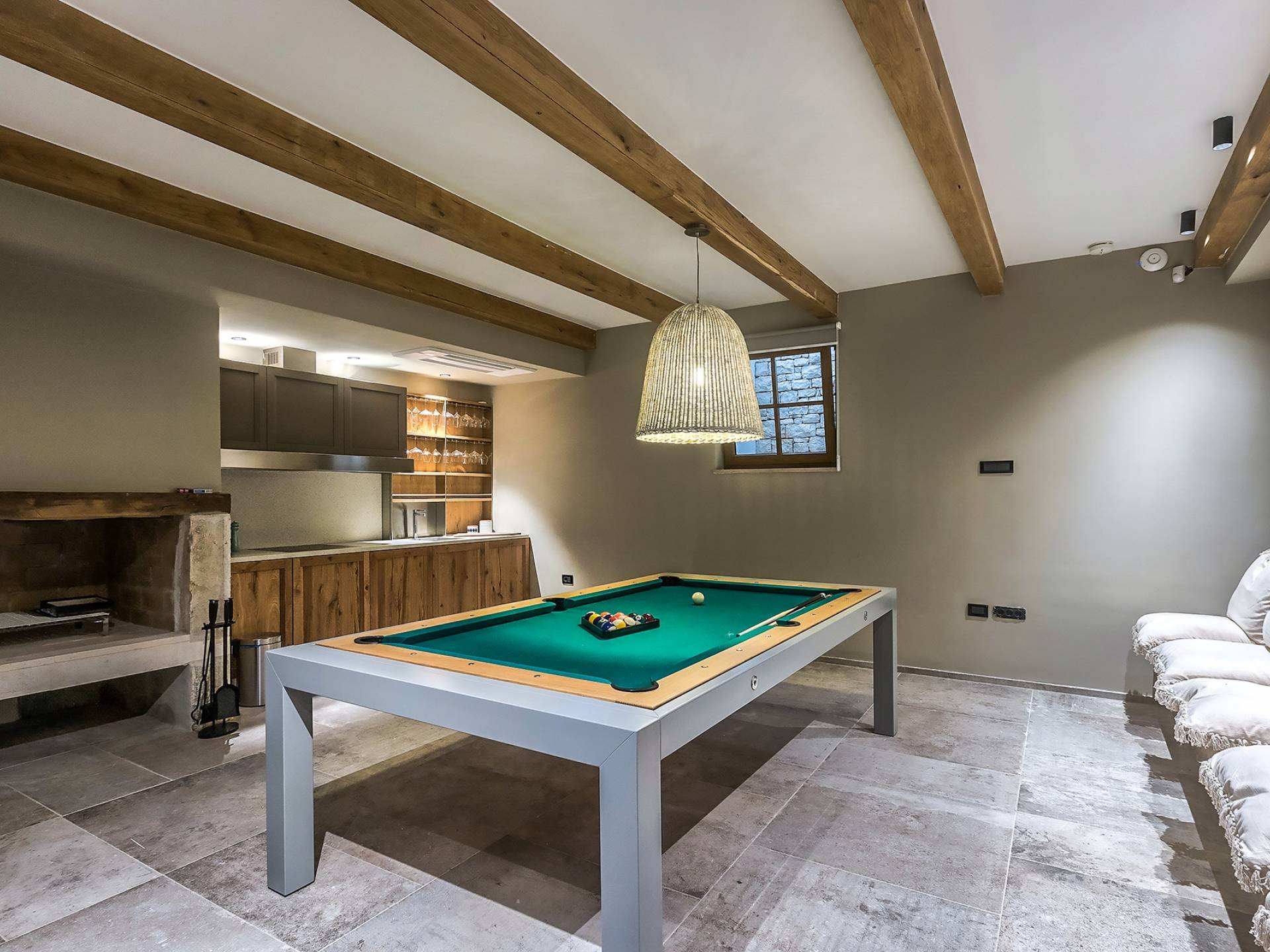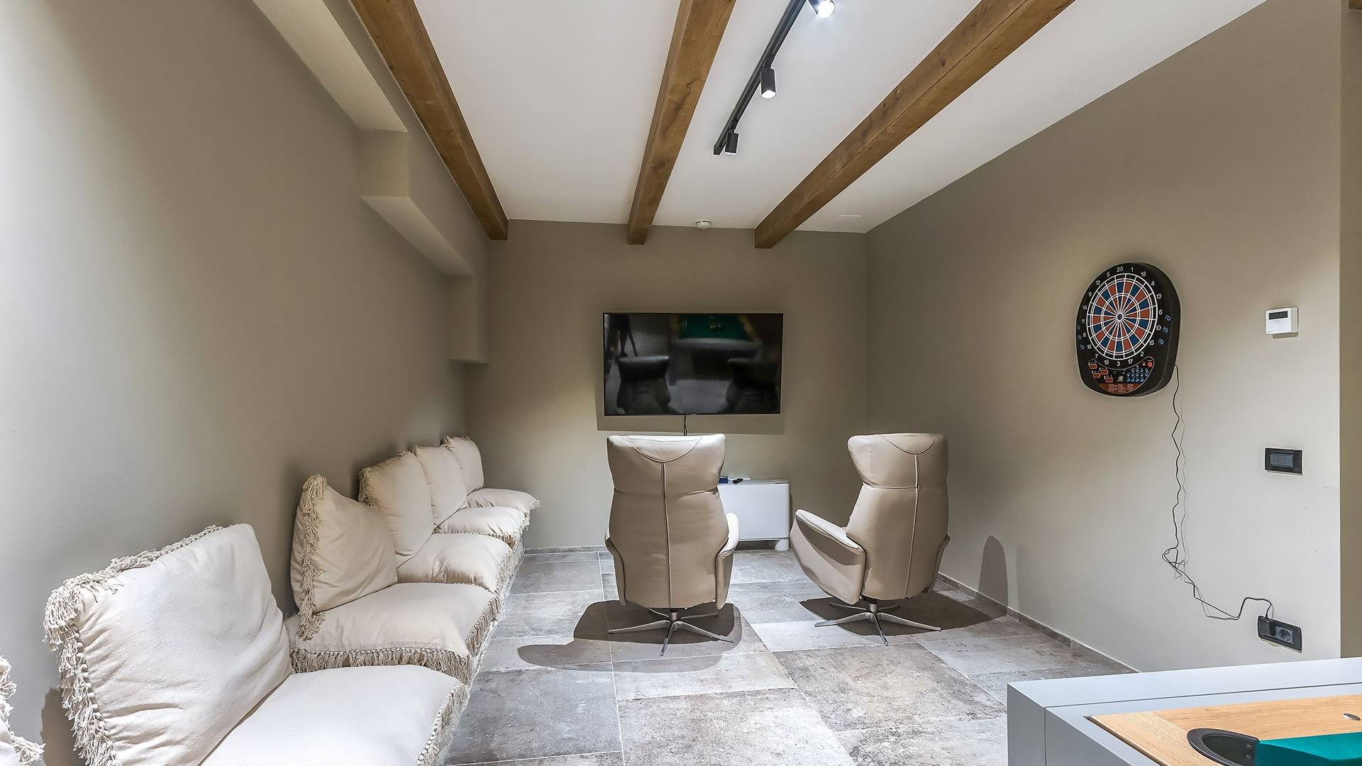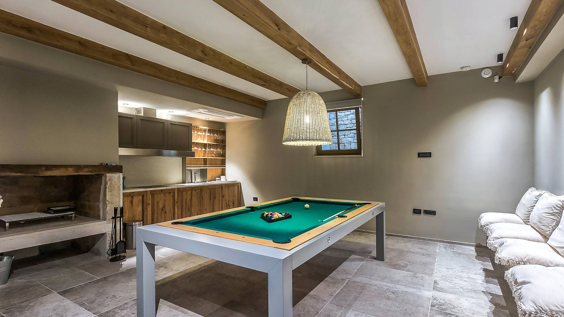 Sur le côté du salon, une véranda d'hiver crée le lien parfait avec l'étage inférieur entièrement dédié à la détente et à l'expérience spa. Au sous-sol, vous trouverez une salle de massage, des équipements d'exercice, un jacuzzi et deux saunas - turc et finlandais. Dans la deuxième partie, il y a une étagère à vin, une table à manger et une cheminée pour que vous puissiez profiter de la nourriture et socialiser sans traverser la maison mouillée. De petits détails tels qu'une console de jeux, une grande télévision, un porte-bouteilles et une table de poker et de billard peuvent transformer cette pièce en paradis pour les enfants, mais aussi pour les hommes, tandis que les dames de la pièce voisine profitent d'un massage ou d'un sauna.