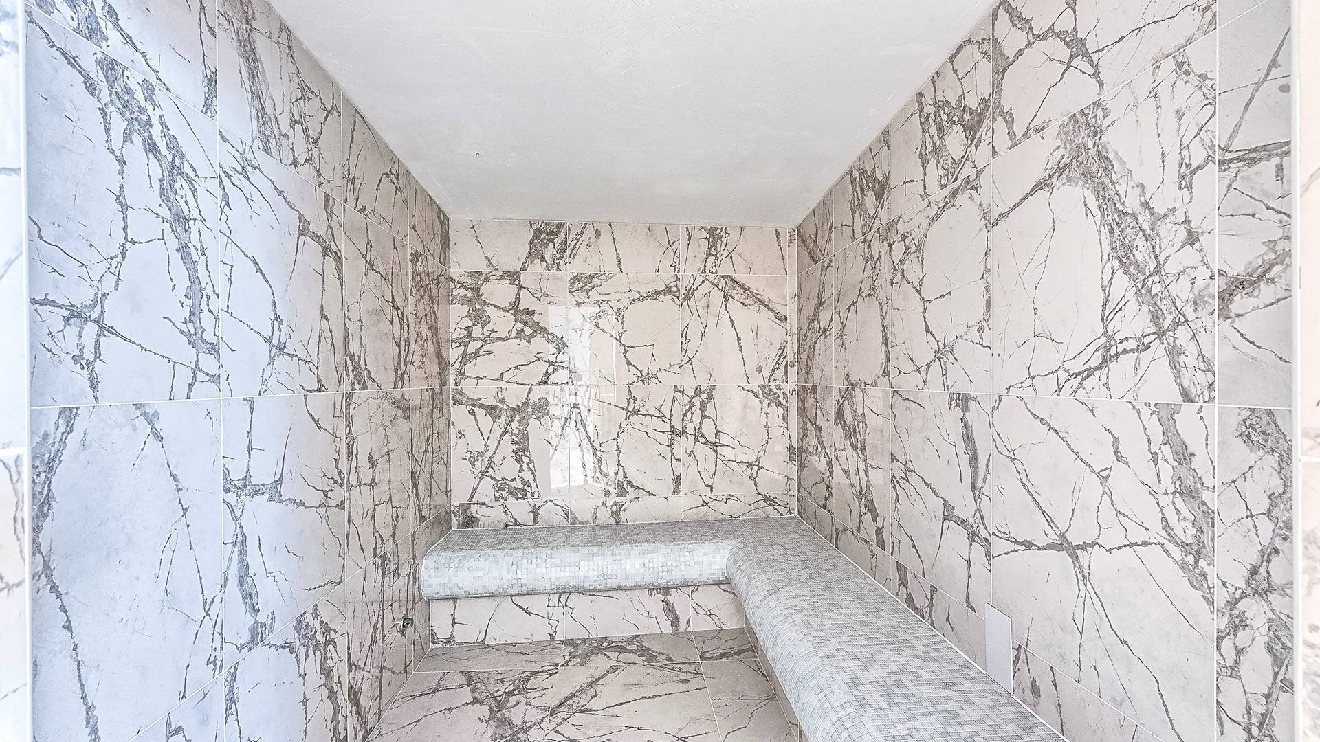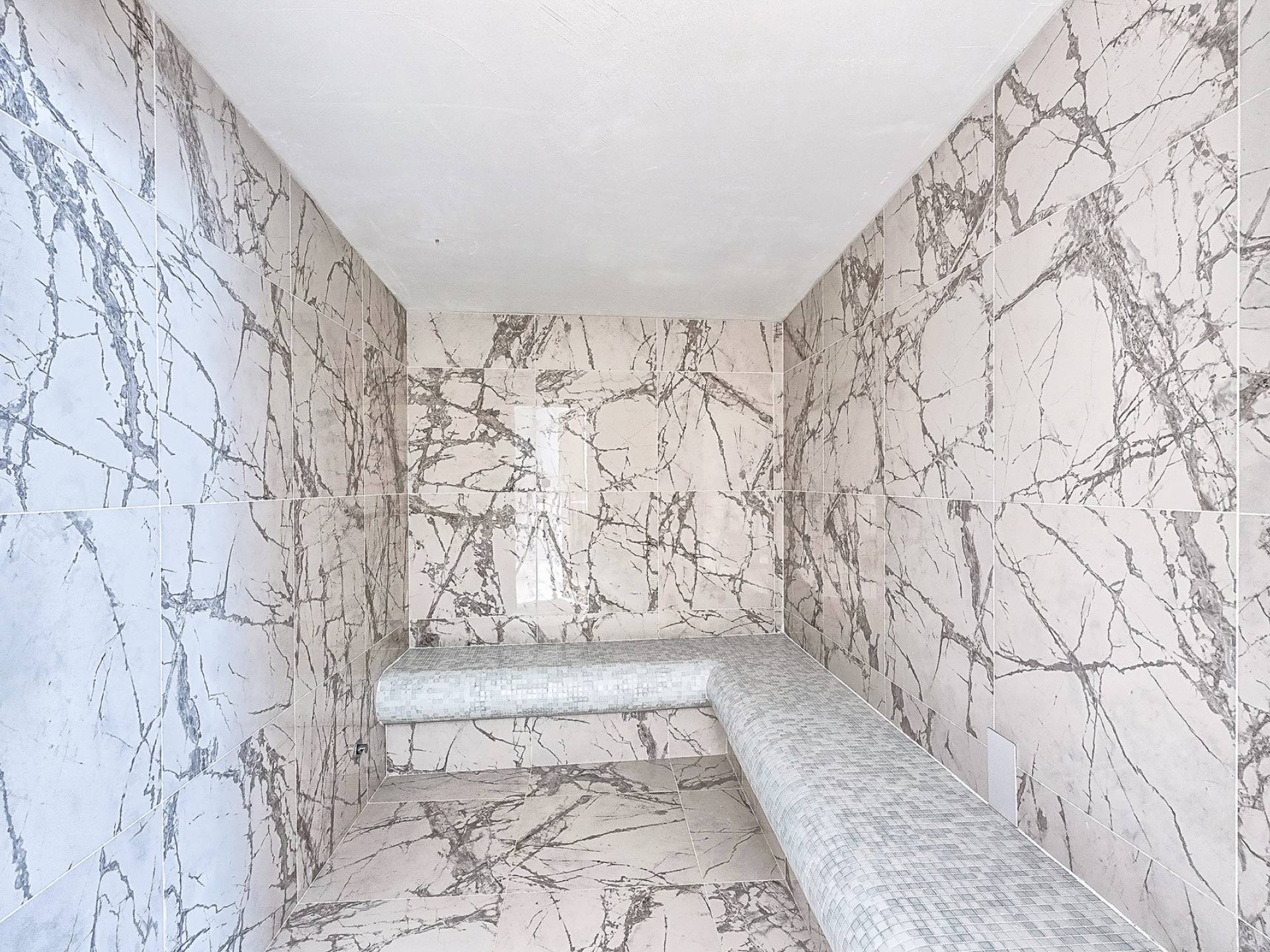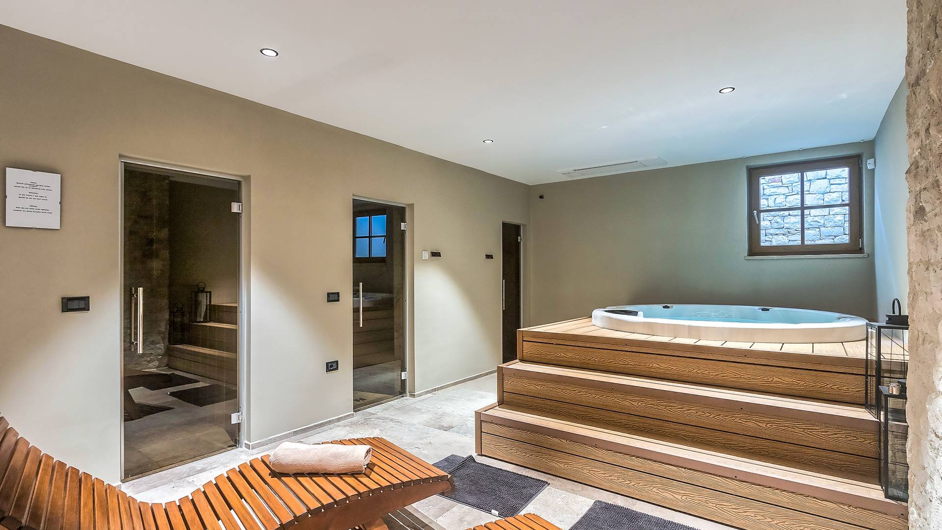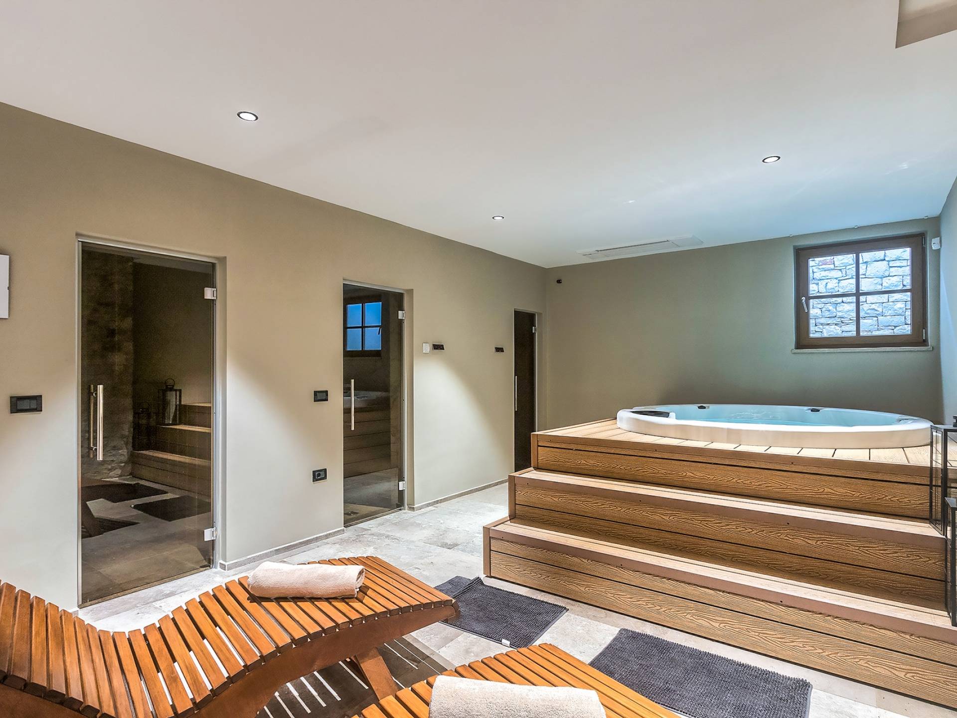 Sur le côté du salon, une véranda d'hiver crée le lien parfait avec l'étage inférieur entièrement dédié à la détente et à l'expérience spa. Au sous-sol, vous trouverez une salle de massage, des équipements d'exercice, un jacuzzi et deux saunas - turc et finlandais. Dans la deuxième partie, il y a une étagère à vin, une table à manger et une cheminée pour que vous puissiez profiter de la nourriture et socialiser sans traverser la maison mouillée. De petits détails tels qu'une console de jeux, une grande télévision, un porte-bouteilles et une table de poker et de billard peuvent transformer cette pièce en paradis pour les enfants, mais aussi pour les hommes, tandis que les dames de la pièce voisine profitent d'un massage ou d'un sauna.