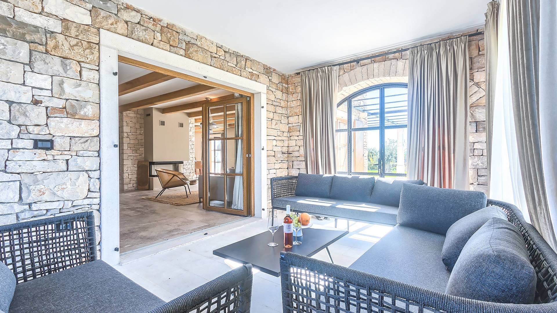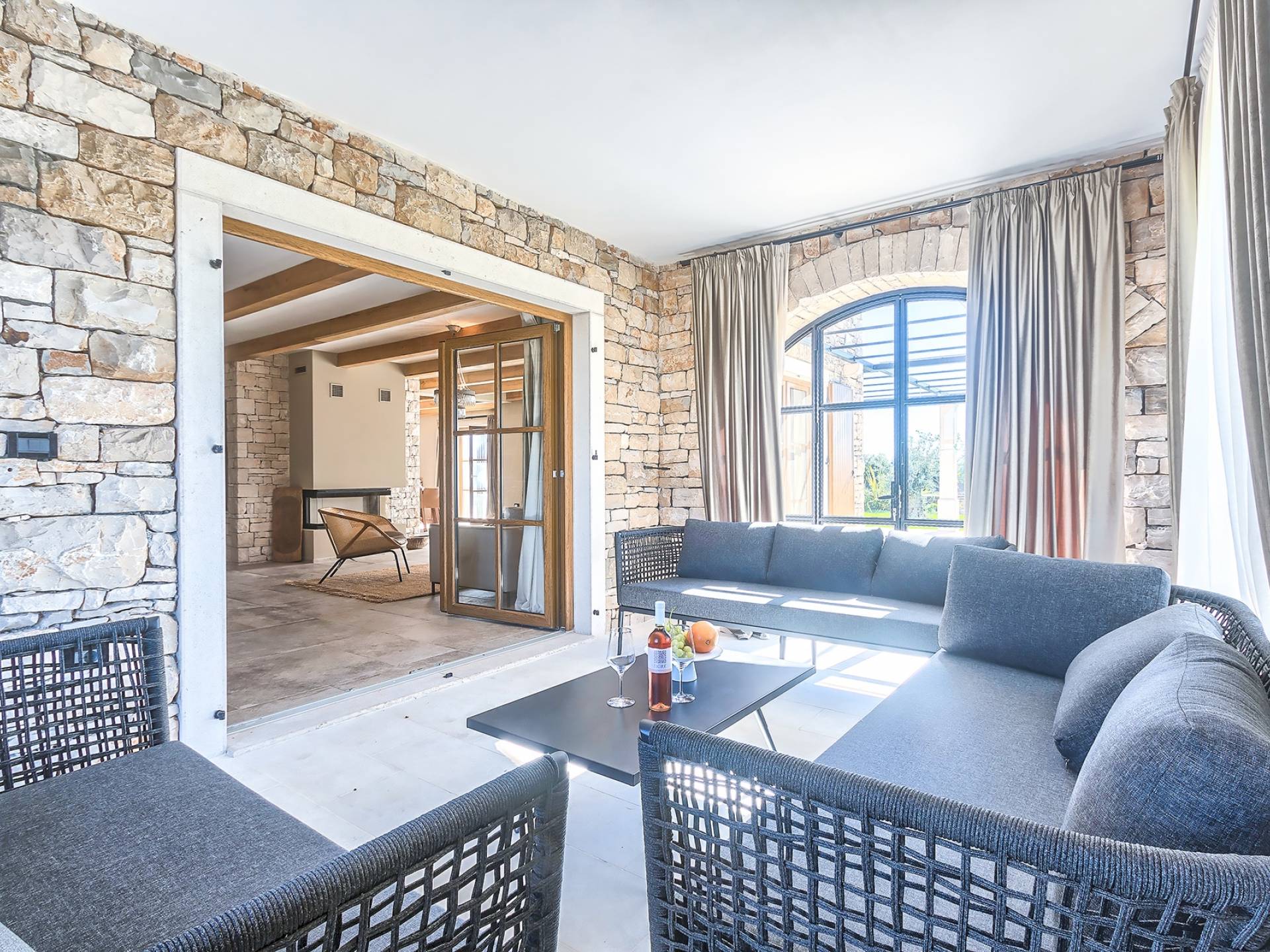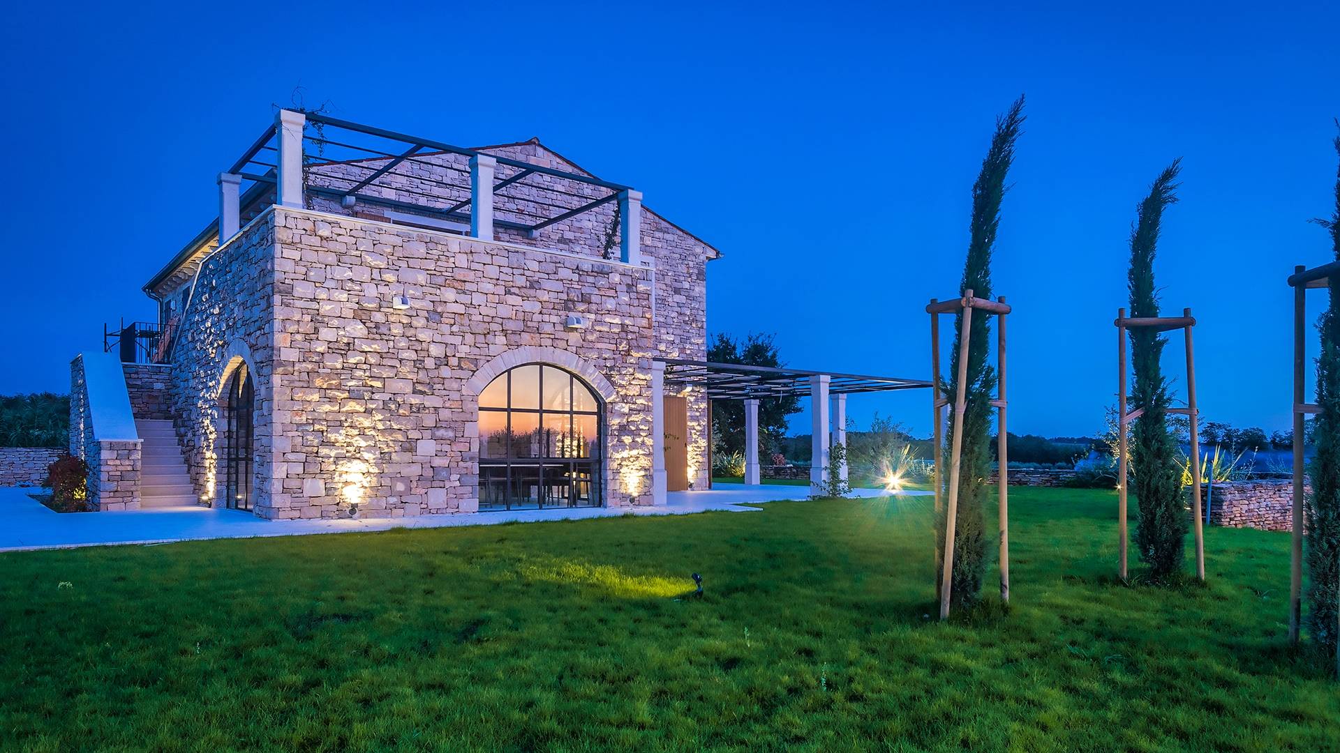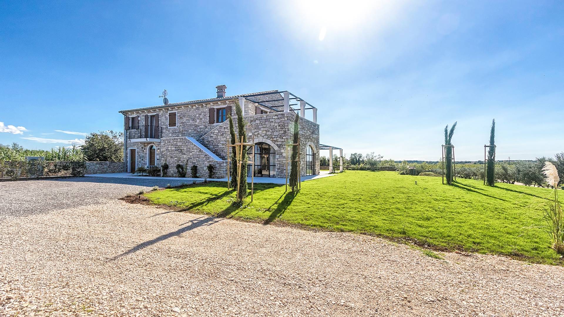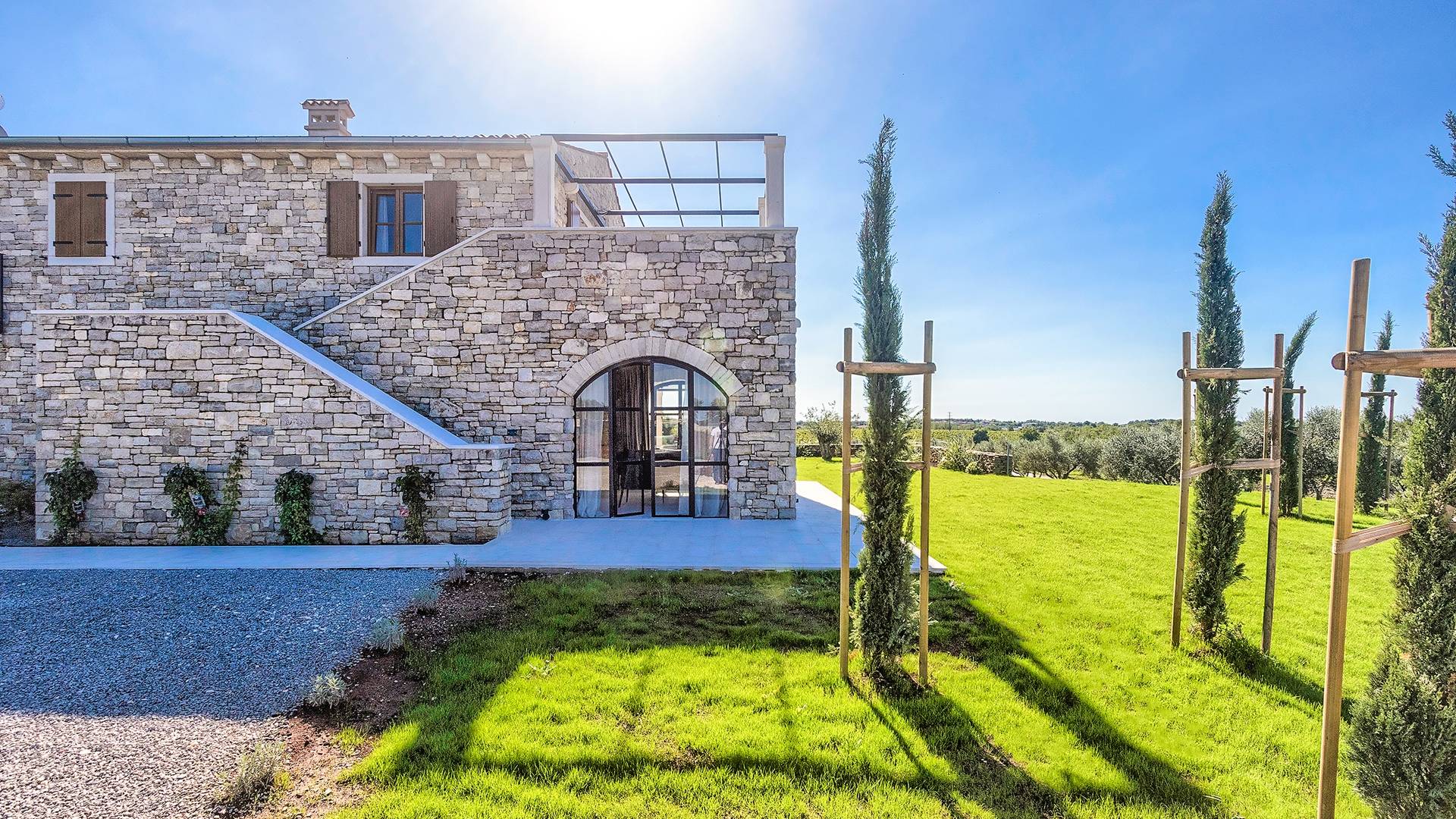 Et alors que vous passez lentement devant la villa et que vous vous garez sur le parking pour 4 voitures, une petite oliveraie s'étend derrière vous. Stratégiquement positionnée tout en haut d'une petite colline, face à l'ouest, Stancia Finida est toujours baignée de soleil car elle surplombe tranquillement ses vignes et ses jardins. Parfois, votre regard s'échappe loin au large, surtout si vous vous retrouvez sur la terrasse au coucher du soleil. L'architecture moderne se mêle aux matériaux traditionnellement utilisés dans ce climat et se marie parfaitement avec la nature environnante.