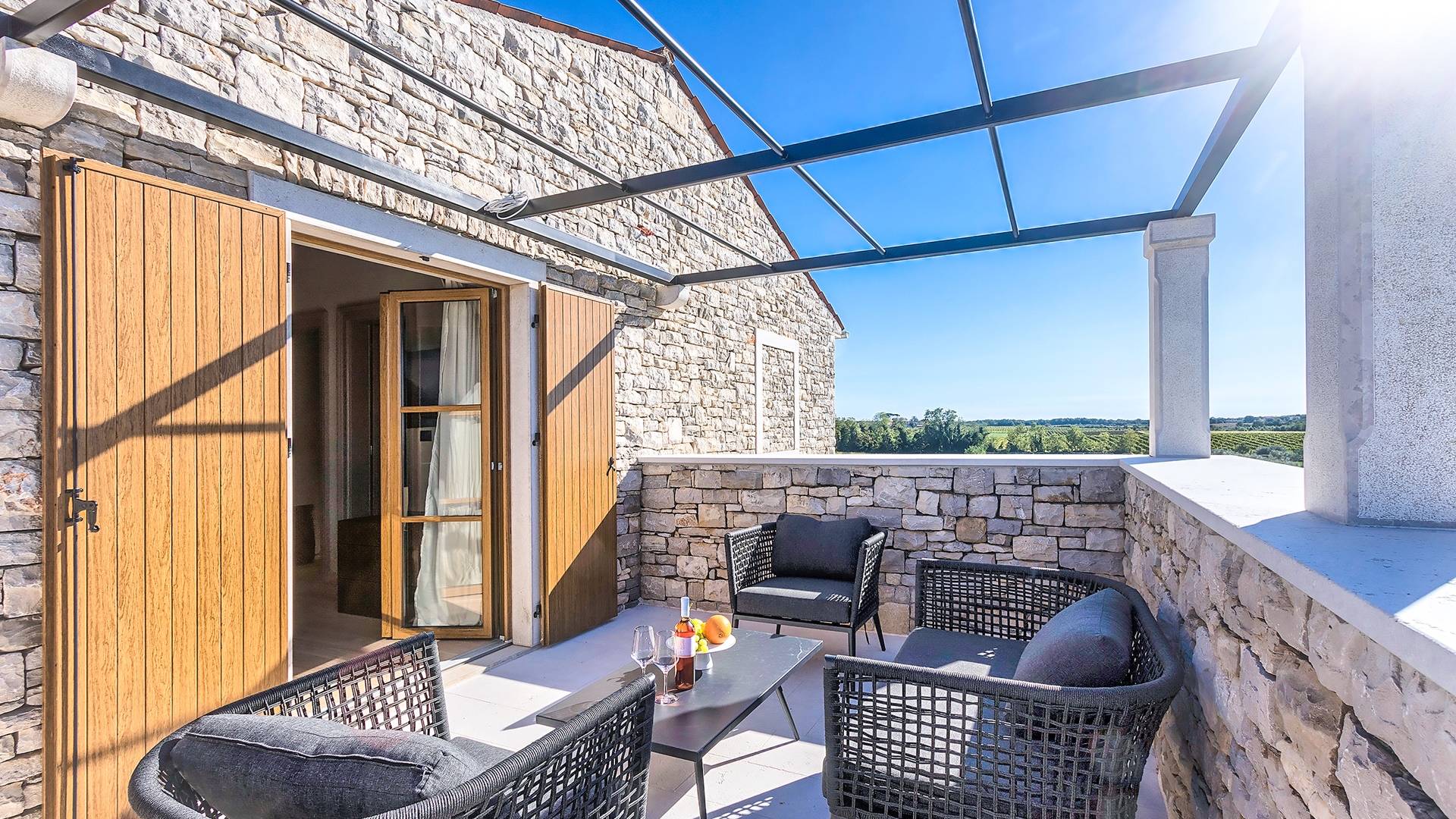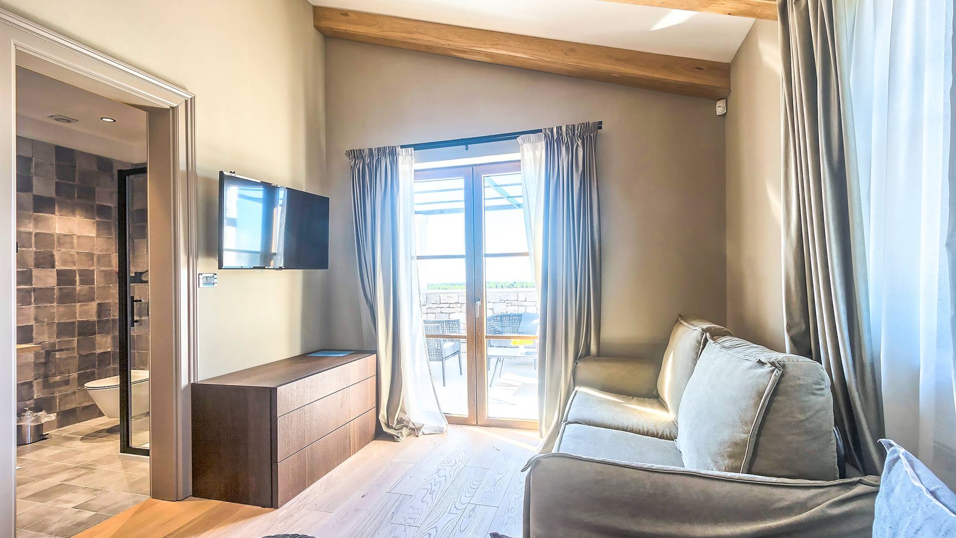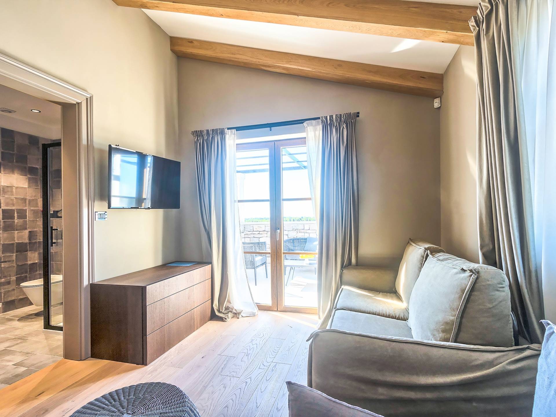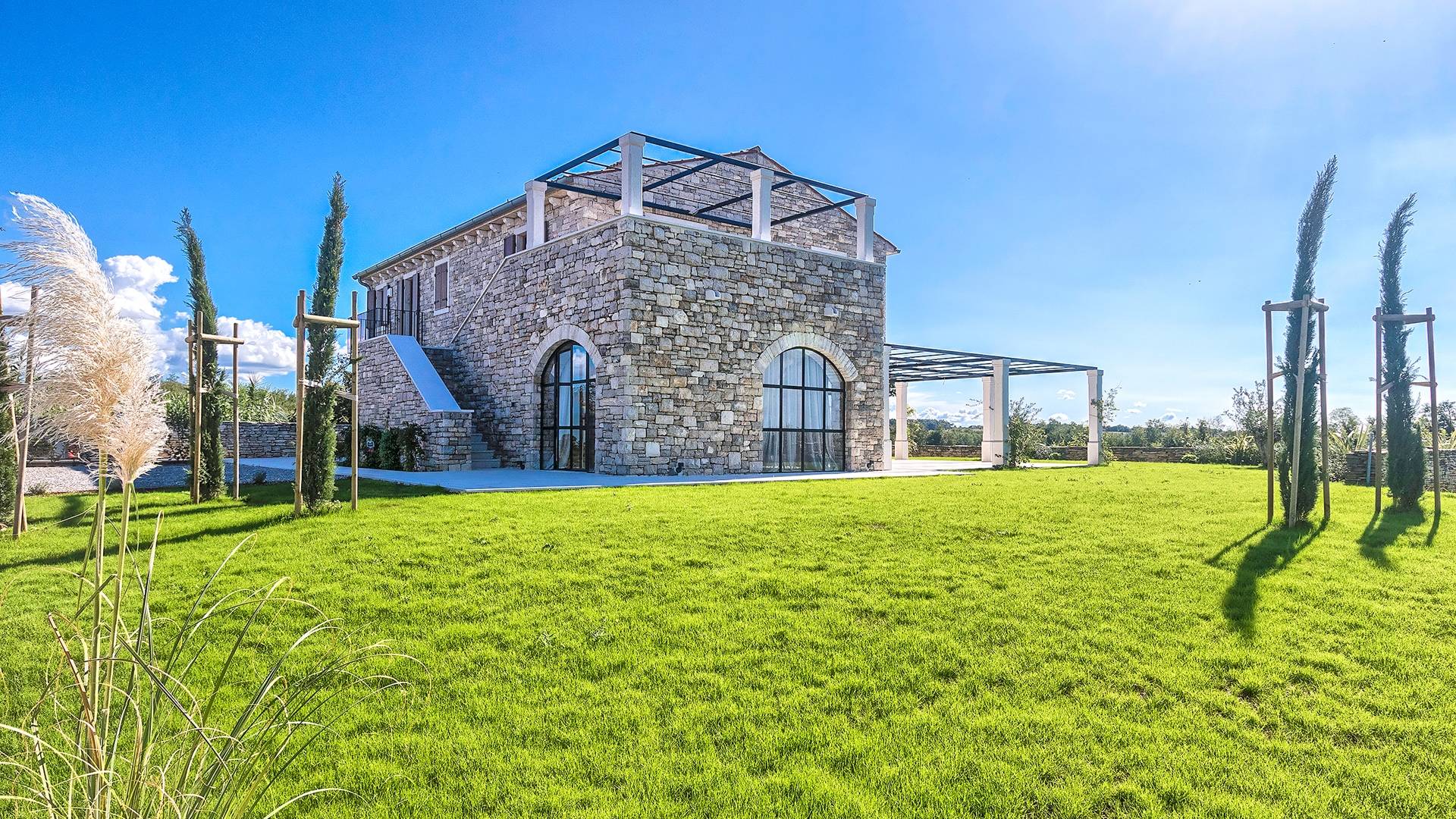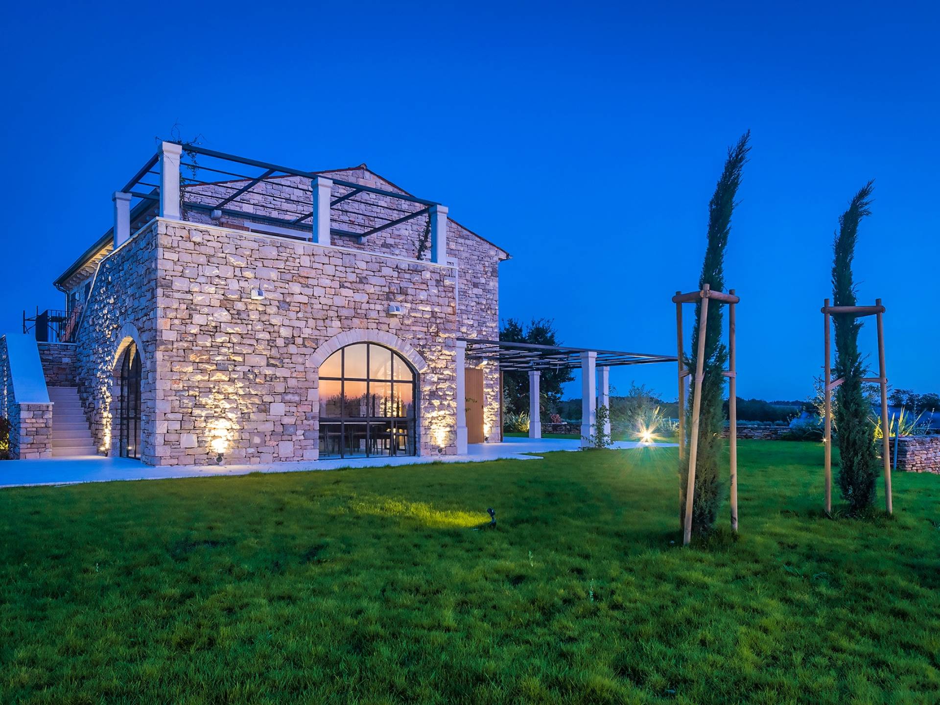 Et alors que vous passez lentement devant la villa et que vous vous garez sur le parking pour 4 voitures, une petite oliveraie s'étend derrière vous. Stratégiquement positionnée tout en haut d'une petite colline, face à l'ouest, Stancia Finida est toujours baignée de soleil car elle surplombe tranquillement ses vignes et ses jardins. Parfois, votre regard s'échappe loin au large, surtout si vous vous retrouvez sur la terrasse au coucher du soleil. L'architecture moderne se mêle aux matériaux traditionnellement utilisés dans ce climat et se marie parfaitement avec la nature environnante.