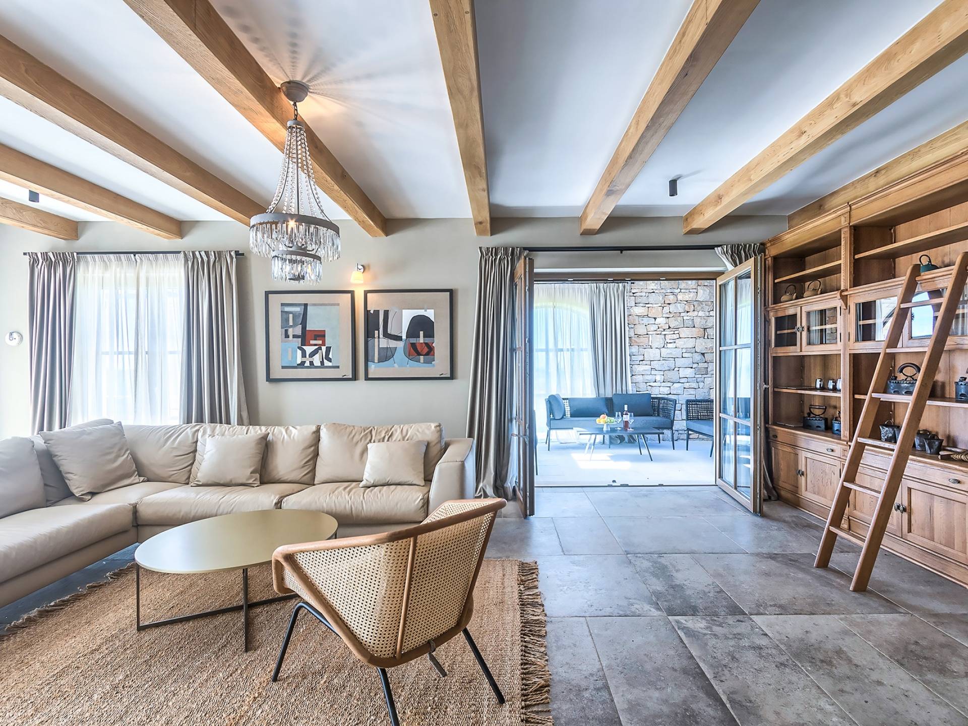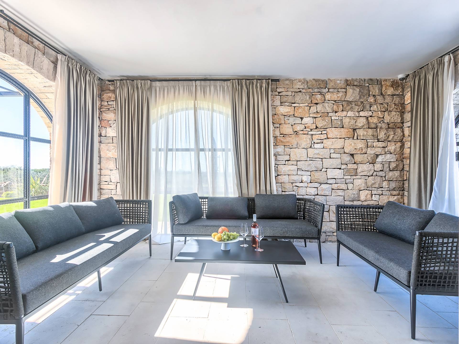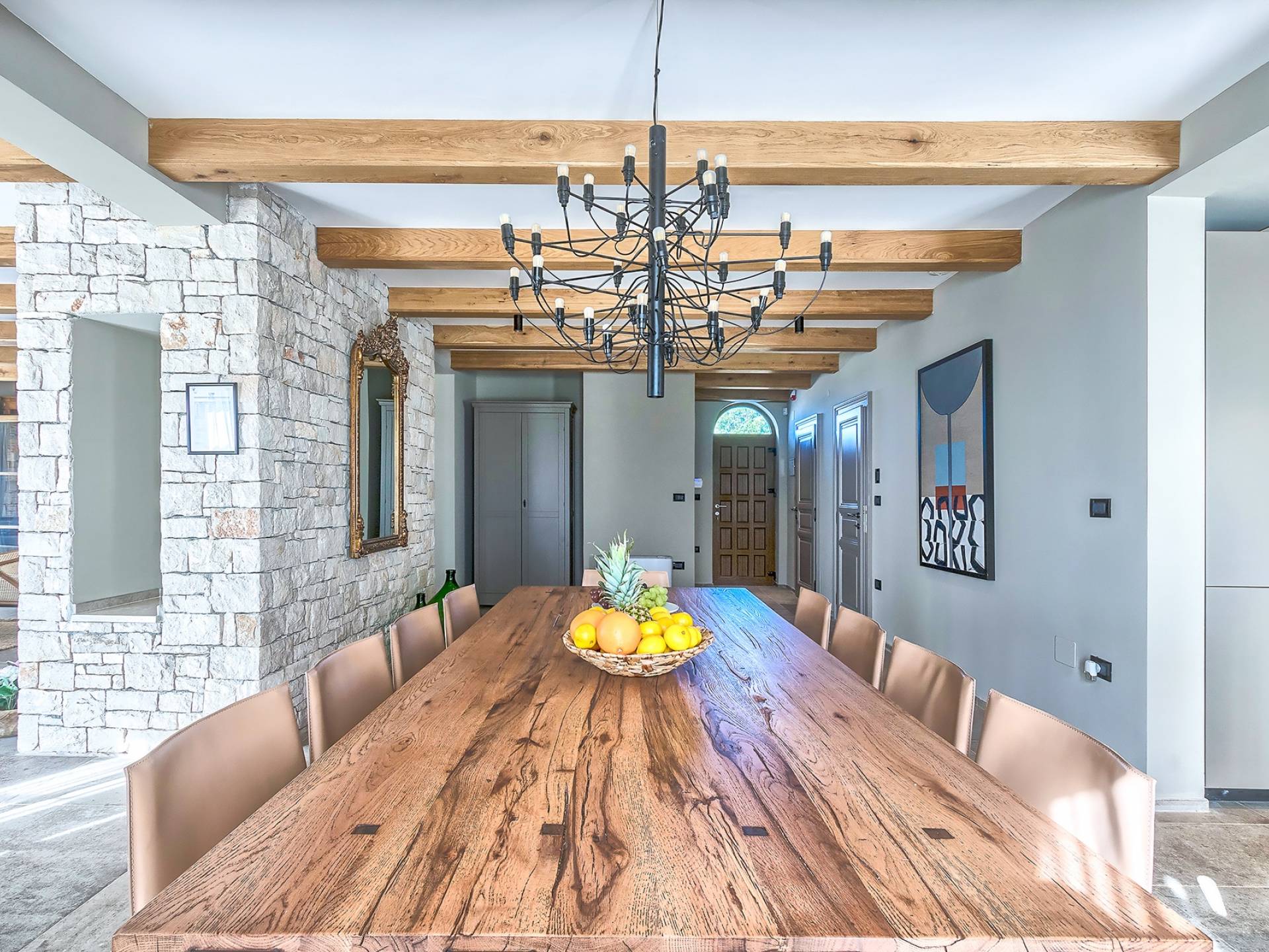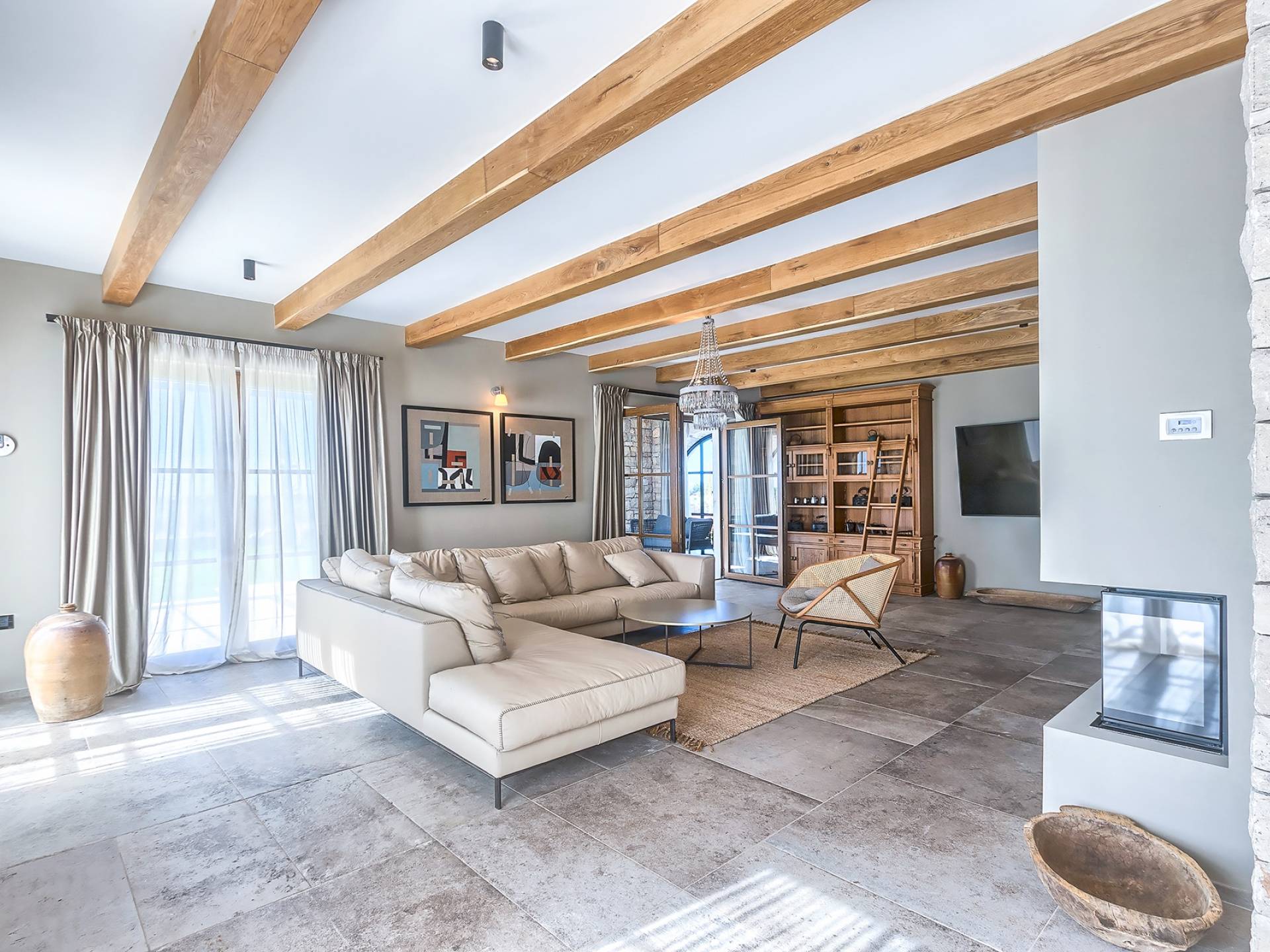 Face au salon se trouve une longue cheminée pour une ambiance particulière lors des soirées fraîches. La cuisine est bien sûr entièrement équipée et stratégiquement située pour vous permettre de cuisiner sans souci tout en surveillant les petits sur la terrasse. Presque toute la façade est couverte de portes vitrées par lesquelles vous sortez sur la terrasse qui offre une vue divine sur l'ensemble du domaine, de petits jardins en cascade pleins de fleurs, d'épices et de palmiers, les vignes environnantes et une mer ouverte à l'horizon, en la distance. La vue grandiose est garantie que vous profitiez du soleil sur la terrasse, que vous sirotiez votre verre dans la piscine, que vous prépariez un barbecue dans la cuisine extérieure ou que vous dîniez en famille ou entre amis.