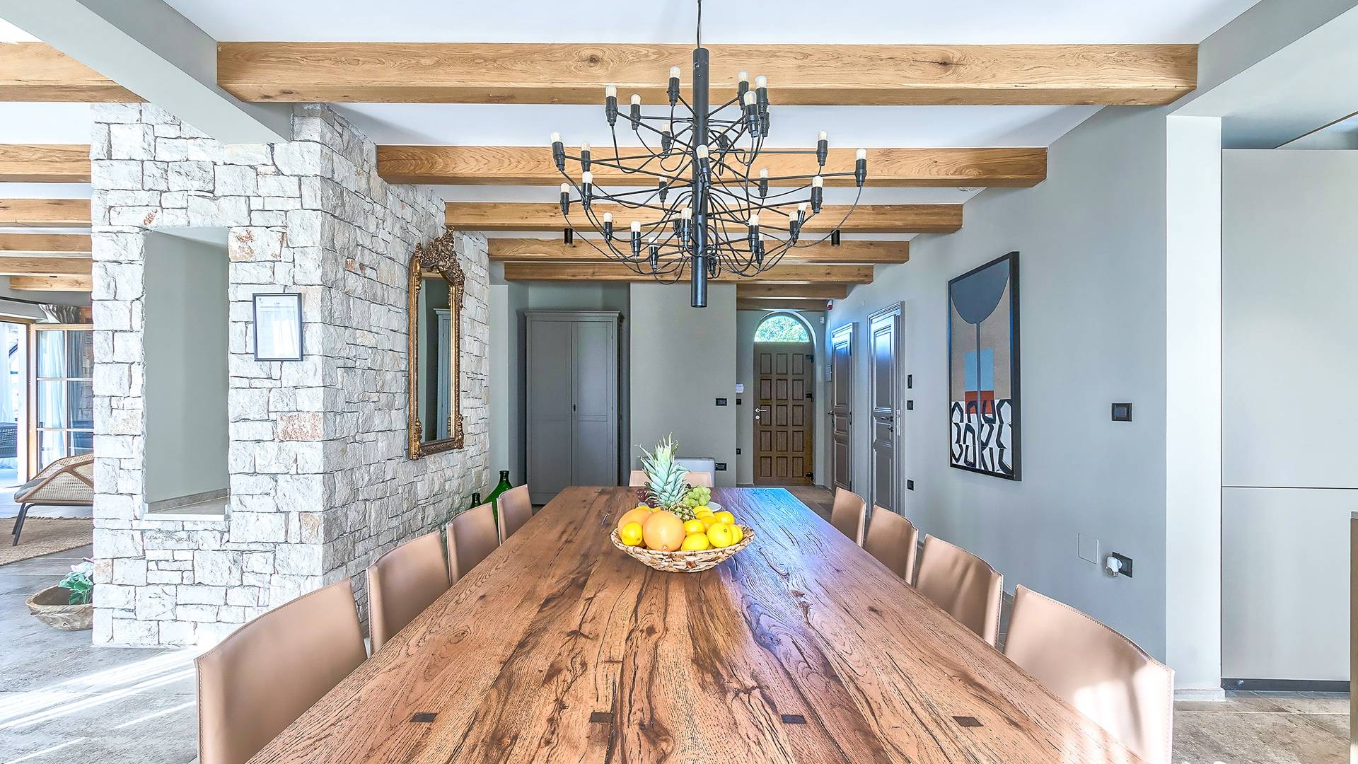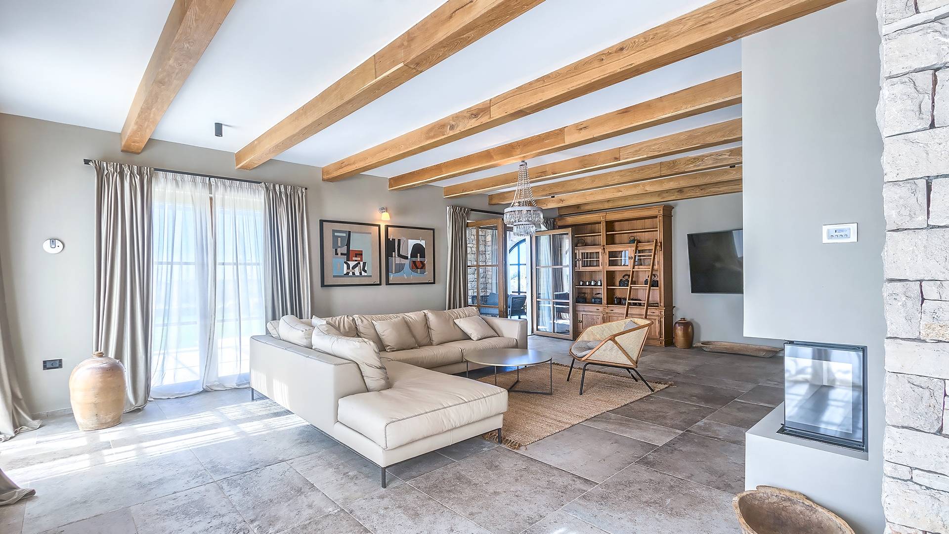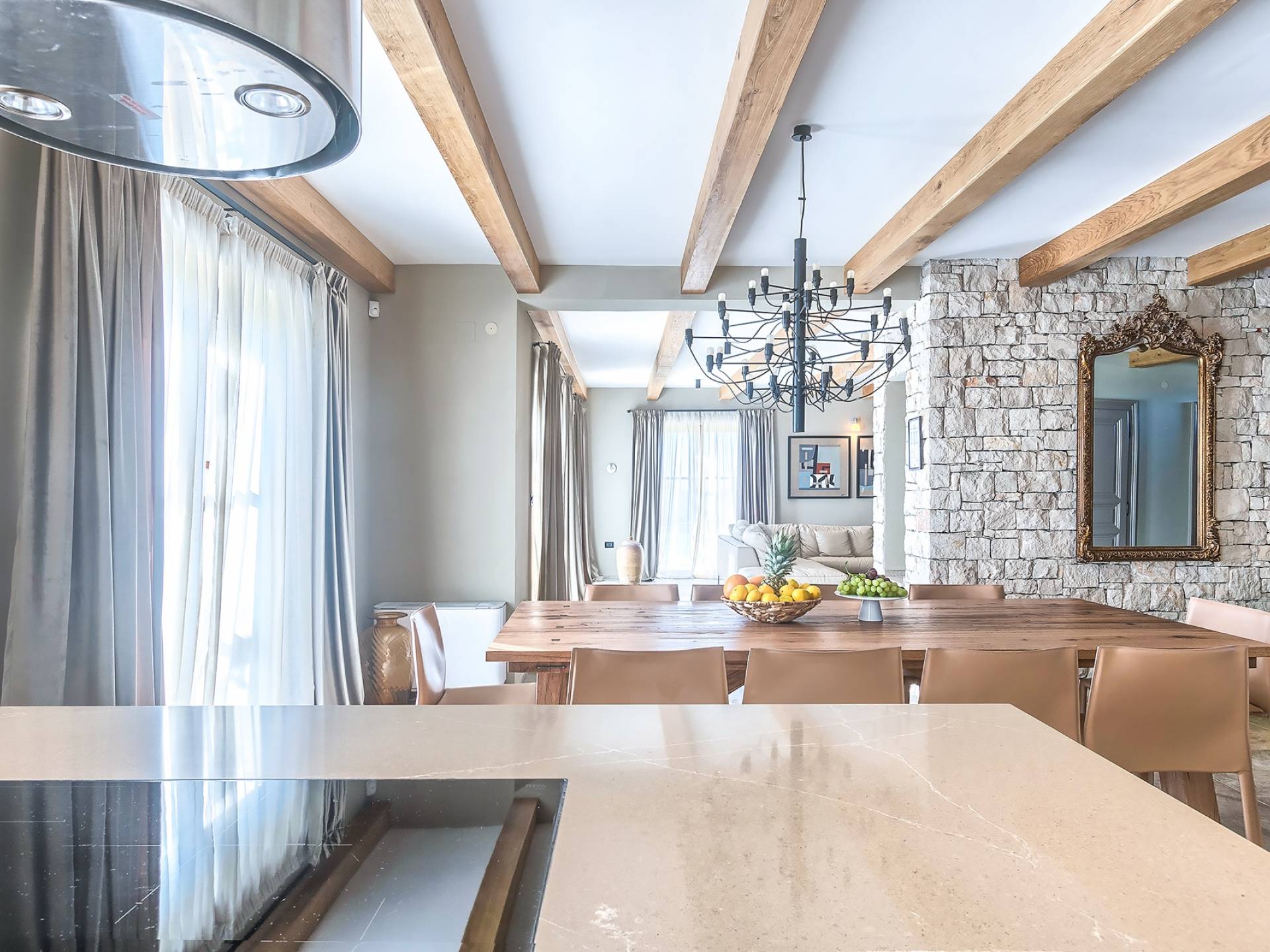 Face au salon se trouve une longue cheminée pour une ambiance particulière lors des soirées fraîches. La cuisine est bien sûr entièrement équipée et stratégiquement située pour vous permettre de cuisiner sans souci tout en surveillant les petits sur la terrasse. Presque toute la façade est couverte de portes vitrées par lesquelles vous sortez sur la terrasse qui offre une vue divine sur l'ensemble du domaine, de petits jardins en cascade pleins de fleurs, d'épices et de palmiers, les vignes environnantes et une mer ouverte à l'horizon, en la distance. La vue grandiose est garantie que vous profitiez du soleil sur la terrasse, que vous sirotiez votre verre dans la piscine, que vous prépariez un barbecue dans la cuisine extérieure ou que vous dîniez en famille ou entre amis.
