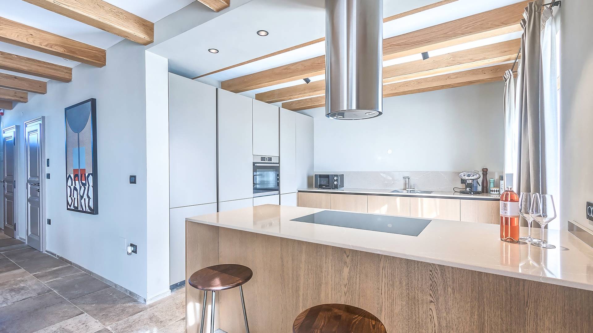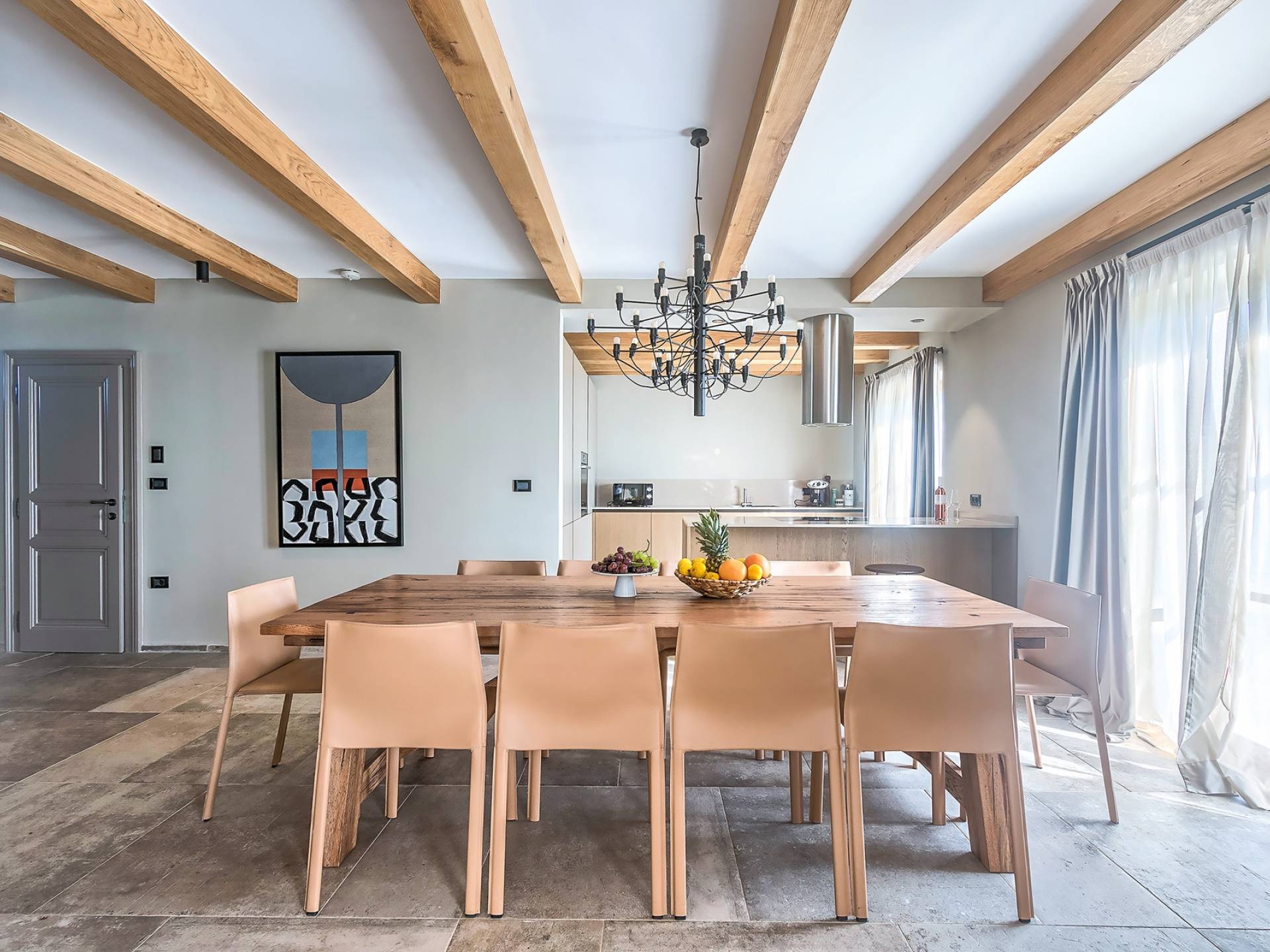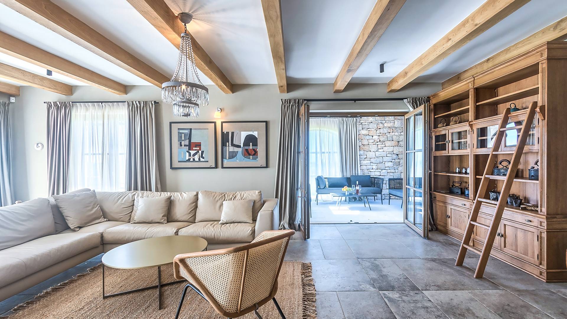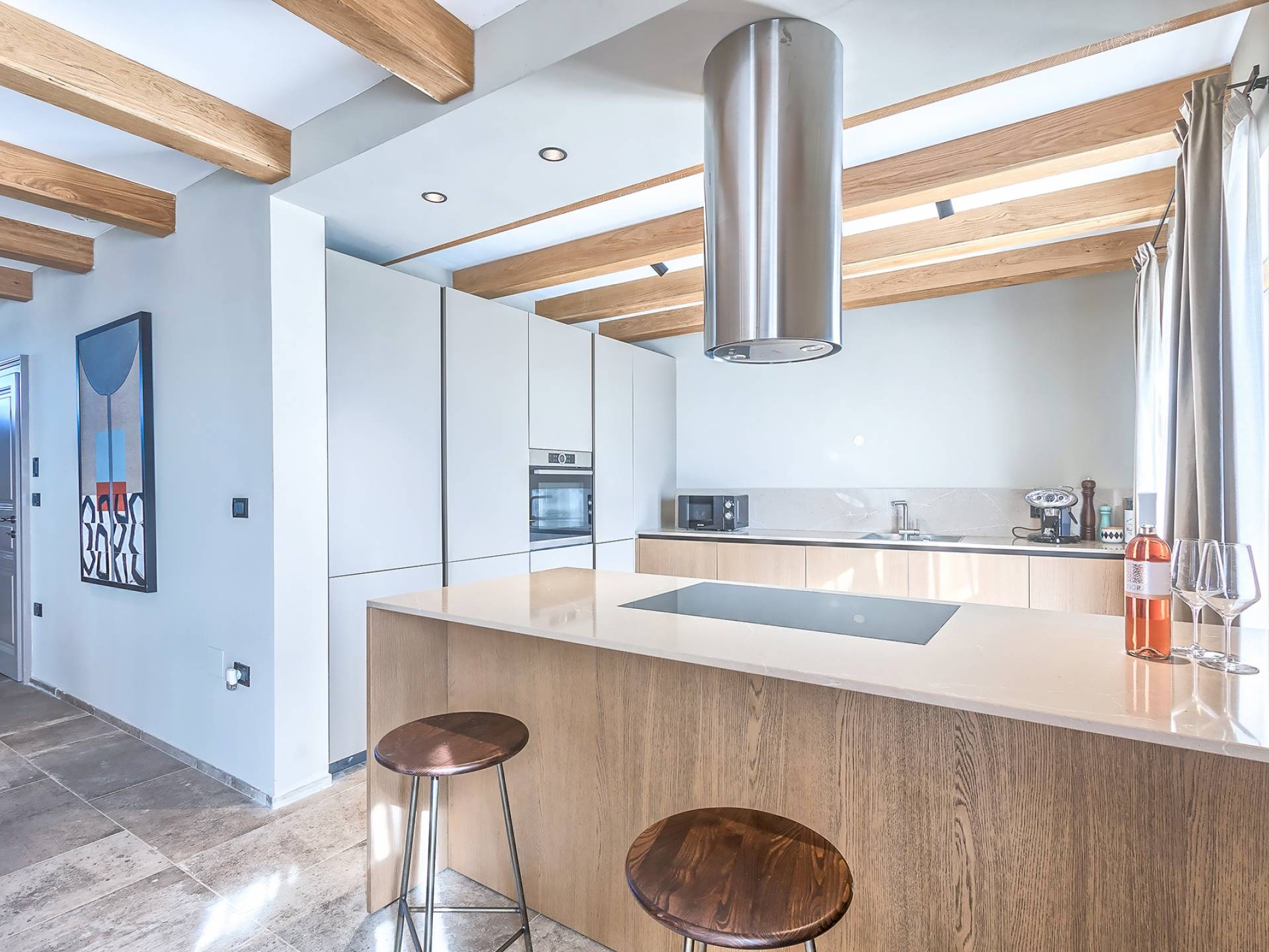 Face au salon se trouve une longue cheminée pour une ambiance particulière lors des soirées fraîches. La cuisine est bien sûr entièrement équipée et stratégiquement située pour vous permettre de cuisiner sans souci tout en surveillant les petits sur la terrasse. Presque toute la façade est couverte de portes vitrées par lesquelles vous sortez sur la terrasse qui offre une vue divine sur l'ensemble du domaine, de petits jardins en cascade pleins de fleurs, d'épices et de palmiers, les vignes environnantes et une mer ouverte à l'horizon, en la distance. La vue grandiose est garantie que vous profitiez du soleil sur la terrasse, que vous sirotiez votre verre dans la piscine, que vous prépariez un barbecue dans la cuisine extérieure ou que vous dîniez en famille ou entre amis.