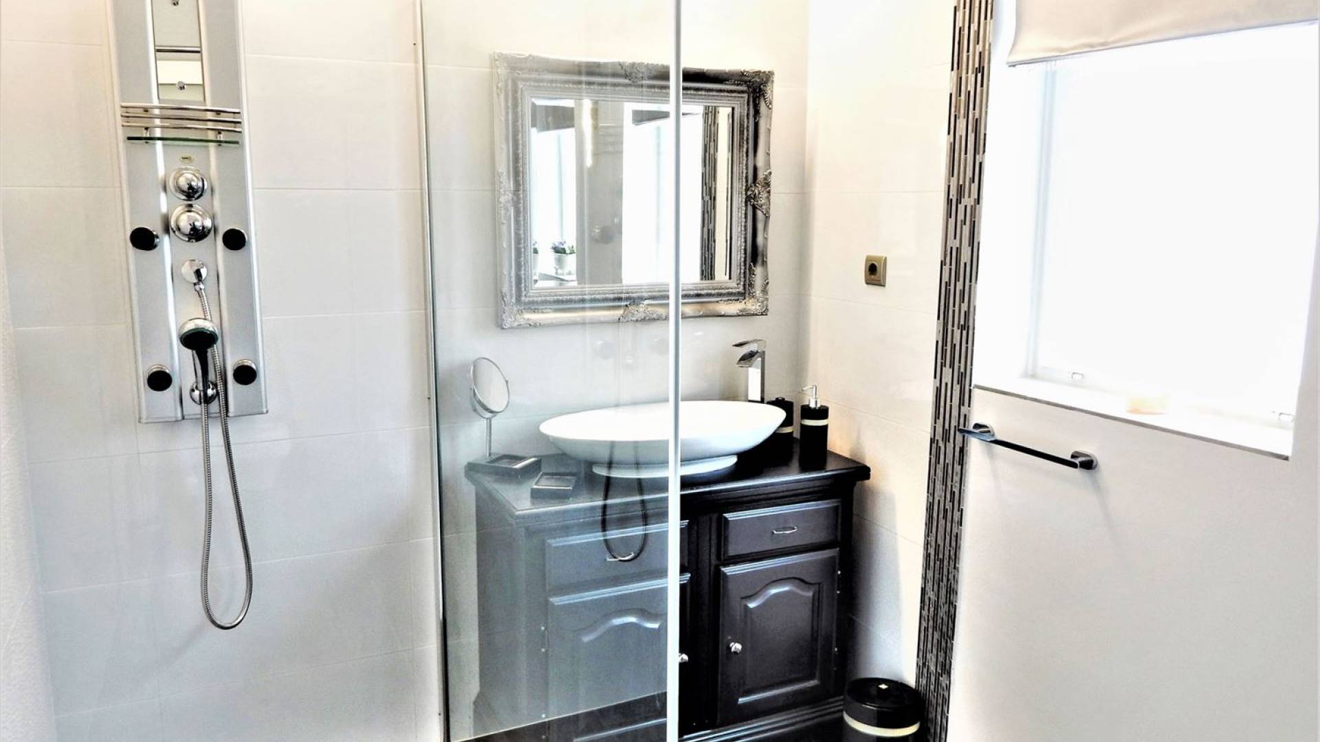 A l'étage inférieur, vous pourrez profiter du salon avec une cheminée en marbre, face à une vue dégagée sur la mer et la cour. Le grand plan d'étage ouvert accueille une salle à manger et une cuisine centrale bien approvisionnée, ainsi qu'une salle de bain d'invités avec une cabine de douche. Depuis le salon, les invités peuvent suivre un hall avec son escalier en chêne jusqu'au premier étage ou le suivre vers deux pièces latérales, dont l'une comprend une chambre avec un numéro de lit queen, une petite salle de bain avec douche et une buanderie avec extérieur cuisine.