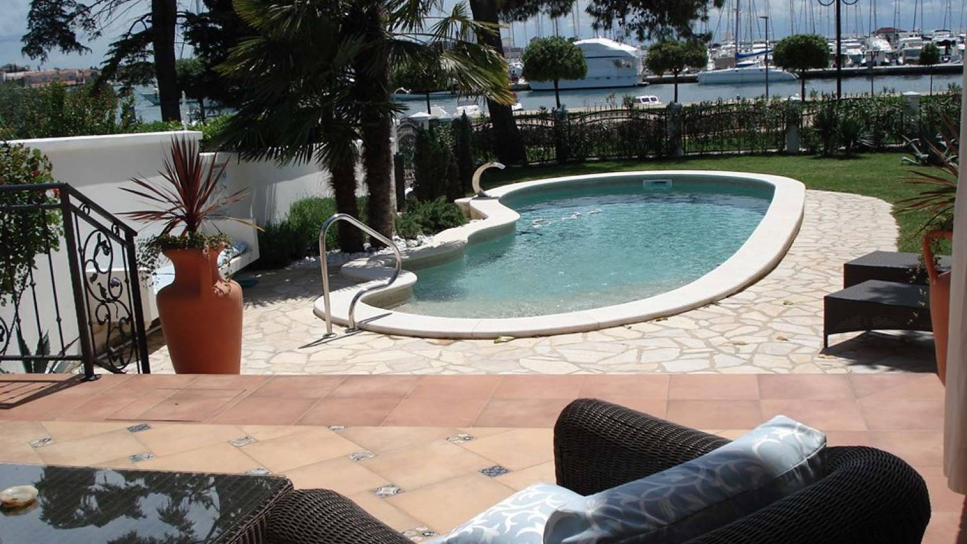 La partie résidentielle centrale de la villa s'étend au sud et à l'est et se compose du rez-de-chaussée et du premier étage, d'une grande terrasse spacieuse qui s'étend sur toute la longueur du côté sud de la Villa, face au jardin qui abrite une piscine entourée de Plantes méditerranéennes et tous les arbres de magnolia, pins et palmiers. La piscine de forme libre est d'environ 28 m², équipée d'hydromassage, de jets de massage, de veilleuses, d'une couverture d'été et d'hiver, d'un balai automatique et d'une douche extérieure à chauffage solaire. La profondeur de la piscine est bien adaptée aux enfants et aux adultes, car la profondeur varie de 0,4 m à 1,35 m.