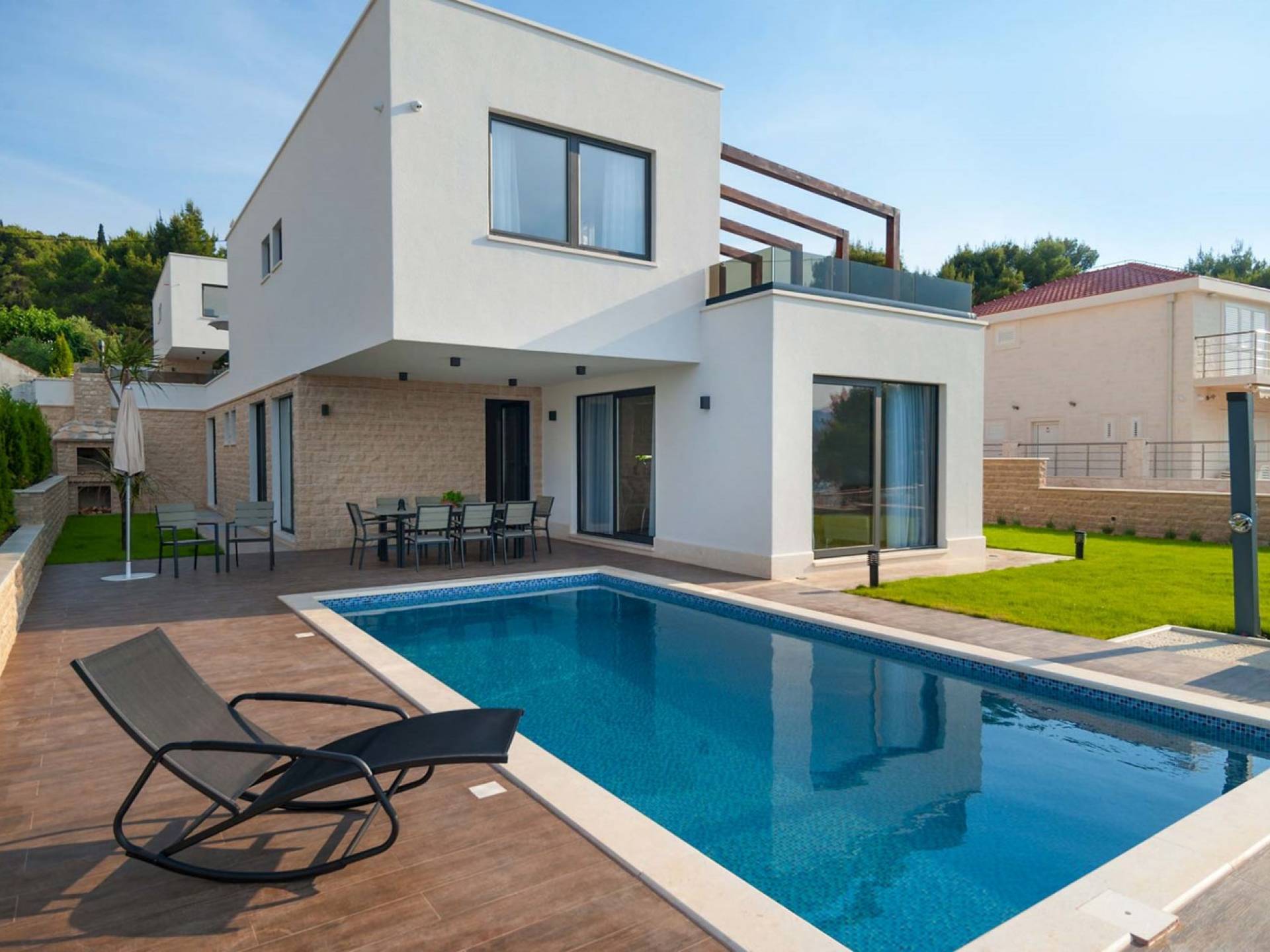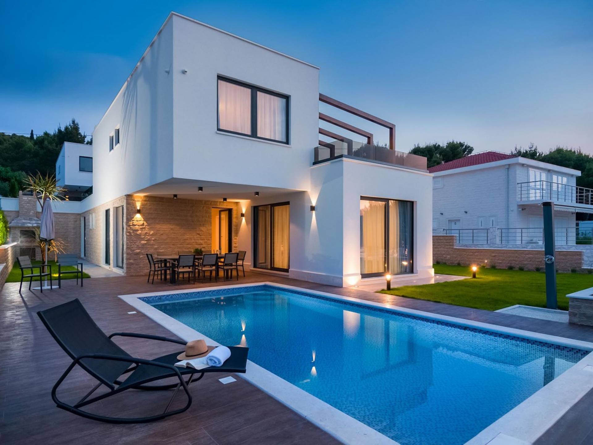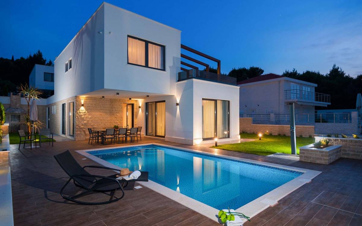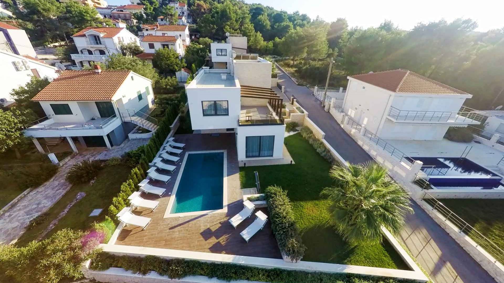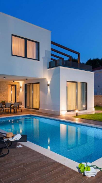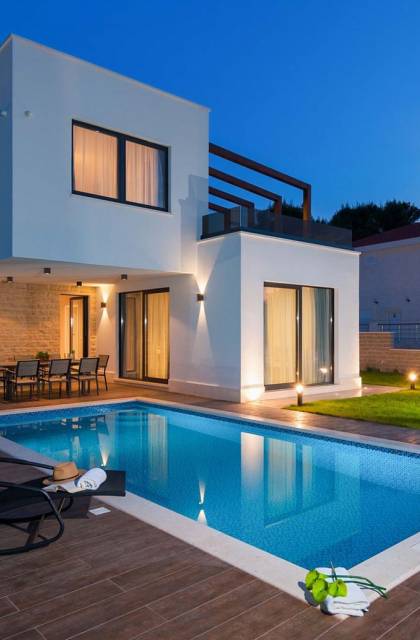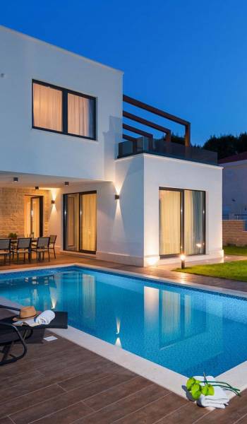 Villa Trogir Twins 1 Ciovo est une location de villa de luxe avec 6 chambres et une piscine privée. La villa moderne et nouvellement construite Trogir Twins 1 est située près de l'ancienne ville de Split et de la ville de Trogir, toutes deux avec ses sites du patrimoine mondial de l'UNESCO. Étant donné que l'île de Ciovo est une sorte d'extension de la ville de Trogir, elle offre de nombreuses possibilités de vacances, de loisirs et de baignade, ainsi que de nombreux monuments historiques. La végétation méditerranéenne, un archipel avec de petites petites îles pittoresques, un climat doux et les plus belles plages dans des baies cachées, rendront certainement votre séjour inoubliable.