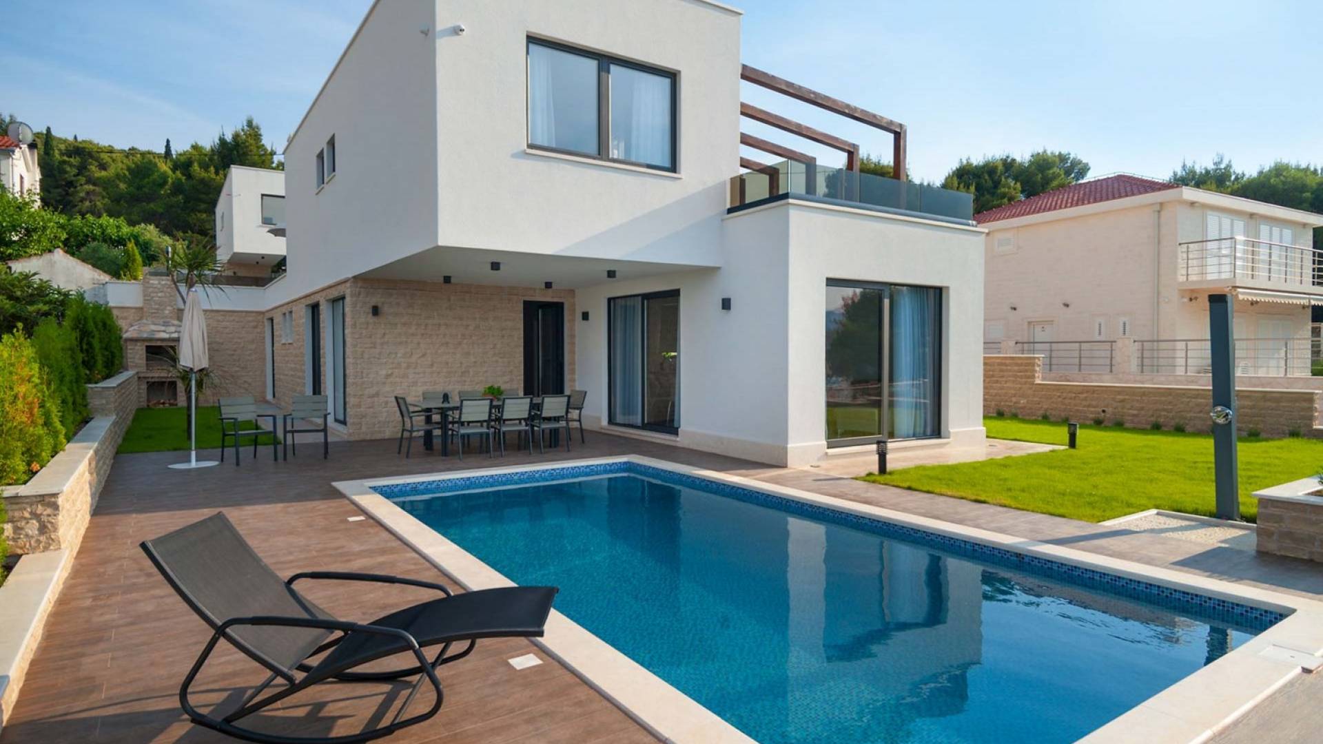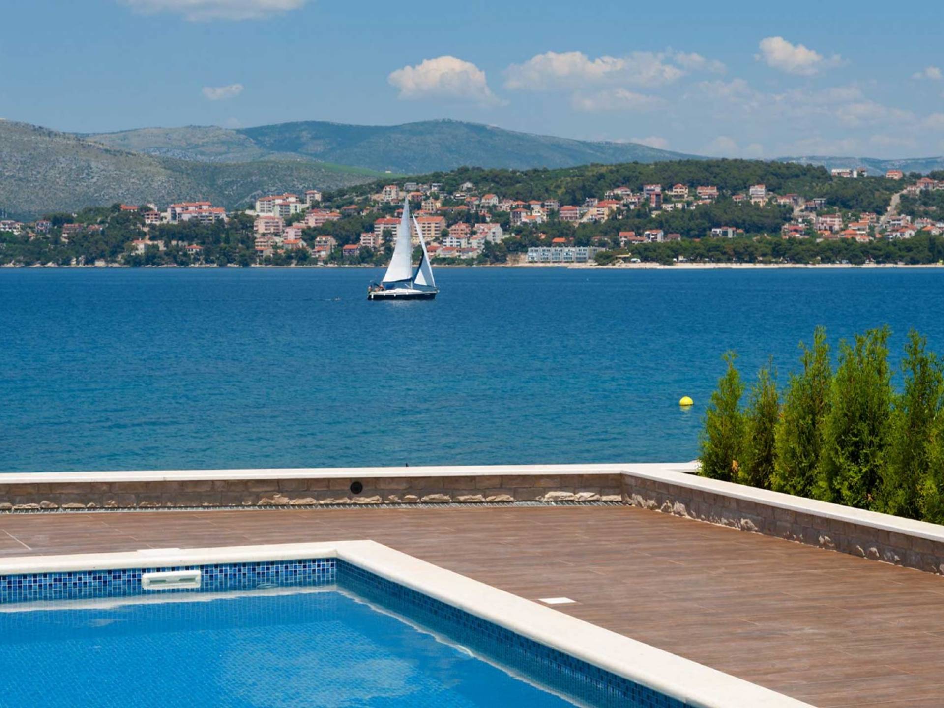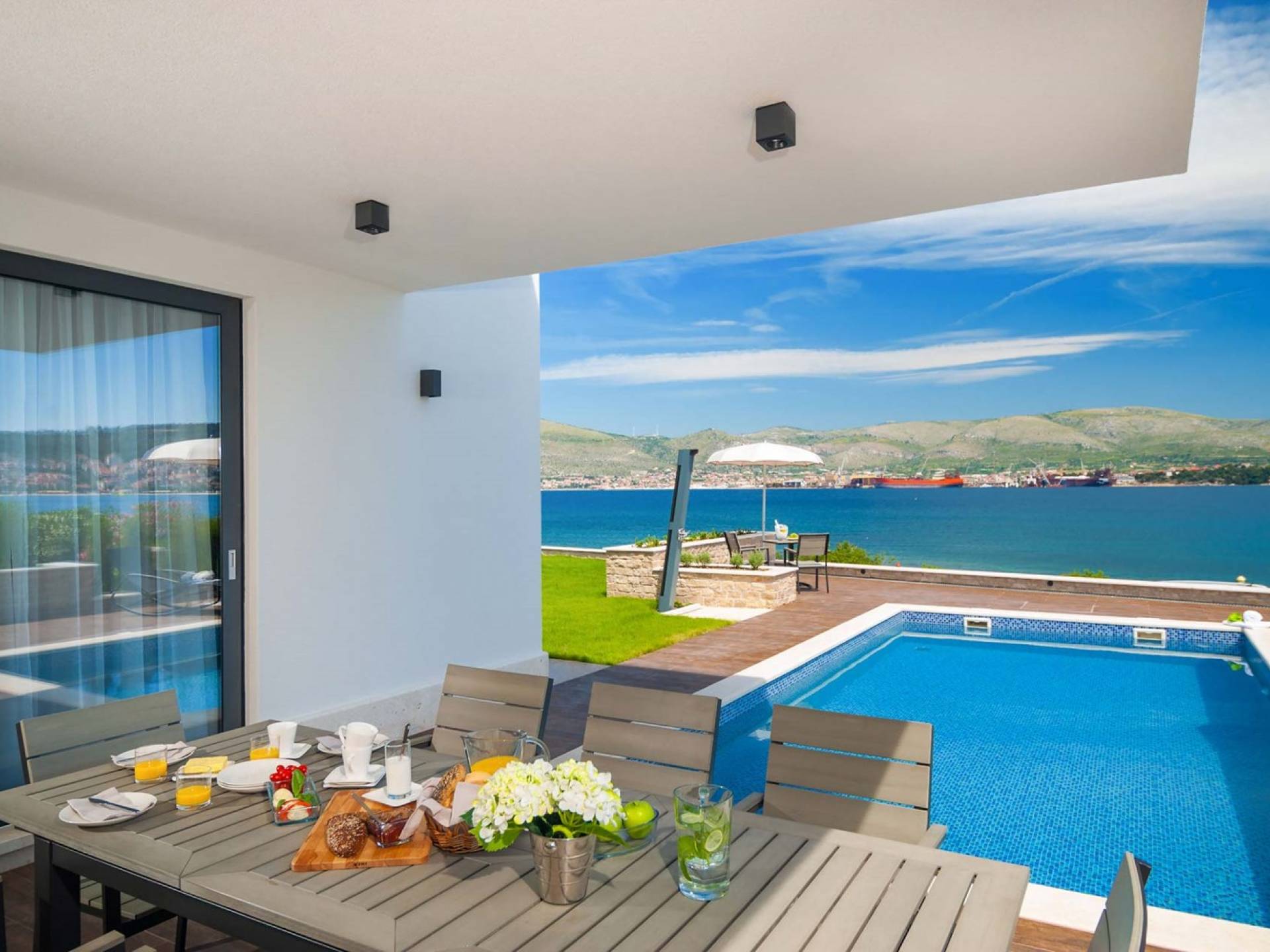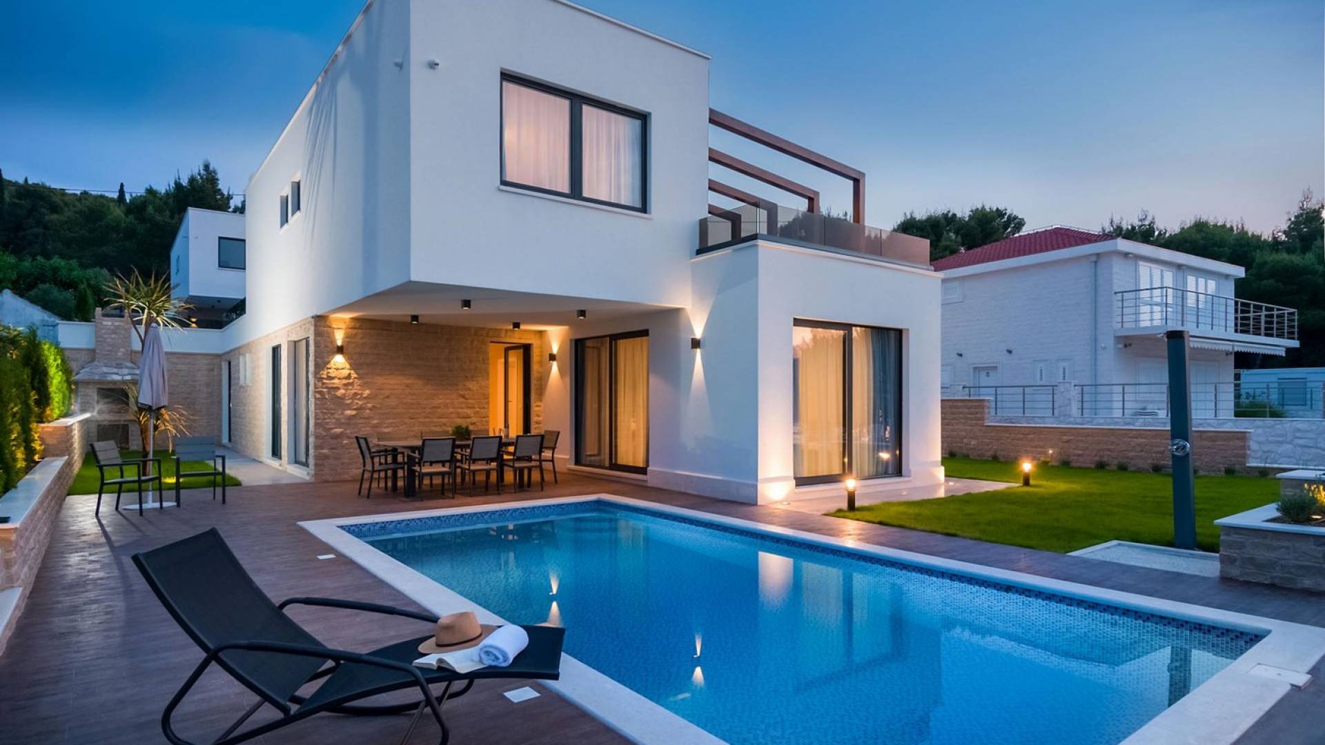 Villa Trogir Twins 1 Ciovo est une location de villa de luxe avec 6 chambres et une piscine privée. La villa moderne et nouvellement construite Trogir Twins 1 est située près de l'ancienne ville de Split et de la ville de Trogir, toutes deux avec ses sites du patrimoine mondial de l'UNESCO. Étant donné que l'île de Ciovo est une sorte d'extension de la ville de Trogir, elle offre de nombreuses possibilités de vacances, de loisirs et de baignade, ainsi que de nombreux monuments historiques. La végétation méditerranéenne, un archipel avec de petites petites îles pittoresques, un climat doux et les plus belles plages dans des baies cachées, rendront certainement votre séjour inoubliable.