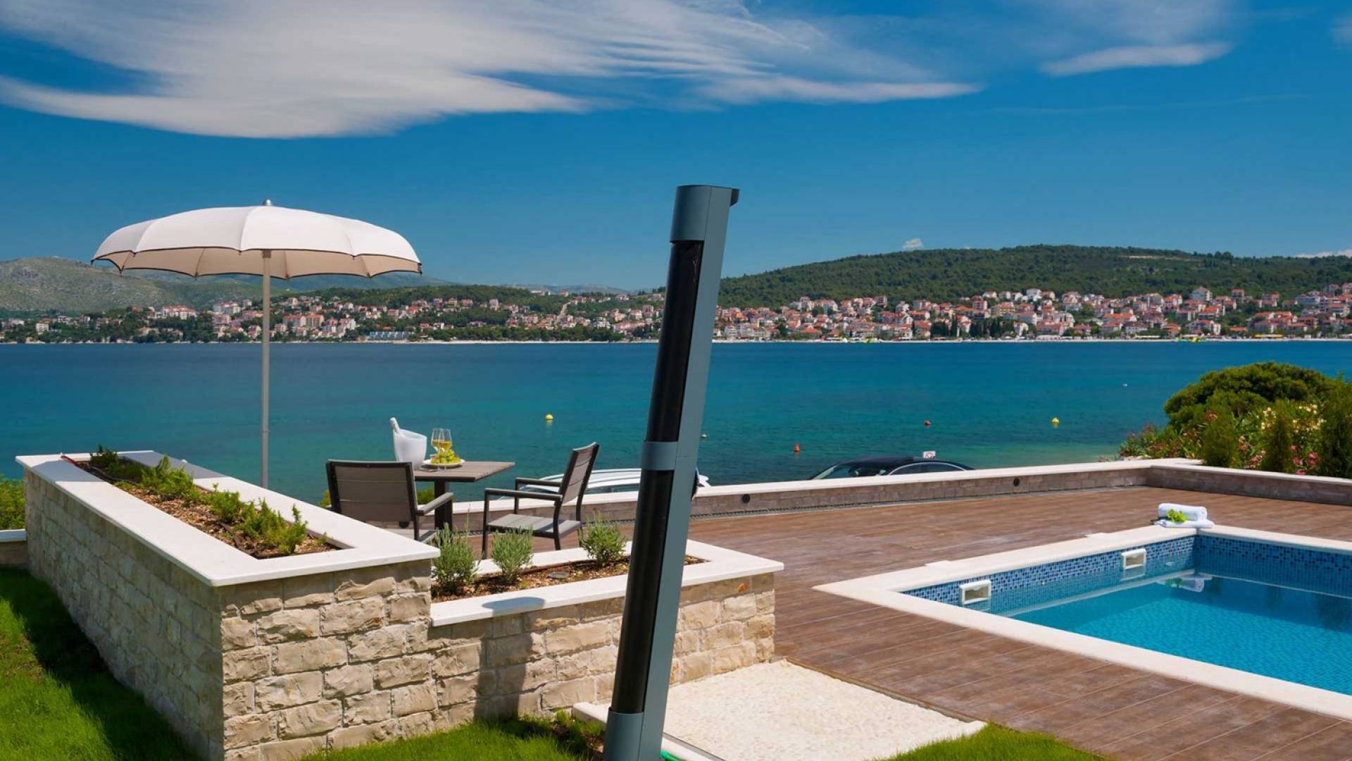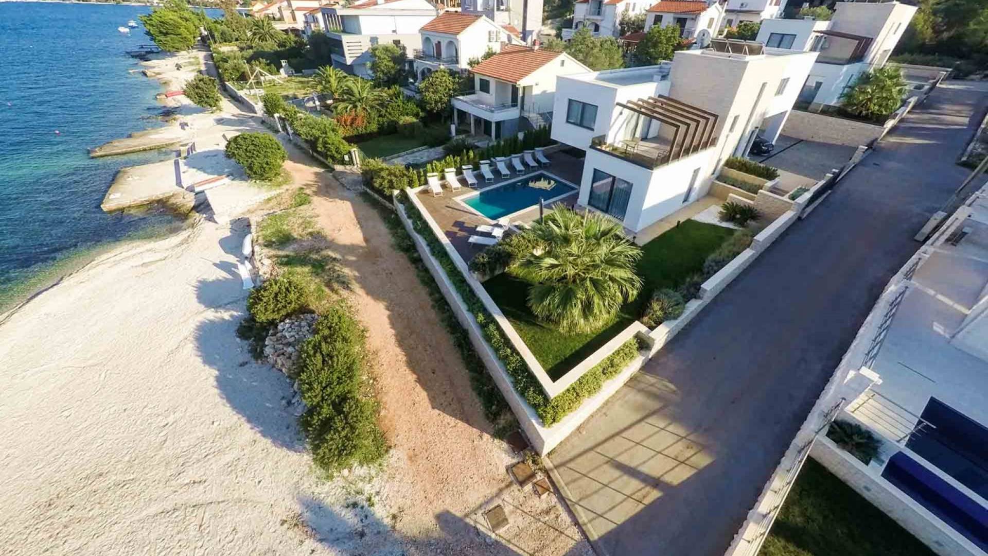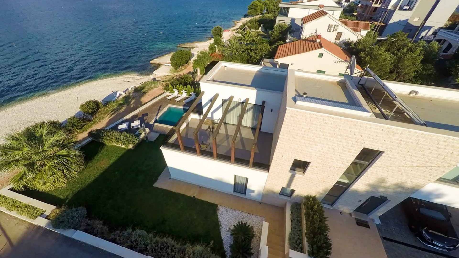La Villa de luxe cinq étoiles Trogir Twins 1 avec piscine extérieure et intérieure est située en première ligne de mer, à Okrug Gornji, à seulement 5 mètres de la belle mer et de la plage de galets. Cette villa élégante et moderne a été construite en 2015 et c'est une combinaison d'élégance et d'équipements de luxe que vous attendez d'une villa 5 étoiles. Dans l'extérieur exquis et élégant de cette villa, vous trouverez un intérieur très beau et fonctionnel, idéal pour passer des vacances en famille ou entre amis.