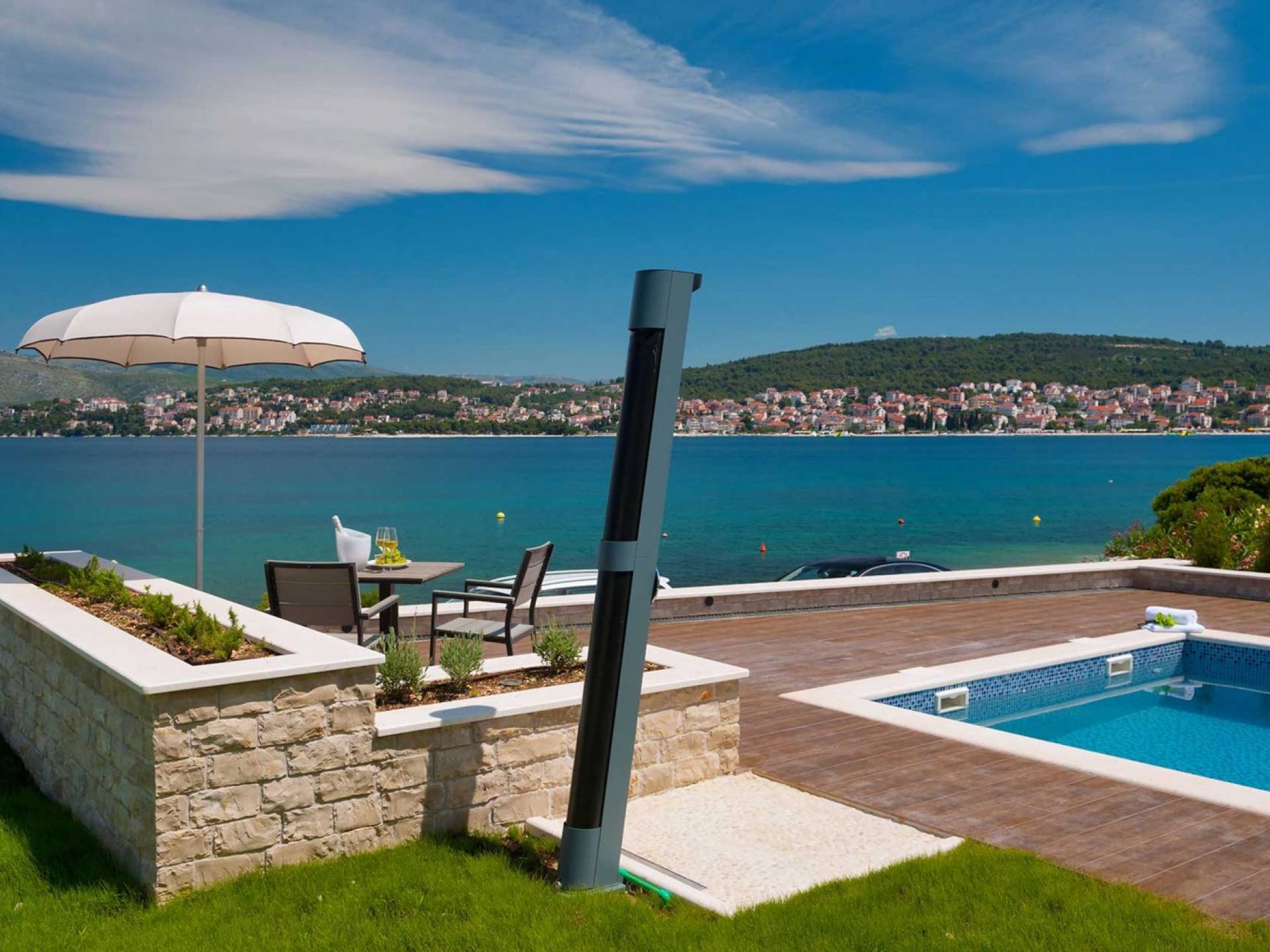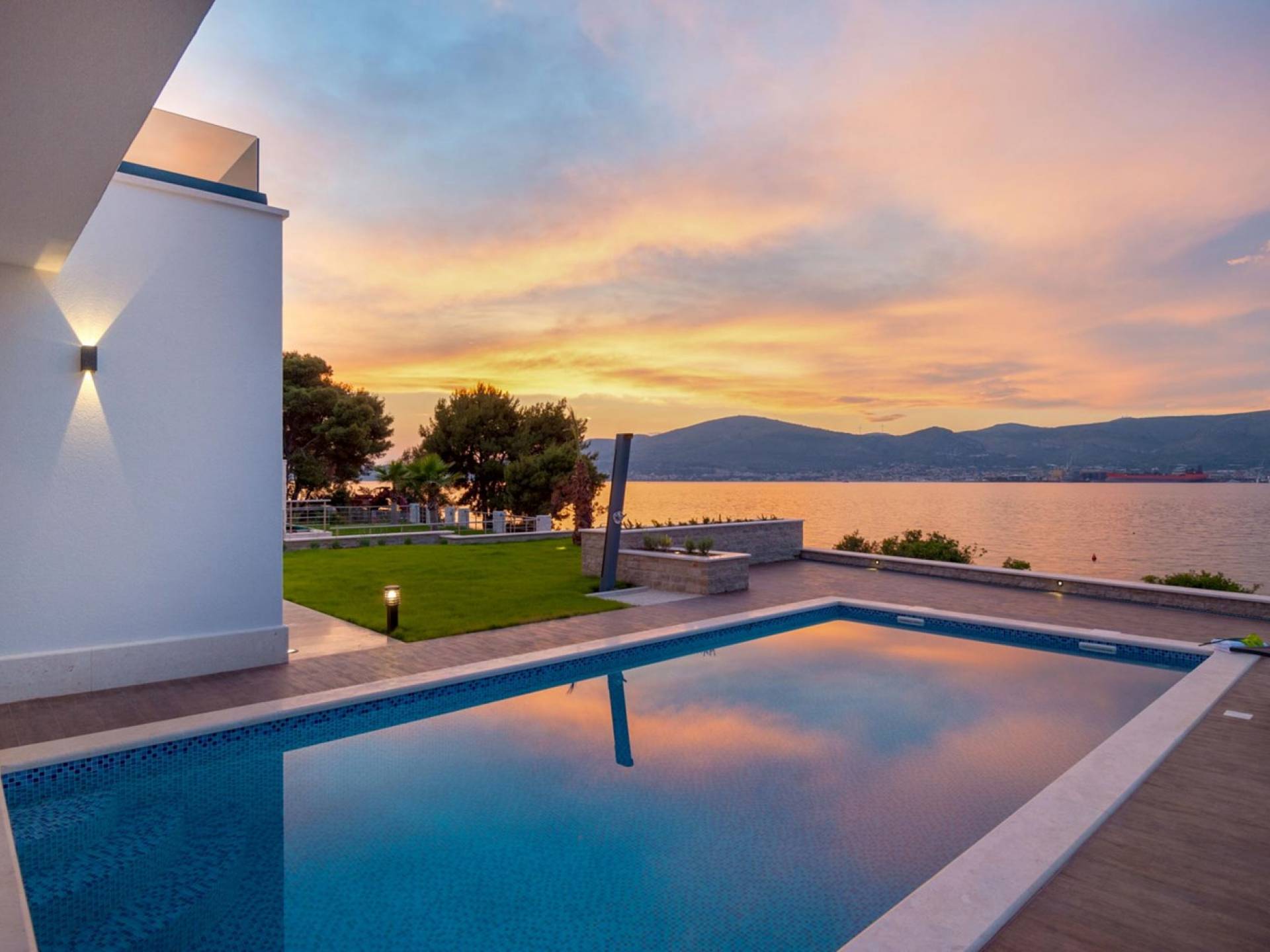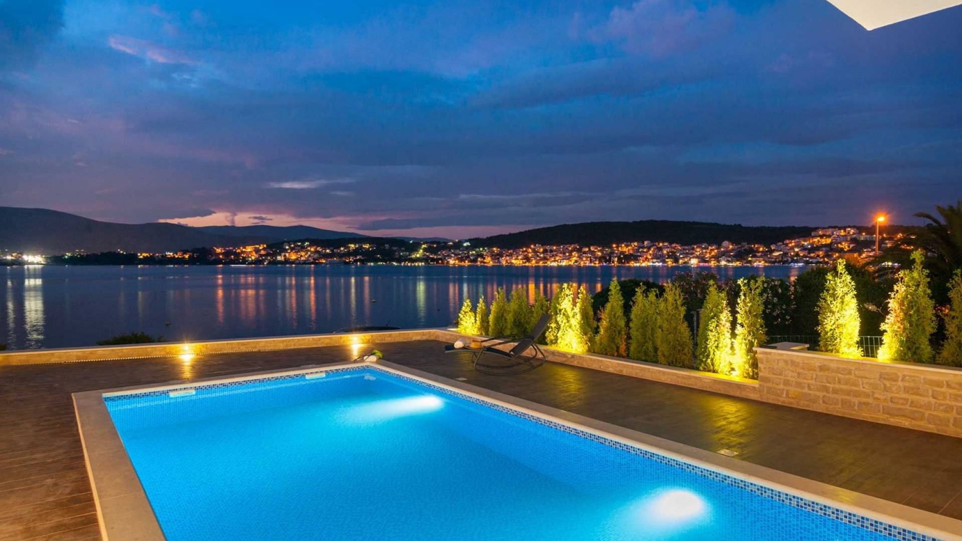 La Villa de luxe cinq étoiles Trogir Twins 1 avec piscine extérieure et intérieure est située en première ligne de mer, à Okrug Gornji, à seulement 5 mètres de la belle mer et de la plage de galets. Cette villa élégante et moderne a été construite en 2015 et c'est une combinaison d'élégance et d'équipements de luxe que vous attendez d'une villa 5 étoiles. Dans l'extérieur exquis et élégant de cette villa, vous trouverez un intérieur très beau et fonctionnel, idéal pour passer des vacances en famille ou entre amis.