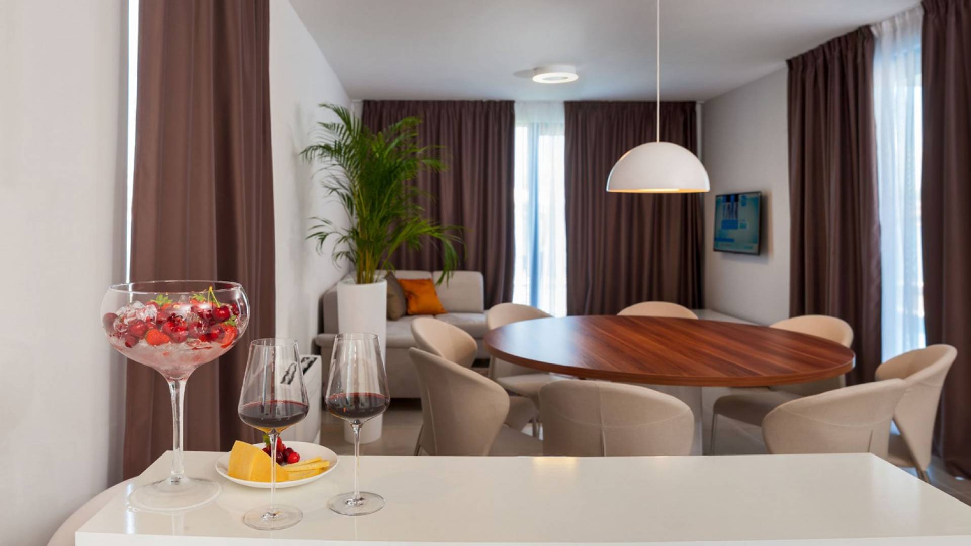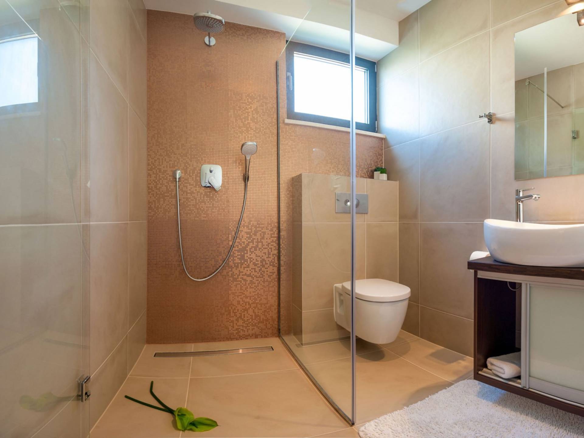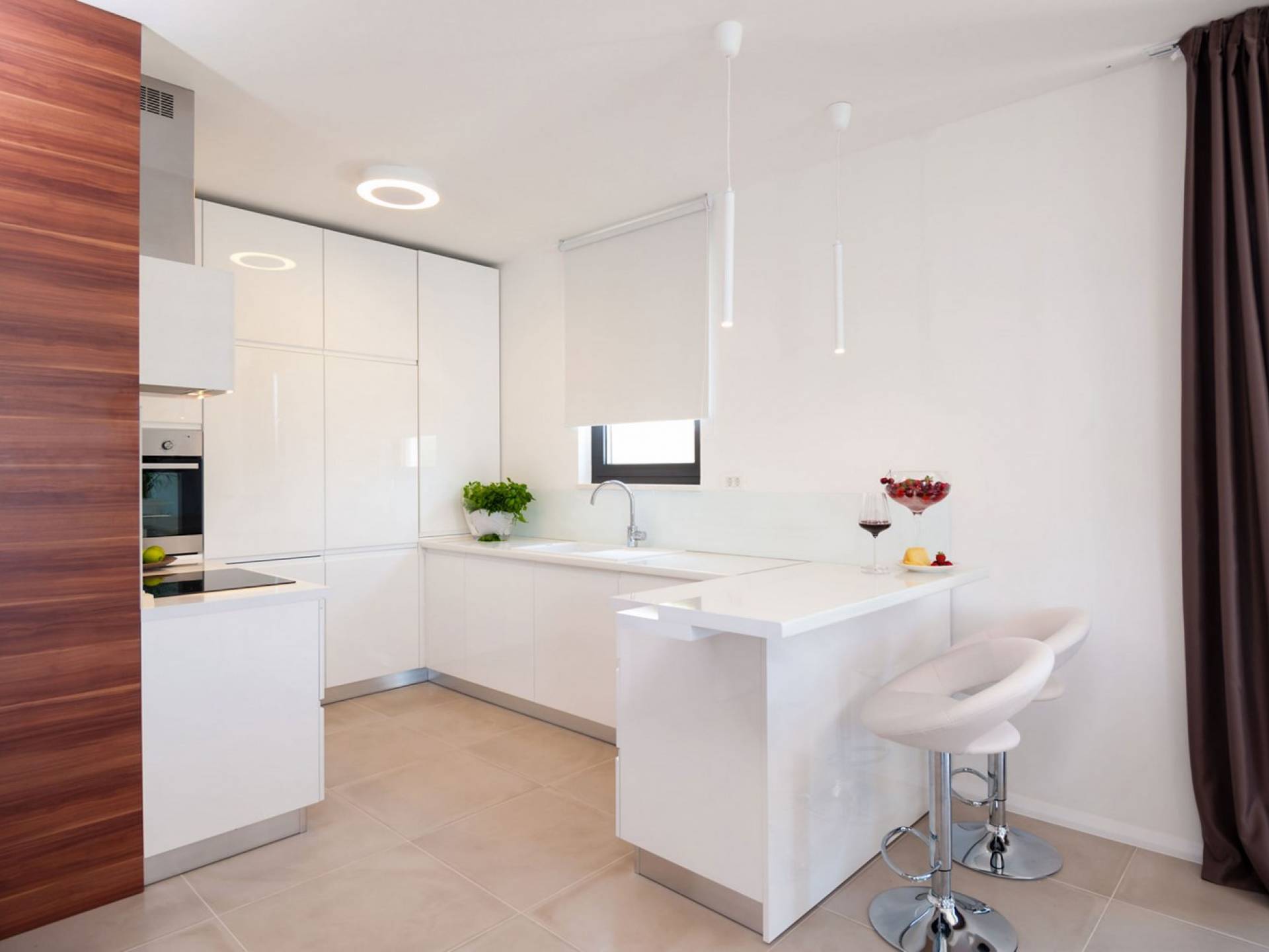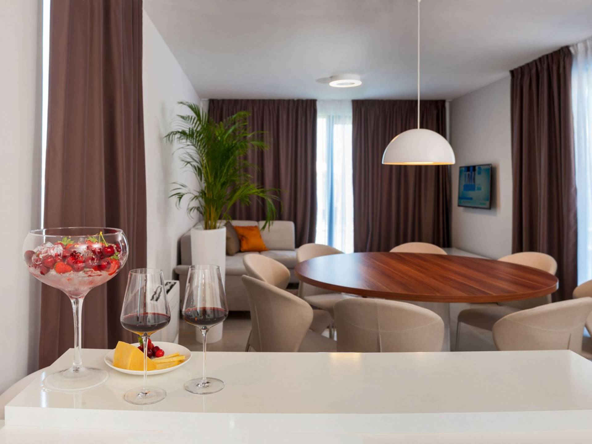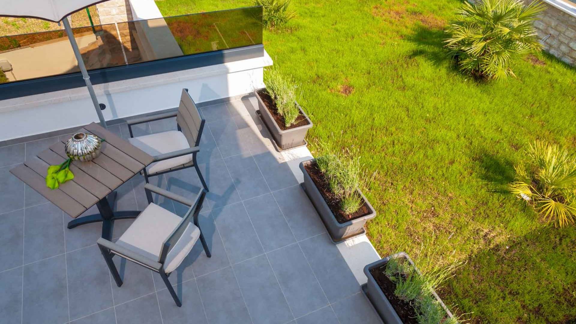 Le sous-sol de la villa Trogir Twins 1 est conçu comme une zone de loisirs avec une salle de sport, un sauna, une piscine intérieure (20m²) et une salle de divertissement avec un billard. Le rez-de-chaussée se compose d'un élégant salon encadré par de grandes parois vitrées, qui peut également être ouvert comme une sortie supplémentaire vers la terrasse extérieure. Il y a aussi un coin repas avec une table à manger et une cuisine entièrement équipée.