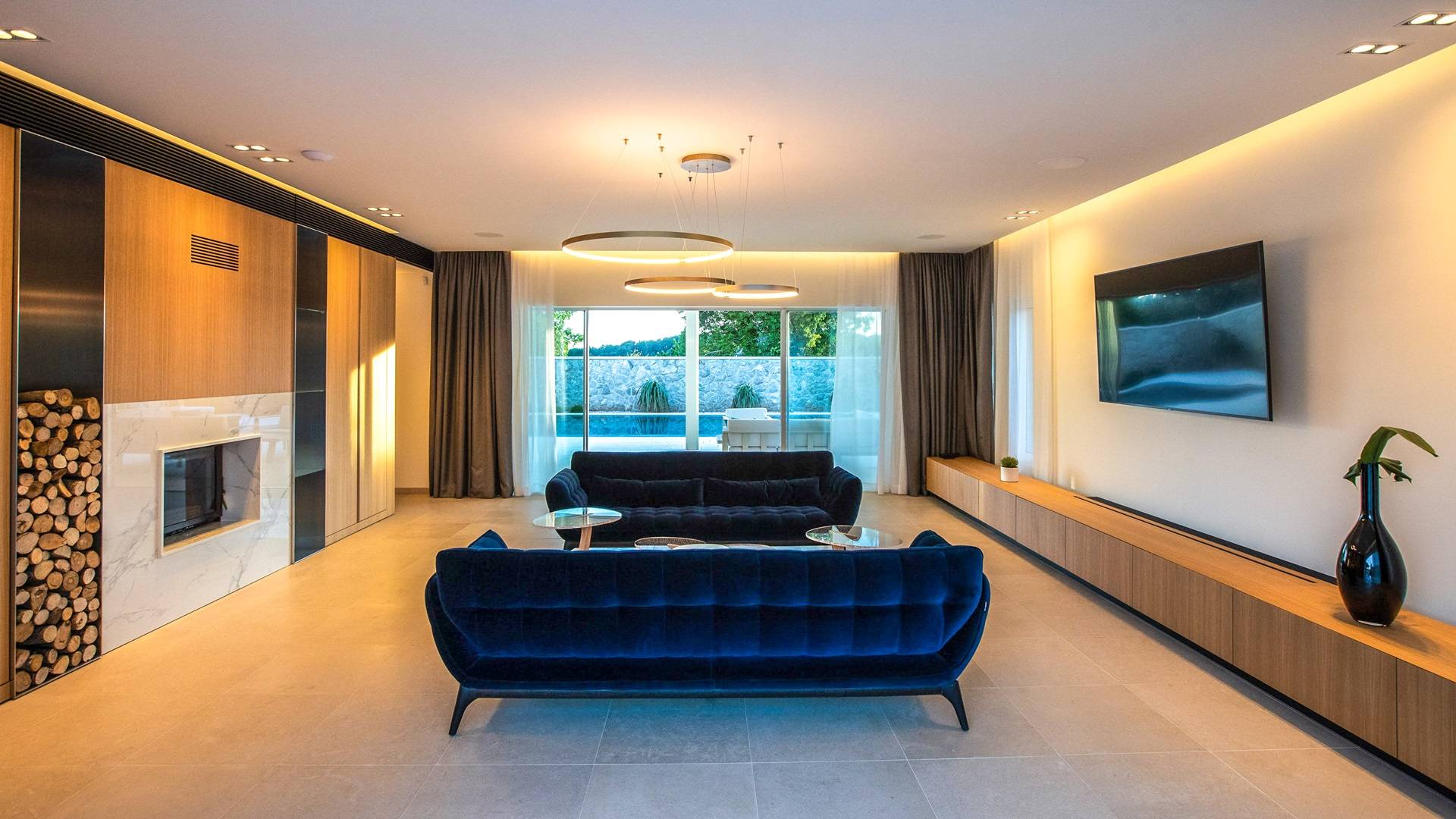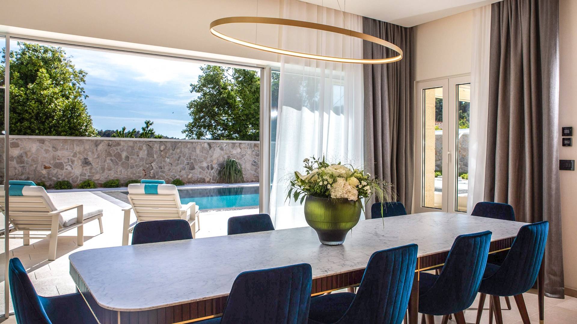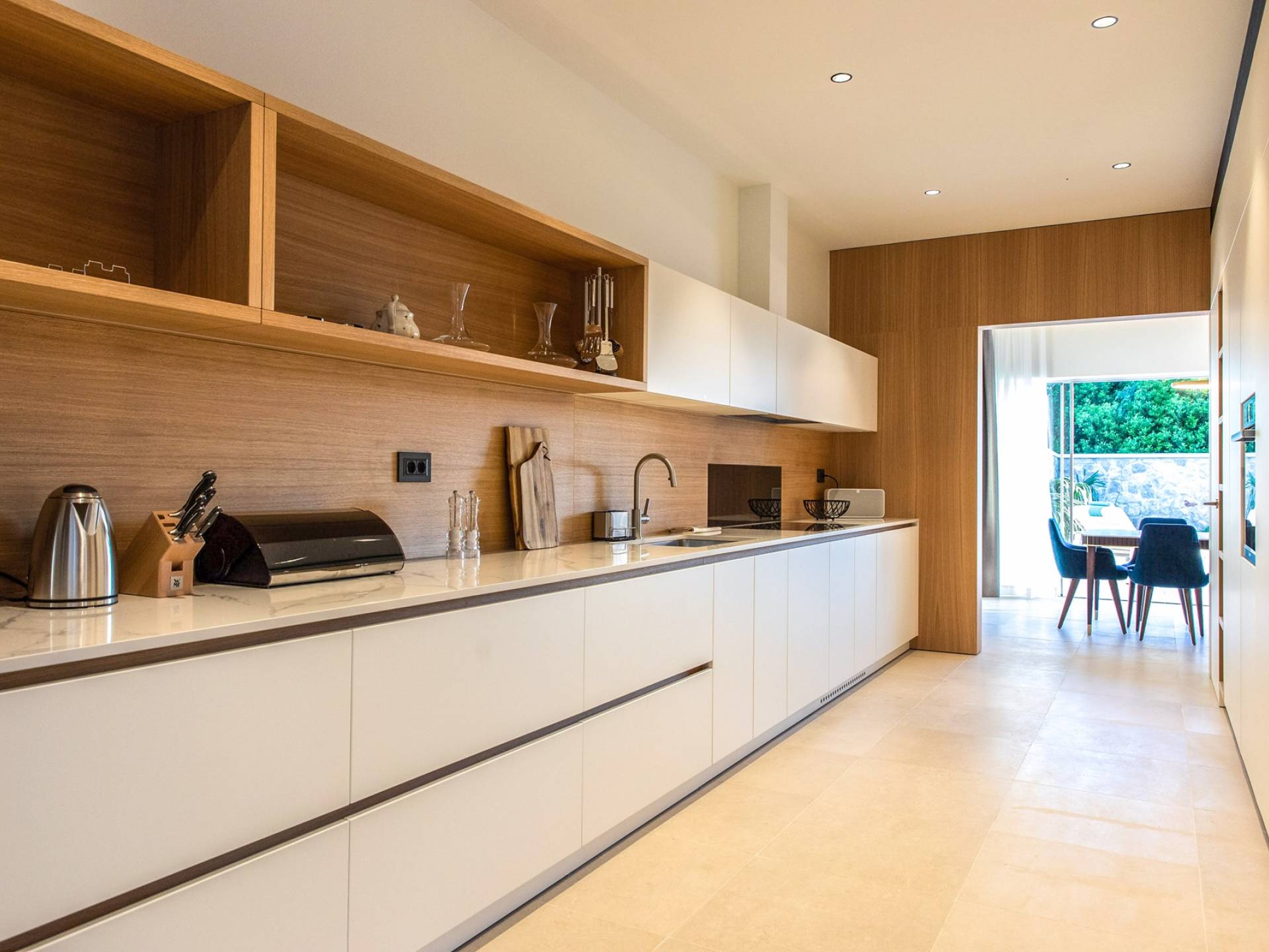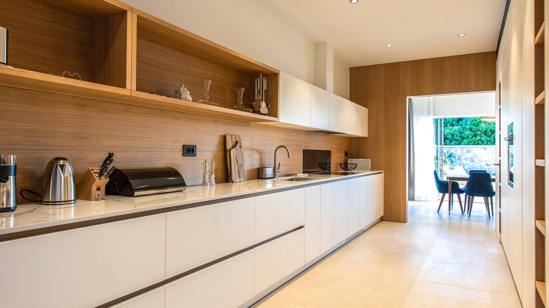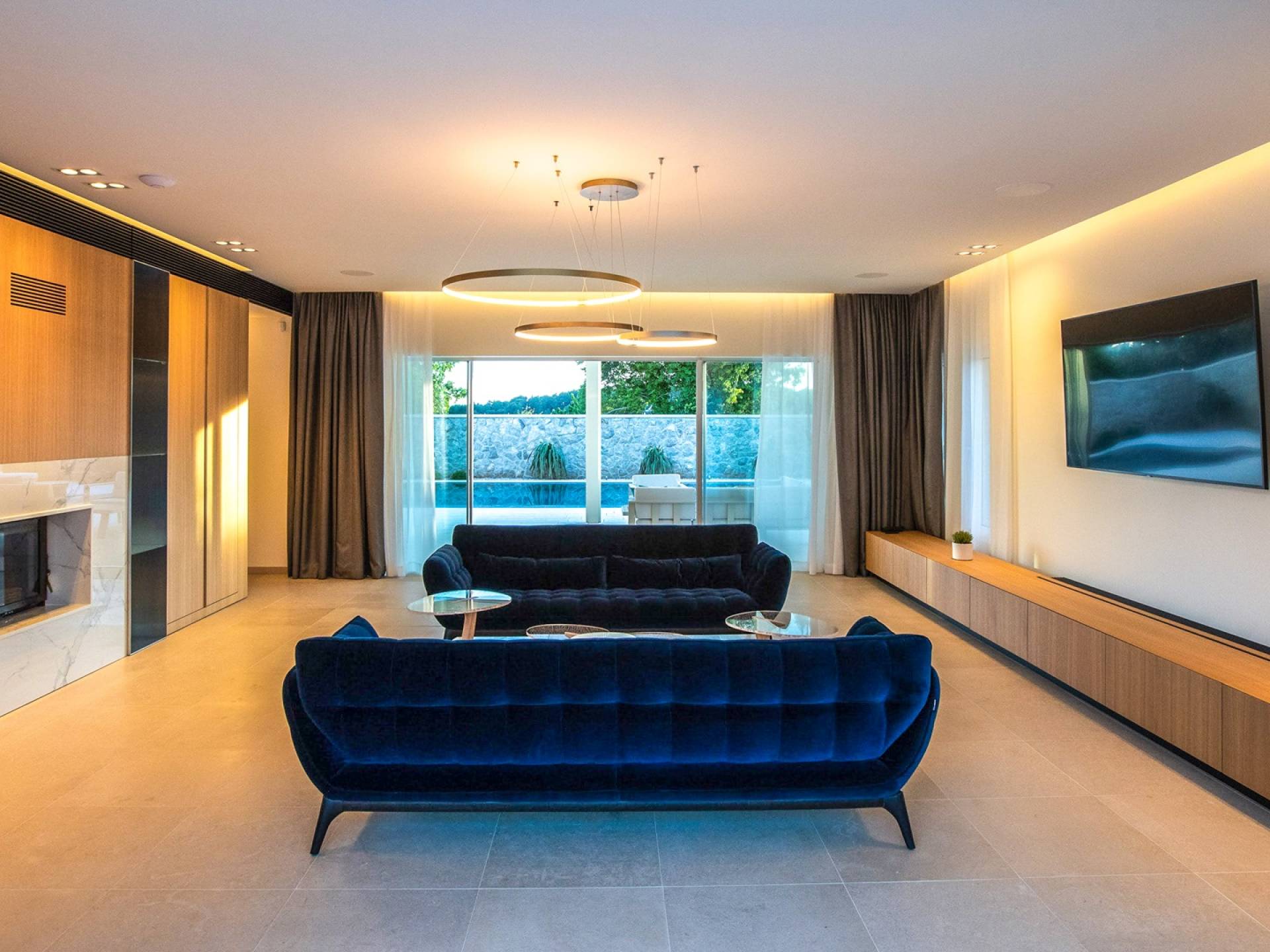 Le rez-de-chaussée de la luxueuse Villa Eos est séparé de la terrasse par une paroi vitrée coulissante qui laisse suffisamment de lumière du jour. Il se compose d'un salon design avec des canapés élégants et une télévision par satellite. Ensuite, le concept ouvert combine une cuisine moderne entièrement équipée avec un design minimaliste et une salle à manger charmante. Du rez-de-chaussée central - la première partie de l'étage, vous pouvez également emprunter les escaliers jusqu'au rez-de-chaussée inférieur de la villa où se trouve une cave à vin. Le rez-de-chaussée et le premier étage de la villa sont séparés du rez-de-chaussée par un escalier intérieur. Il y a 3 chambres avec des lits king-size et des salles de bain attenantes.