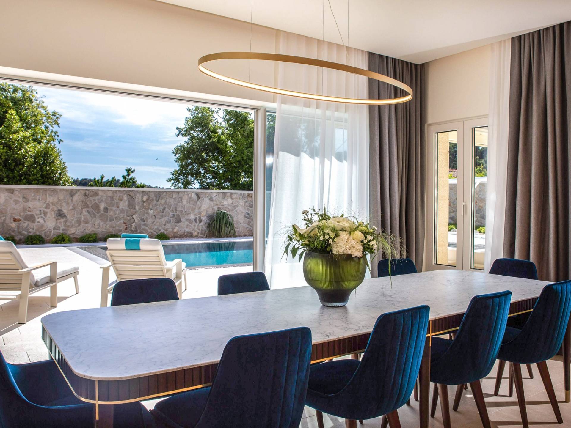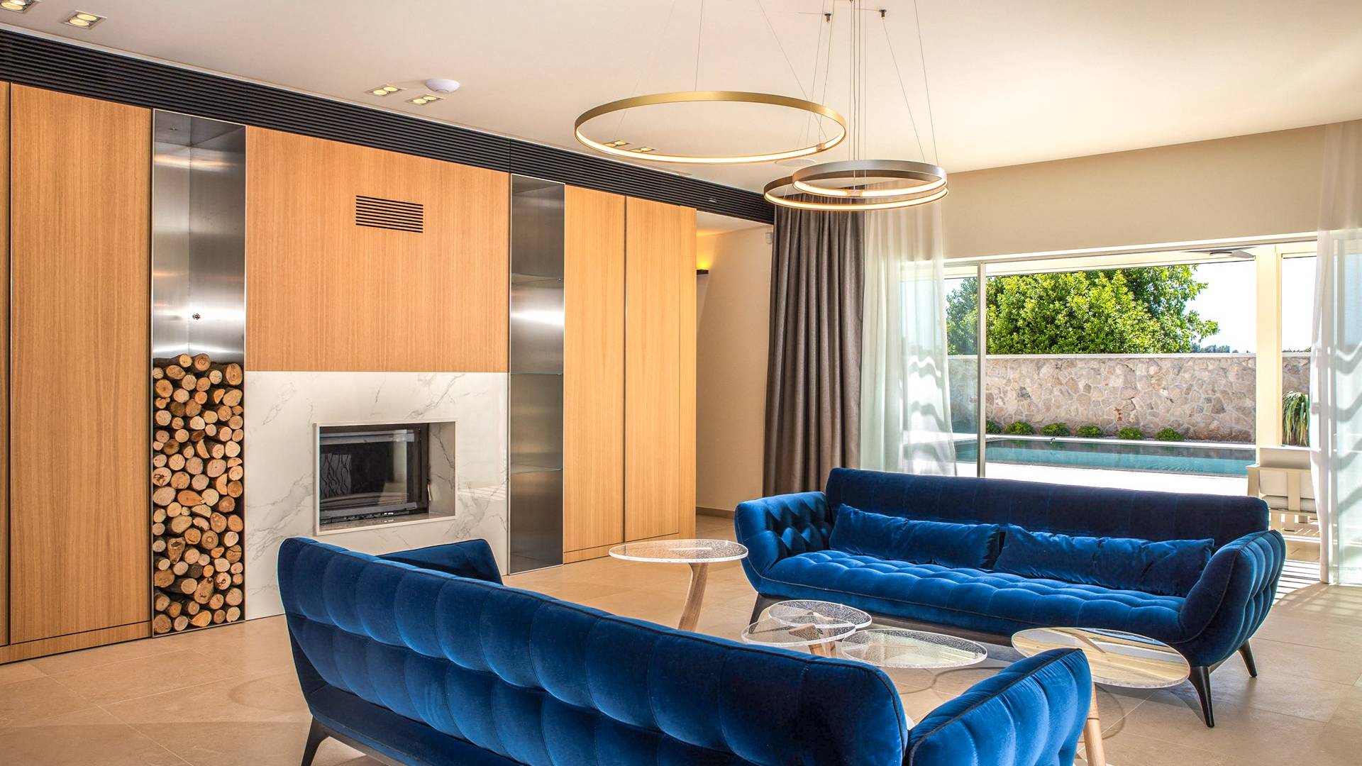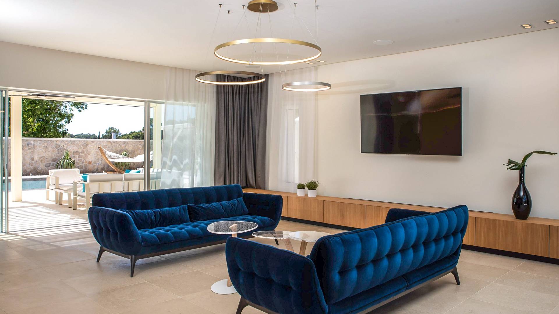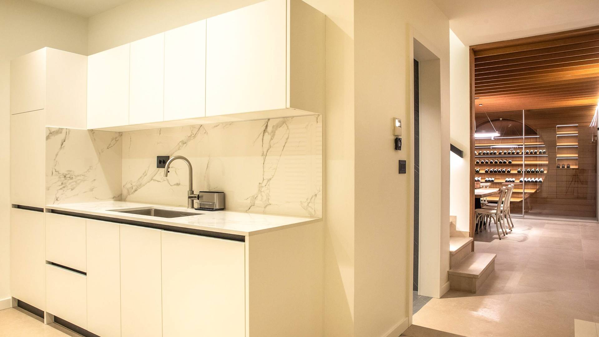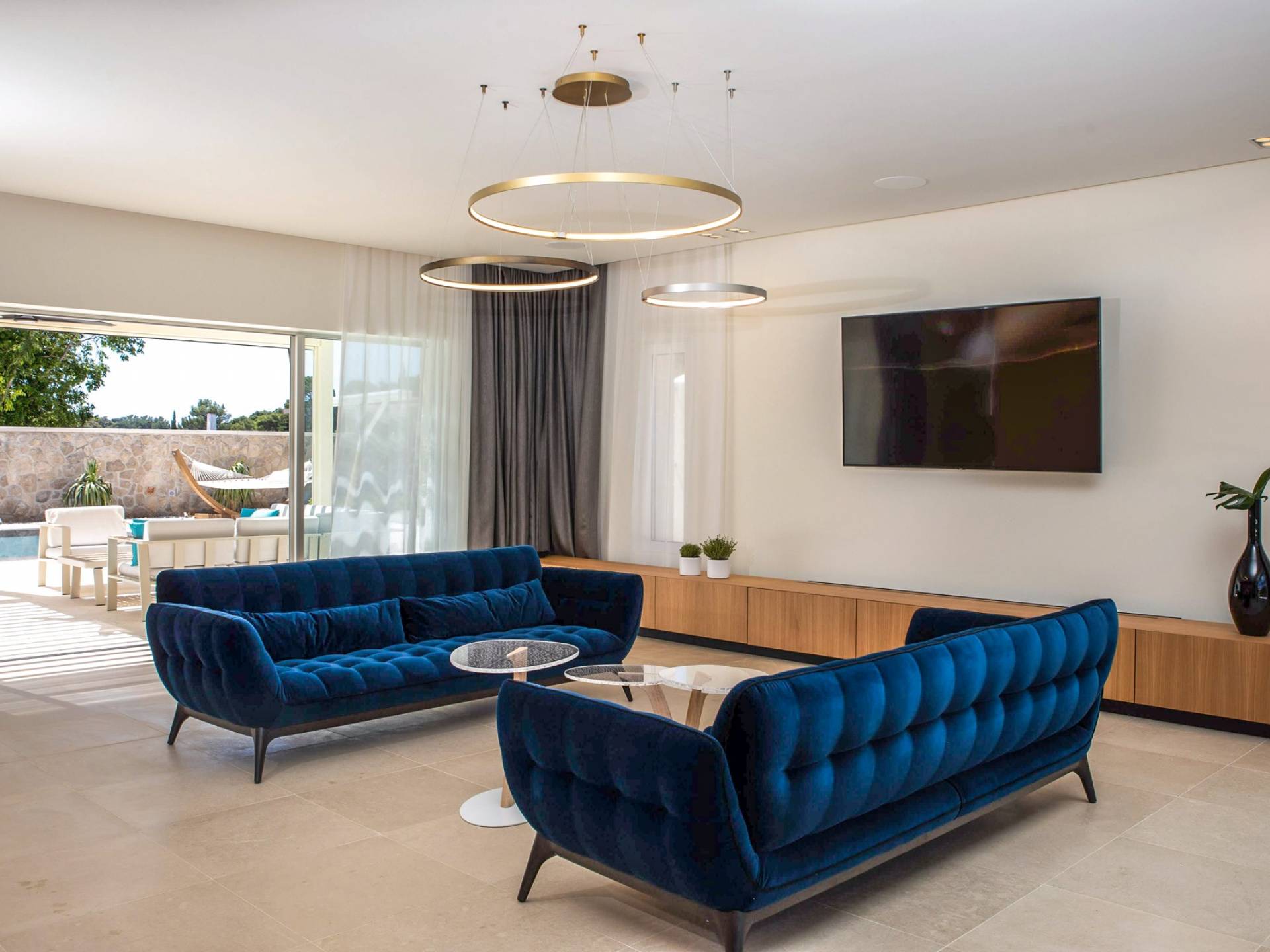 Le rez-de-chaussée de la luxueuse Villa Eos est séparé de la terrasse par une paroi vitrée coulissante qui laisse suffisamment de lumière du jour. Il se compose d'un salon design avec des canapés élégants et une télévision par satellite. Ensuite, le concept ouvert combine une cuisine moderne entièrement équipée avec un design minimaliste et une salle à manger charmante. Du rez-de-chaussée central - la première partie de l'étage, vous pouvez également emprunter les escaliers jusqu'au rez-de-chaussée inférieur de la villa où se trouve une cave à vin. Le rez-de-chaussée et le premier étage de la villa sont séparés du rez-de-chaussée par un escalier intérieur. Il y a 3 chambres avec des lits king-size et des salles de bain attenantes.