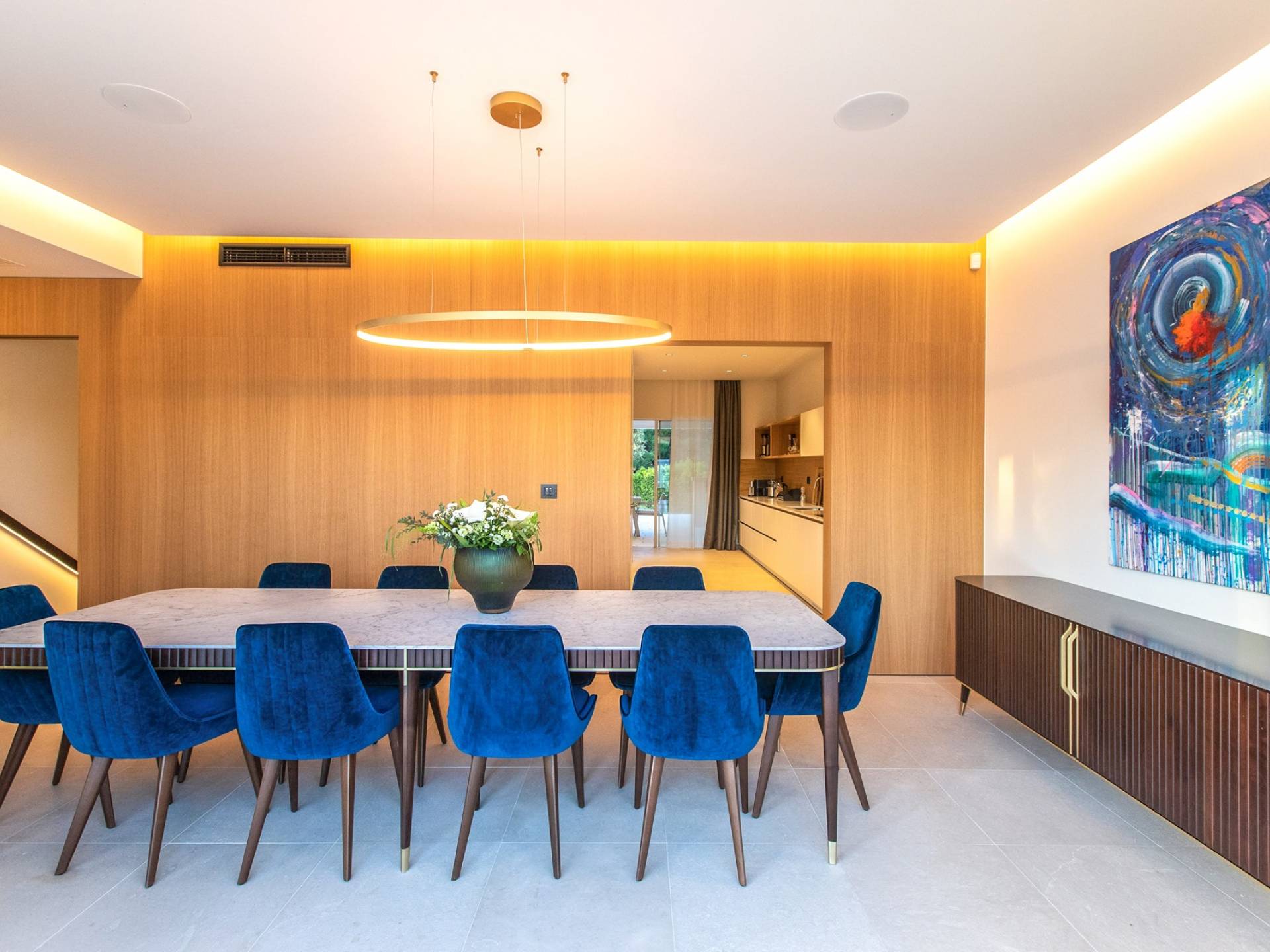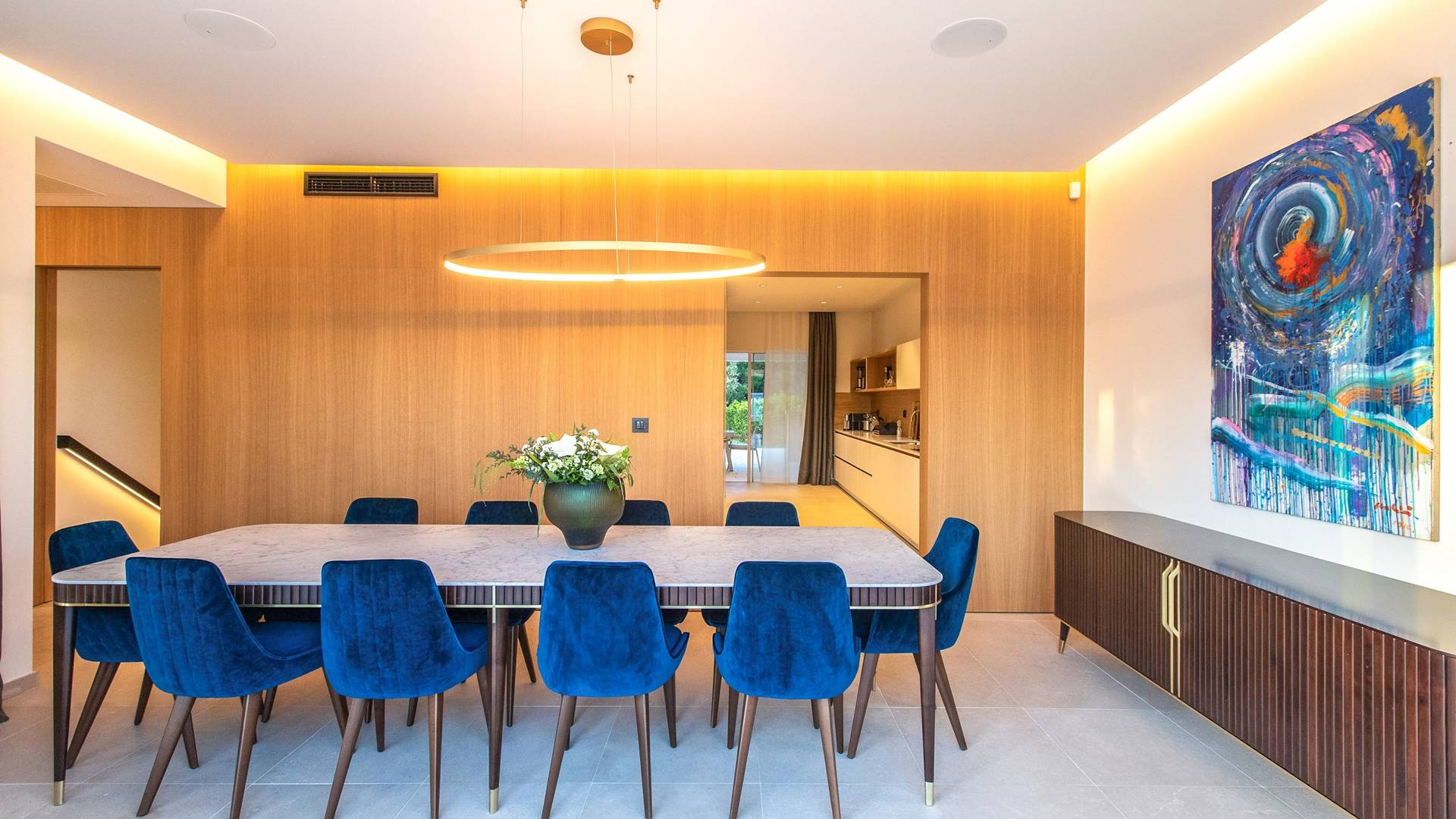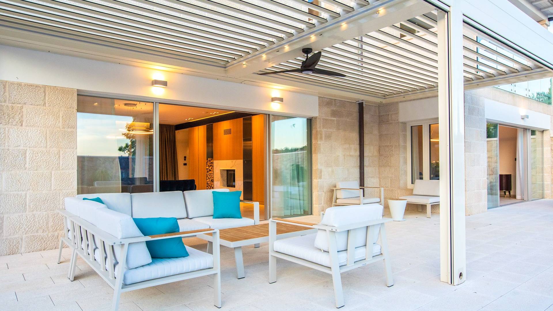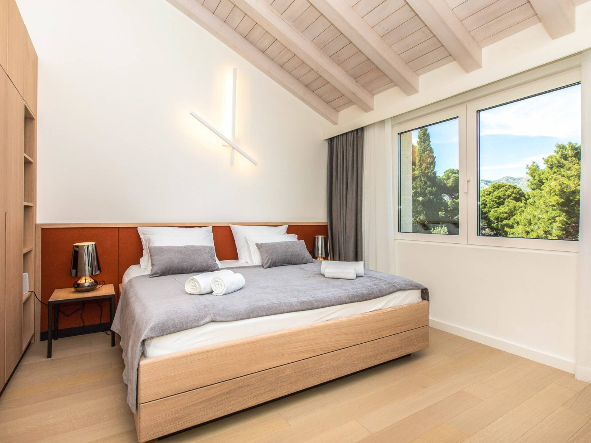 Le rez-de-chaussée de la luxueuse Villa Eos est séparé de la terrasse par une paroi vitrée coulissante qui laisse suffisamment de lumière du jour. Il se compose d'un salon design avec des canapés élégants et une télévision par satellite. Ensuite, le concept ouvert combine une cuisine moderne entièrement équipée avec un design minimaliste et une salle à manger charmante. Du rez-de-chaussée central - la première partie de l'étage, vous pouvez également emprunter les escaliers jusqu'au rez-de-chaussée inférieur de la villa où se trouve une cave à vin. Le rez-de-chaussée et le premier étage de la villa sont séparés du rez-de-chaussée par un escalier intérieur. Il y a 3 chambres avec des lits king-size et des salles de bain attenantes.