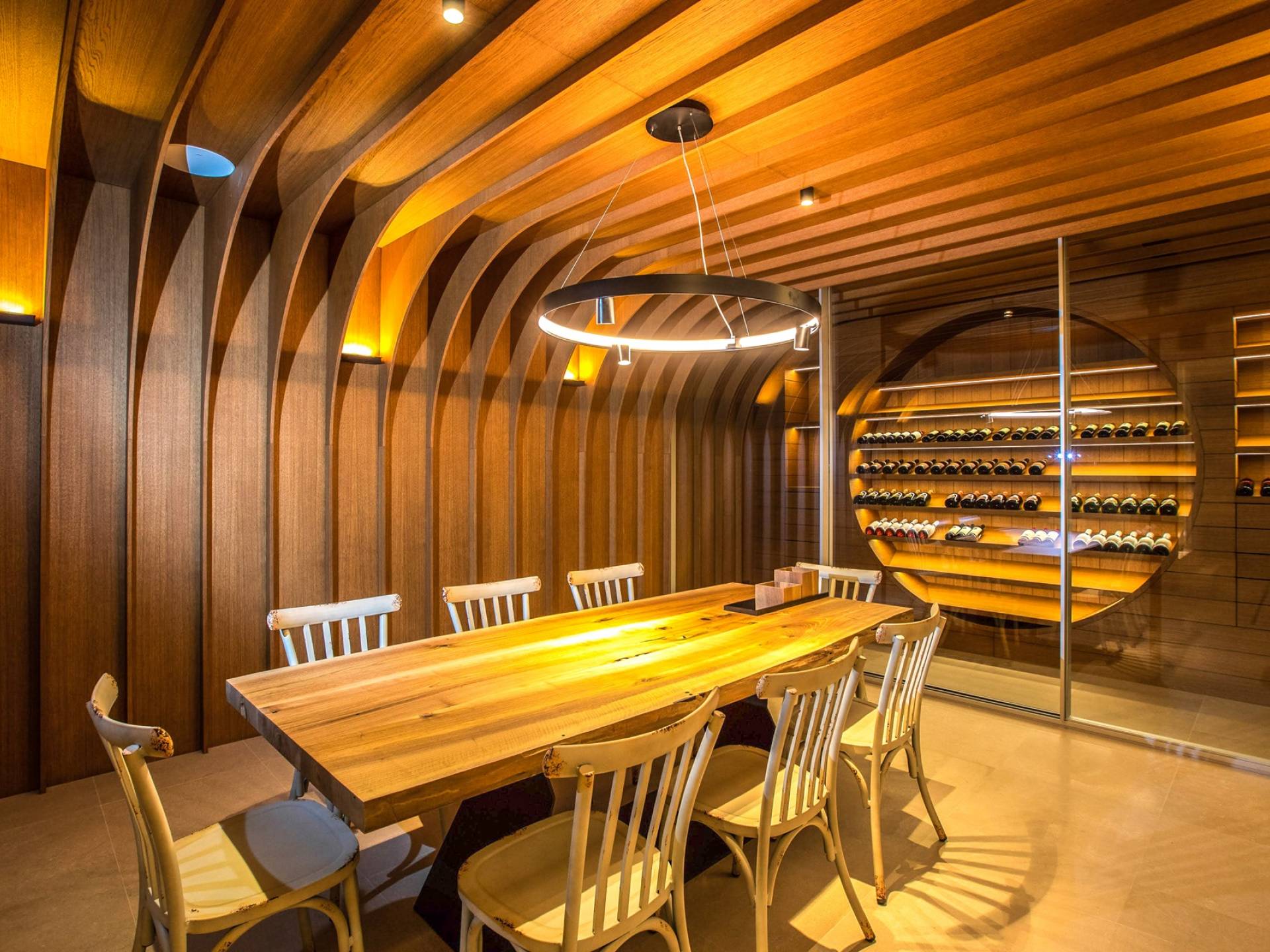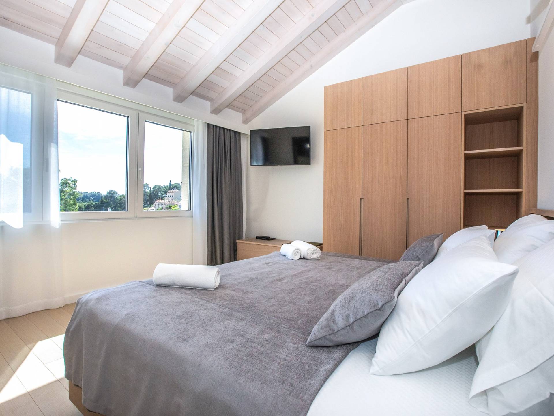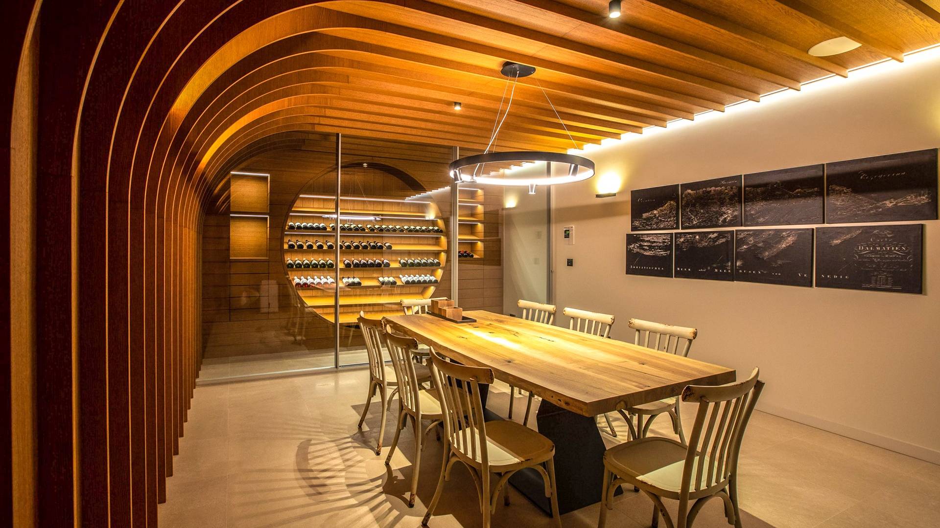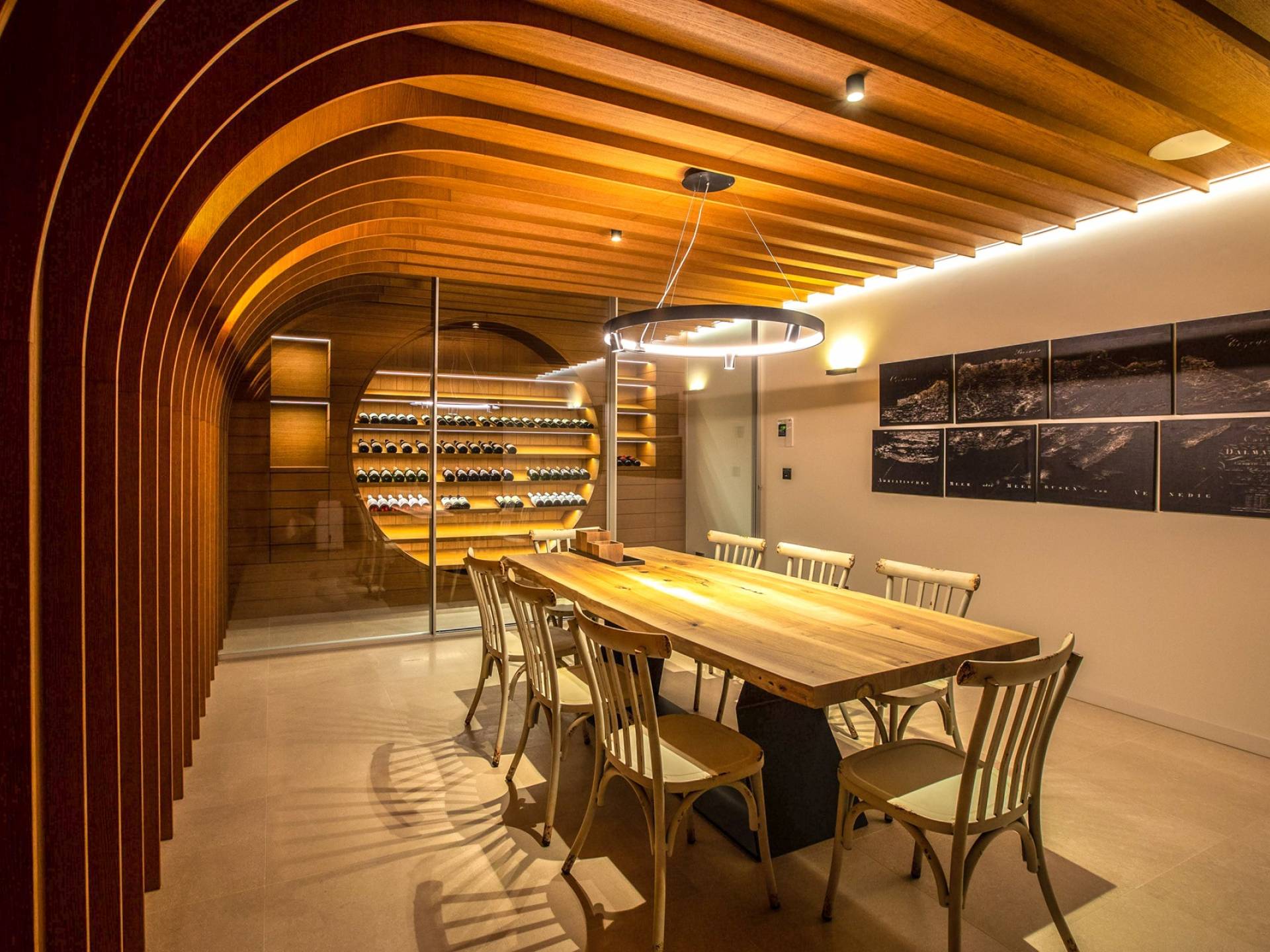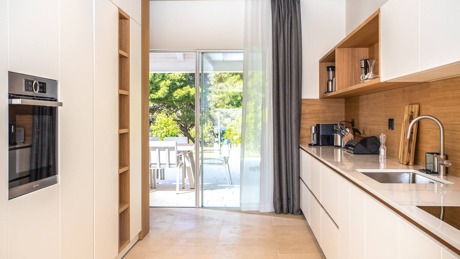 Le rez-de-chaussée de la luxueuse Villa Eos est séparé de la terrasse par une paroi vitrée coulissante qui laisse suffisamment de lumière du jour. Il se compose d'un salon design avec des canapés élégants et une télévision par satellite. Ensuite, le concept ouvert combine une cuisine moderne entièrement équipée avec un design minimaliste et une salle à manger charmante. Du rez-de-chaussée central - la première partie de l'étage, vous pouvez également emprunter les escaliers jusqu'au rez-de-chaussée inférieur de la villa où se trouve une cave à vin. Le rez-de-chaussée et le premier étage de la villa sont séparés du rez-de-chaussée par un escalier intérieur. Il y a 3 chambres avec des lits king-size et des salles de bain attenantes.
