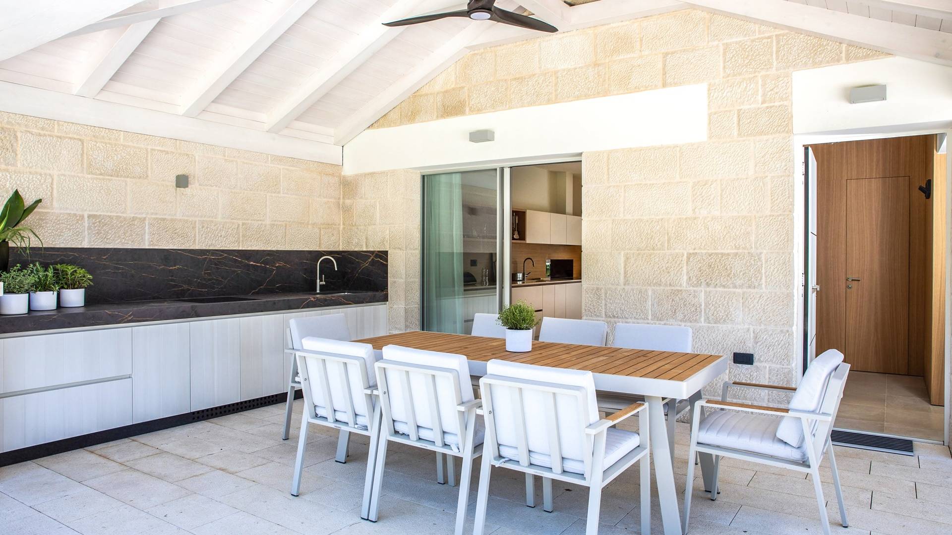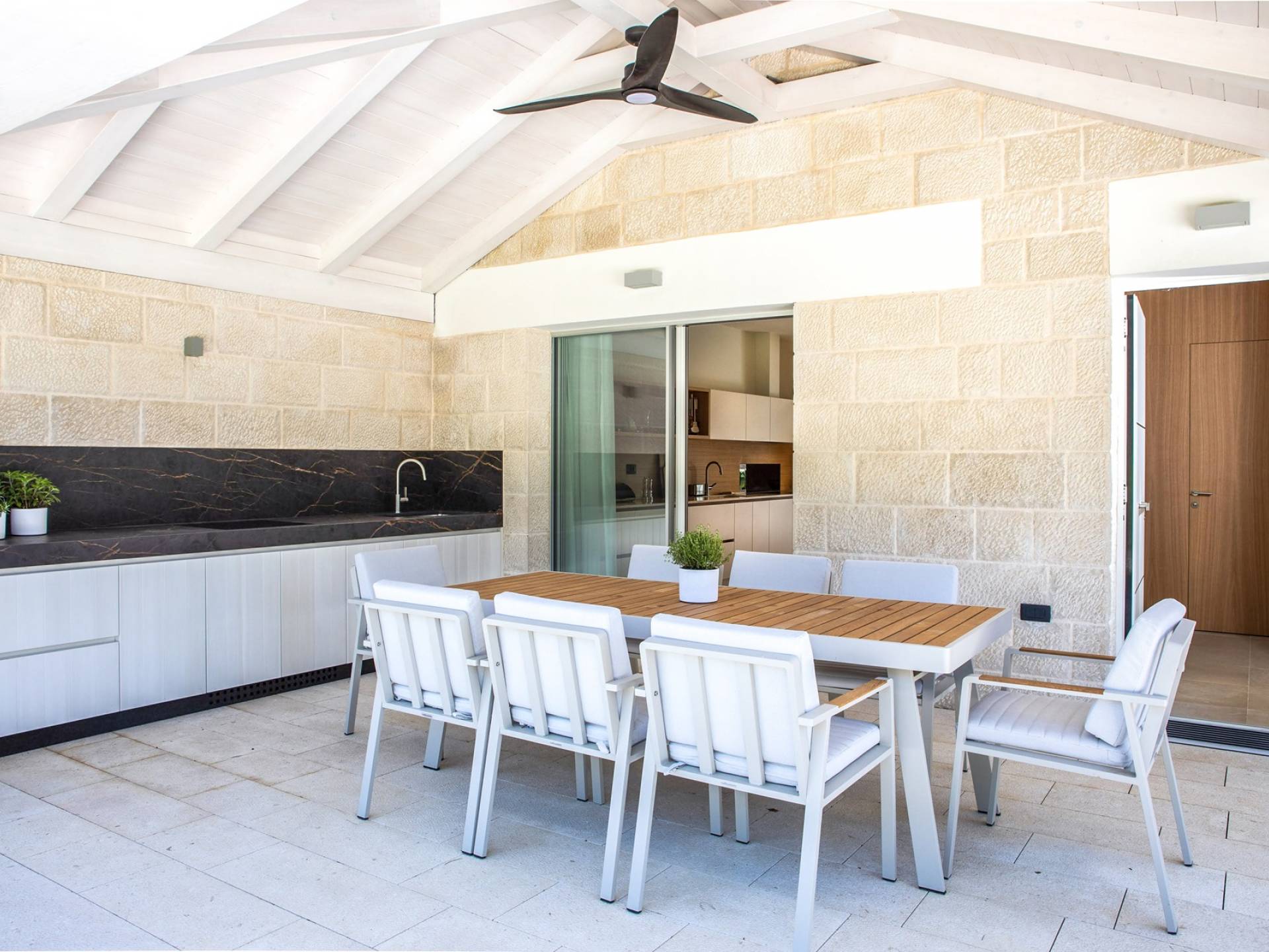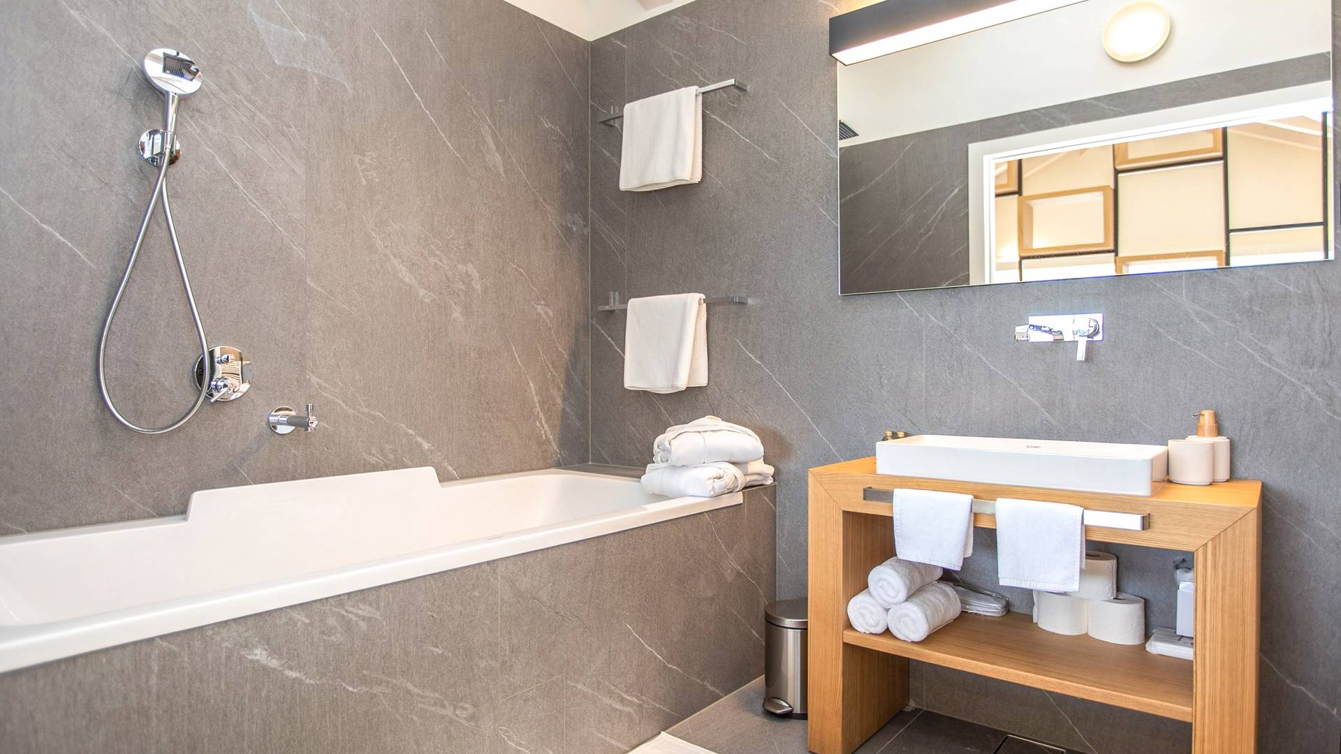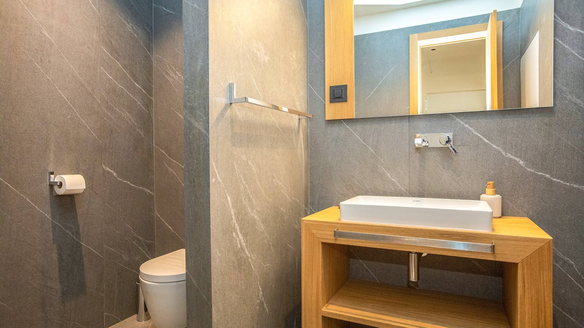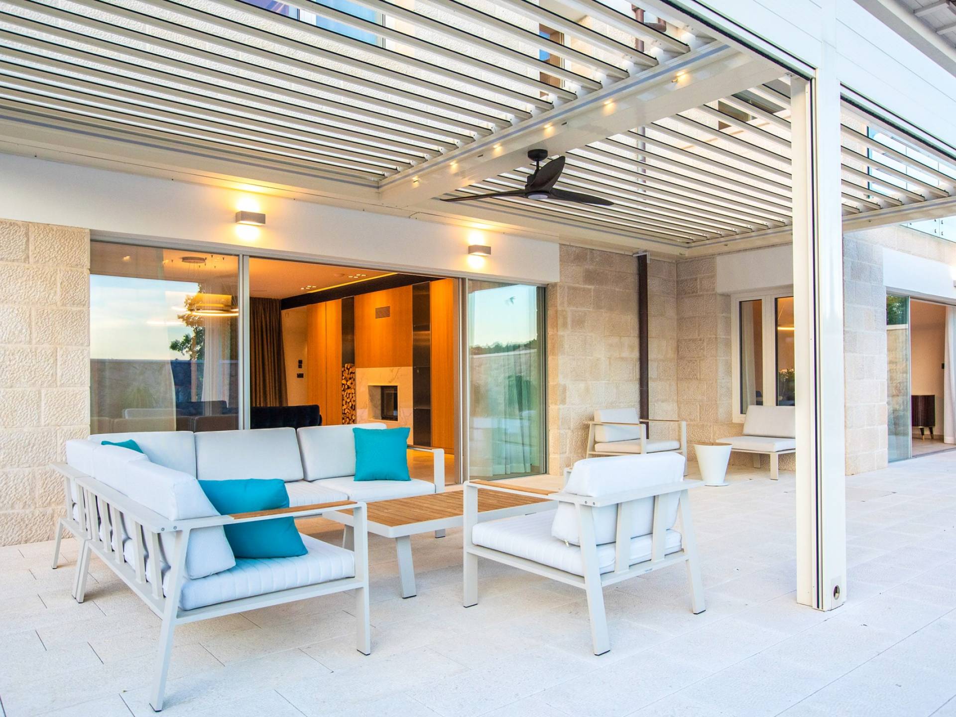 Le rez-de-chaussée de la luxueuse Villa Eos est séparé de la terrasse par une paroi vitrée coulissante qui laisse suffisamment de lumière du jour. Il se compose d'un salon design avec des canapés élégants et une télévision par satellite. Ensuite, le concept ouvert combine une cuisine moderne entièrement équipée avec un design minimaliste et une salle à manger charmante. Du rez-de-chaussée central - la première partie de l'étage, vous pouvez également emprunter les escaliers jusqu'au rez-de-chaussée inférieur de la villa où se trouve une cave à vin. Le rez-de-chaussée et le premier étage de la villa sont séparés du rez-de-chaussée par un escalier intérieur. Il y a 3 chambres avec des lits king-size et des salles de bain attenantes.