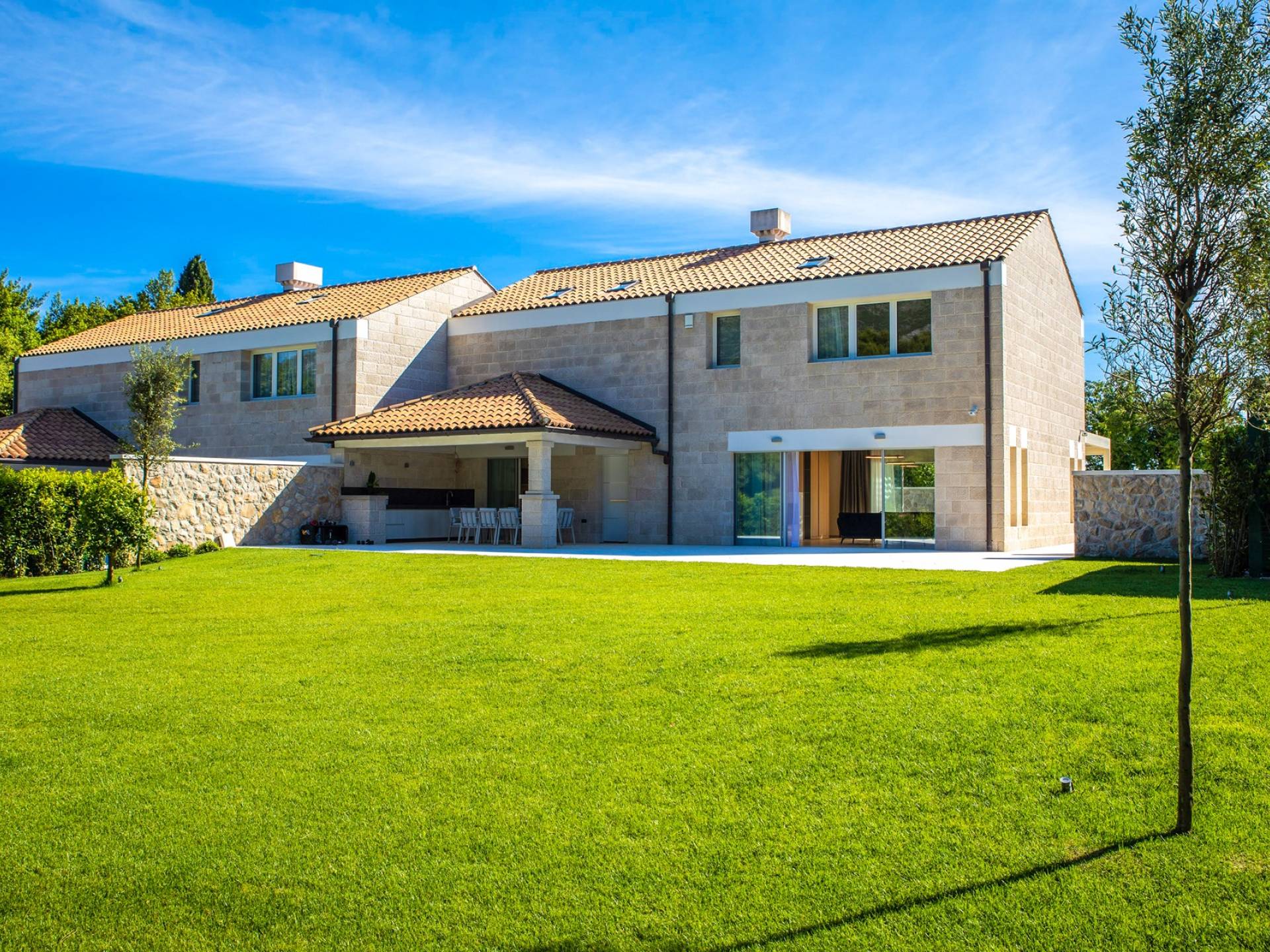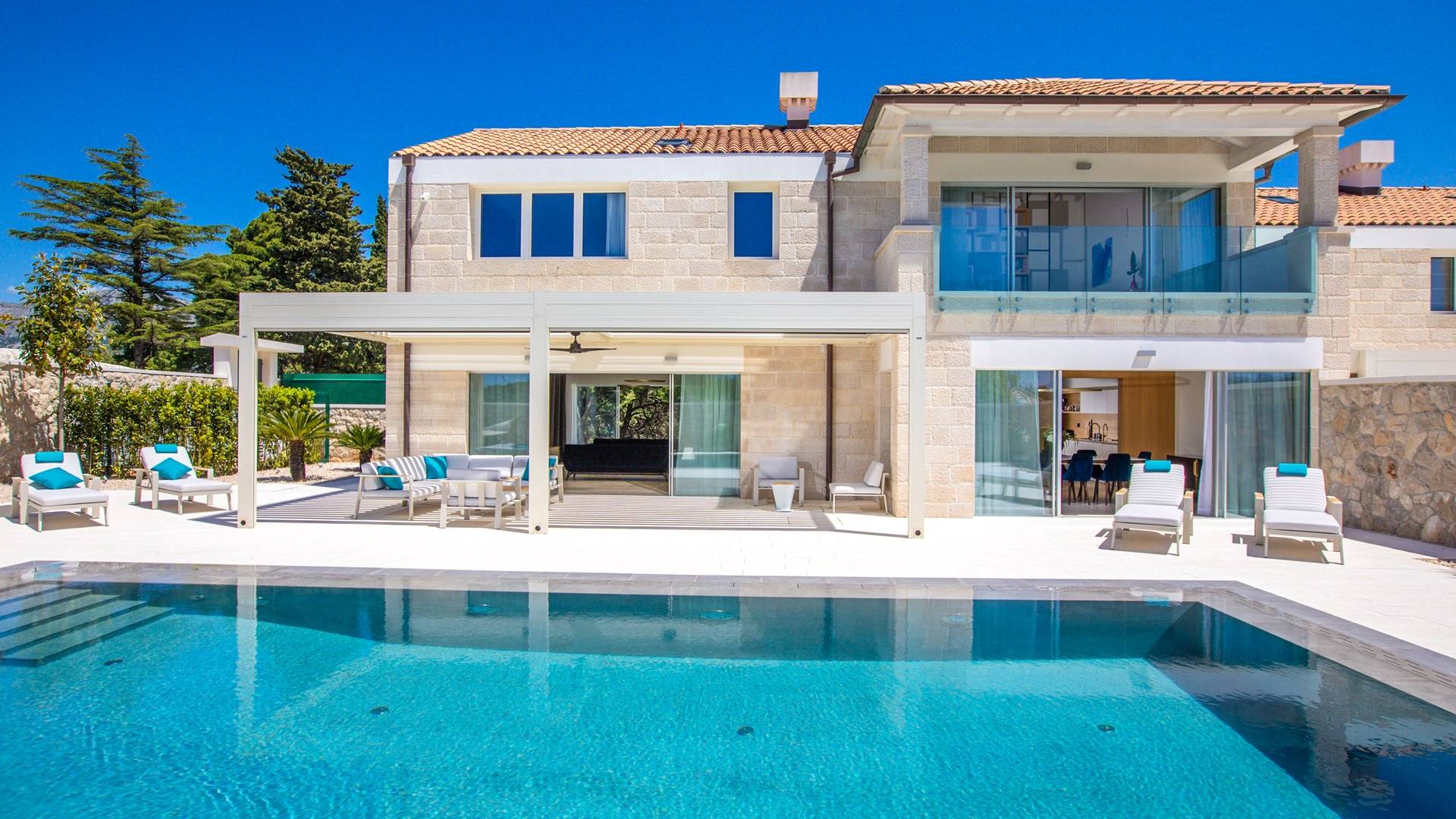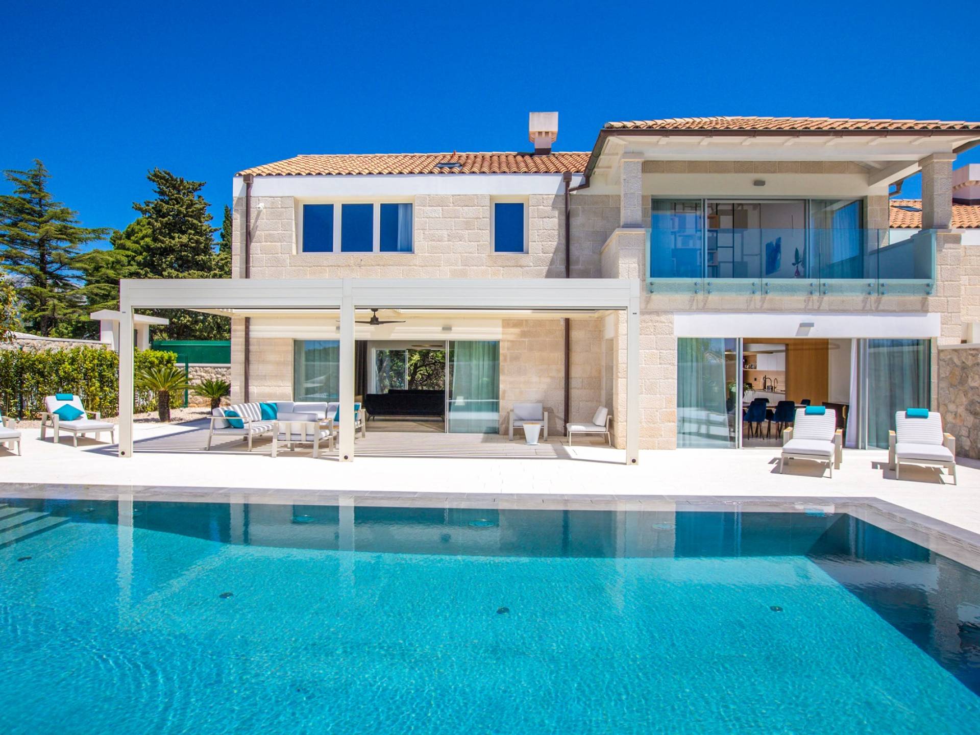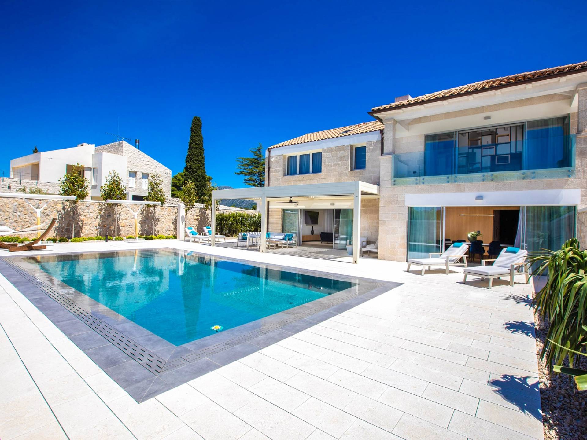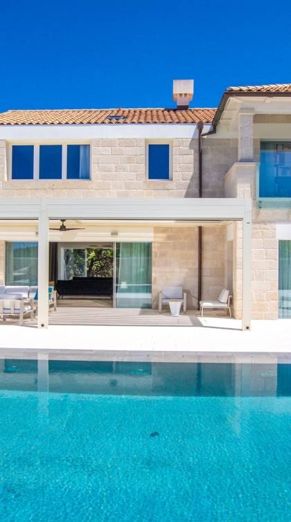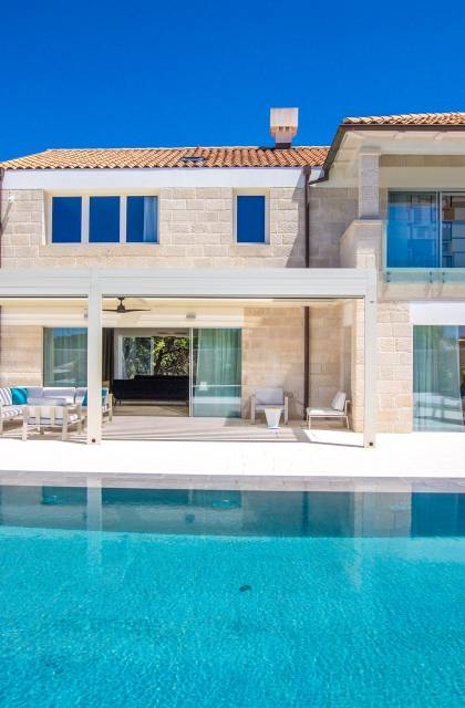 La Villa de luxe Eos inspire tout le monde avec sa combinaison de mer limpide, de bleu ciel et de belle nature méditerranéenne - l'endroit idéal pour une expérience unique. En arrivant dans la ville de conte de fées de Cavtat et à quelques minutes en voiture de la luxueuse Villa Eos, vous serez enchanté par les parfums enivrants des pins et la beauté de l'horizon marin. L'attention est attirée sur le jardin bien entretenu et la luxueuse piscine à débordement, qui est certainement au centre de l'attention de la terrasse extérieure. Il est entouré de chaises longues et d'un salon avec un canapé confortable qui vous permet de profiter des rayons du soleil méditerranéen l'après-midi. Il y a aussi une cuisine d'été couverte et équipée avec une table à manger et des chaises.