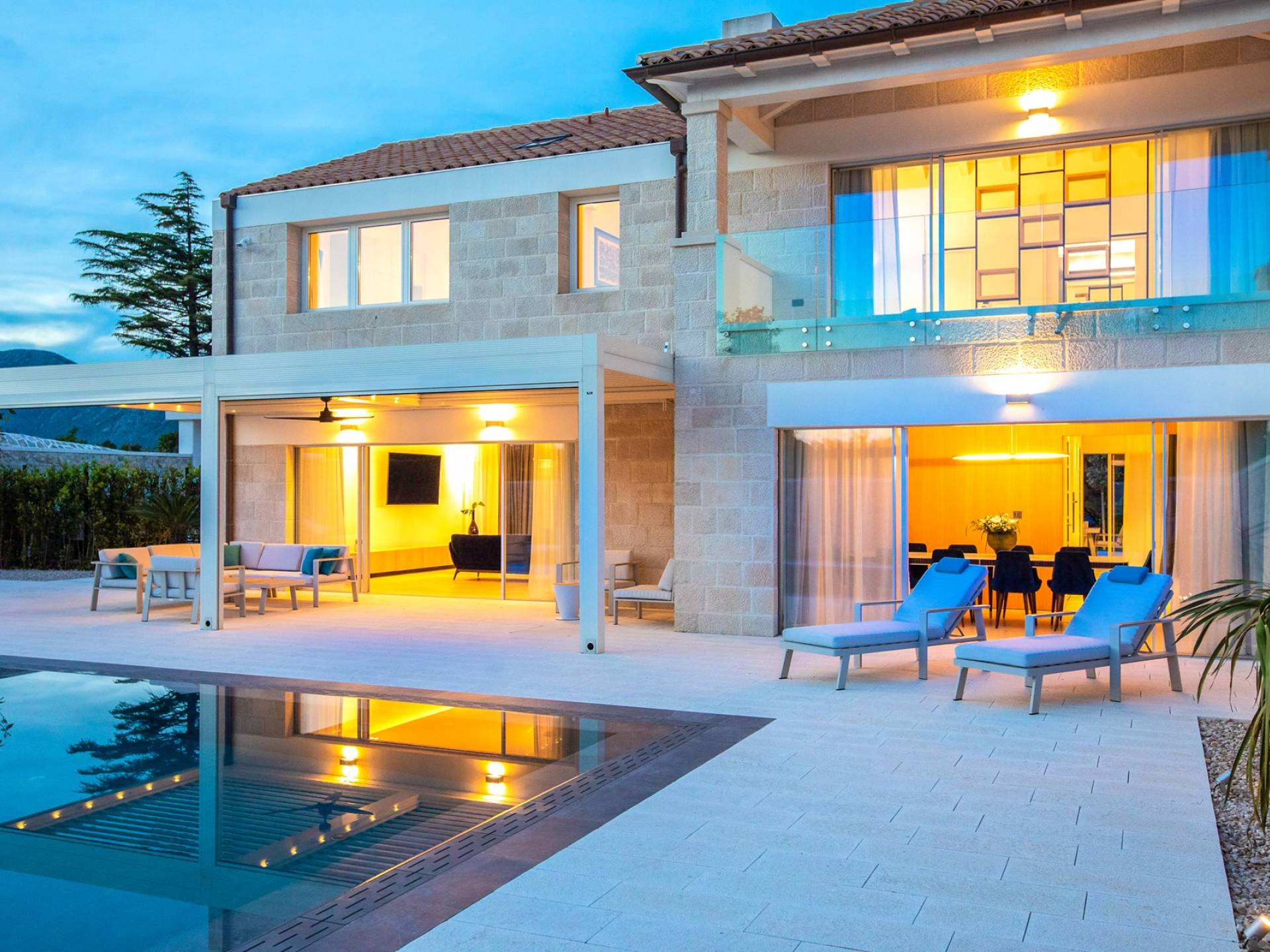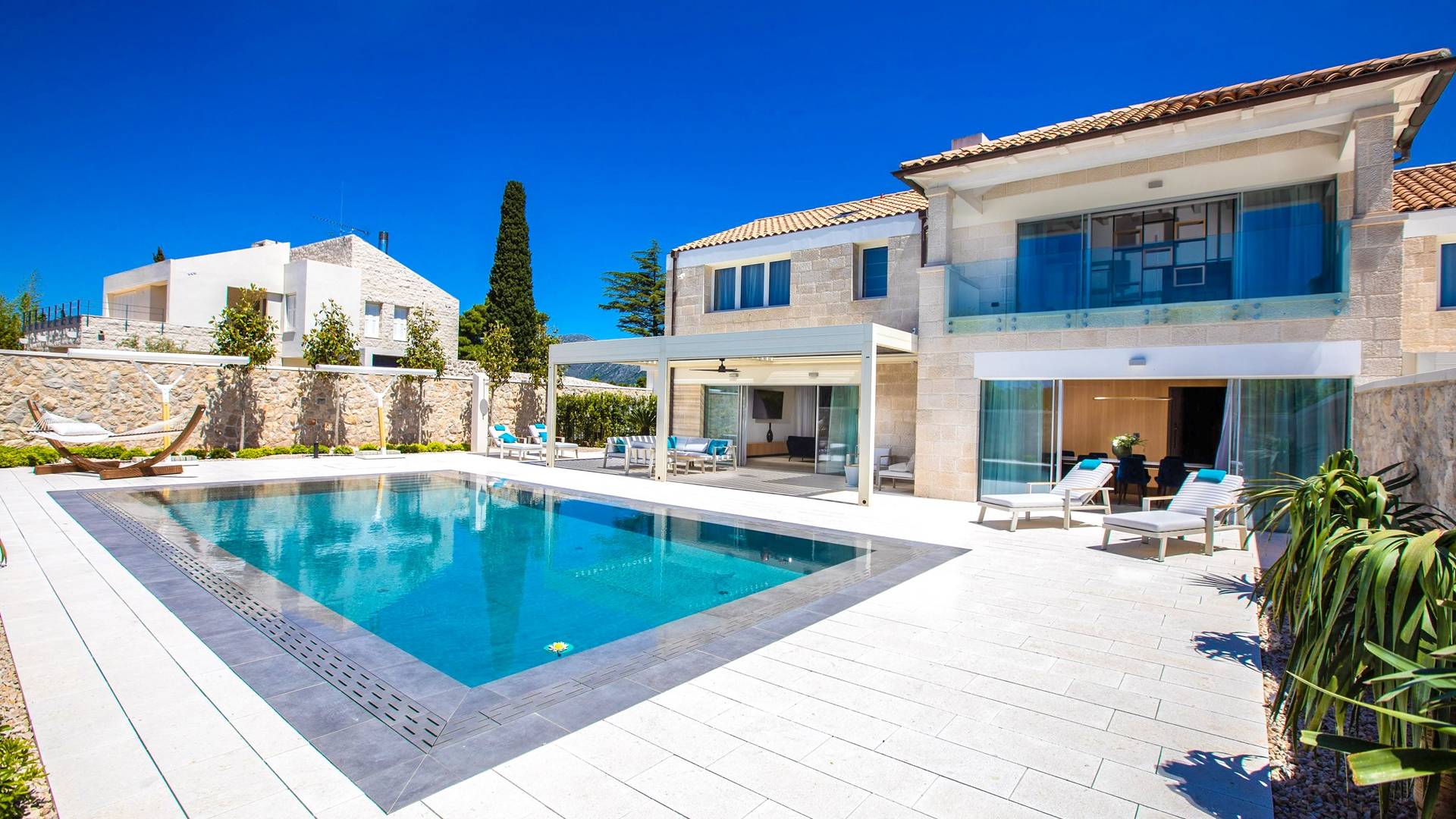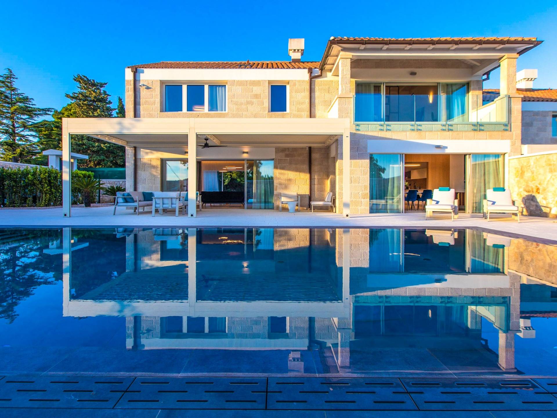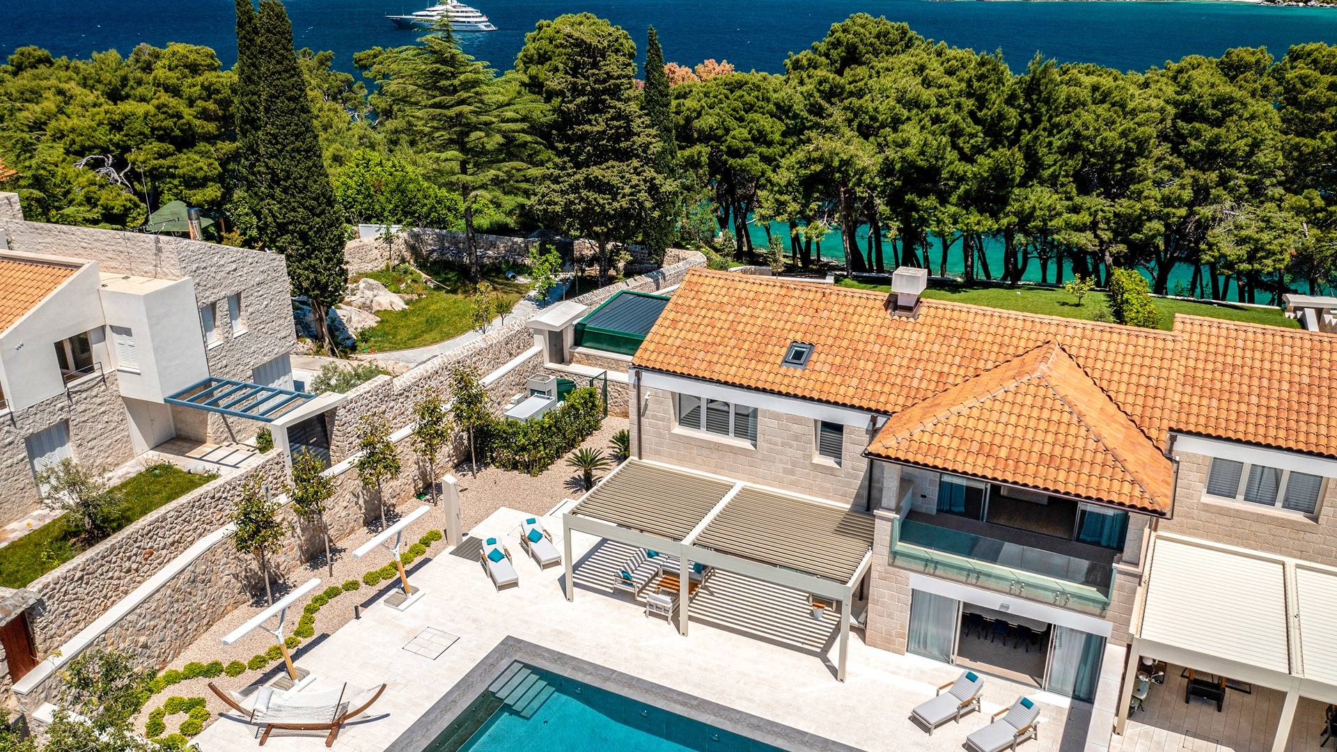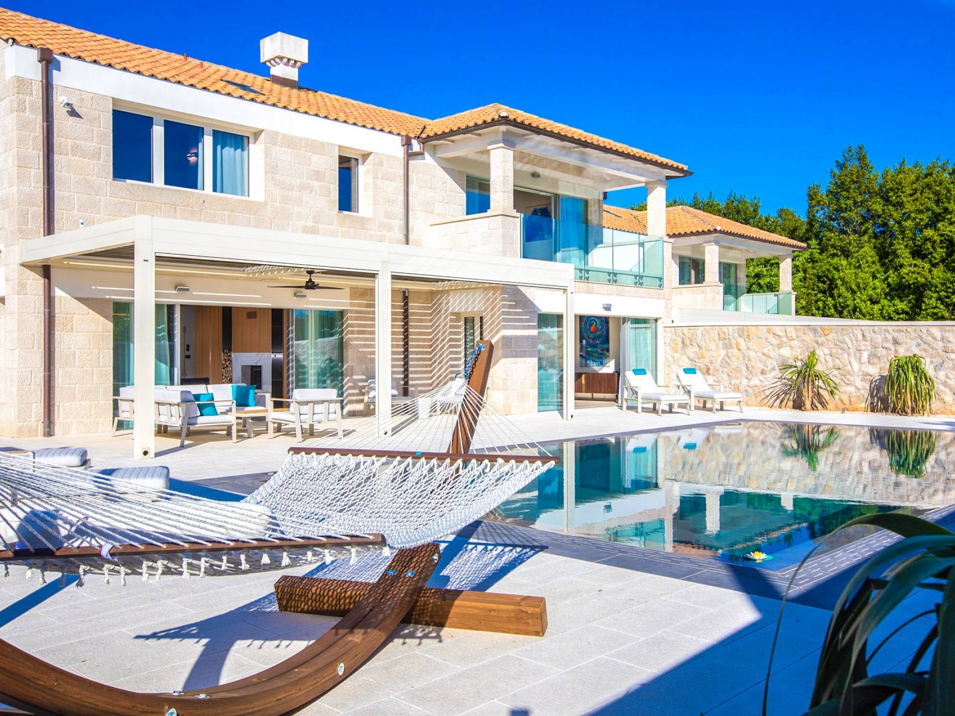 La Villa de luxe Eos inspire tout le monde avec sa combinaison de mer limpide, de bleu ciel et de belle nature méditerranéenne - l'endroit idéal pour une expérience unique. En arrivant dans la ville de conte de fées de Cavtat et à quelques minutes en voiture de la luxueuse Villa Eos, vous serez enchanté par les parfums enivrants des pins et la beauté de l'horizon marin. L'attention est attirée sur le jardin bien entretenu et la luxueuse piscine à débordement, qui est certainement au centre de l'attention de la terrasse extérieure. Il est entouré de chaises longues et d'un salon avec un canapé confortable qui vous permet de profiter des rayons du soleil méditerranéen l'après-midi. Il y a aussi une cuisine d'été couverte et équipée avec une table à manger et des chaises.