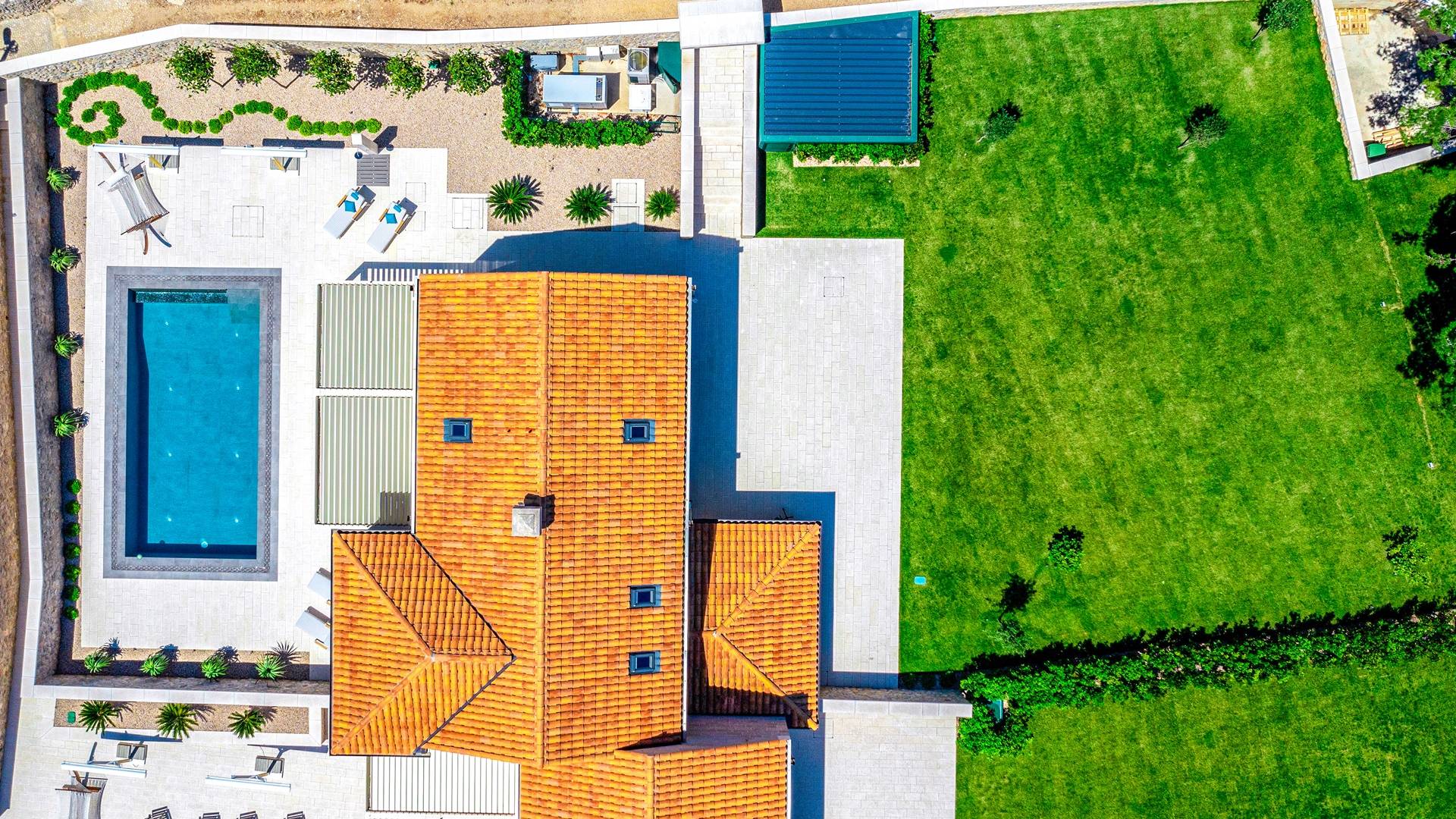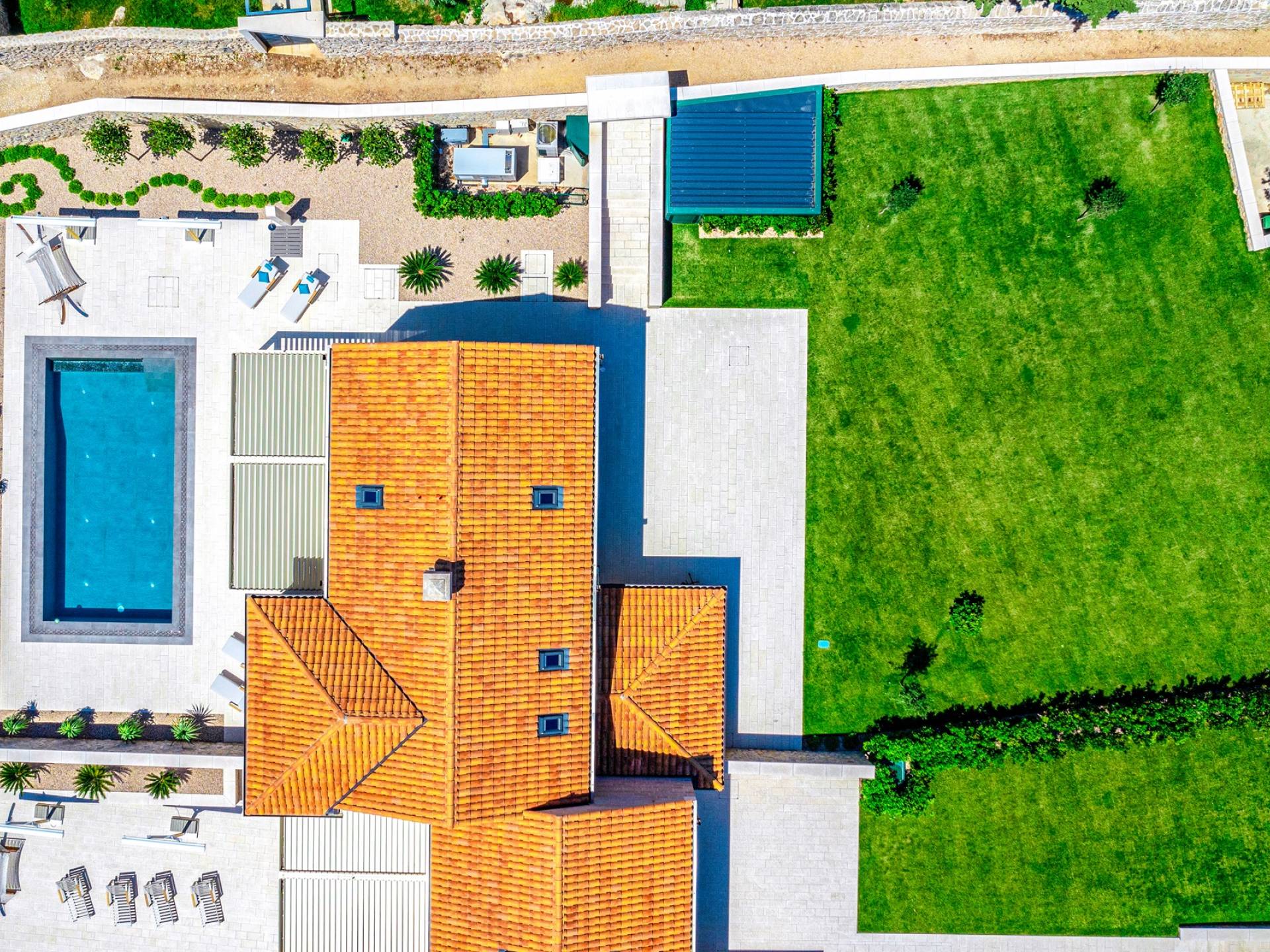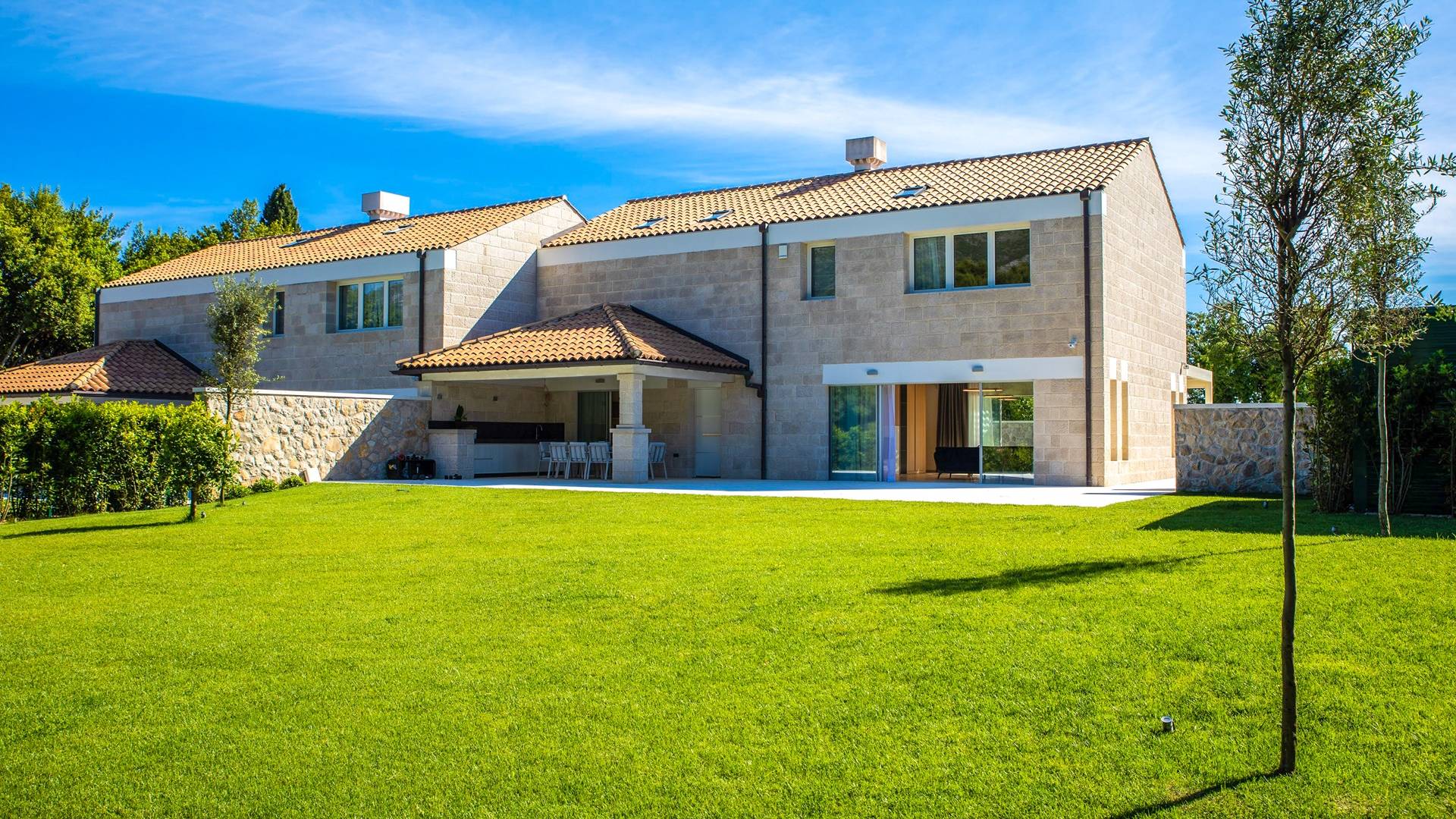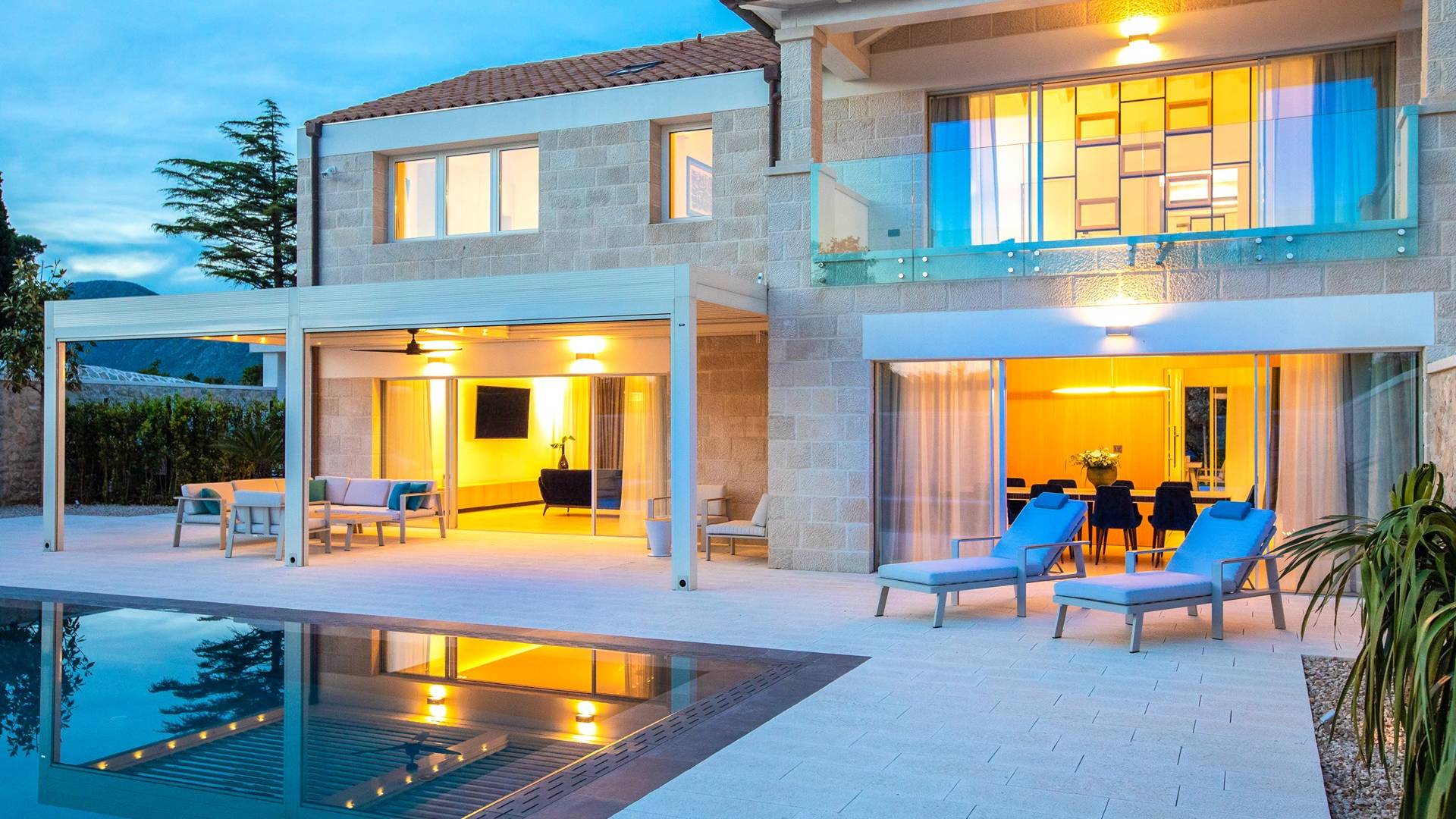 La Villa de luxe Eos inspire tout le monde avec sa combinaison de mer limpide, de bleu ciel et de belle nature méditerranéenne - l'endroit idéal pour une expérience unique. En arrivant dans la ville de conte de fées de Cavtat et à quelques minutes en voiture de la luxueuse Villa Eos, vous serez enchanté par les parfums enivrants des pins et la beauté de l'horizon marin. L'attention est attirée sur le jardin bien entretenu et la luxueuse piscine à débordement, qui est certainement au centre de l'attention de la terrasse extérieure. Il est entouré de chaises longues et d'un salon avec un canapé confortable qui vous permet de profiter des rayons du soleil méditerranéen l'après-midi. Il y a aussi une cuisine d'été couverte et équipée avec une table à manger et des chaises.