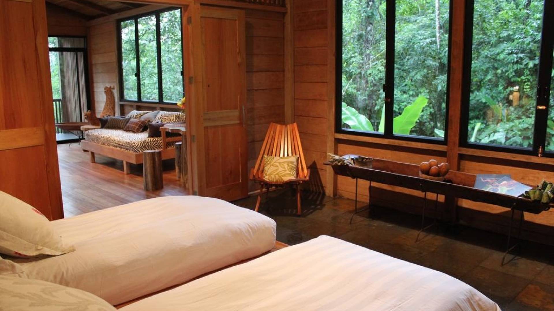Le décor est inspiré des cultures des communautés locales ; les gens de ces communautés ont contribué à la construction de la Loge et y travaillent toujours. mais Sébastien et Ambre, les propriétaires, ne se sont pas arrêtés là, ils se sont vraiment impliqués dans des programmes de développement pour promouvoir et revitaliser ces cultures à travers le tourisme : faire découvrir et comprendre les plantes médicinales Kichwa, organiser des visites dans la forêt tropicale avec des guides autochtones... Ils vous feront voir ce lien qui lie les peuples des communautés indigènes à leur environnement ainsi qu'à leur mode de vie, en parfaite harmonie avec la Nature. Parfait pour les parents voyageant avec des enfants, ou pour un groupe d'amis, privilégiez un hébergement privé et cohésif. Divisé en 2 étages avec 3 chambres, 2 salles de bains, un salon et une terrasse.