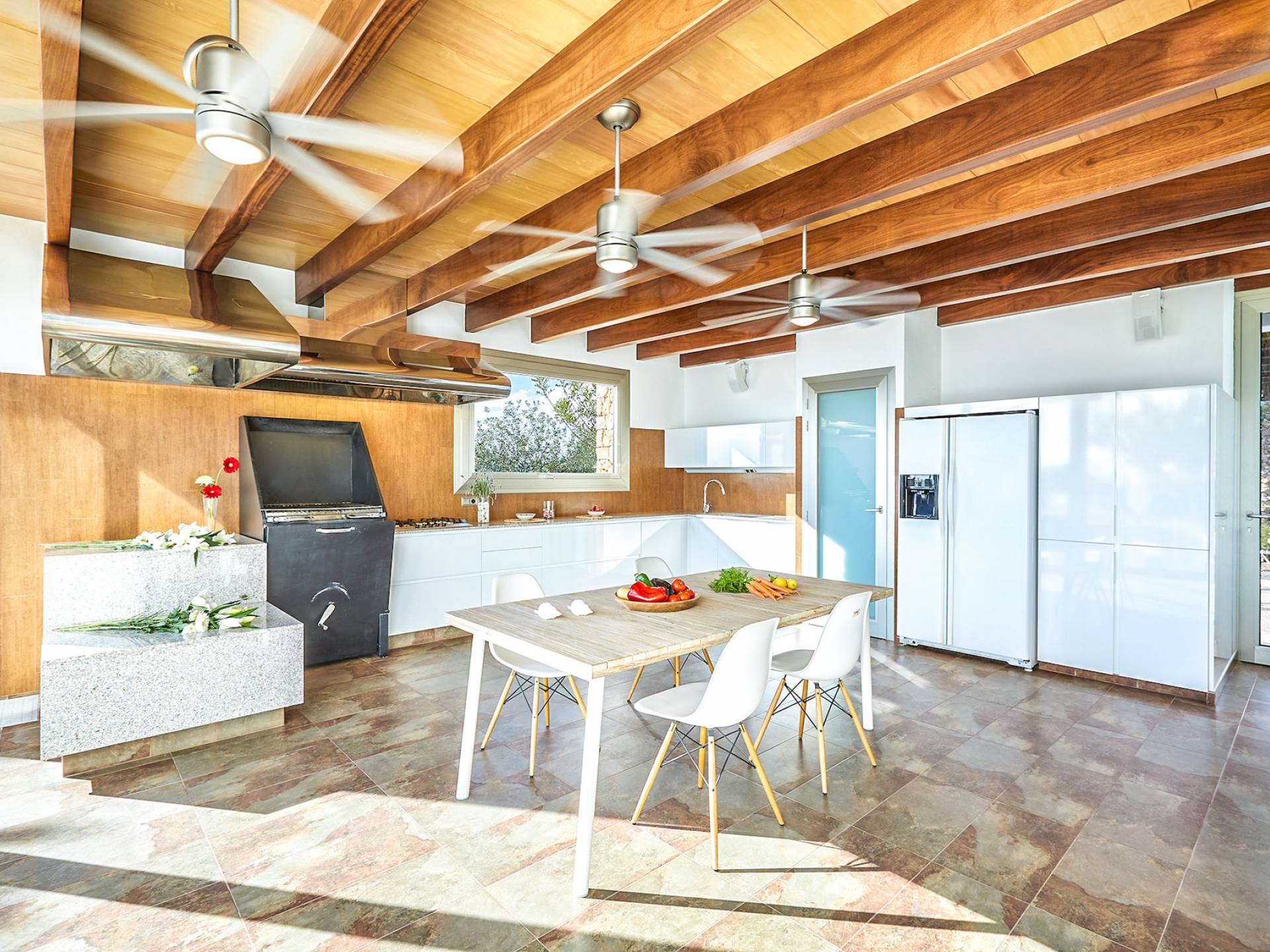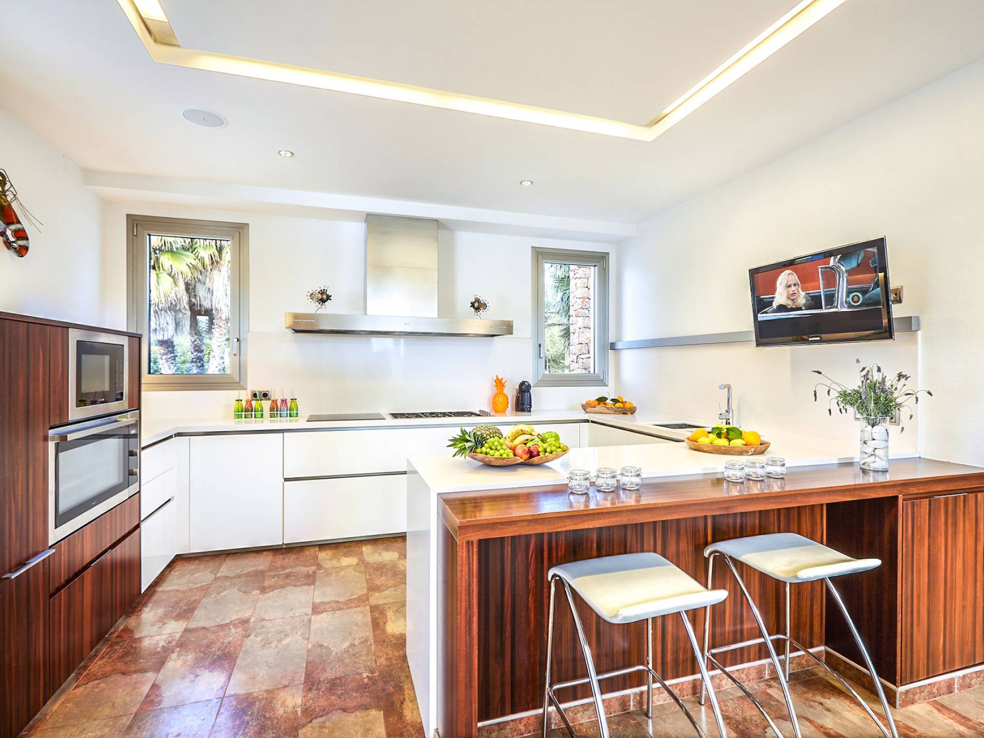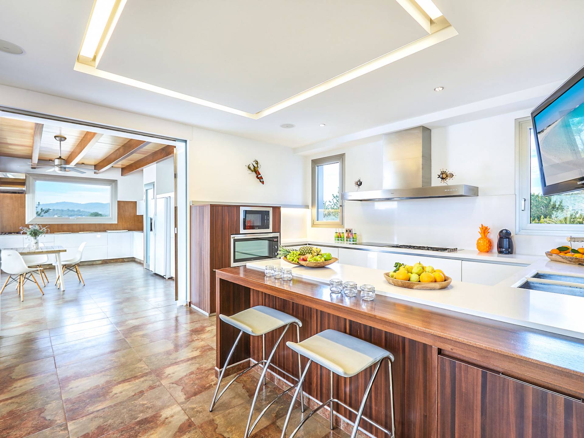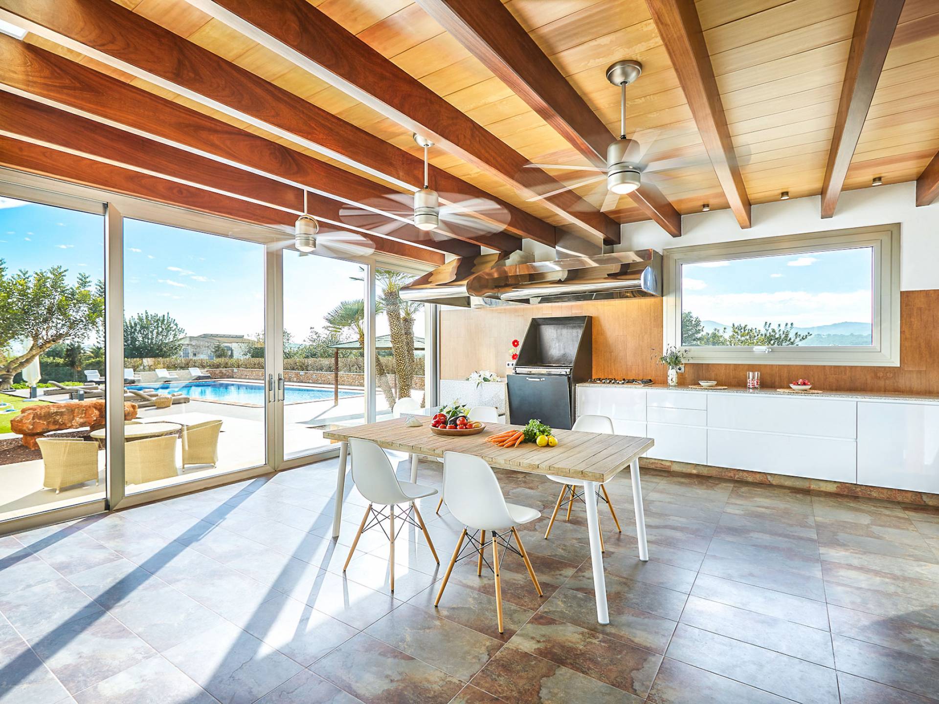 Les espaces de vie de la Villa Can Mia sont lumineux, décloisonnés et magnifiquement conçus. Le coin salon dispose de canapés confortables, ainsi que d'une grande télévision à écran plasma et d'une cheminée. La cheminée sépare le salon de la salle à manger attenante, qui contient une grande table avec une vue fantastique sur le jardin et la piscine. La cuisine design contient tout le matériel de cuisson nécessaire pour les plats préparés, comme un four vitrocéramique, une plaque de cuisson, un évier double, un four micro-ondes, un lave-vaisselle et des petits appareils de cuisine, comme un grille-pain et une machine à café. La Villa Can Mia dispose également d'un bar moderne de style petit-déjeuner et d'une table avec quatre chaises pour vous permettre de profiter de votre déjeuner sans avoir à quitter la cuisine. La buanderie est entièrement équipée avec des appareils de lavage et de séchage et il y a une salle de bain complète pour les invités au rez-de-chaussée.