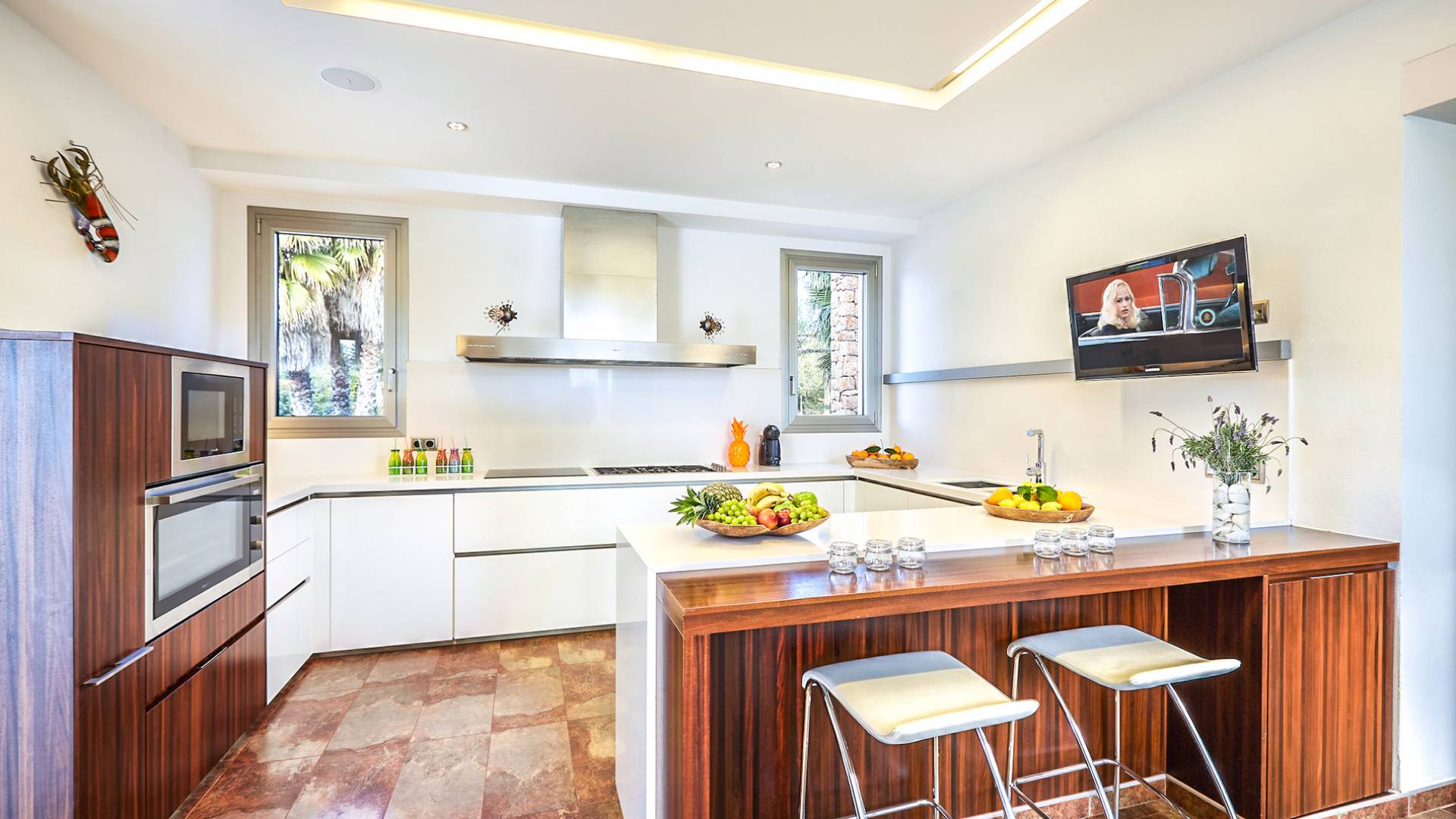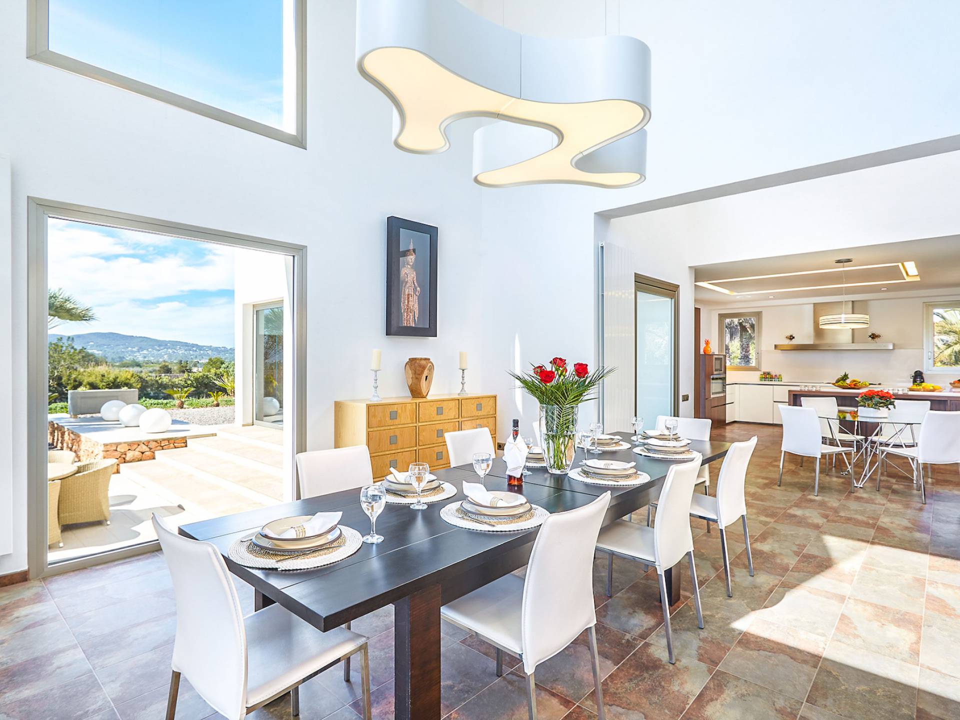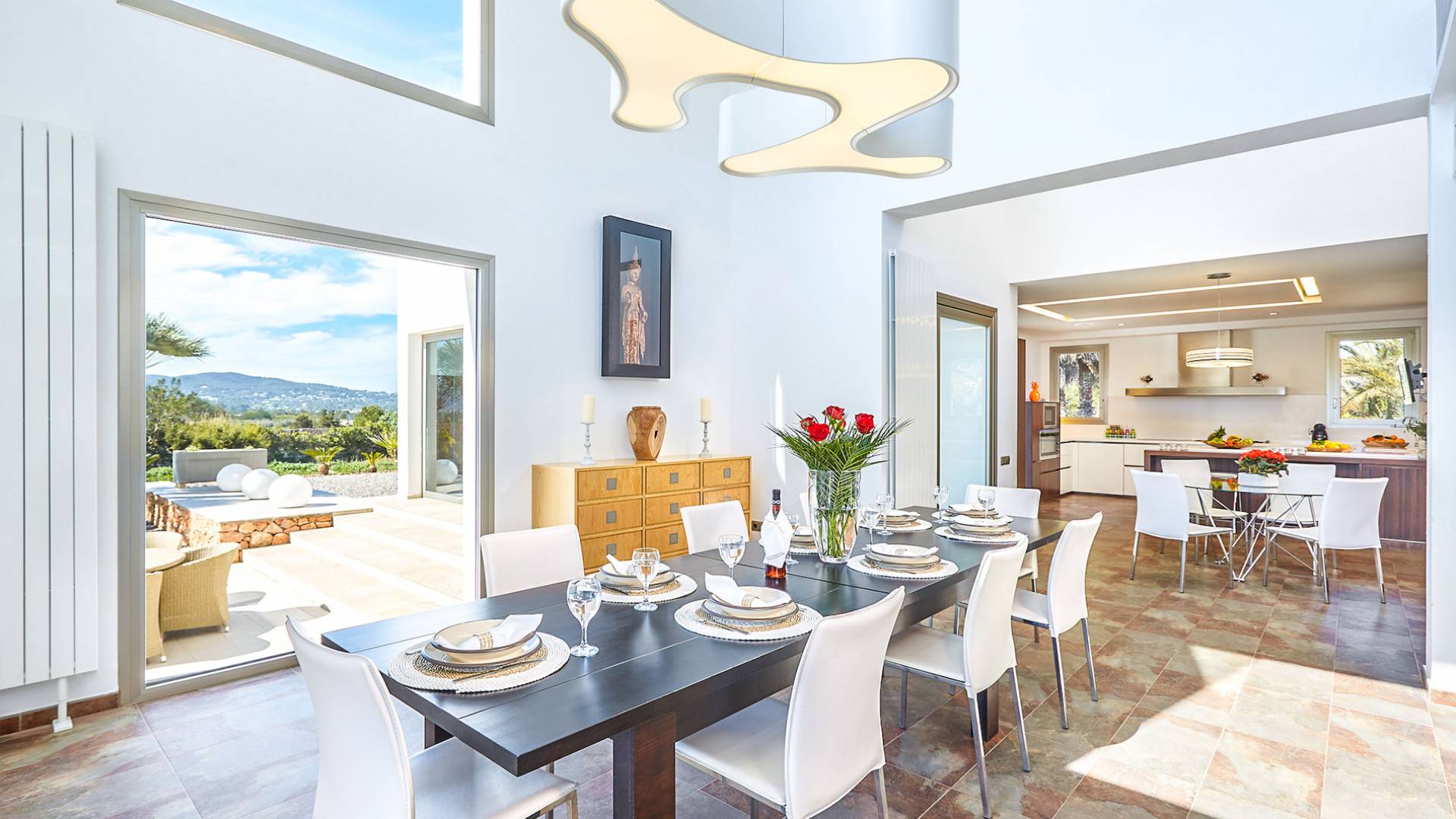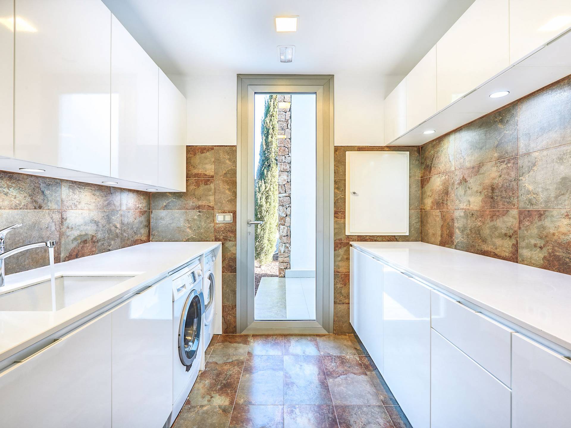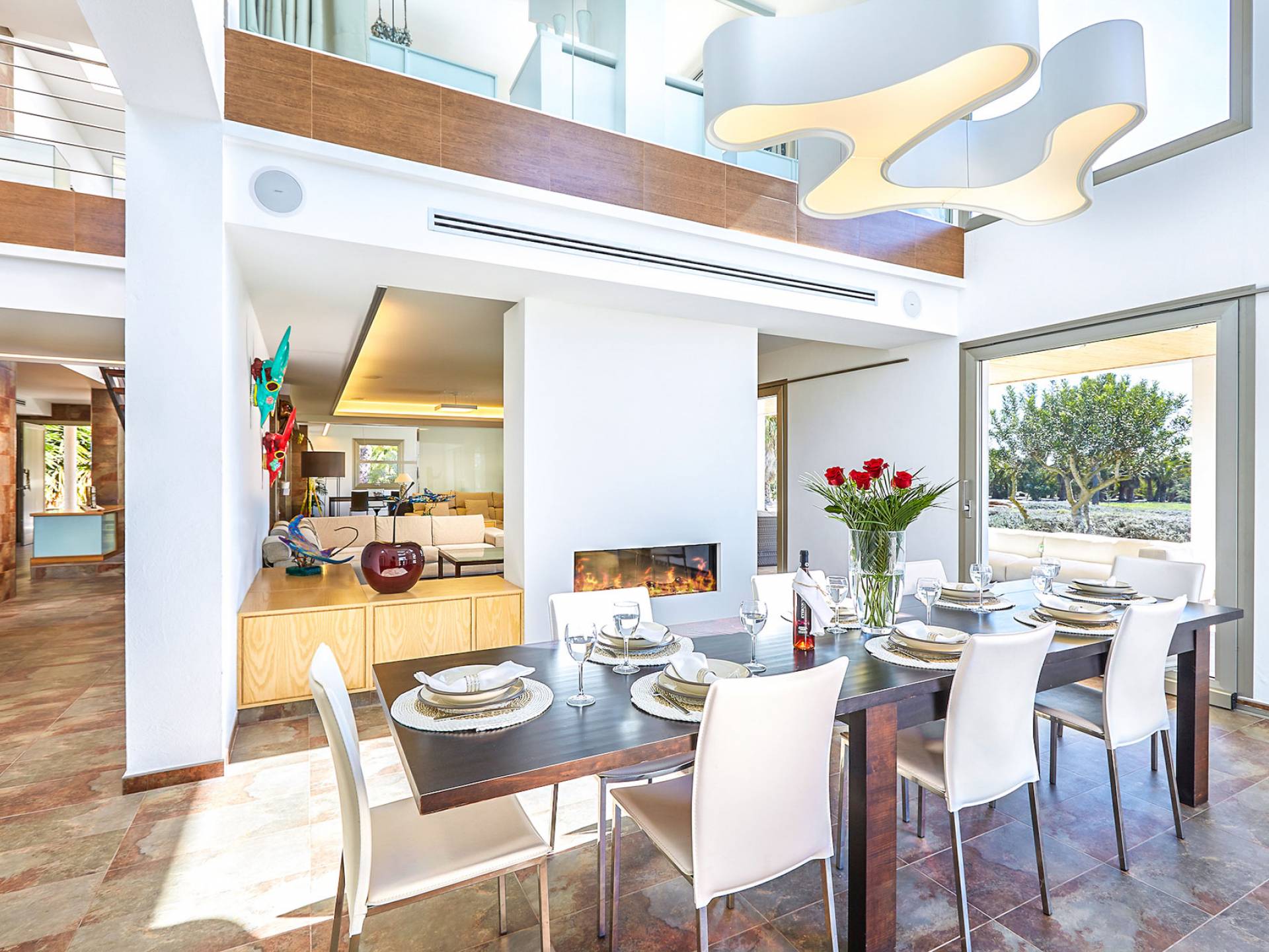 Les espaces de vie de la Villa Can Mia sont lumineux, décloisonnés et magnifiquement conçus. Le coin salon dispose de canapés confortables, ainsi que d'une grande télévision à écran plasma et d'une cheminée. La cheminée sépare le salon de la salle à manger attenante, qui contient une grande table avec une vue fantastique sur le jardin et la piscine. La cuisine design contient tout le matériel de cuisson nécessaire pour les plats préparés, comme un four vitrocéramique, une plaque de cuisson, un évier double, un four micro-ondes, un lave-vaisselle et des petits appareils de cuisine, comme un grille-pain et une machine à café. La Villa Can Mia dispose également d'un bar moderne de style petit-déjeuner et d'une table avec quatre chaises pour vous permettre de profiter de votre déjeuner sans avoir à quitter la cuisine. La buanderie est entièrement équipée avec des appareils de lavage et de séchage et il y a une salle de bain complète pour les invités au rez-de-chaussée.