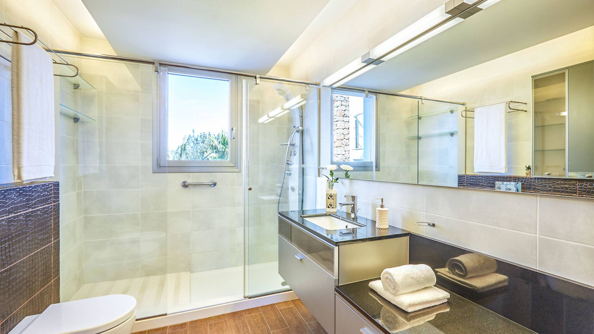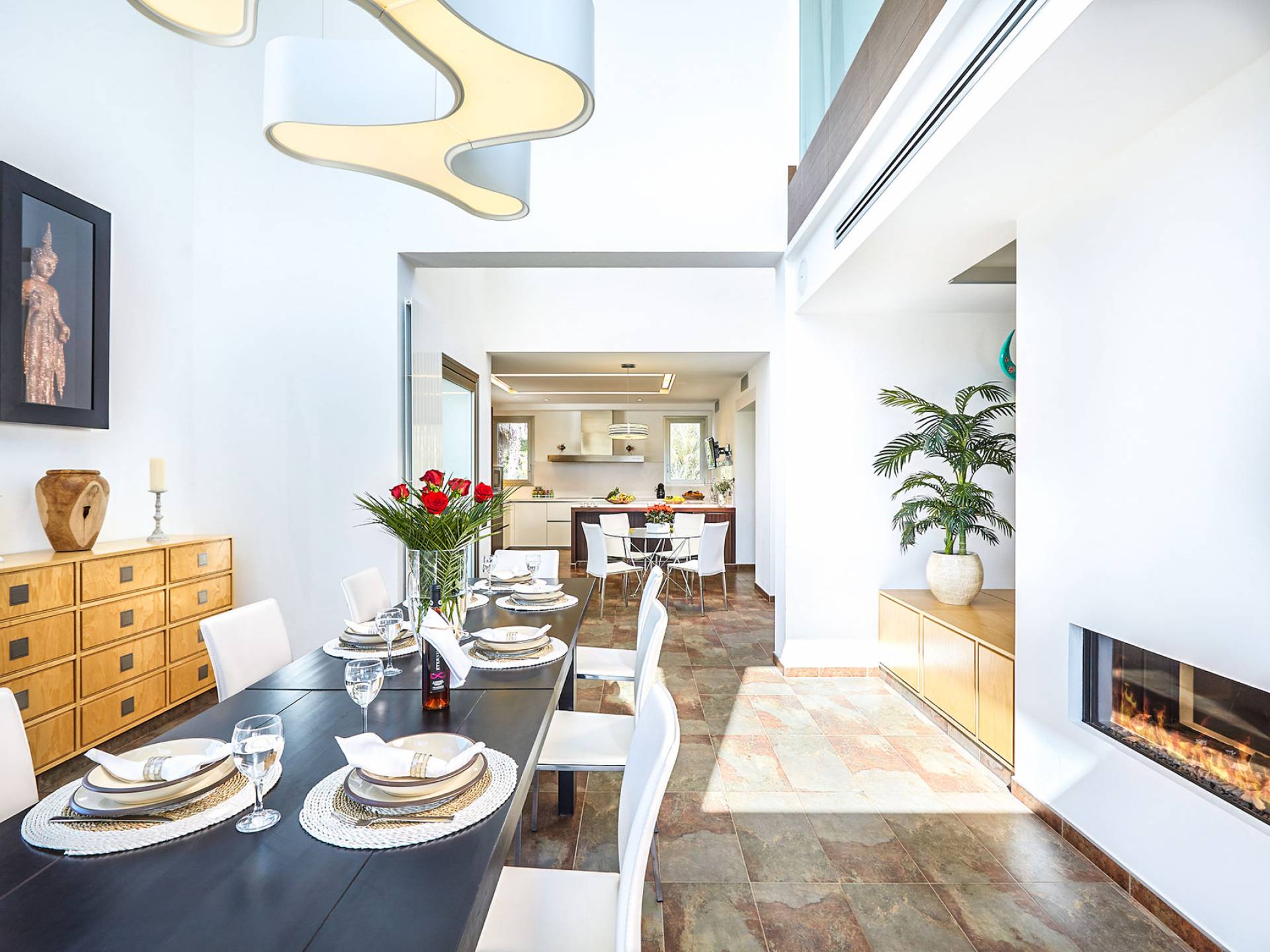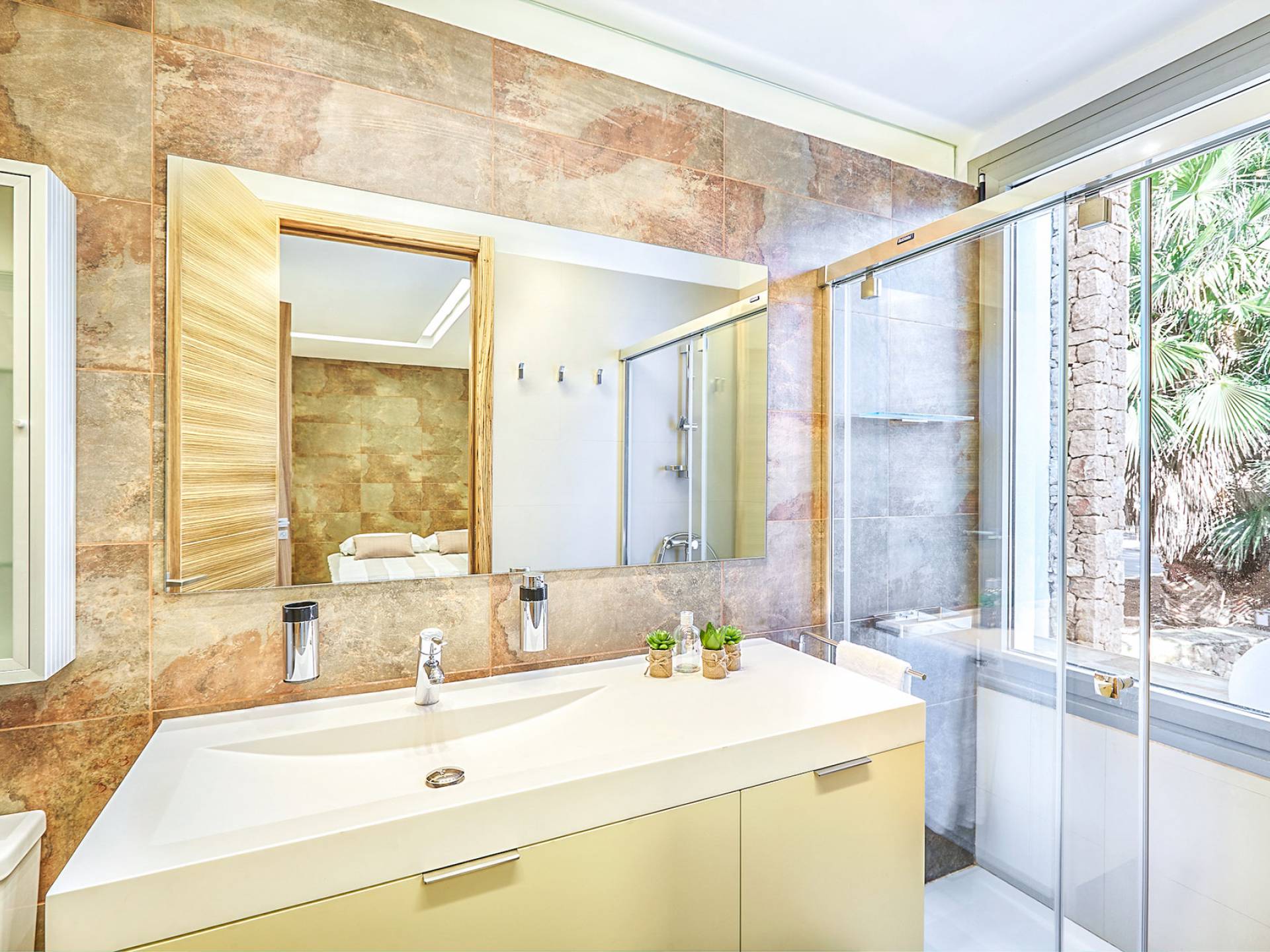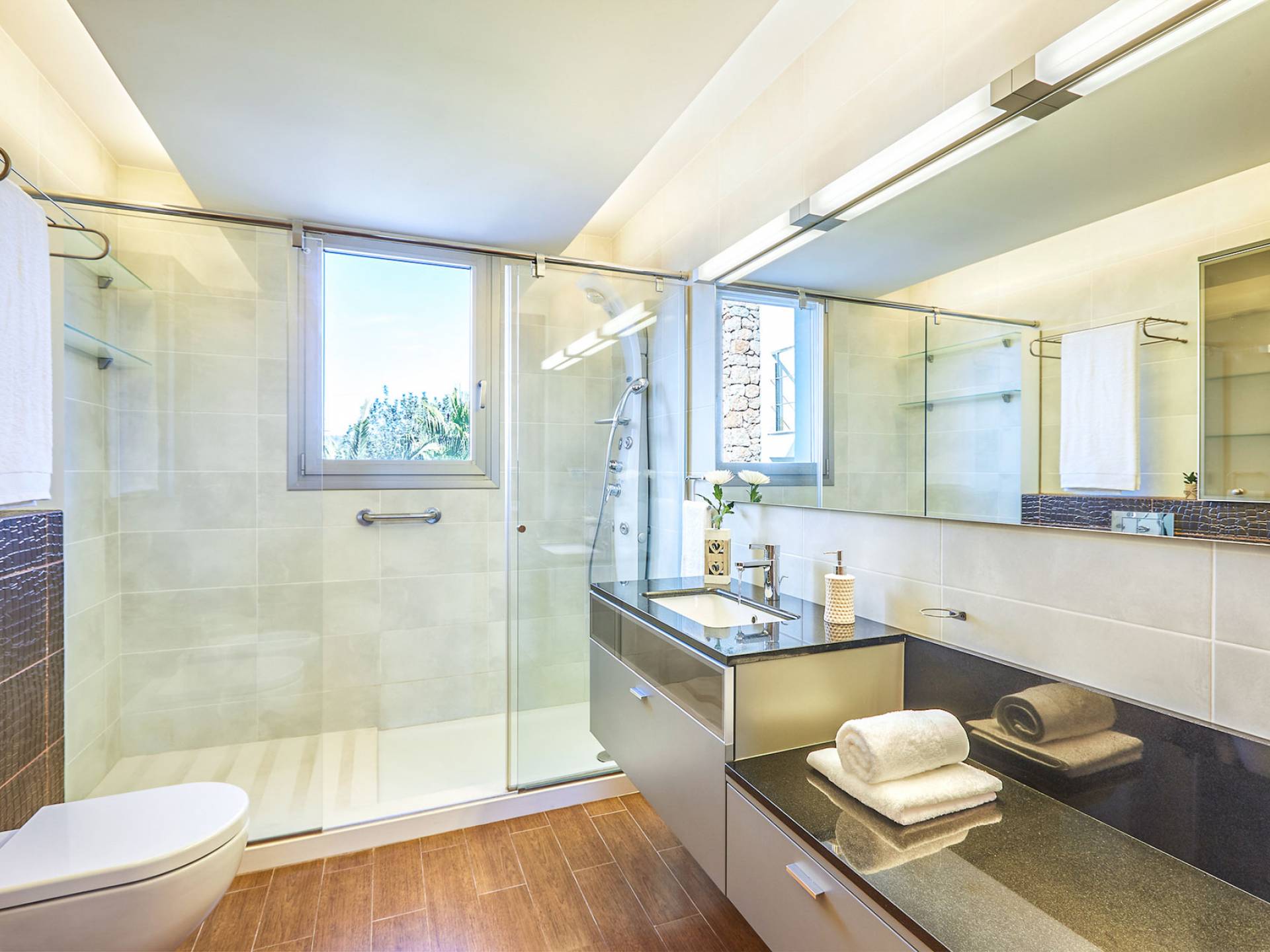 Les espaces de vie de la Villa Can Mia sont lumineux, décloisonnés et magnifiquement conçus. Le coin salon dispose de canapés confortables, ainsi que d'une grande télévision à écran plasma et d'une cheminée. La cheminée sépare le salon de la salle à manger attenante, qui contient une grande table avec une vue fantastique sur le jardin et la piscine. La cuisine design contient tout le matériel de cuisson nécessaire pour les plats préparés, comme un four vitrocéramique, une plaque de cuisson, un évier double, un four micro-ondes, un lave-vaisselle et des petits appareils de cuisine, comme un grille-pain et une machine à café. La Villa Can Mia dispose également d'un bar moderne de style petit-déjeuner et d'une table avec quatre chaises pour vous permettre de profiter de votre déjeuner sans avoir à quitter la cuisine. La buanderie est entièrement équipée avec des appareils de lavage et de séchage et il y a une salle de bain complète pour les invités au rez-de-chaussée.