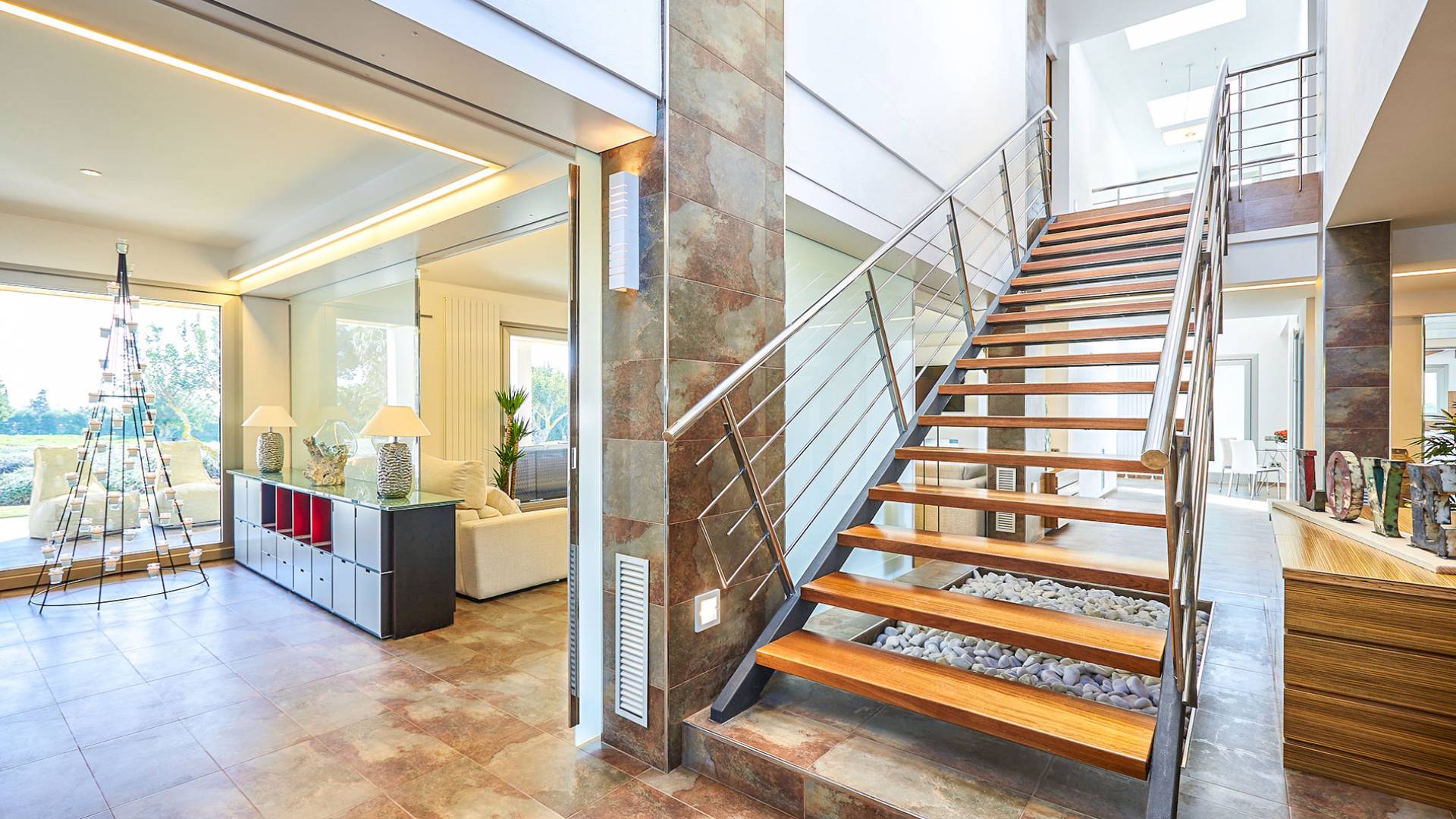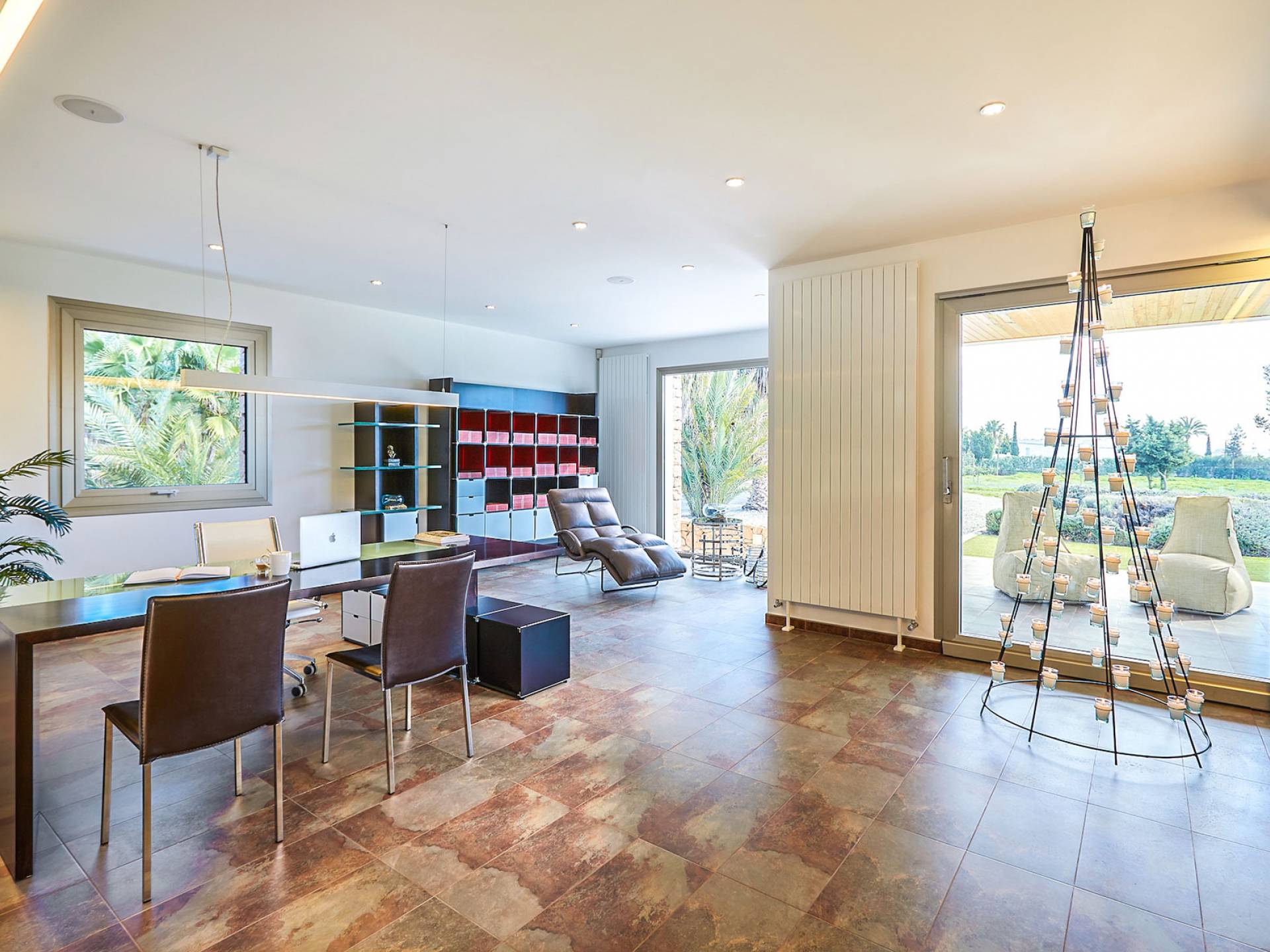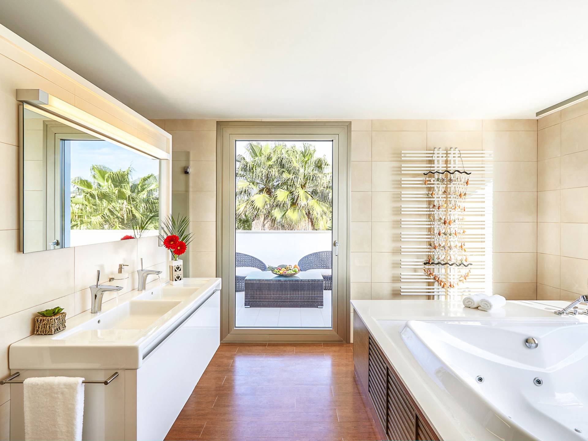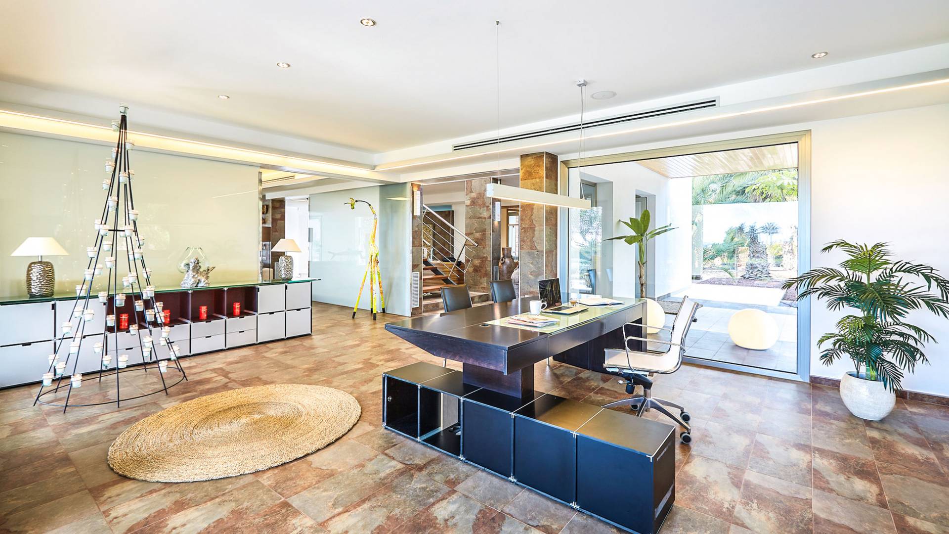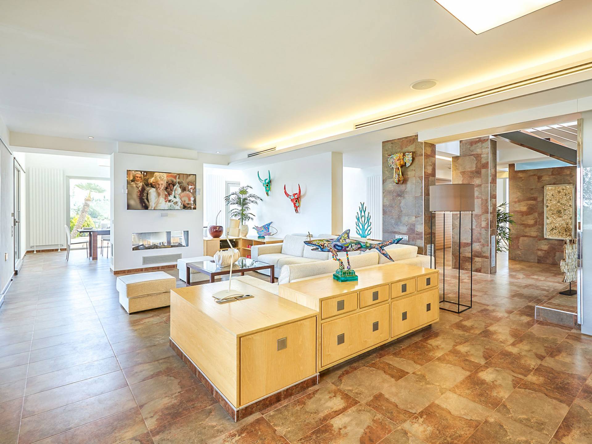 Les espaces de vie de la Villa Can Mia sont lumineux, décloisonnés et magnifiquement conçus. Le coin salon dispose de canapés confortables, ainsi que d'une grande télévision à écran plasma et d'une cheminée. La cheminée sépare le salon de la salle à manger attenante, qui contient une grande table avec une vue fantastique sur le jardin et la piscine. La cuisine design contient tout le matériel de cuisson nécessaire pour les plats préparés, comme un four vitrocéramique, une plaque de cuisson, un évier double, un four micro-ondes, un lave-vaisselle et des petits appareils de cuisine, comme un grille-pain et une machine à café. La Villa Can Mia dispose également d'un bar moderne de style petit-déjeuner et d'une table avec quatre chaises pour vous permettre de profiter de votre déjeuner sans avoir à quitter la cuisine. La buanderie est entièrement équipée avec des appareils de lavage et de séchage et il y a une salle de bain complète pour les invités au rez-de-chaussée.