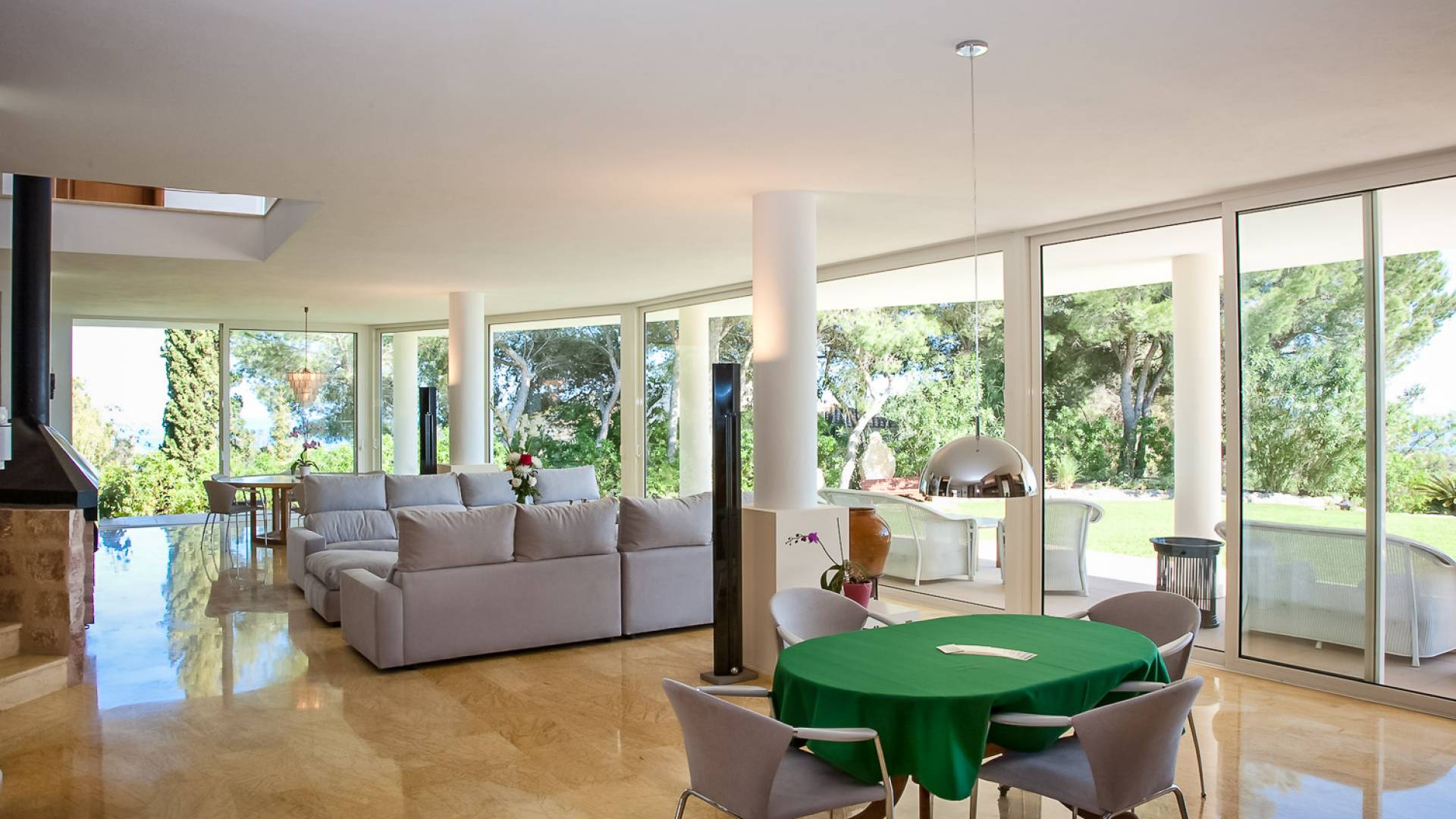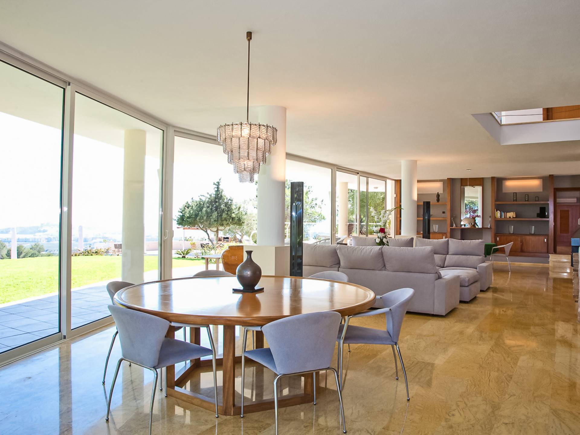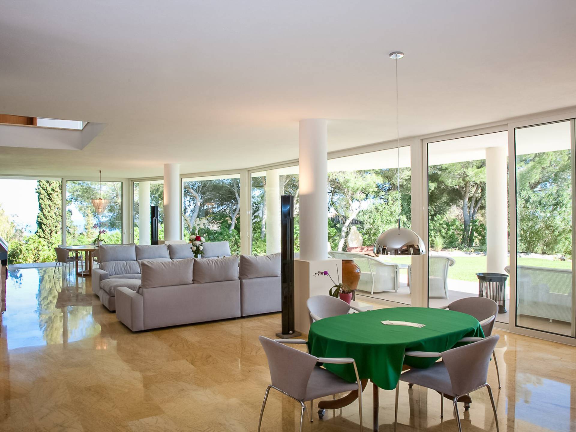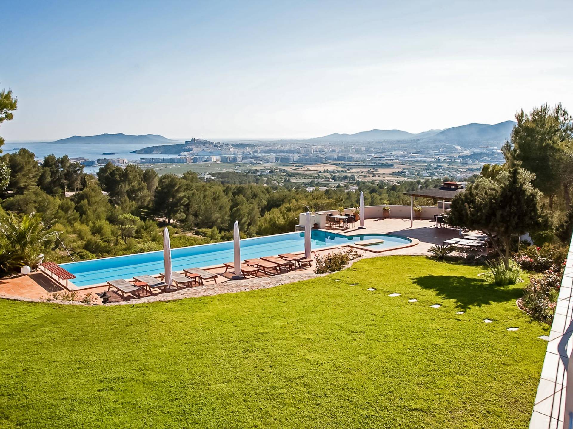Situé dans de beaux jardins, il y a une immense terrasse avec une grande piscine à débordement où la vue imprenable sur la ville d'Ibiza, Dalt Vila et la marina peut être pleinement appréciée. Il y a une zone de détente extérieure luxueuse, une salle à manger, des garages et beaucoup d'espace pour le stationnement. Avec un mobilier moderne et ultramoderne, cette maison comprend 2 salons, 2 cuisines entièrement équipées, un jacuzzi, un sauna et un gymnase privé.