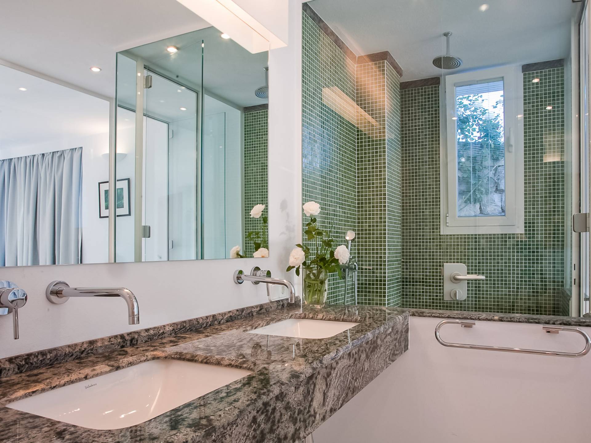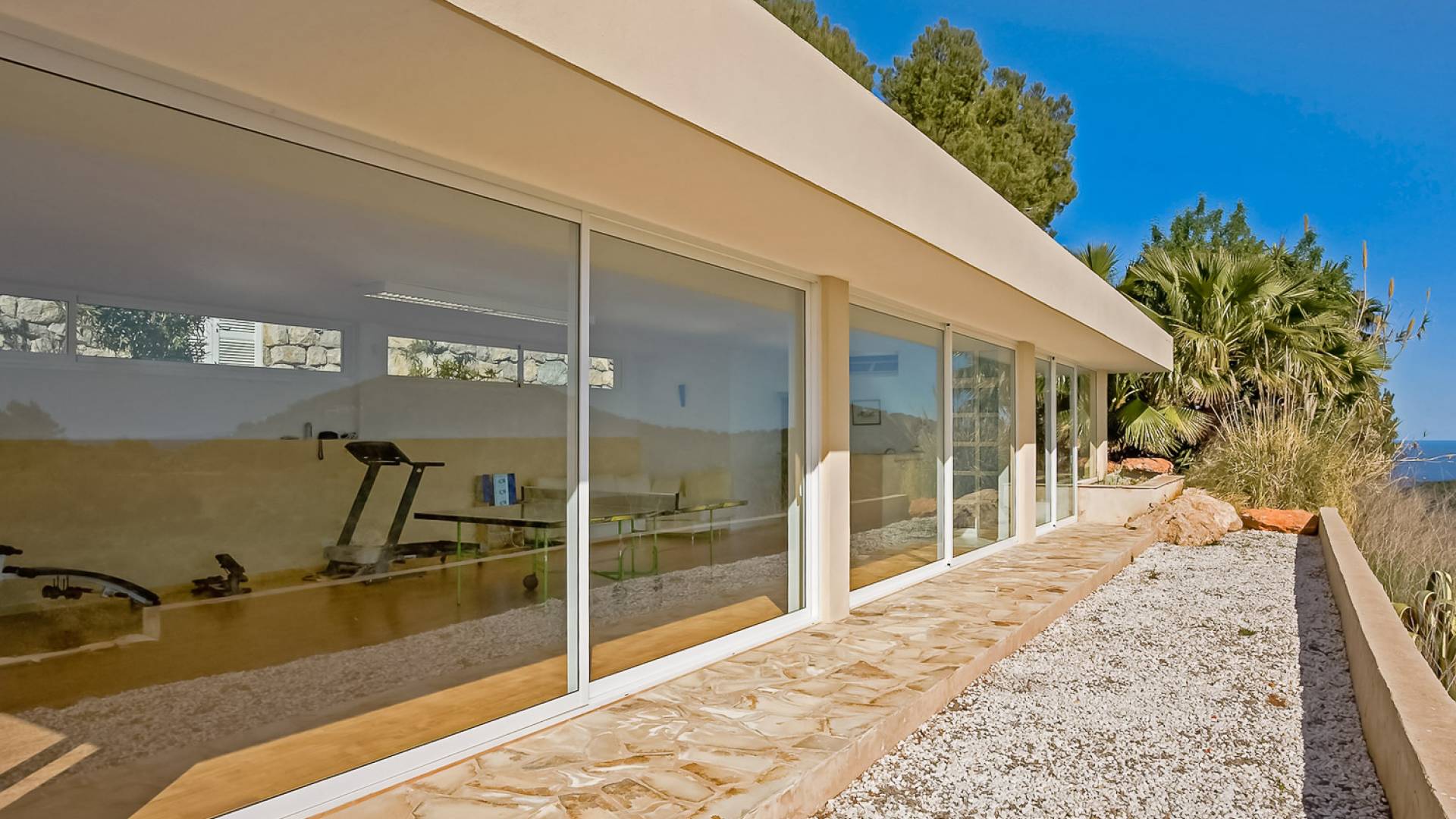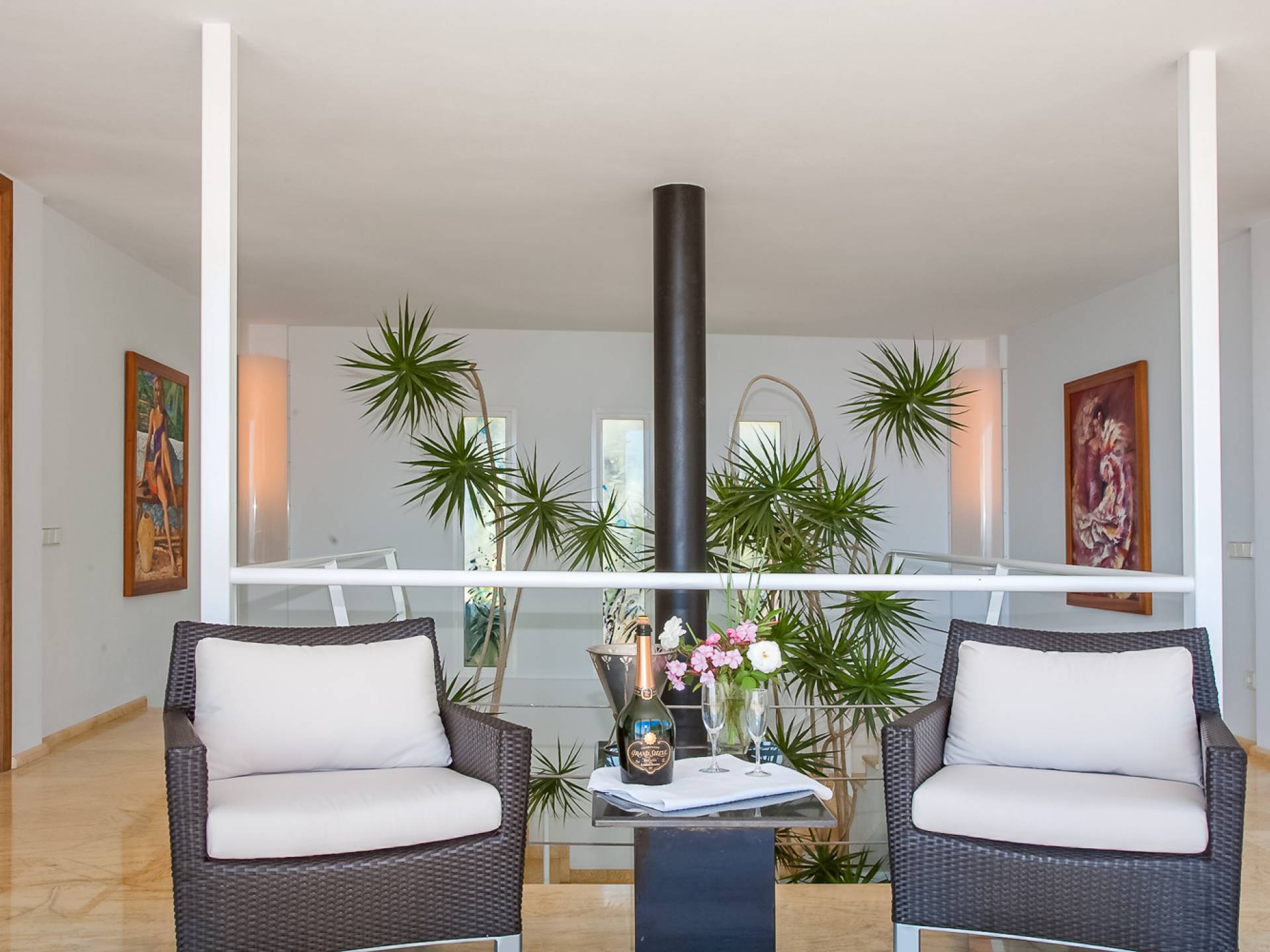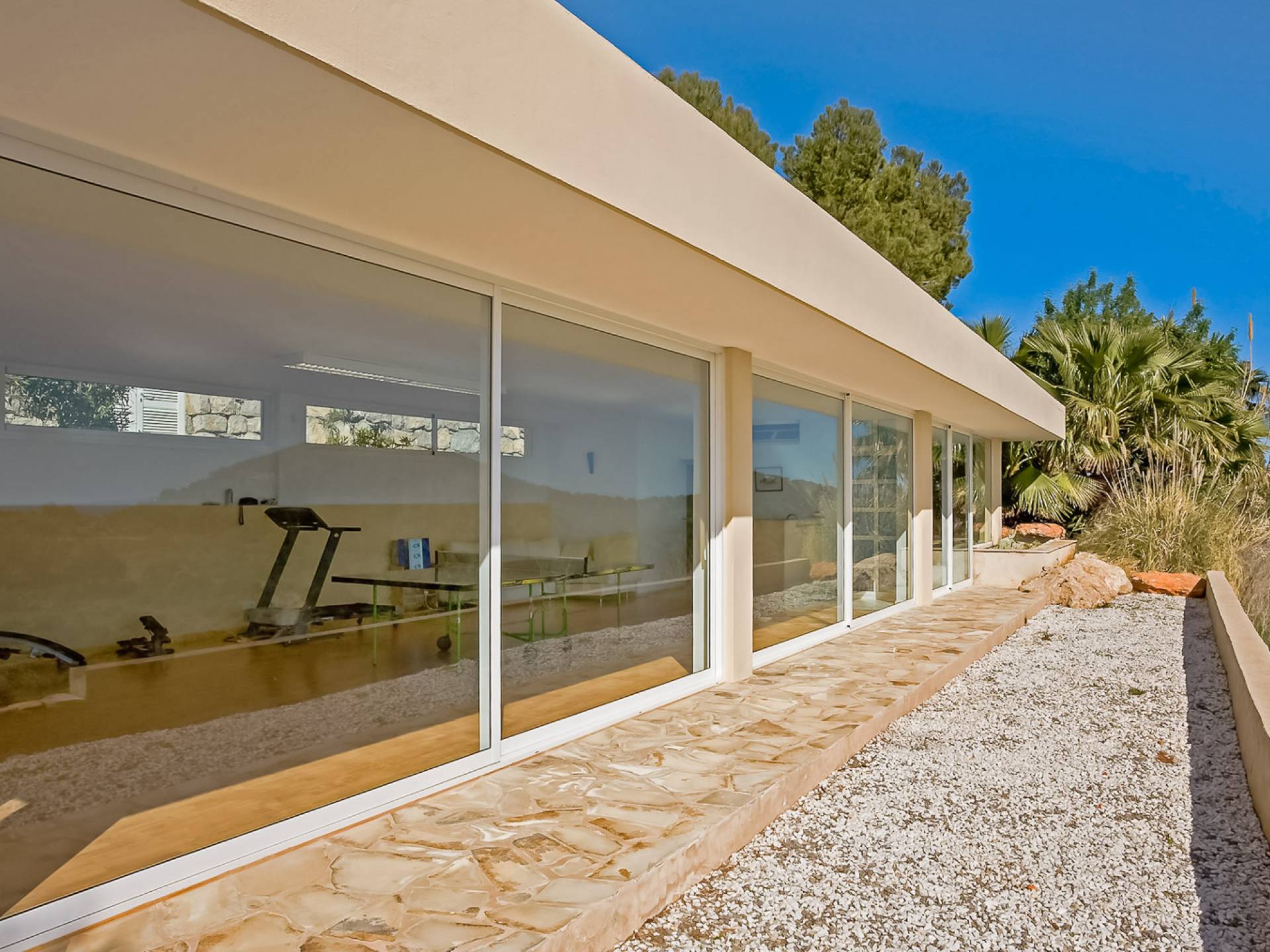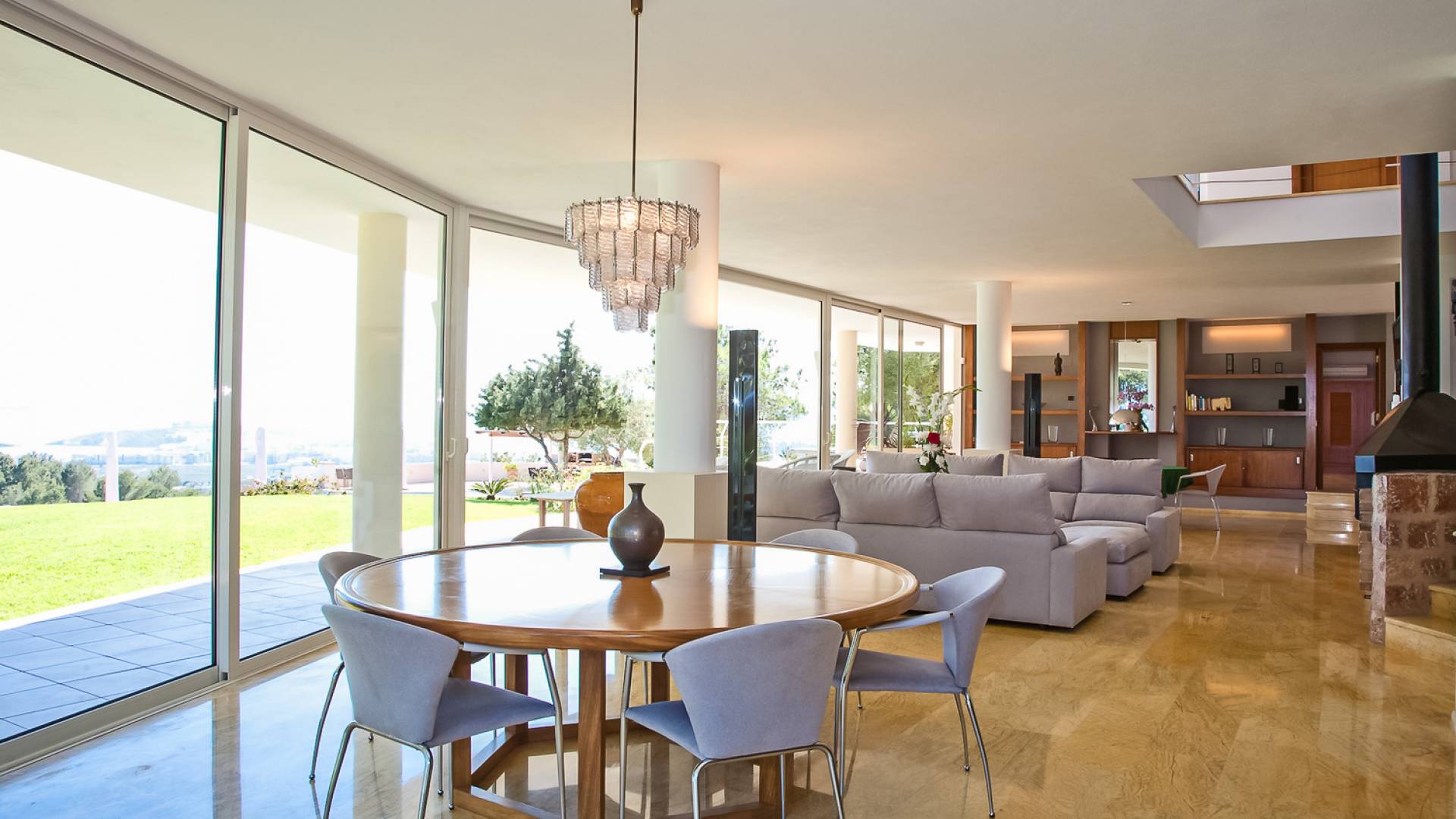 Situé dans de beaux jardins, il y a une immense terrasse avec une grande piscine à débordement où la vue imprenable sur la ville d'Ibiza, Dalt Vila et la marina peut être pleinement appréciée. Il y a une zone de détente extérieure luxueuse, une salle à manger, des garages et beaucoup d'espace pour le stationnement. Avec un mobilier moderne et ultramoderne, cette maison comprend 2 salons, 2 cuisines entièrement équipées, un jacuzzi, un sauna et un gymnase privé.