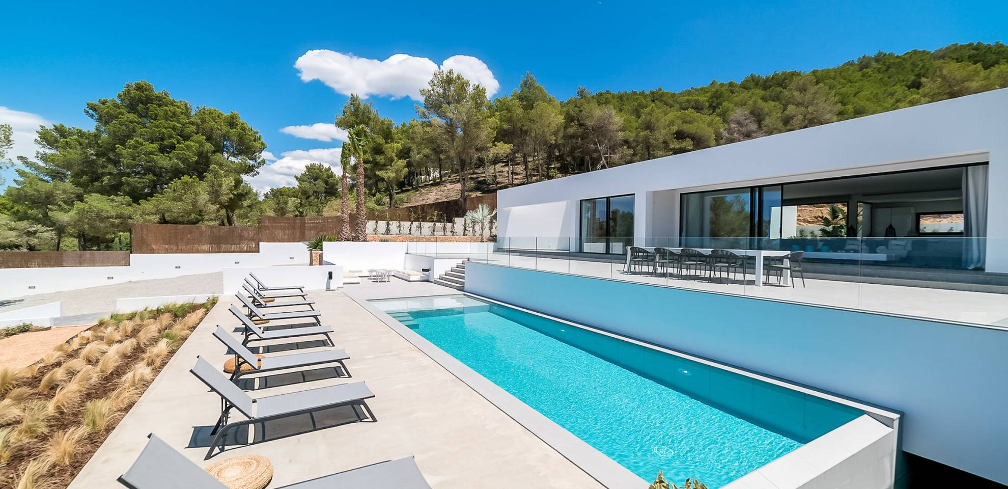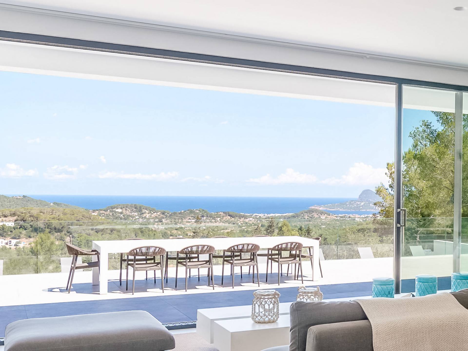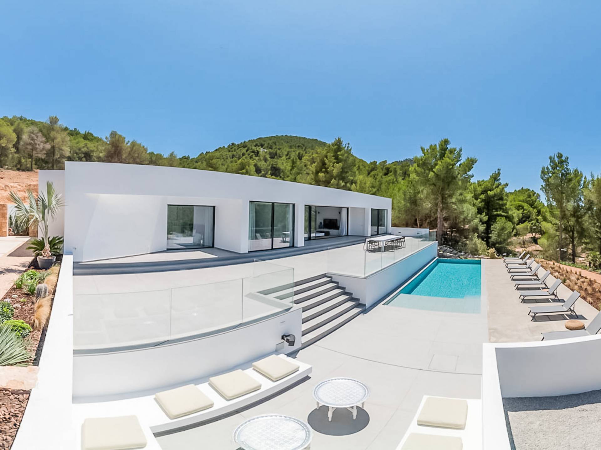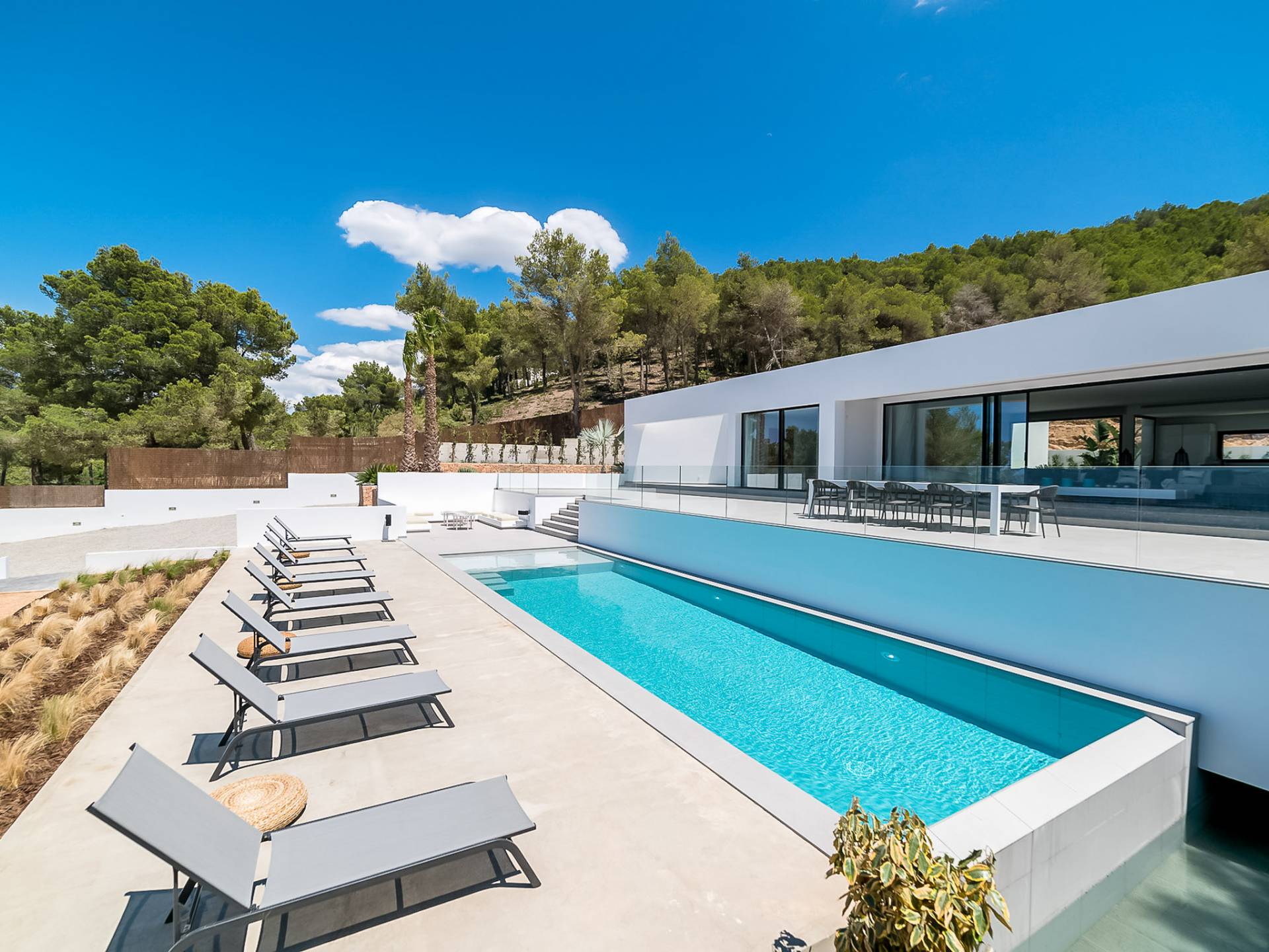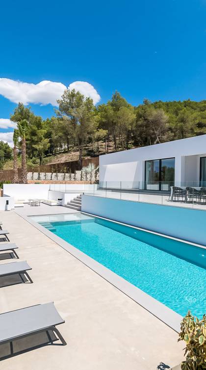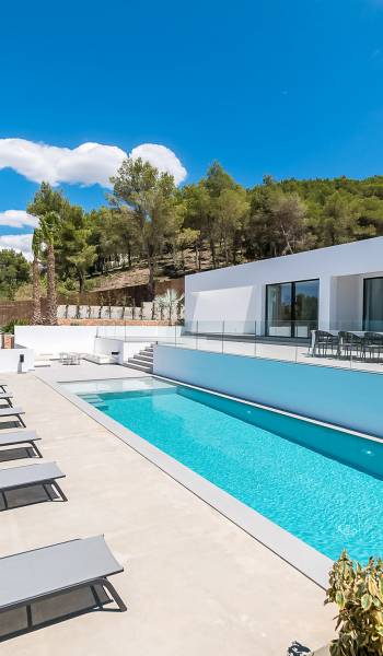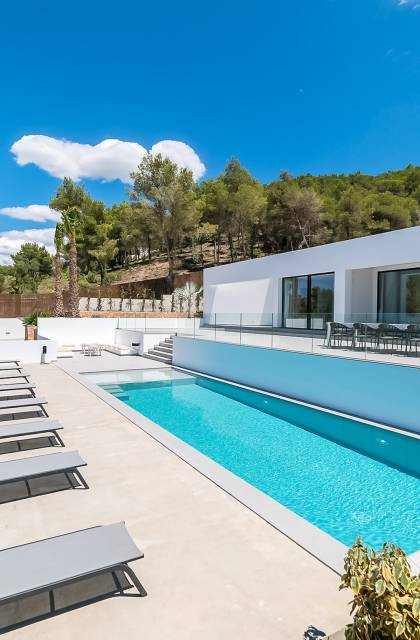 La Villa Ofelia Ibiza a été savamment conçue et meublée par le célèbre architecte d'intérieur Jose Antonio Flores. Tous les équipements et installations de pointe ont été installés - y compris les équipements de cuisine, les équipements de sécurité et les installations de blanchisserie/nettoyage. Le salon dispose d'immenses portes coulissantes du sol au plafond, où les vues pendant que vous vous détendez sur les canapés luxueusement confortables sont tout simplement époustouflantes. La salle à manger peut accueillir 10 personnes et est décloisonnée avec un coin salon et une cuisine ultramoderne entièrement équipée. Toute la maison bénéficie des dernières technologies en matière de climatisation et de chauffage ; il y a un système de sécurité Paradox, un système de divertissement home cinéma à l'intérieur et à l'extérieur et il y a une connexion Internet haut débit gratuite avec accès WiFi.
