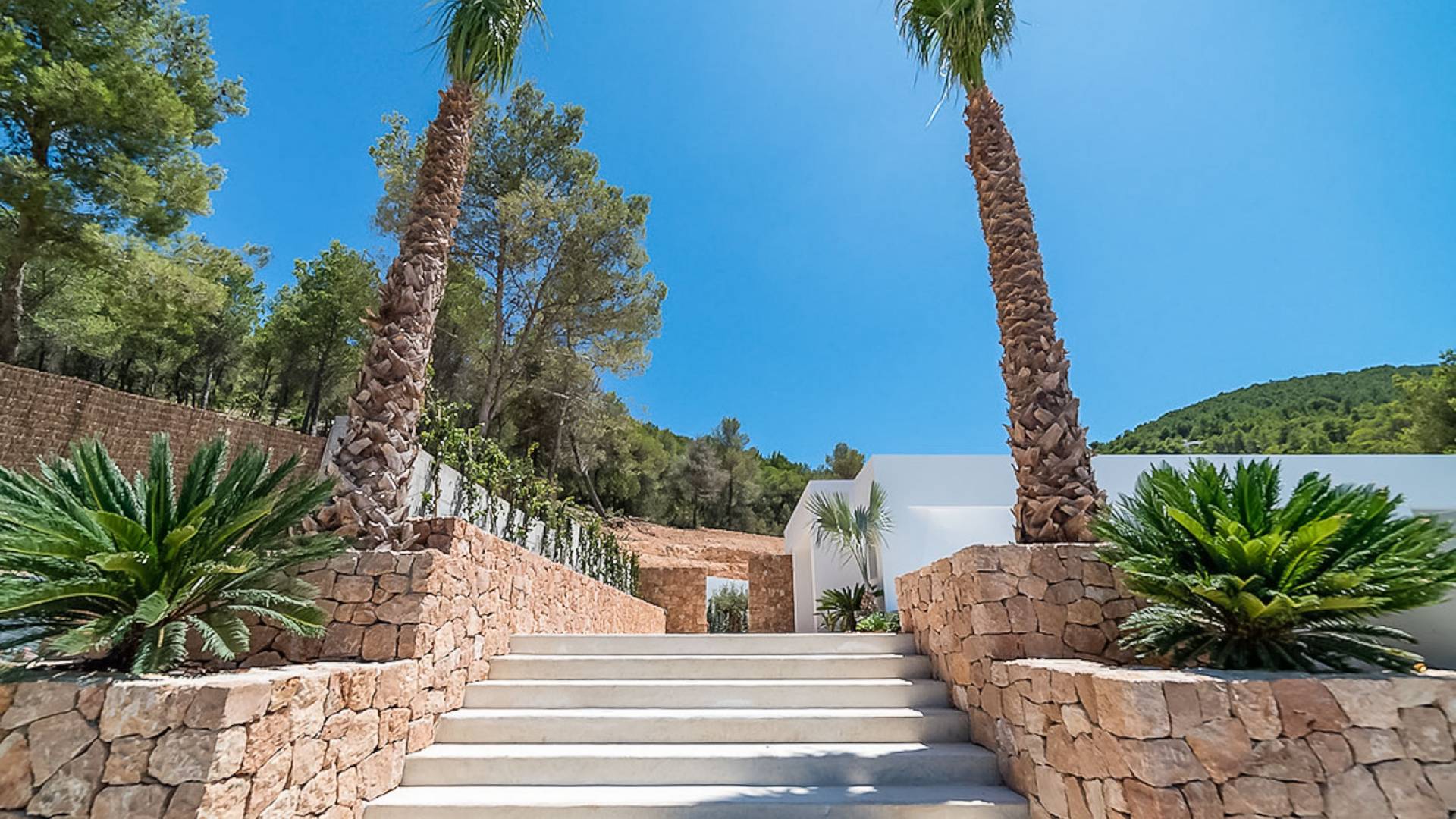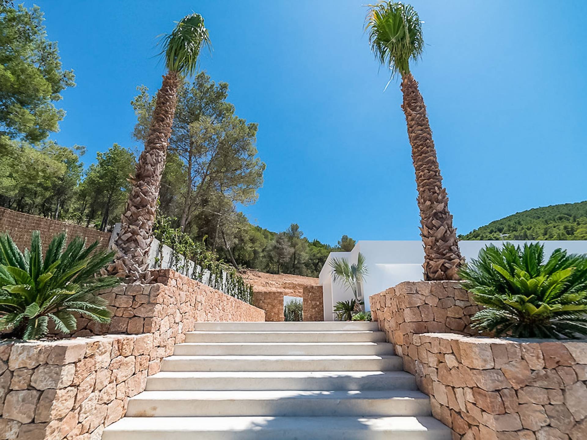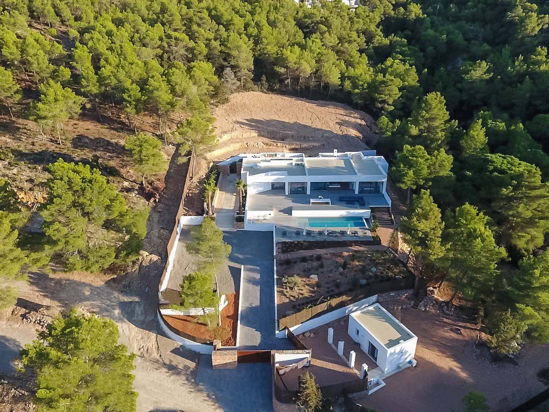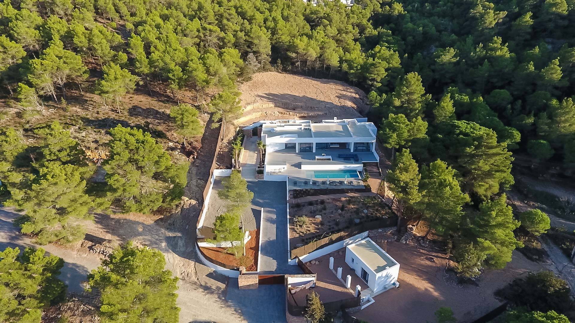 La Villa Ofelia Ibiza est une villa de cinq chambres magnifiquement moderne, élégante et élégante, récemment construite en 2017, nichée au cœur des montagnes d'Ibiza, à proximité du village de San Jose. Conçue par l'architecte primé Jano Blanco, la villa dispose de 550 m2 d'espace, tous construits sur un seul niveau sur 20 000 m2 de terrain, et offre l'endroit idéal pour profiter d'une vue imprenable sur la mer, les levers et couchers de soleil. Pour ceux qui veulent une détente totale, il offre intimité et isolement, mais comme il est situé à proximité de la Carretera de Sant Josep, il n'est qu'à 10 minutes en voiture de l'aéroport, et certaines des meilleures plages, clubs, restaurants et bars d'Ibiza sont tous facilement accessibles, il est également à distance de marche du village de San Jose et des restaurants.