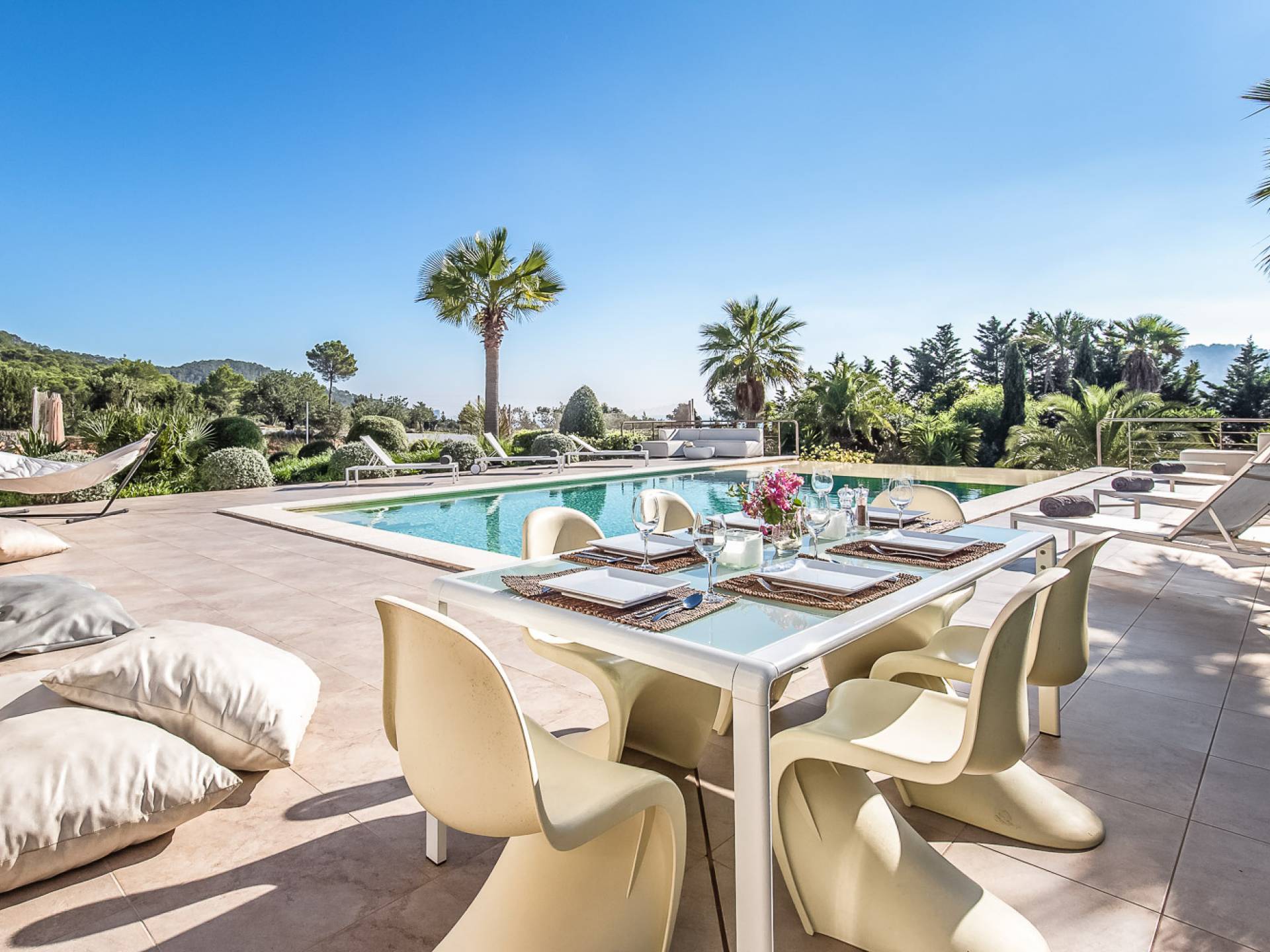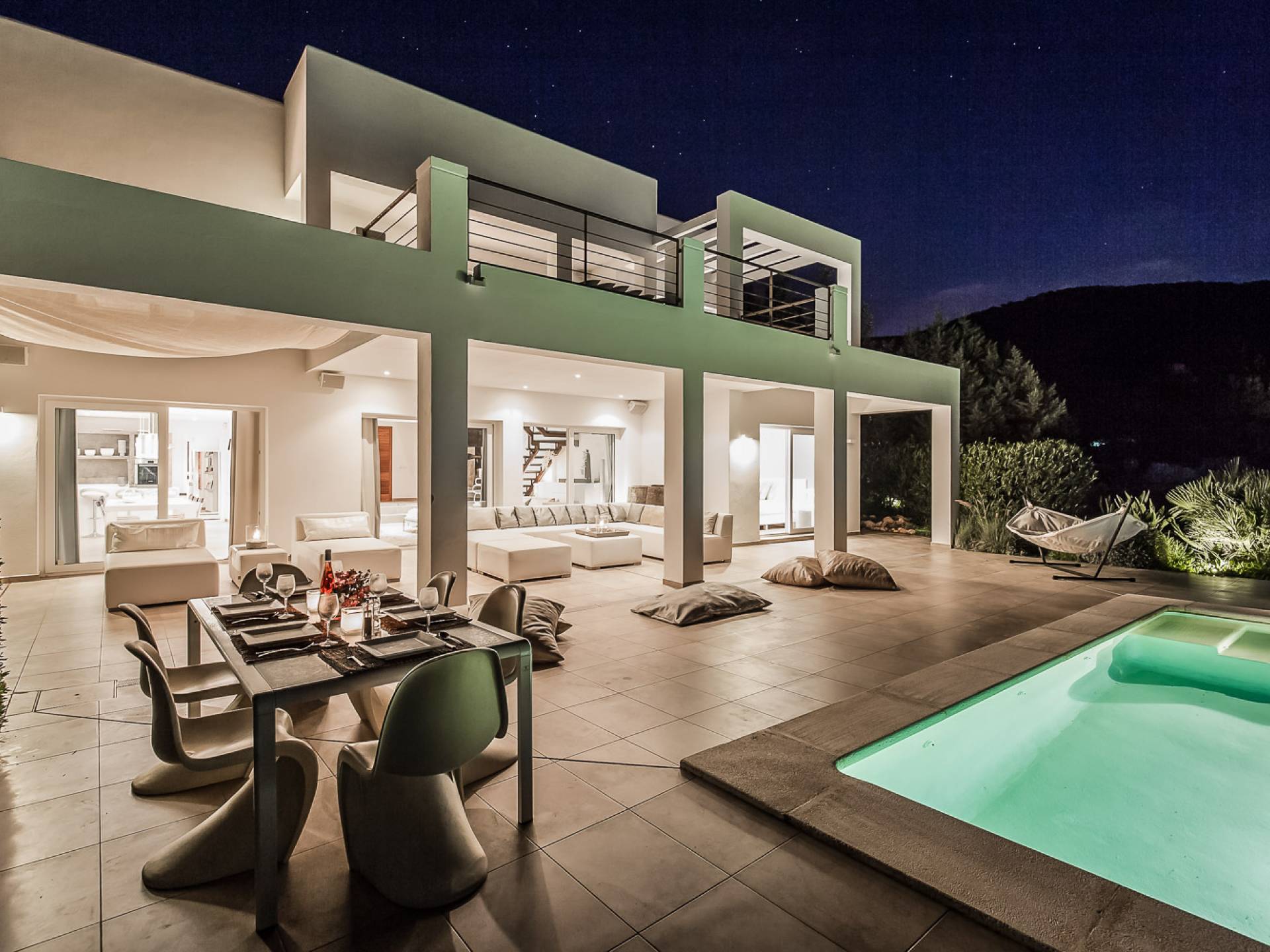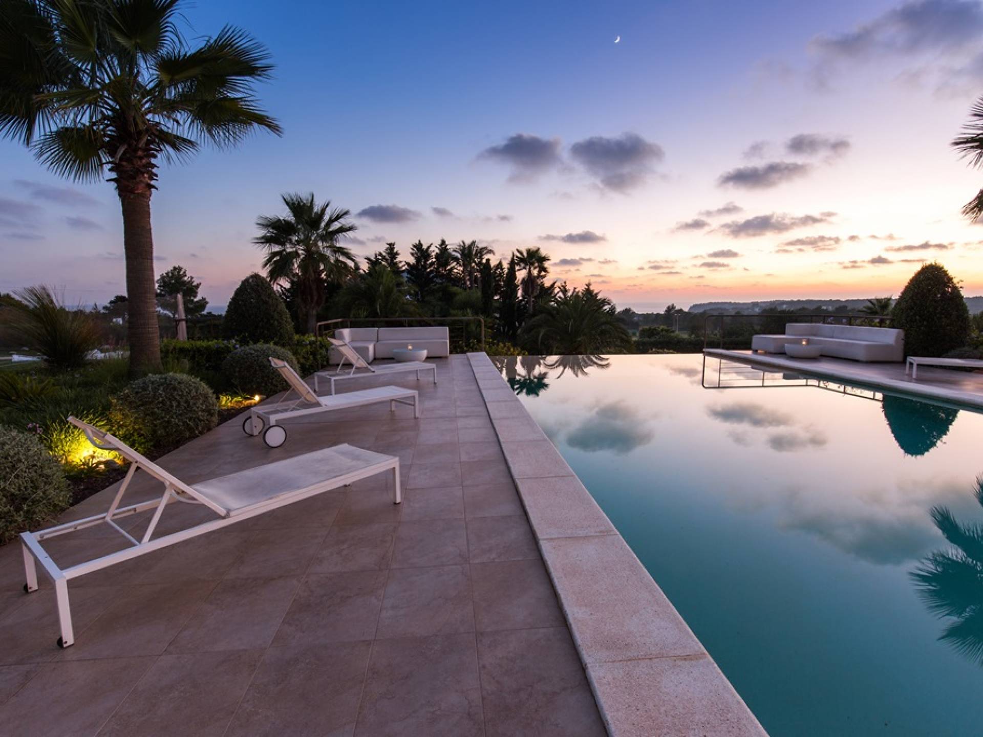 Un portail électrique donne accès au grand terrain clôturé (9000m²). Devant la maison se trouve un parking avec parking pour plusieurs voitures. Il y a une fabuleuse piscine offrant de superbes vues sur la mer Méditerranée avec des chaises longues luxueuses, une grande salle à manger extérieure, un barbecue et une zone de détente confortable