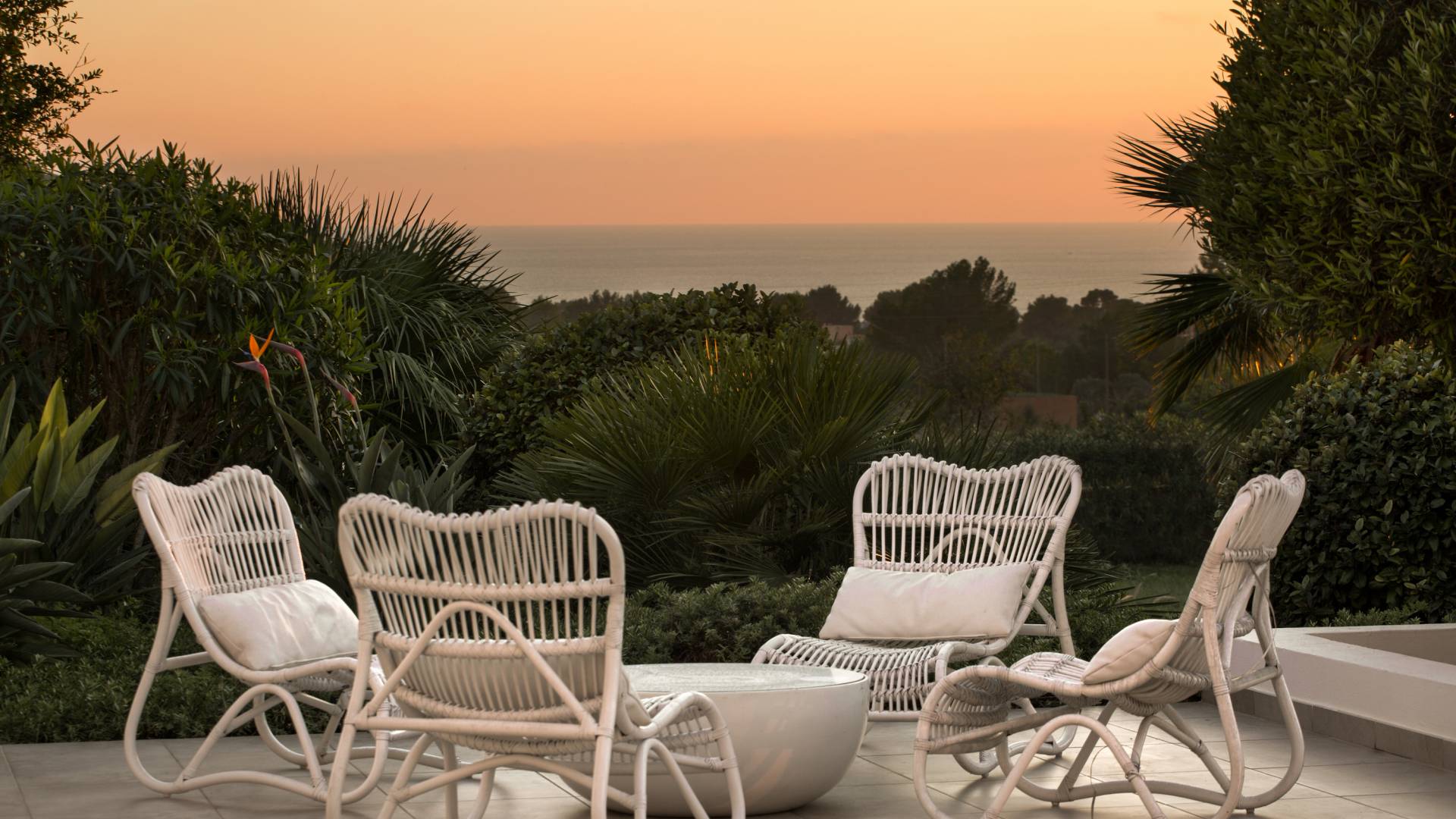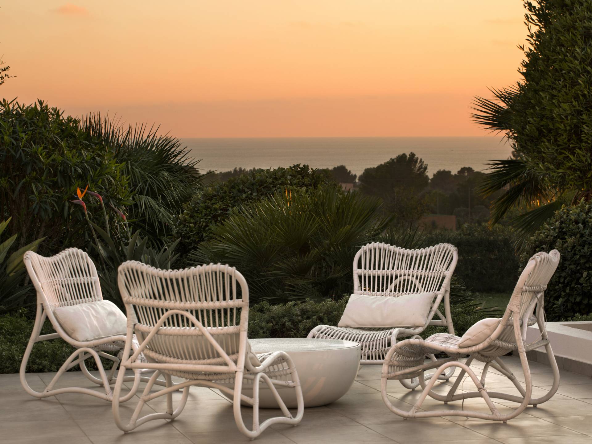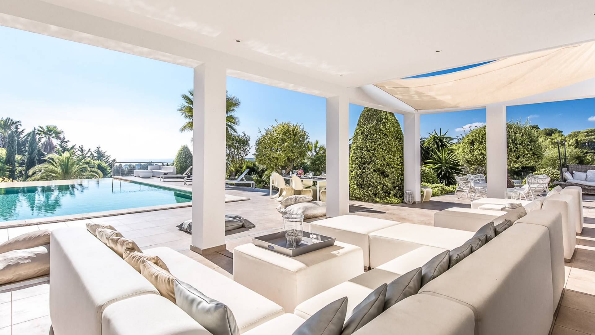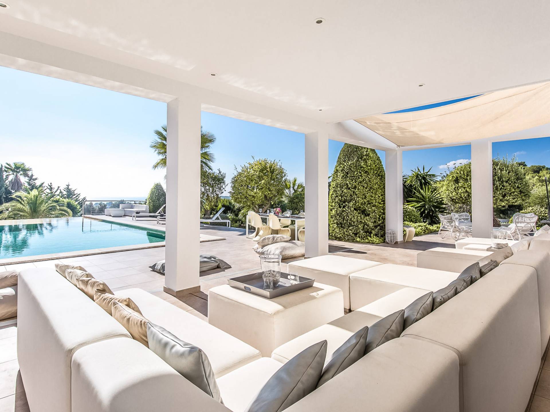 Un portail électrique donne accès au grand terrain clôturé (9000m²). Devant la maison se trouve un parking avec parking pour plusieurs voitures. Il y a une fabuleuse piscine offrant de superbes vues sur la mer Méditerranée avec des chaises longues luxueuses, une grande salle à manger extérieure, un barbecue et une zone de détente confortable