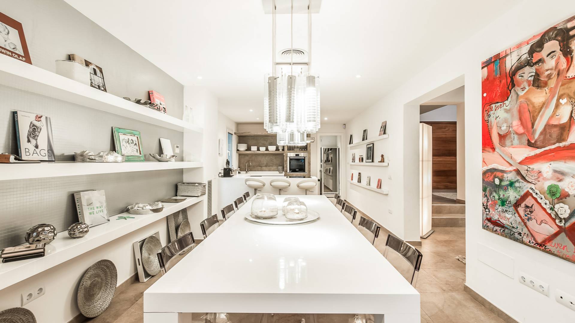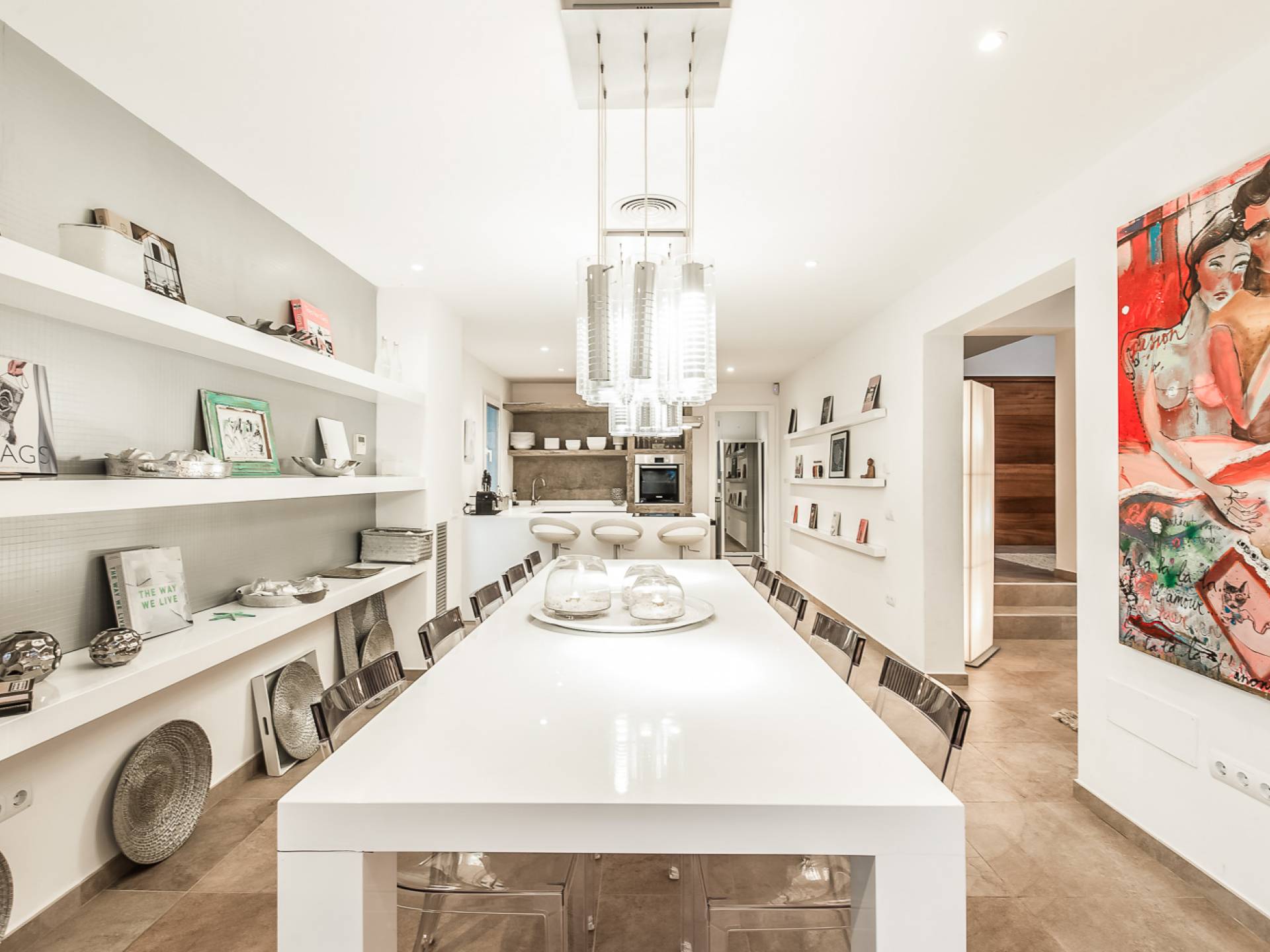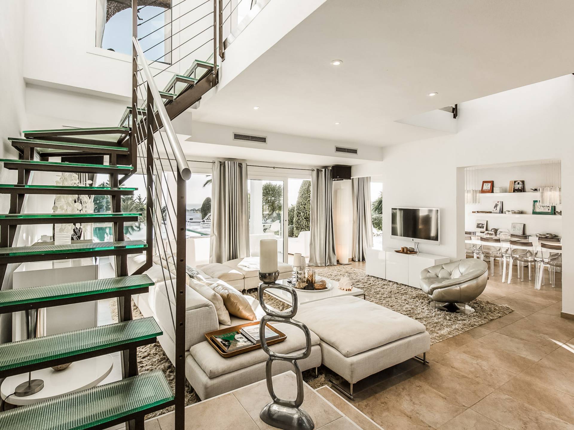 L'entrée sécurisée donne accès à un hall spacieux avec toilettes invités. Le grand salon décoré avec goût a des portes coulissantes en verre avec une vue impressionnante et les grands canapés confortables forment un coin salon confortable avec télévision par satellite, DVD, WiFi et 2 stations d'accueil pour iPod B & BW à l'intérieur et à l'extérieur. Il y a une cuisine moderne entièrement équipée et la buanderie dispose d'un réfrigérateur-congélateur supplémentaire, d'un refroidisseur à vin/champagne, d'un lave-linge et d'un sèche-linge. La salle à manger a une très grande table à manger avec 10 places assises et depuis la cuisine, vous pouvez rejoindre la terrasse couverte où se trouve une grande salle à manger extérieure avec 14 places assises, il y a aussi une fantastique terrasse sur le toit.
