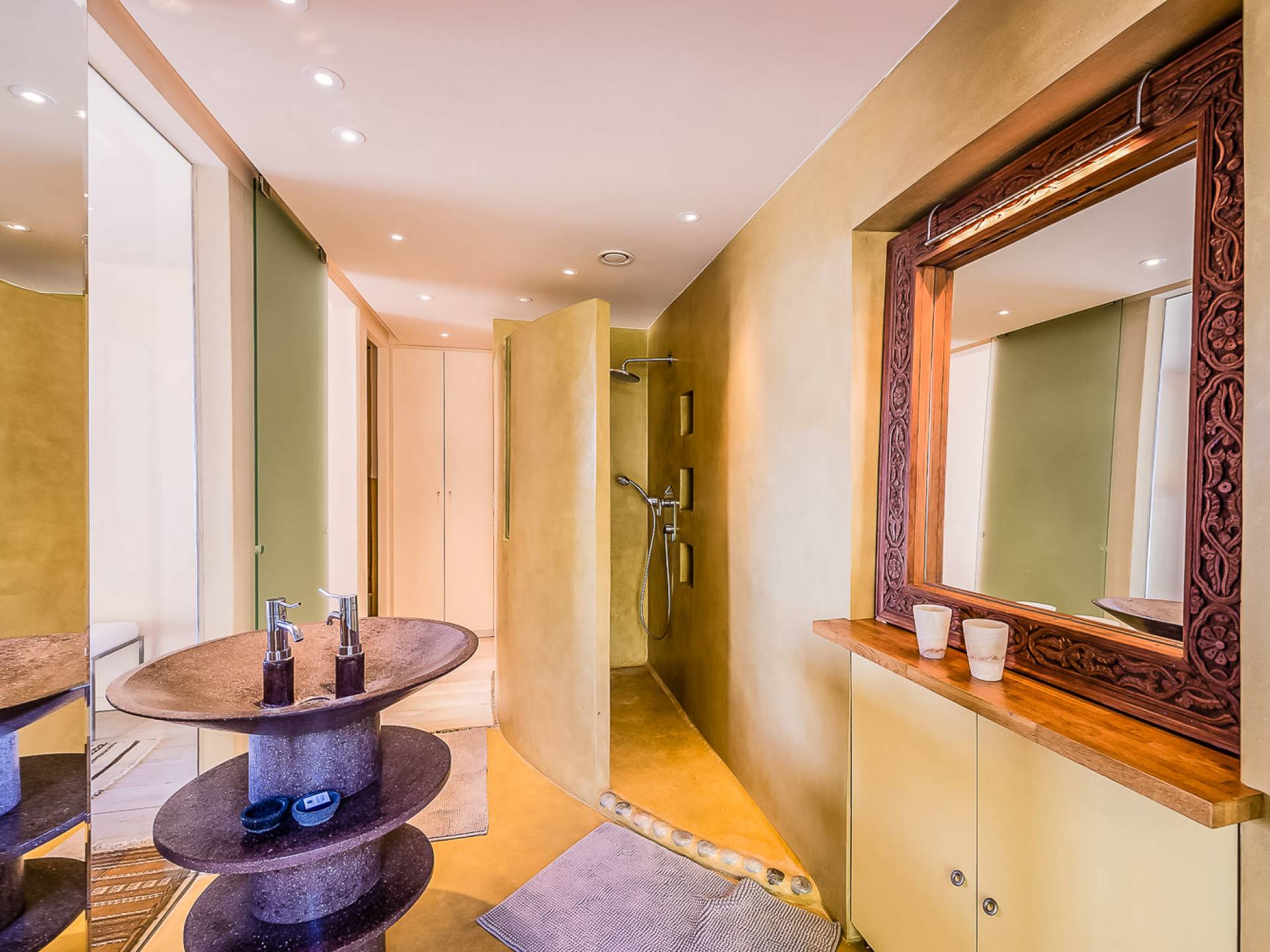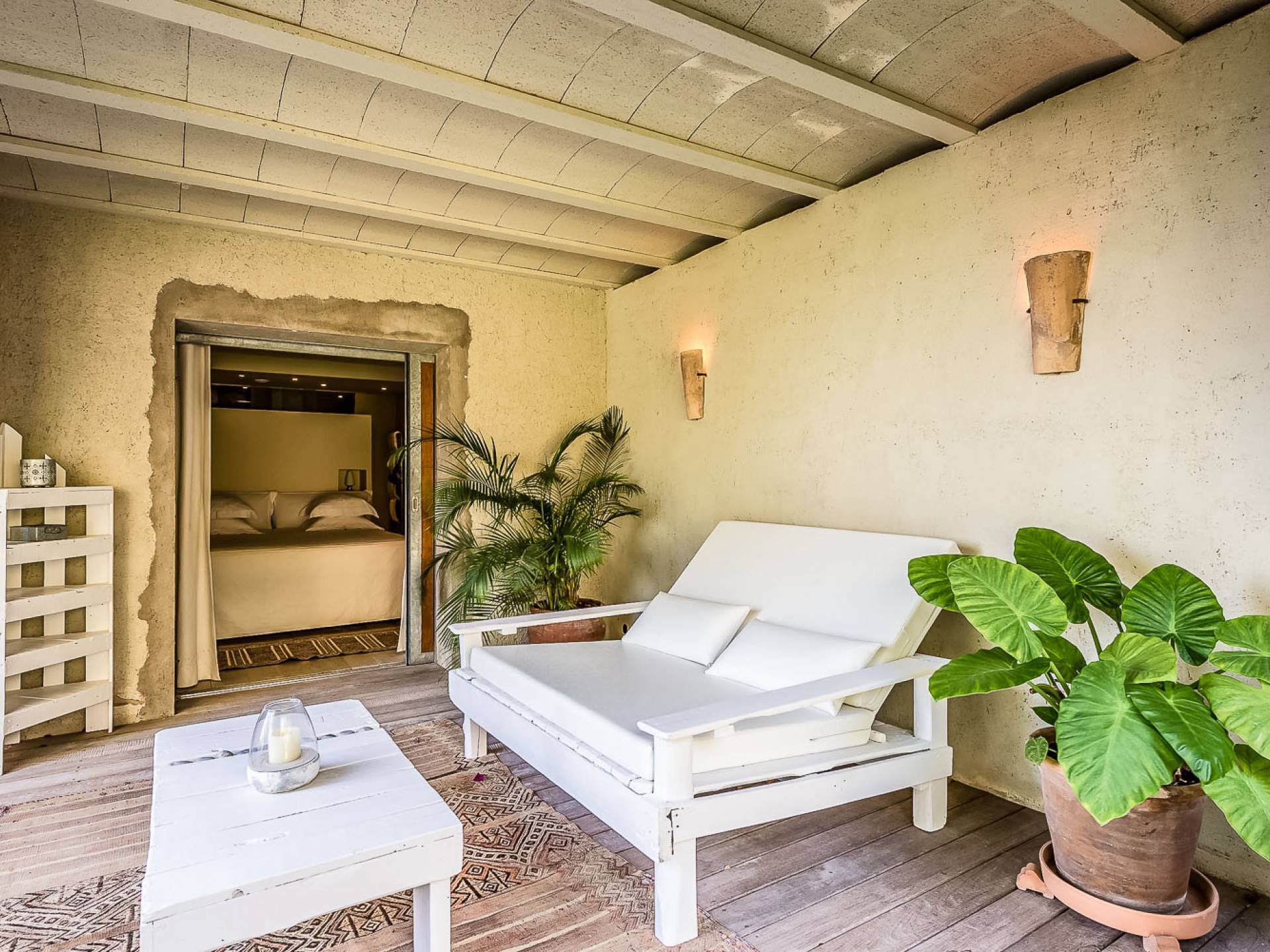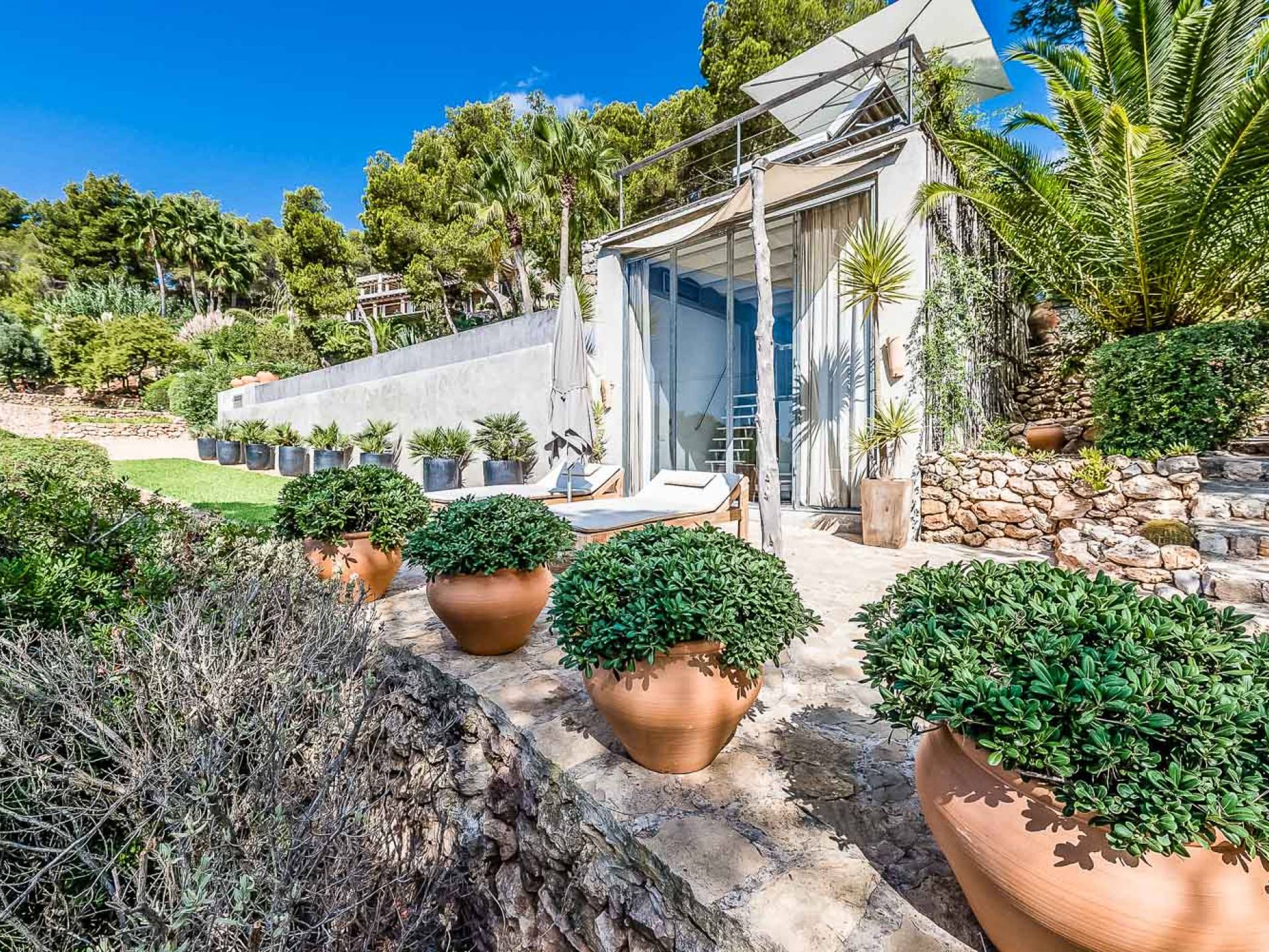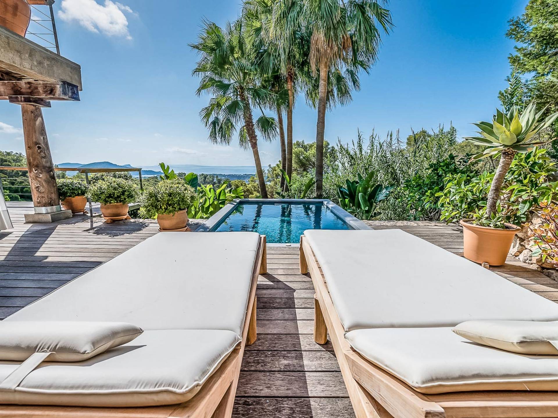 À l'extérieur, il y a un jardin fabuleux, plusieurs terrasses où vous pourrez profiter du soleil autour de la grande piscine, de nombreux coins salons et repas, une cuisine équipée, un garde-manger, des toilettes et une douche.